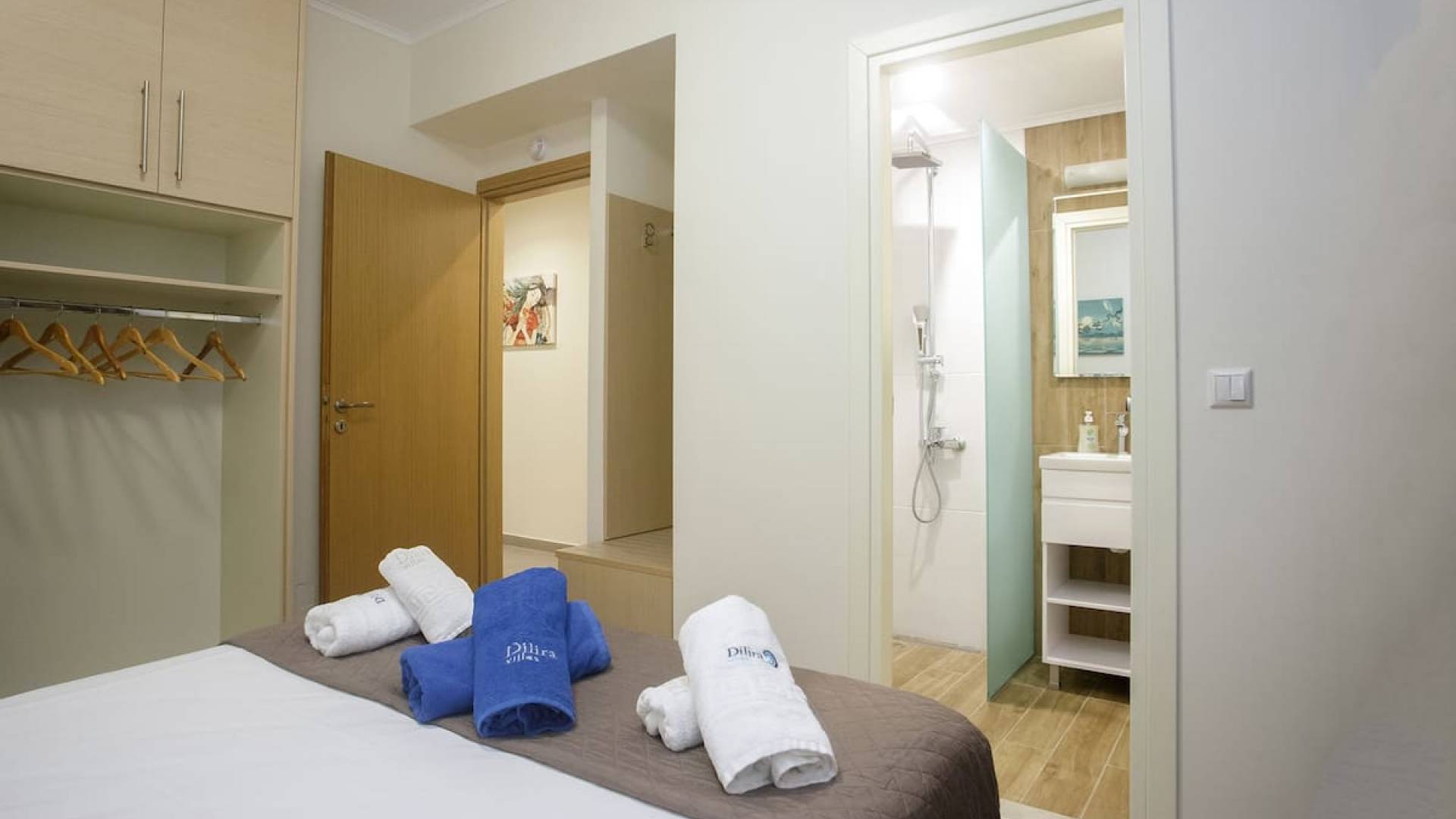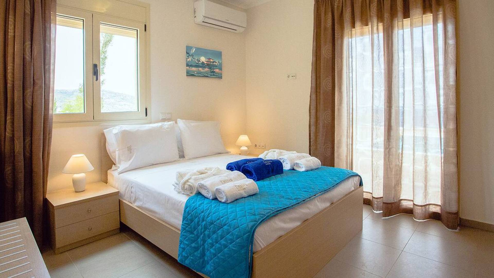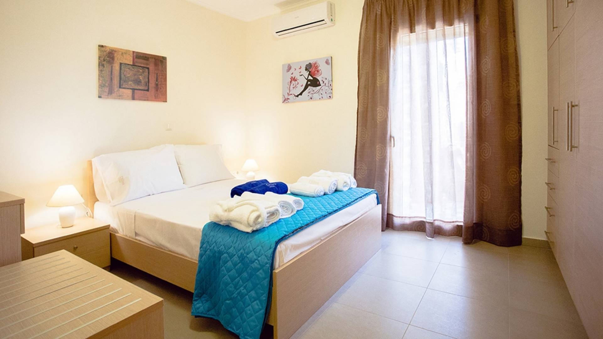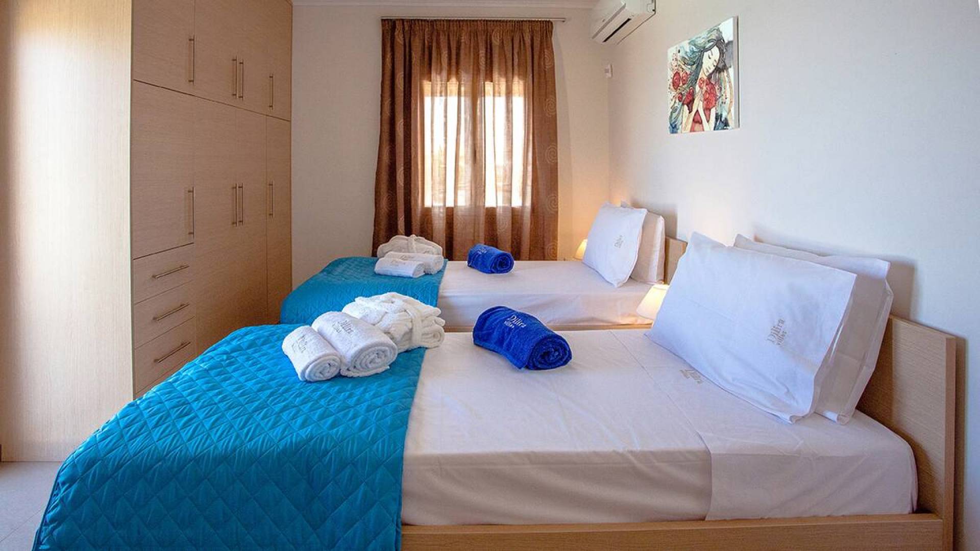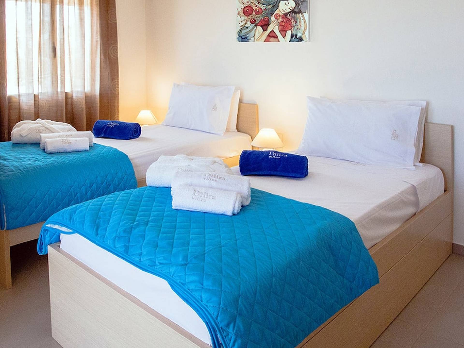 Вилла Лида Ираклион имеет 4 спальни (2 комнаты с двуспальными кроватями и 2 комнаты с двумя односпальными кроватями) и 2 ванные комнаты (одна общая и одна ванная в главной спальне) на первом этаже. Каждая комната имеет выход на веранду. Верхний этаж представляет собой общую зону с кухней, гостиной и столовой. Он окружен балконами с панорамным видом на море и горы.