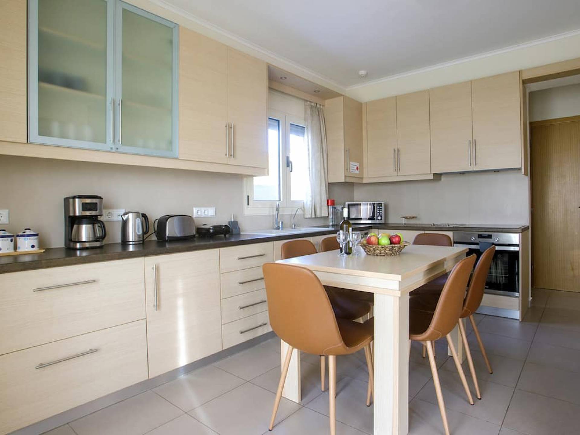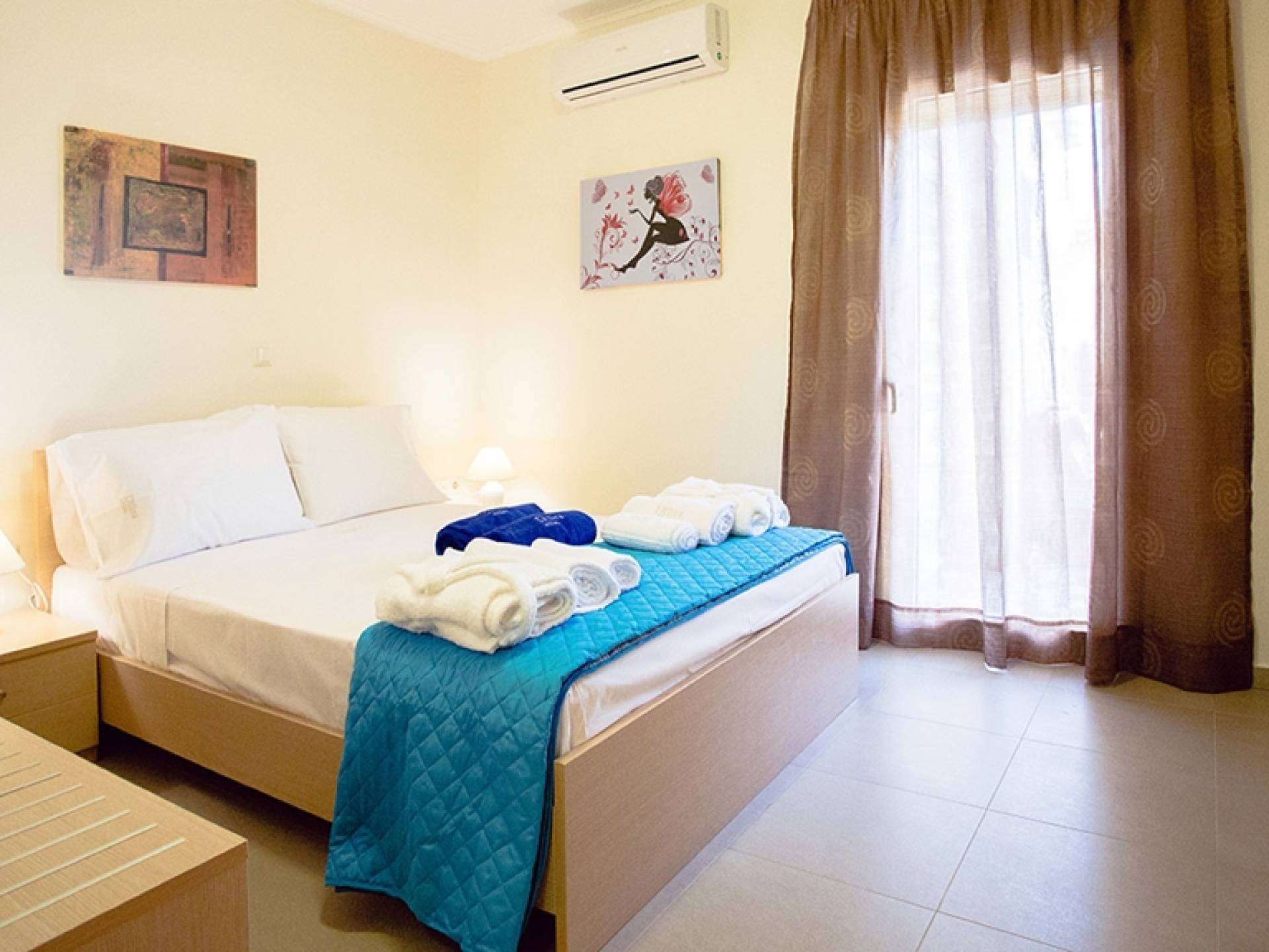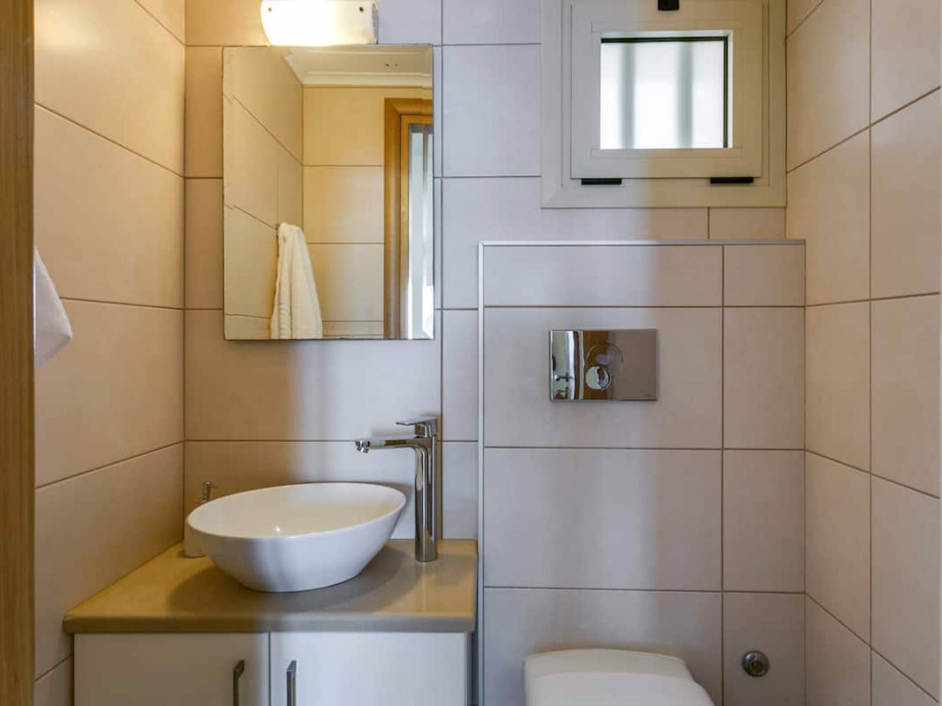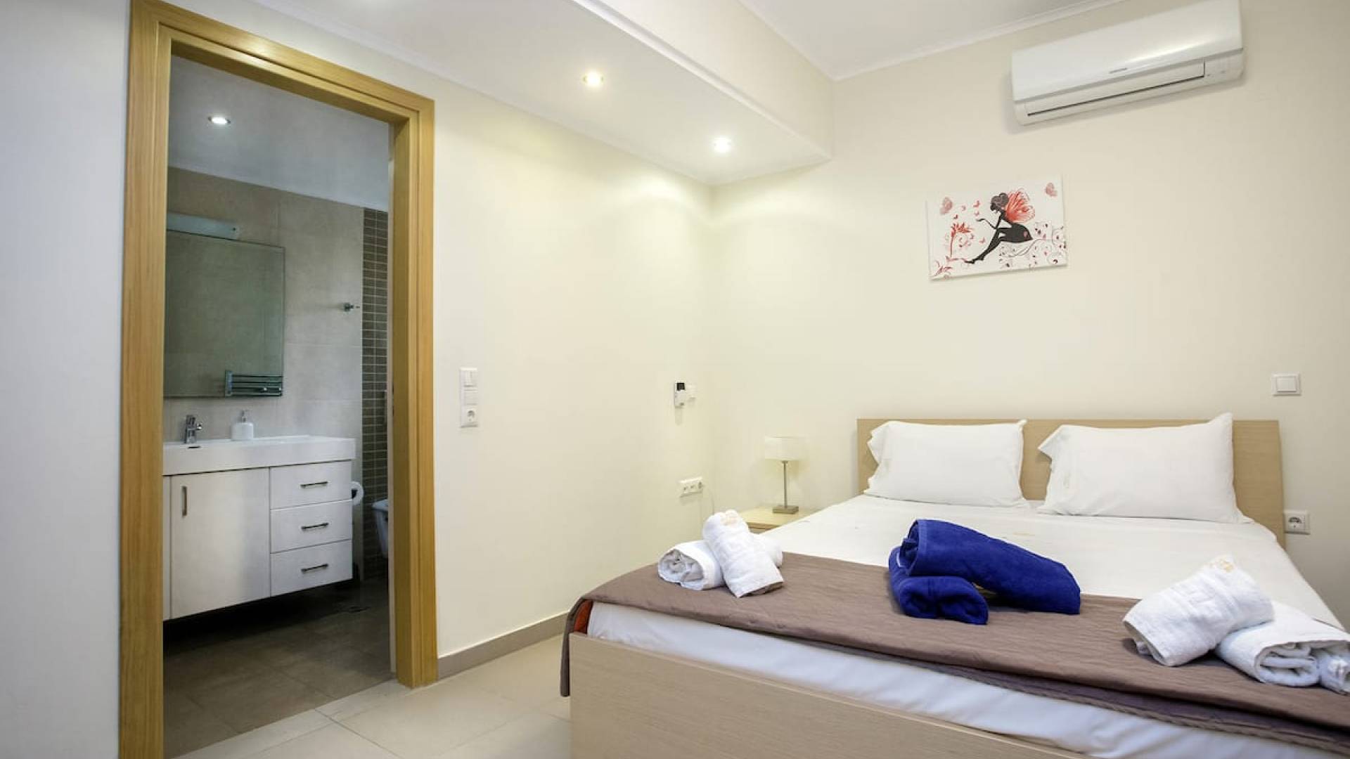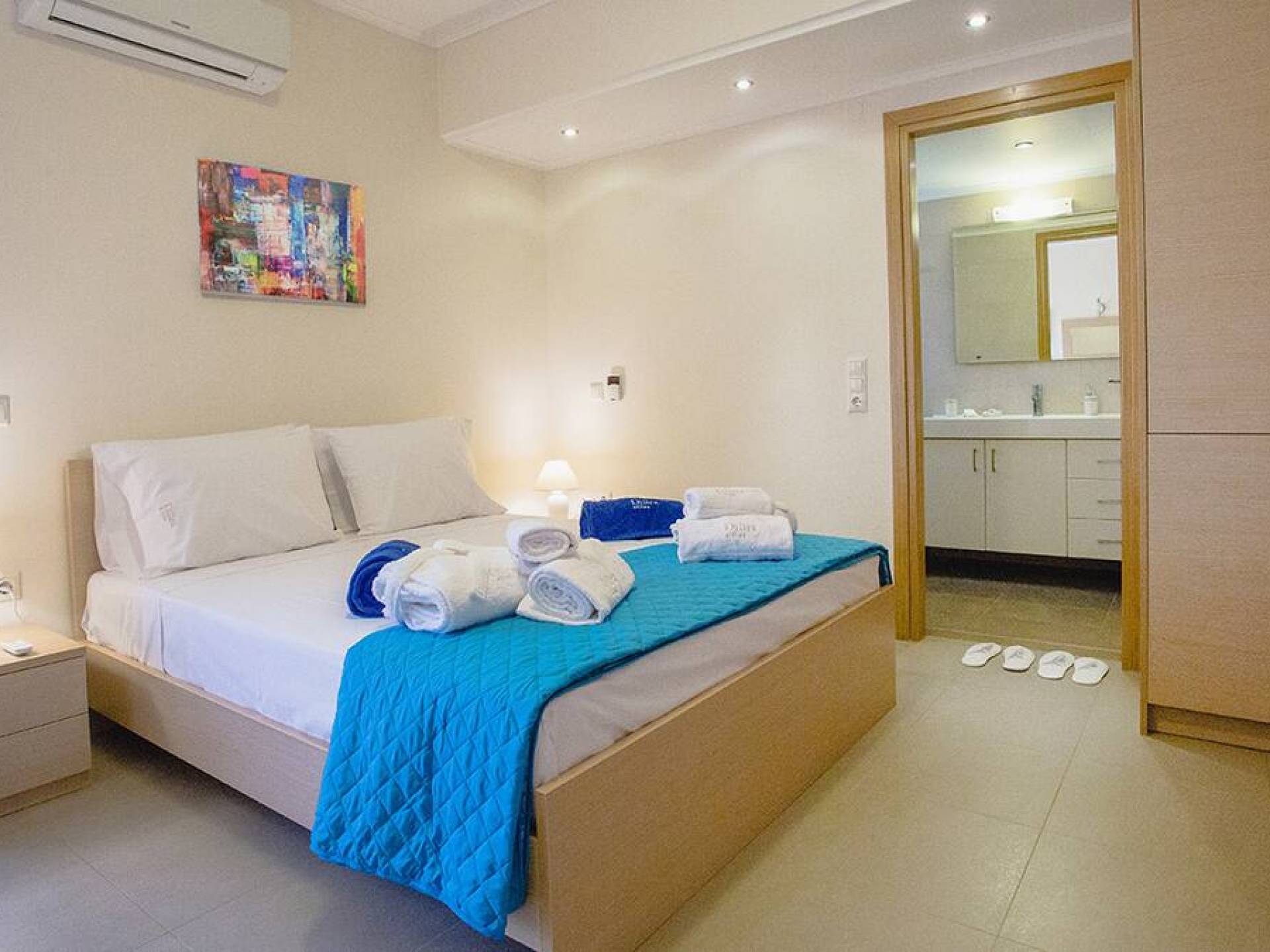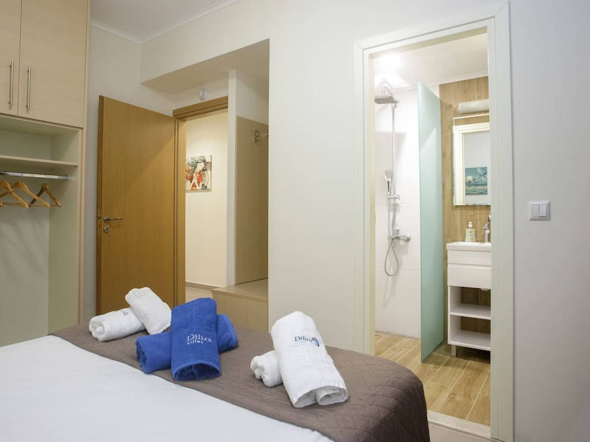 Вилла Лида Ираклион имеет 4 спальни (2 комнаты с двуспальными кроватями и 2 комнаты с двумя односпальными кроватями) и 2 ванные комнаты (одна общая и одна ванная в главной спальне) на первом этаже. Каждая комната имеет выход на веранду. Верхний этаж представляет собой общую зону с кухней, гостиной и столовой. Он окружен балконами с панорамным видом на море и горы.
