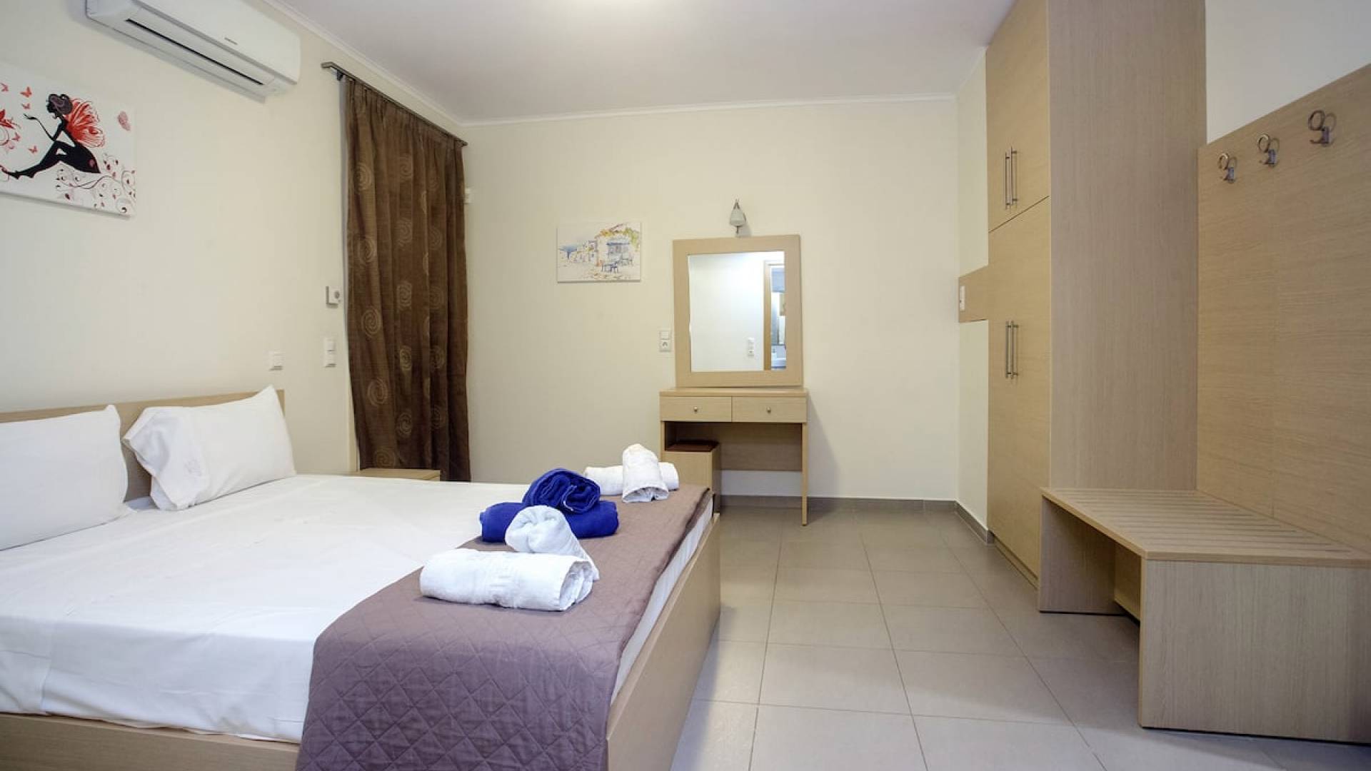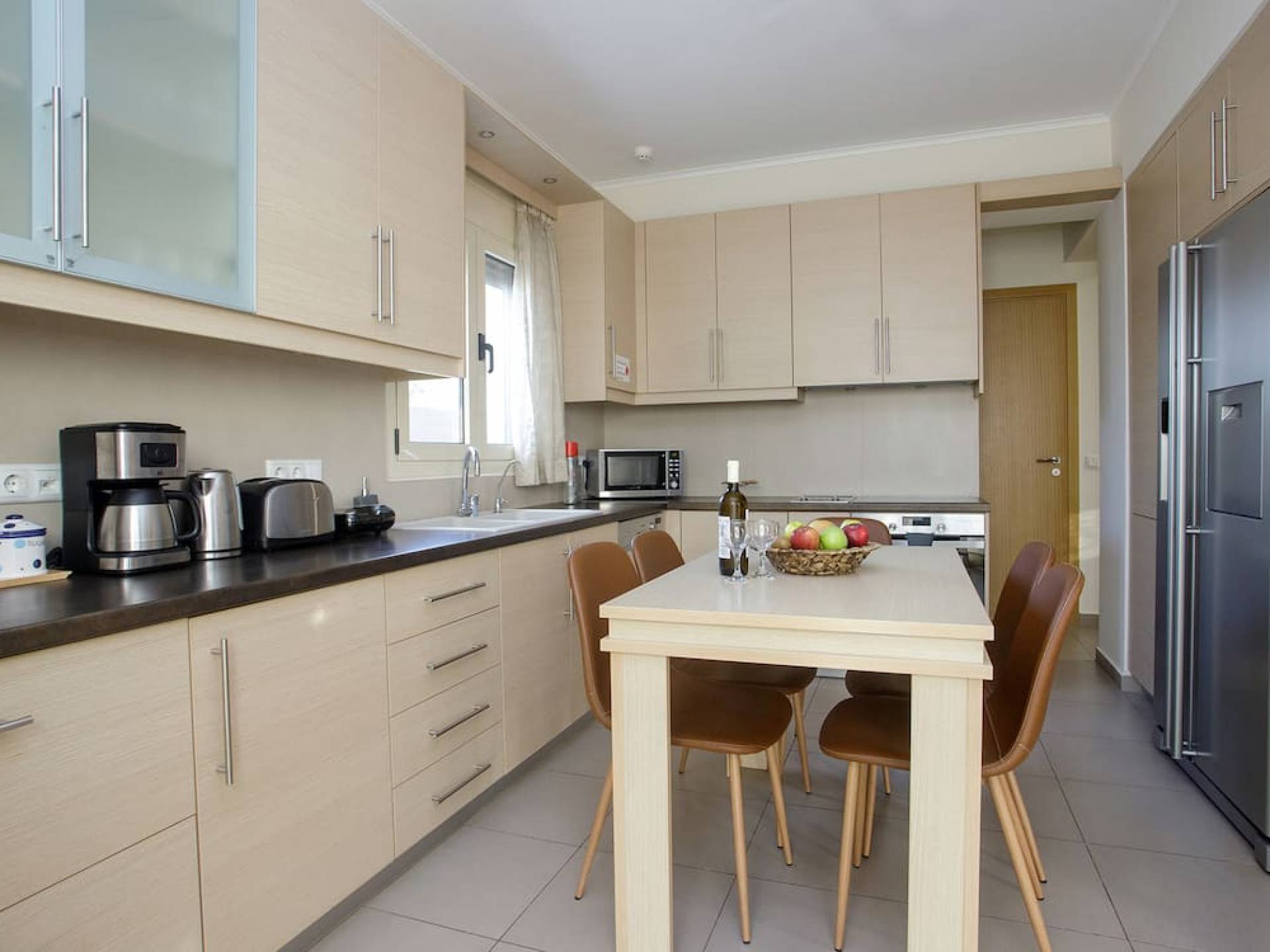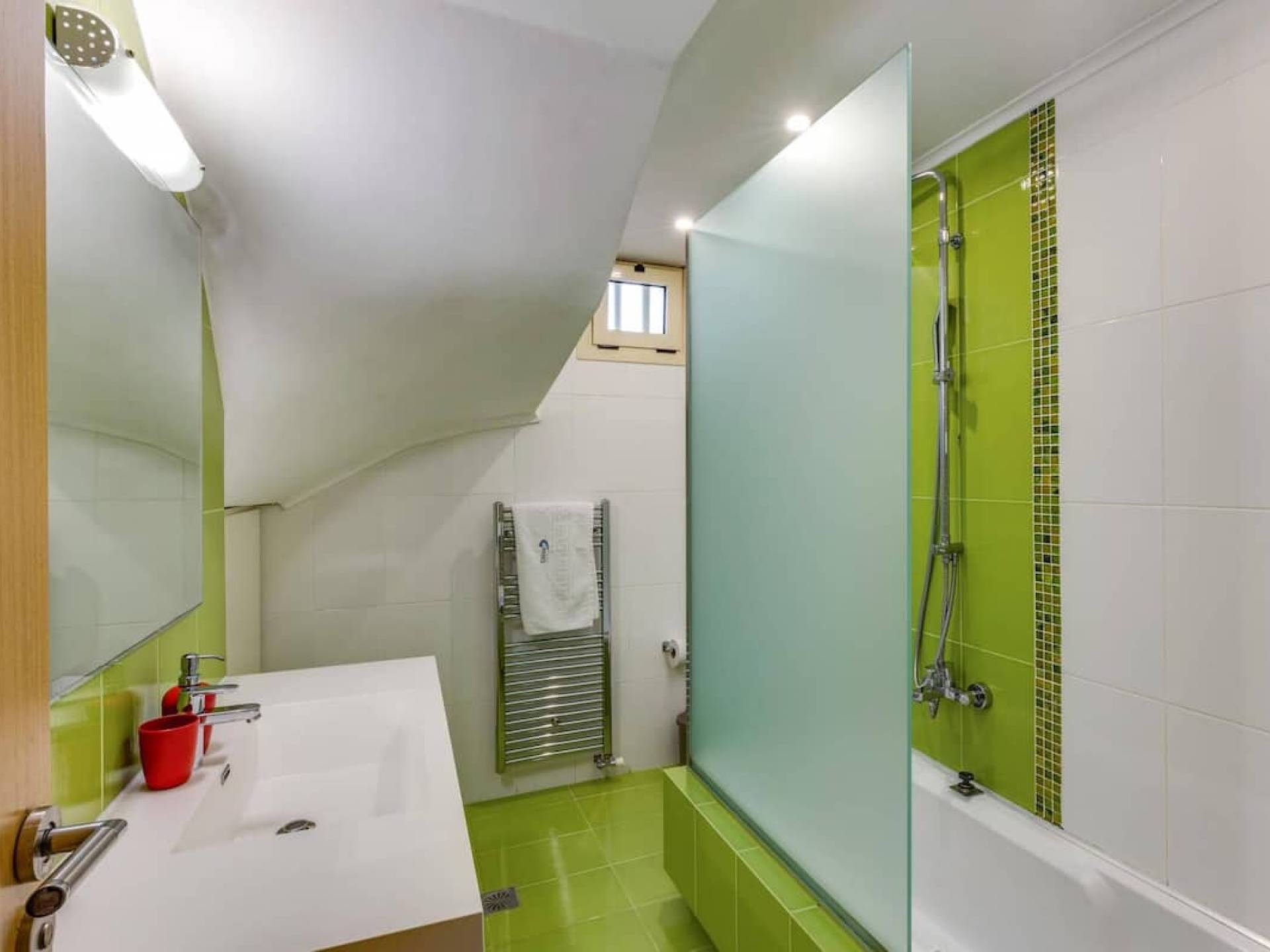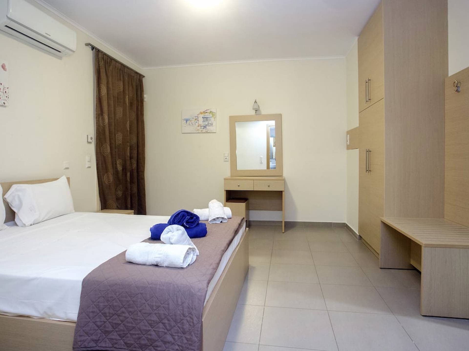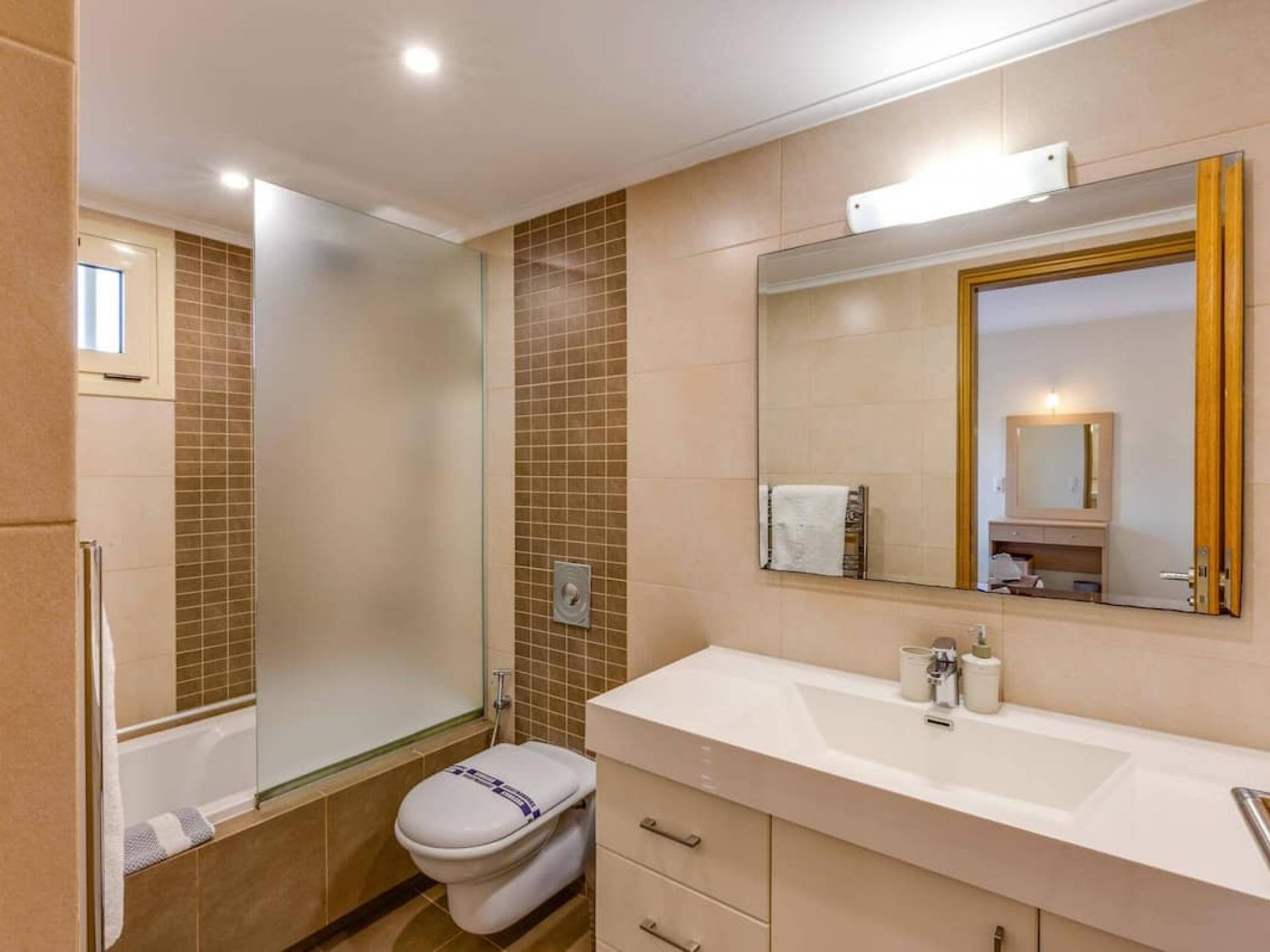 Вилла Лида Ираклион имеет 4 спальни (2 комнаты с двуспальными кроватями и 2 комнаты с двумя односпальными кроватями) и 2 ванные комнаты (одна общая и одна ванная в главной спальне) на первом этаже. Каждая комната имеет выход на веранду. Верхний этаж представляет собой общую зону с кухней, гостиной и столовой. Он окружен балконами с панорамным видом на море и горы.