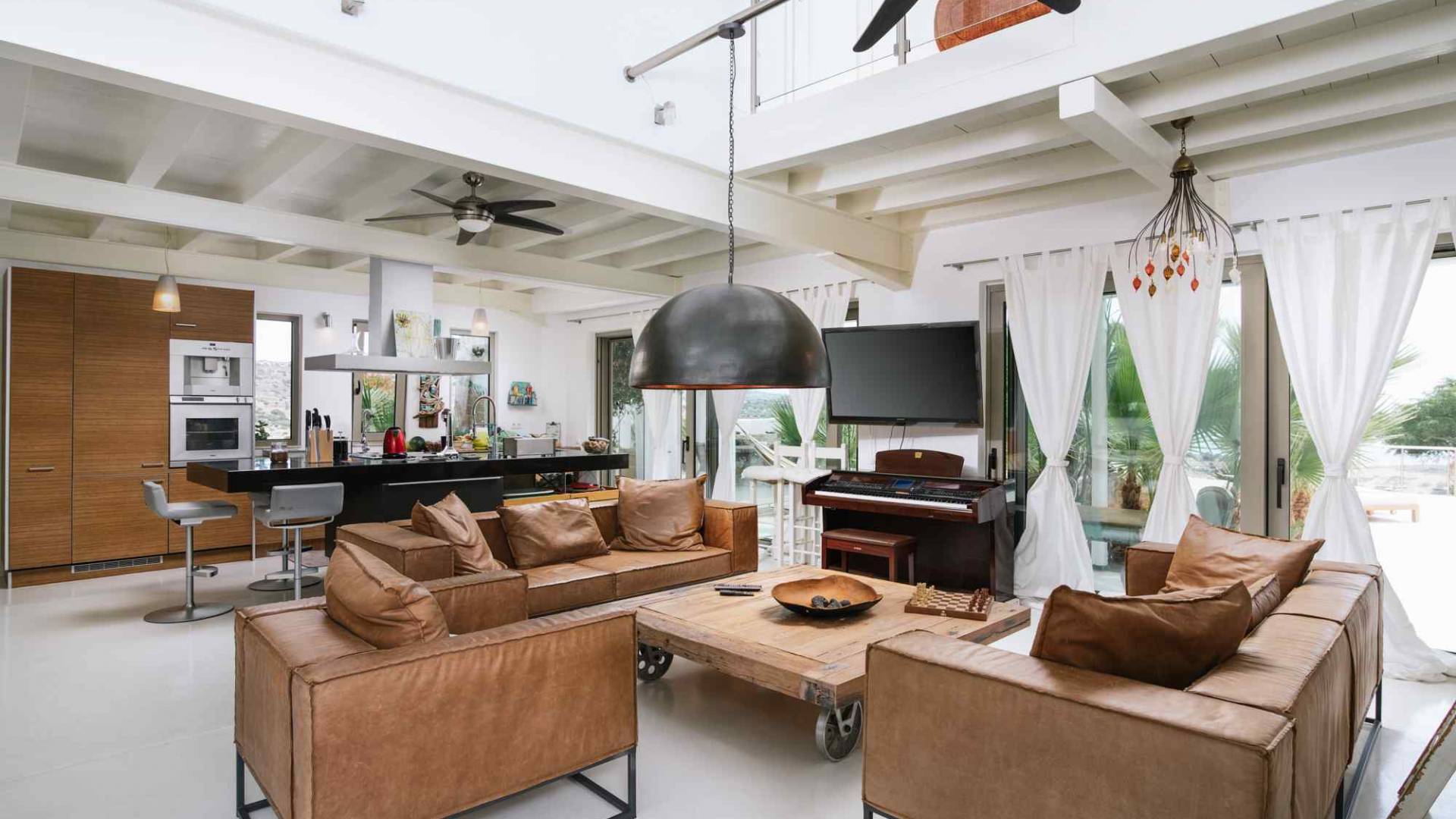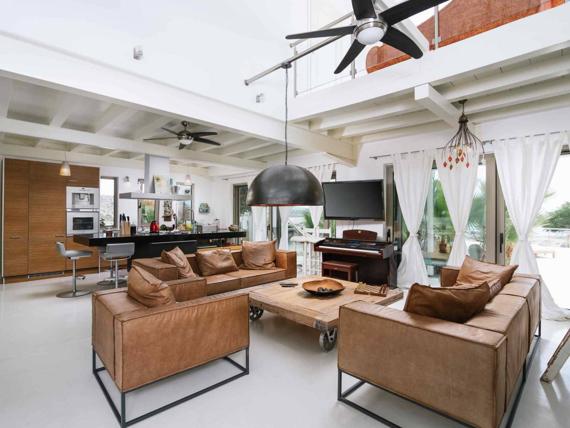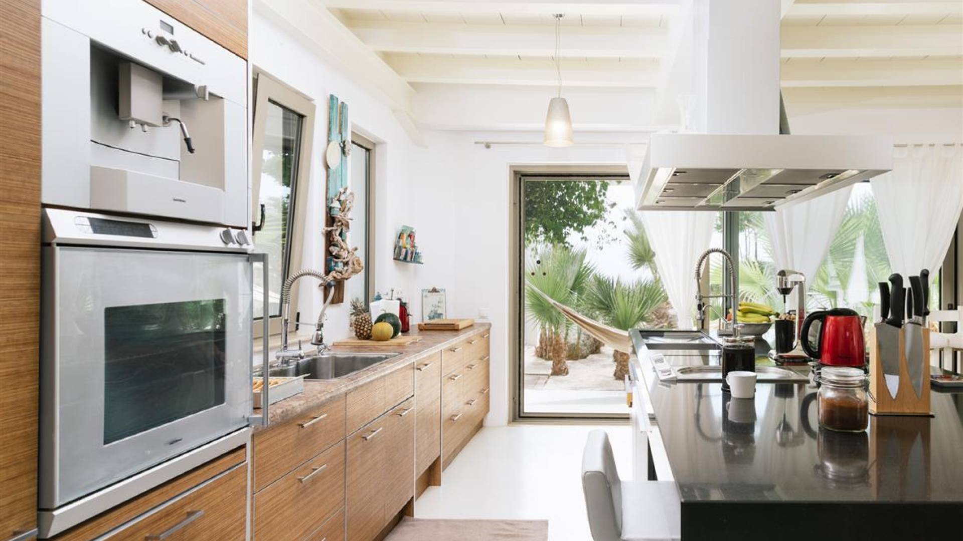 В гостиной с видом на бассейн, сад, нетронутую природу и море мы предлагаем два удобных двуспальных дивана в деревенском стиле, журнальный столик, спутниковое телевидение, современную музыкальную систему, пианино, книжный шкаф, винный холодильник / хьюмидор. Предлагаем бесплатный W-LAN. Кухня оставляет желать лучшего и предлагает все необходимые удобства, такие как большой кухонный остров с 2 сиденьями, двойная раковина, фильтрованная вода для питья, кофеварка, духовка, микроволновая печь, индукционная плита, посудомоечная машина, вытяжка, бок о бок холодильник. , холодильник для напитков и вся необходимая мелкая бытовая техника. В подсобном помещении есть гостевой туалет, а также стиральная машина, сушилка для белья, гладильная доска, раковина.