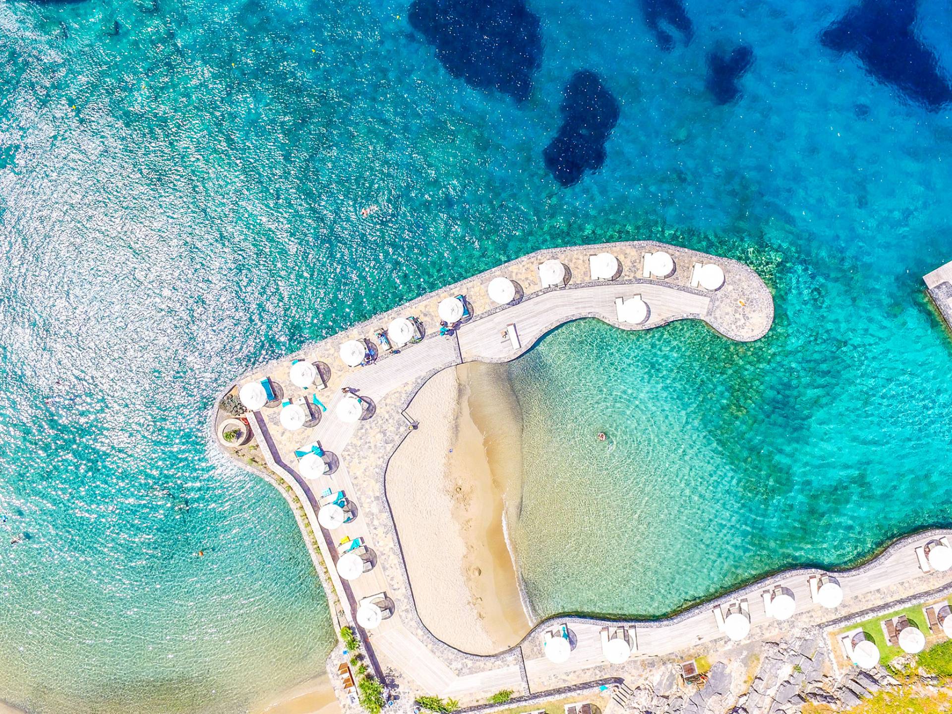 Гости отеля Elounda Peninsula All Suite имеют доступ к двум частным песчаным пляжам: один для эксклюзивного использования гостями отеля, где для каждого люкса отдельно предоставляются зарезервированные зонтики и шезлонги, полностью обслуживаемые прохладительными напитками и закусками, а второй - главный пляж курорта, который включает в себя самый большой бассейн на берегу моря на острове, детский бассейн, пляжный бар и два ресторана.