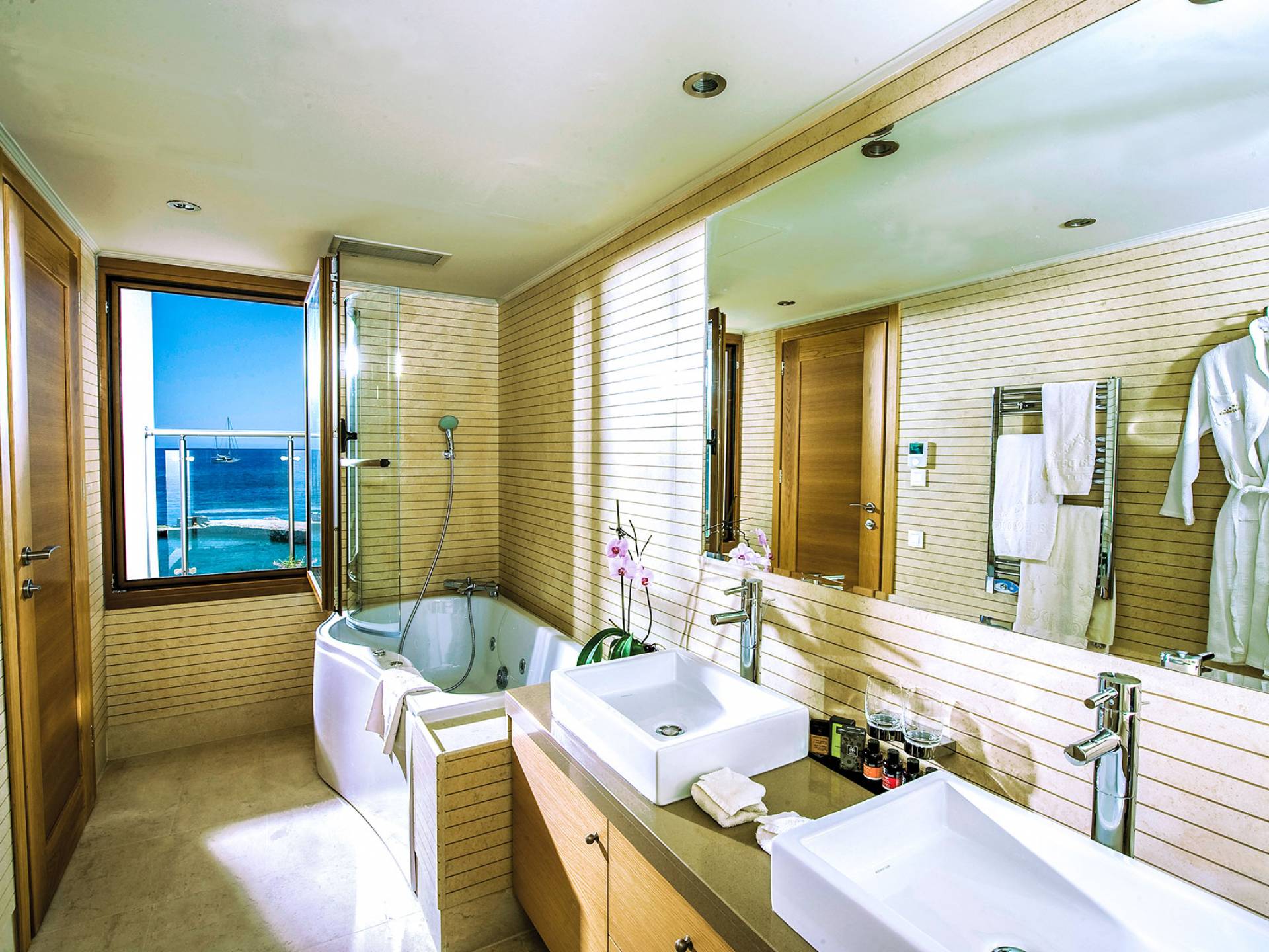Diamond Residence 2BR в отеле Elounda Peninsula состоит из двух спален с двуспальными кроватями и двух спален с односпальной кроватью прибл. 200 м² жилой площади (6 гостей), роскошные резиденции на берегу моря, каждая с собственной открытой территорией, частным бассейном с морской водой с подогревом* и беспрепятственным видом на Эгейское море создают ощущение эксклюзивности. Частный курорт с выходом на эксклюзивный песчаный пляж. Гостиная зона с высококачественной электроникой, включая ЖК-телевизор и систему объемного звучания, выходит на частную террасу, где расположен открытый подогреваемый бассейн с морской водой. В спальнях есть роскошные мраморные ванные комнаты, джакузи, элегантная роскошная отделка и гостевой туалет.