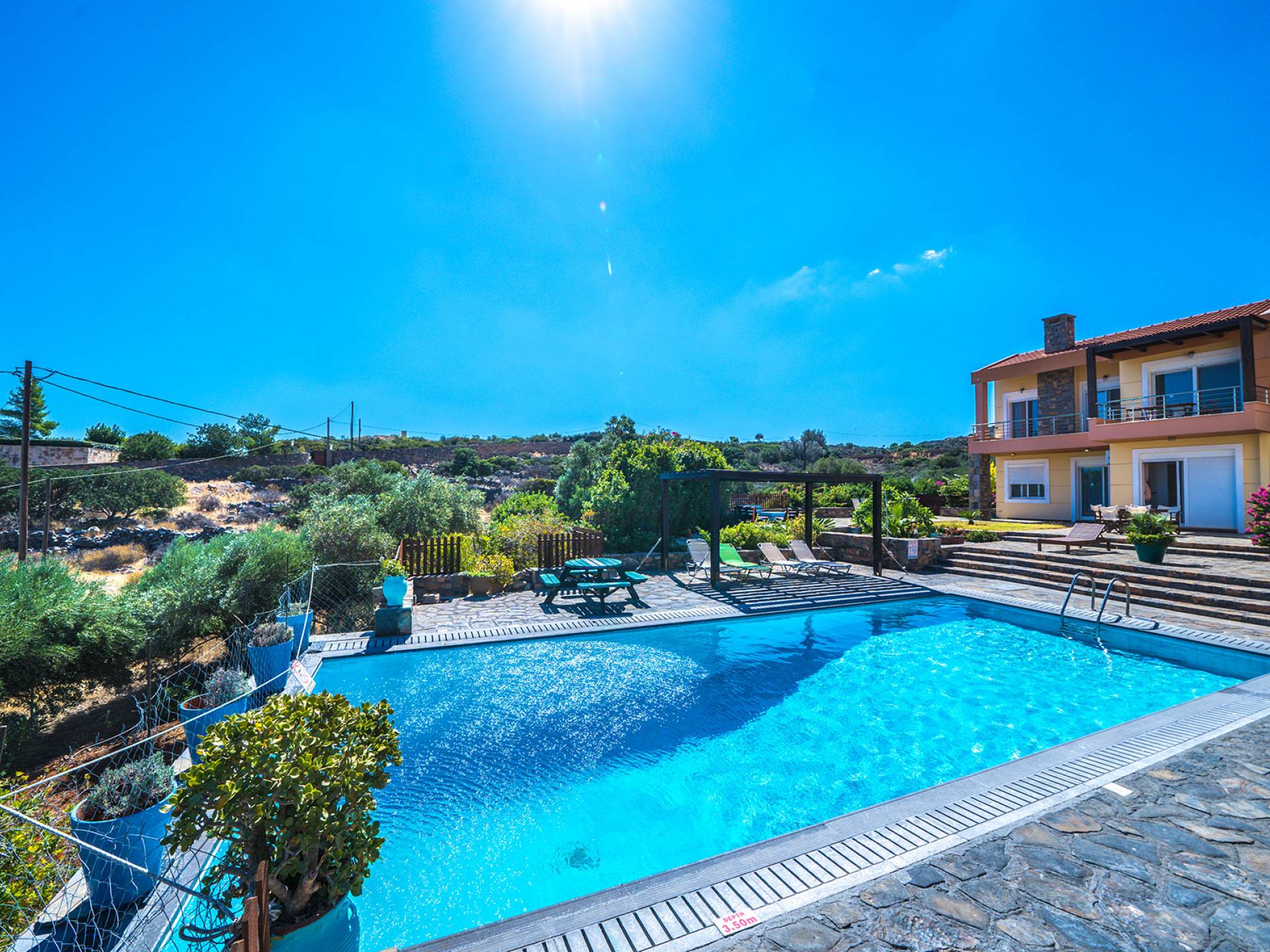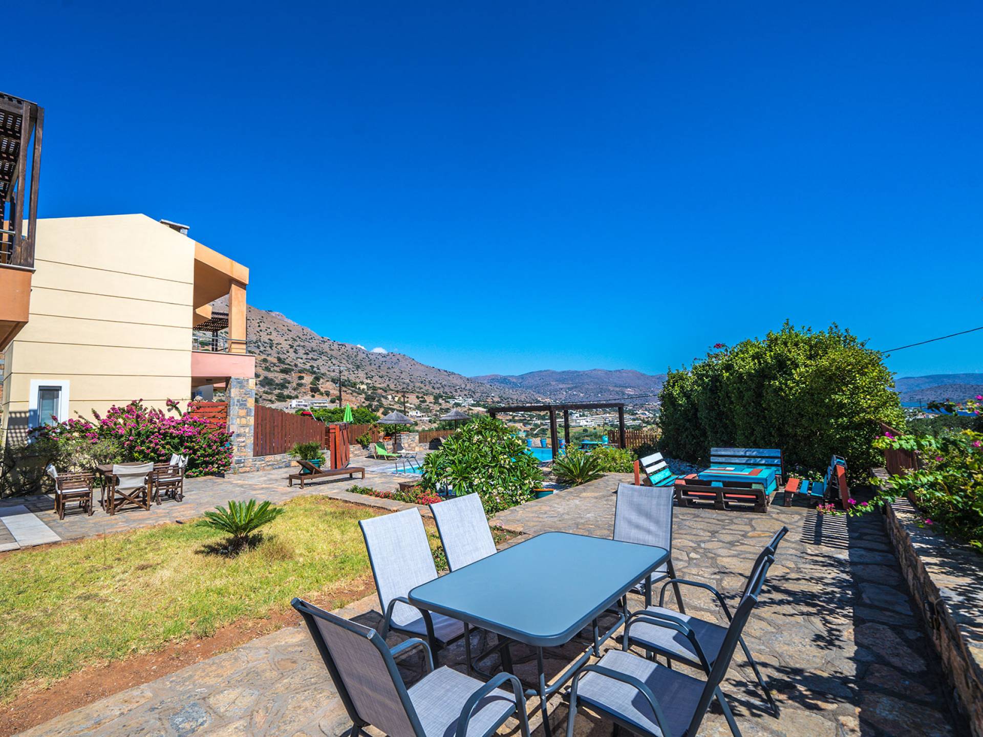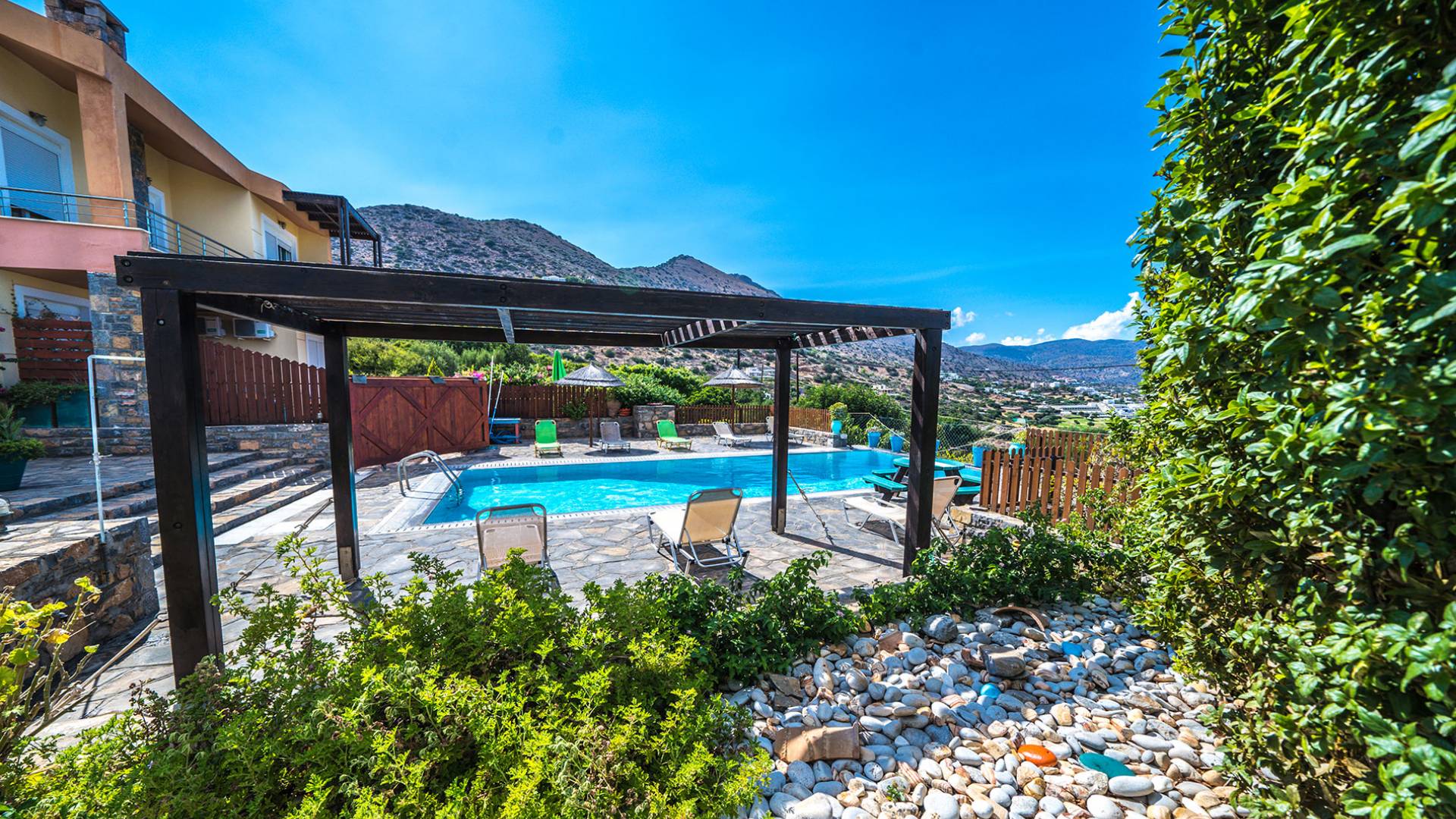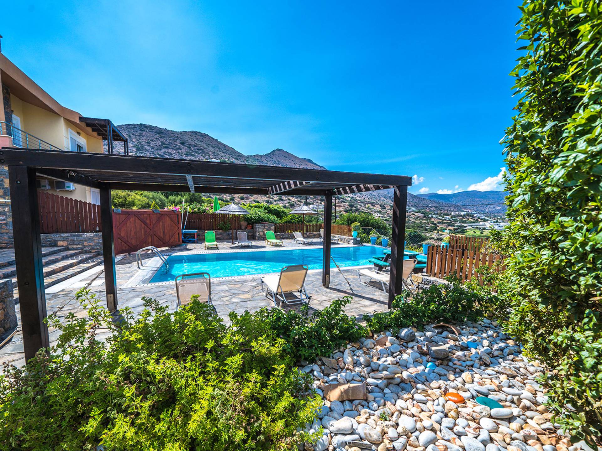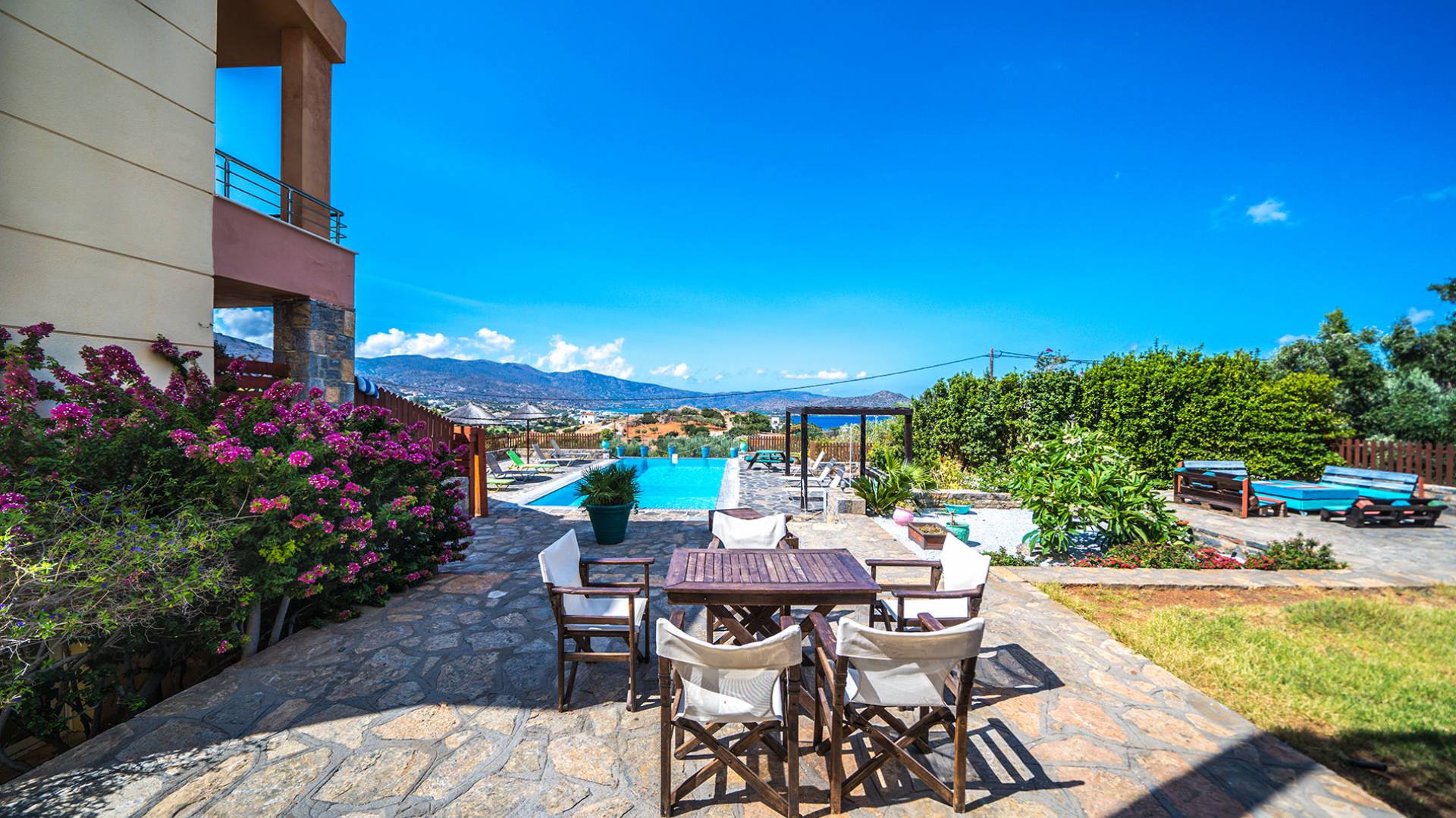 Снаружи кристально чистый частный бассейн окружен пышным садом с видом на близлежащие роскошные отели и Критское море, залив Мирабелло и остров Спиналонга. Несколько ухоженных террас ведут вверх по холмистой местности к дому и бассейну. Большой бассейн является эксклюзивным для виллы. У бассейна и в саду есть места как в прохладной тени, так и в ярком свете, а также уединение и бесконечный вид. Свет и виды зеленого и синего проникают через окна виллы.