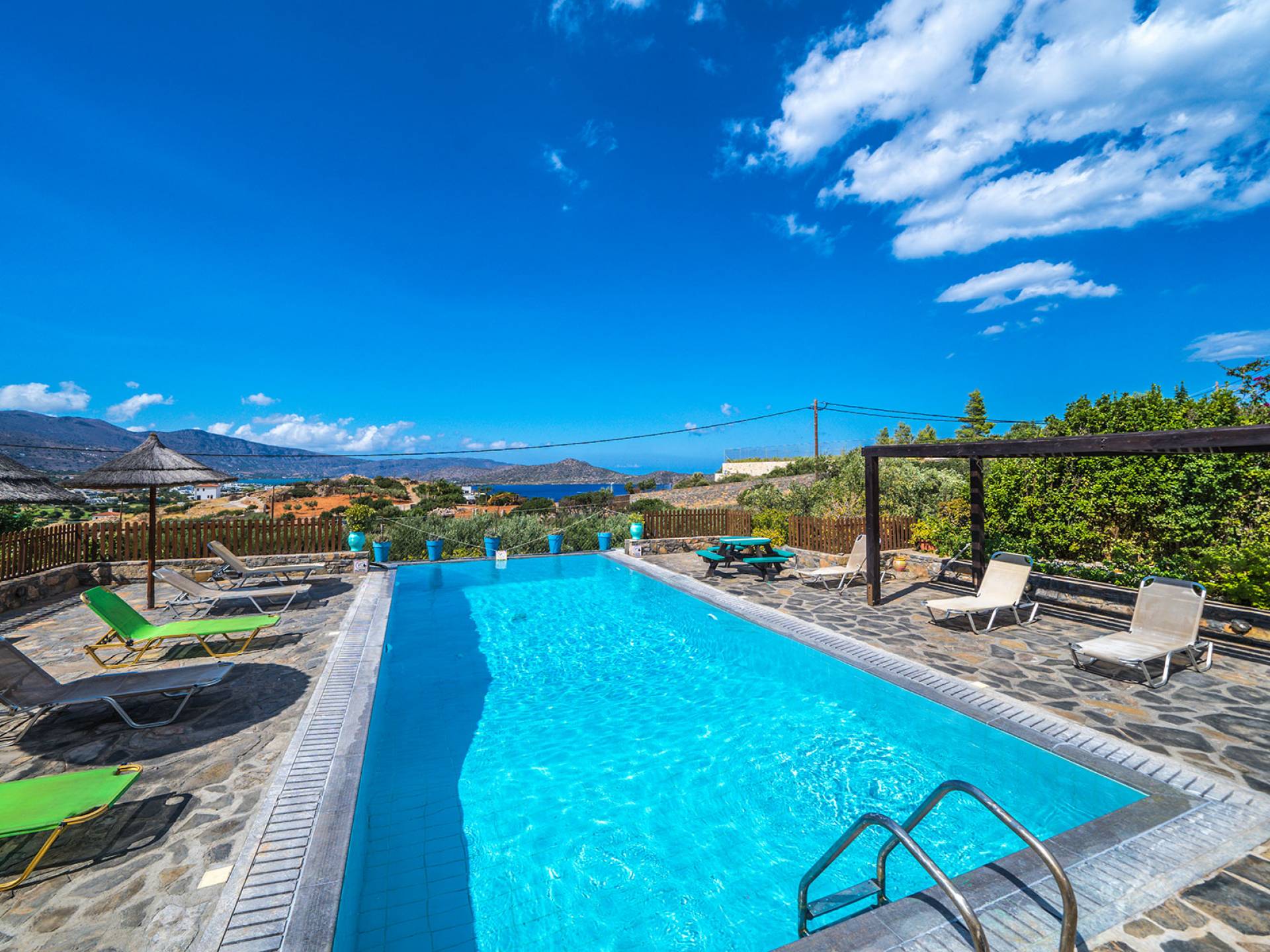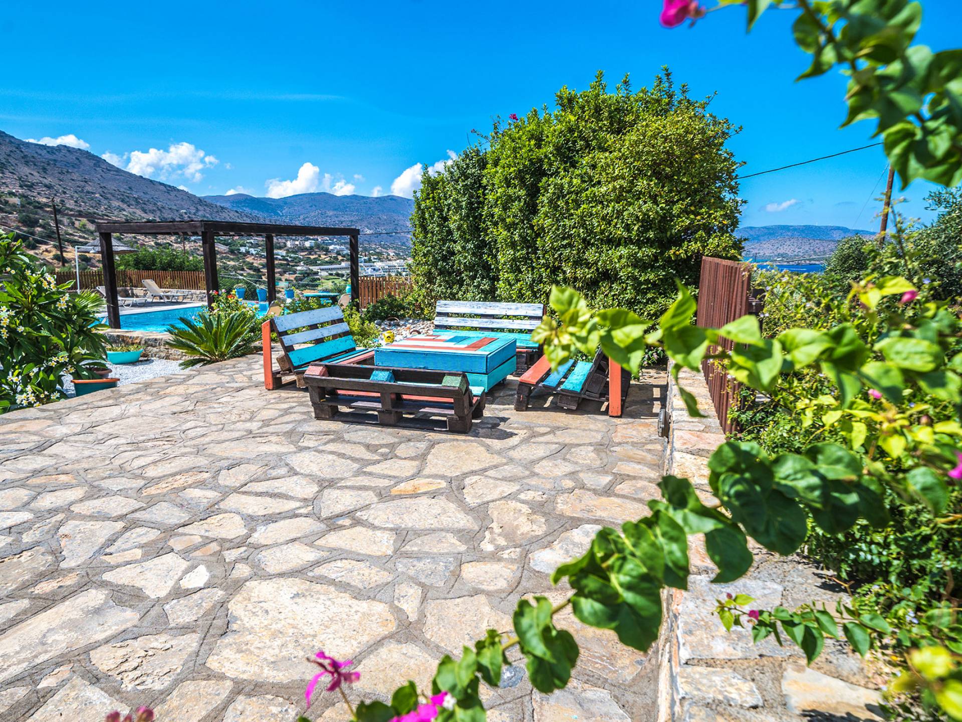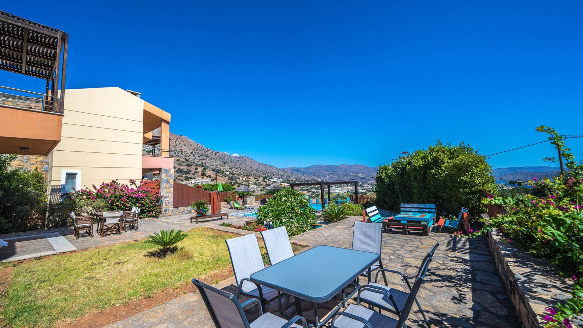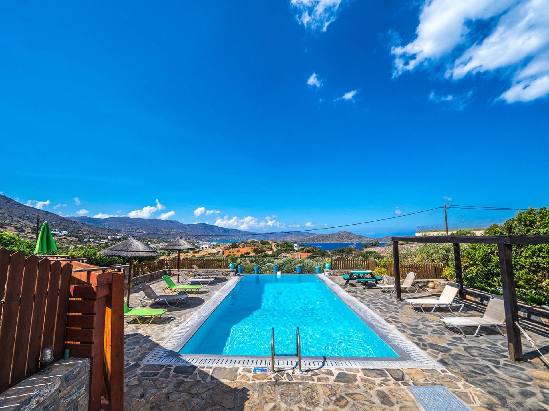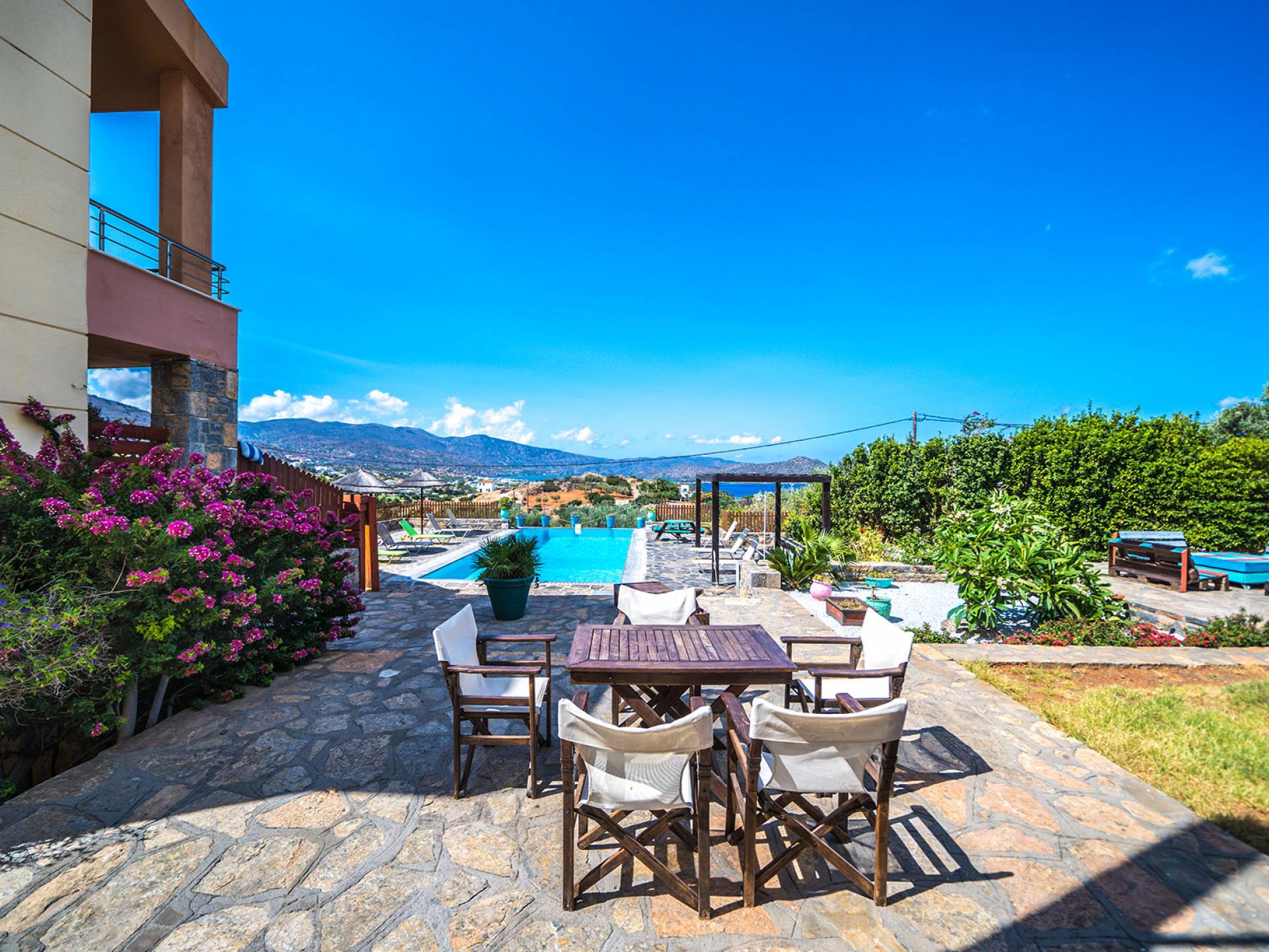Снаружи кристально чистый частный бассейн окружен пышным садом с видом на близлежащие роскошные отели и Критское море, залив Мирабелло и остров Спиналонга. Несколько ухоженных террас ведут вверх по холмистой местности к дому и бассейну. Большой бассейн является эксклюзивным для виллы. У бассейна и в саду есть места как в прохладной тени, так и в ярком свете, а также уединение и бесконечный вид. Свет и виды зеленого и синего проникают через окна виллы.