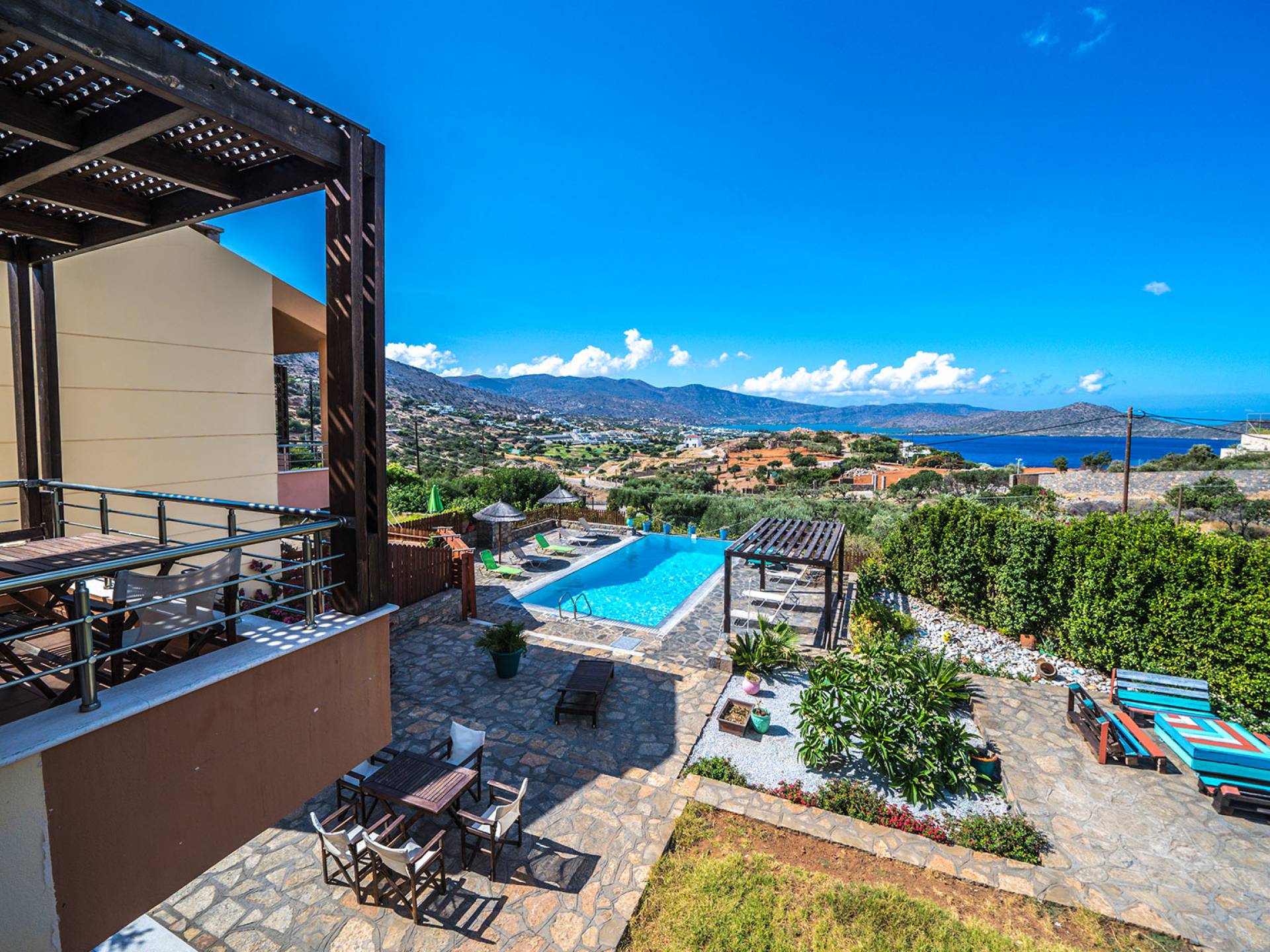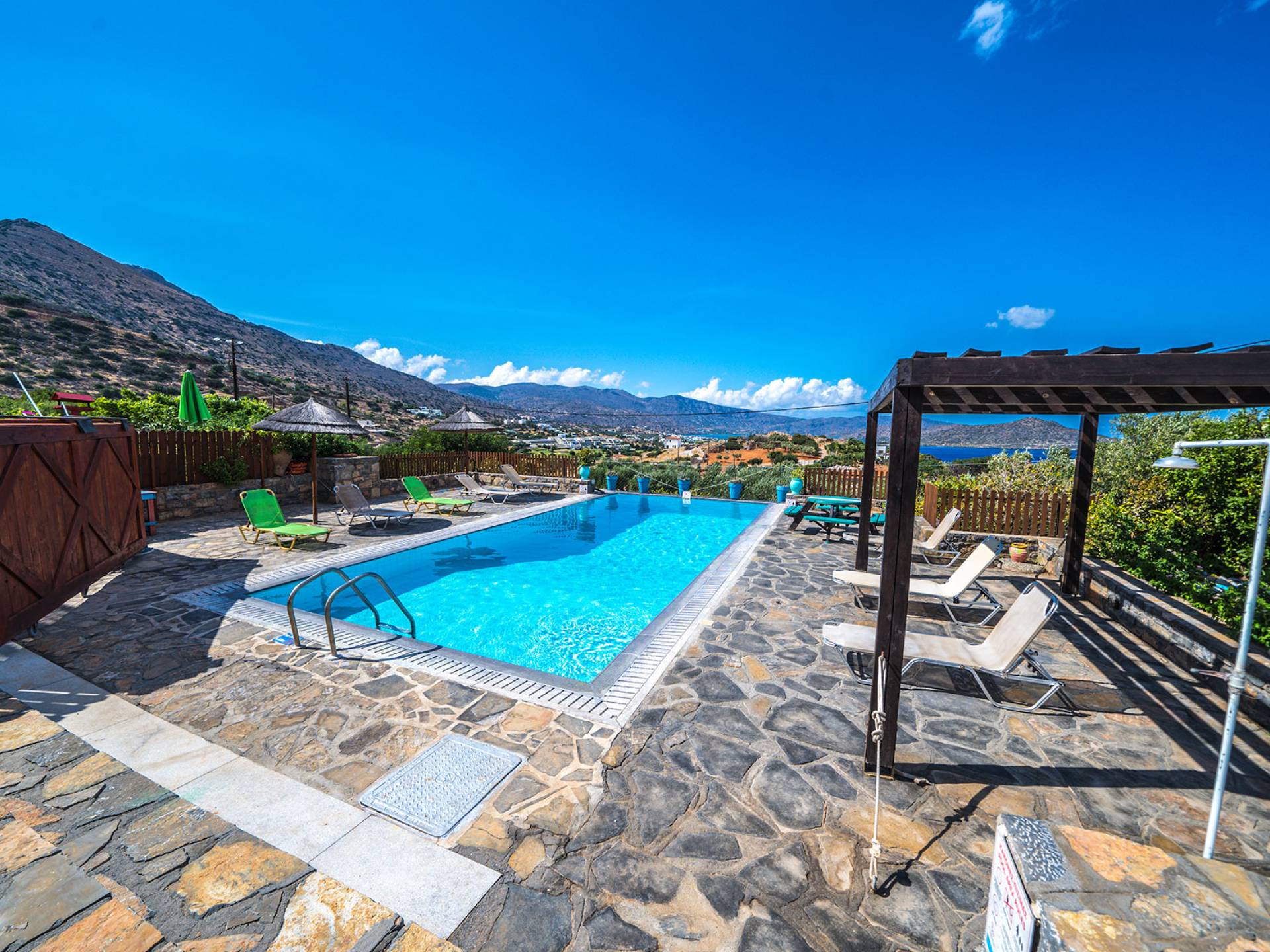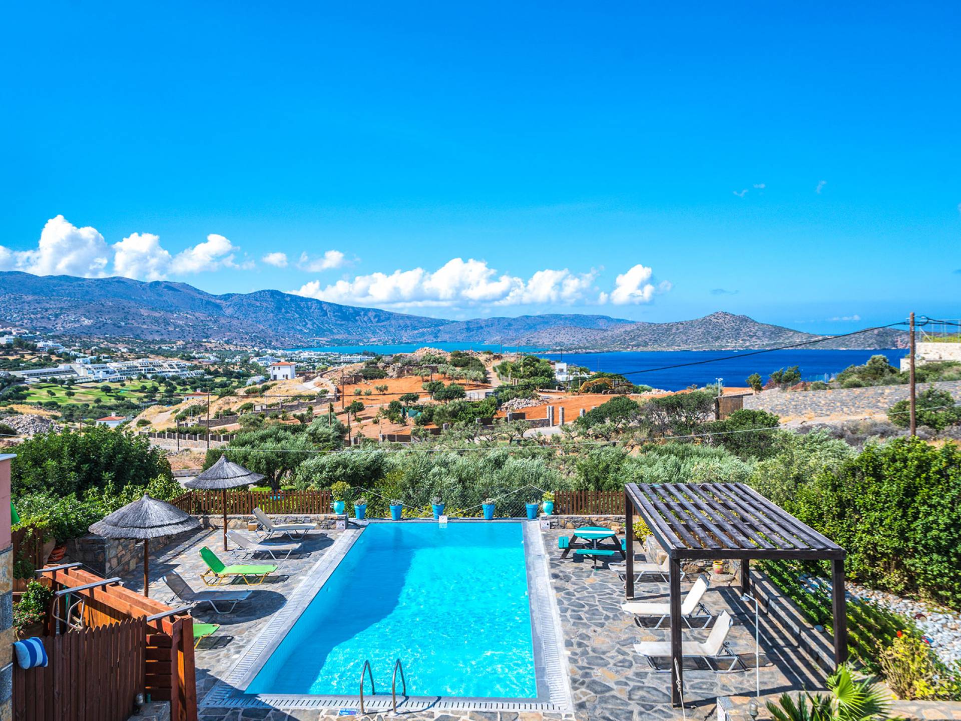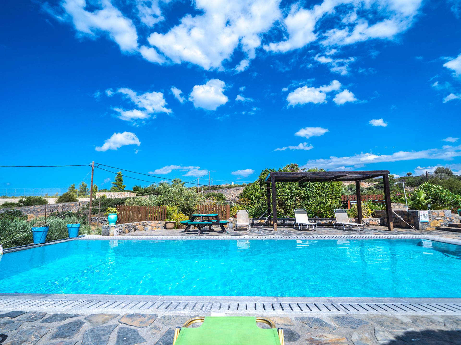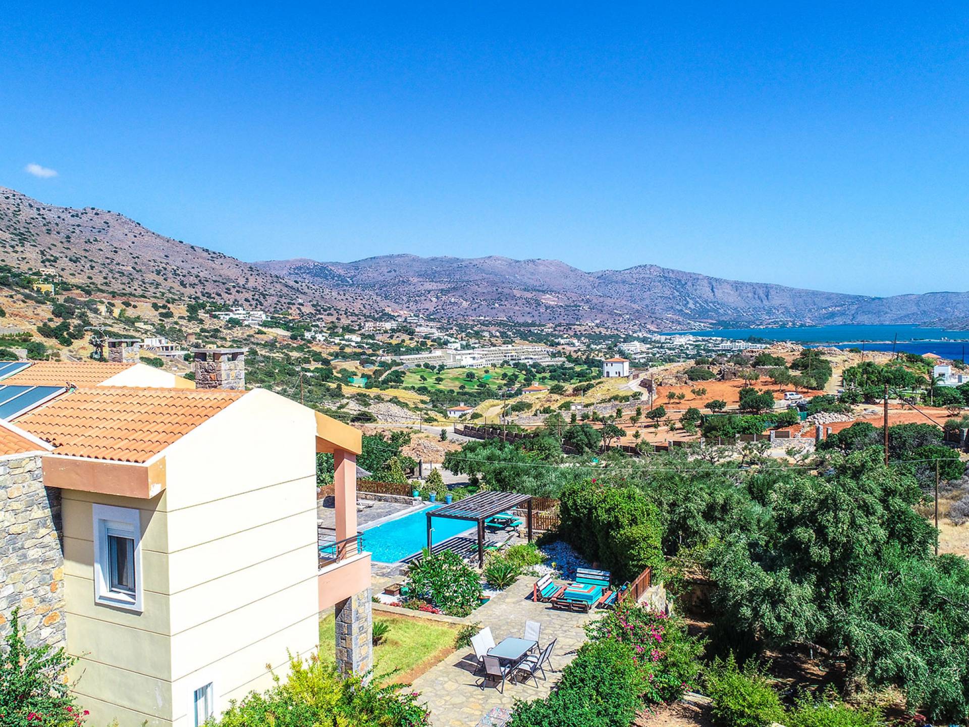 Снаружи кристально чистый частный бассейн окружен пышным садом с видом на близлежащие роскошные отели и Критское море, залив Мирабелло и остров Спиналонга. Несколько ухоженных террас ведут вверх по холмистой местности к дому и бассейну. Большой бассейн является эксклюзивным для виллы. У бассейна и в саду есть места как в прохладной тени, так и в ярком свете, а также уединение и бесконечный вид. Свет и виды зеленого и синего проникают через окна виллы.