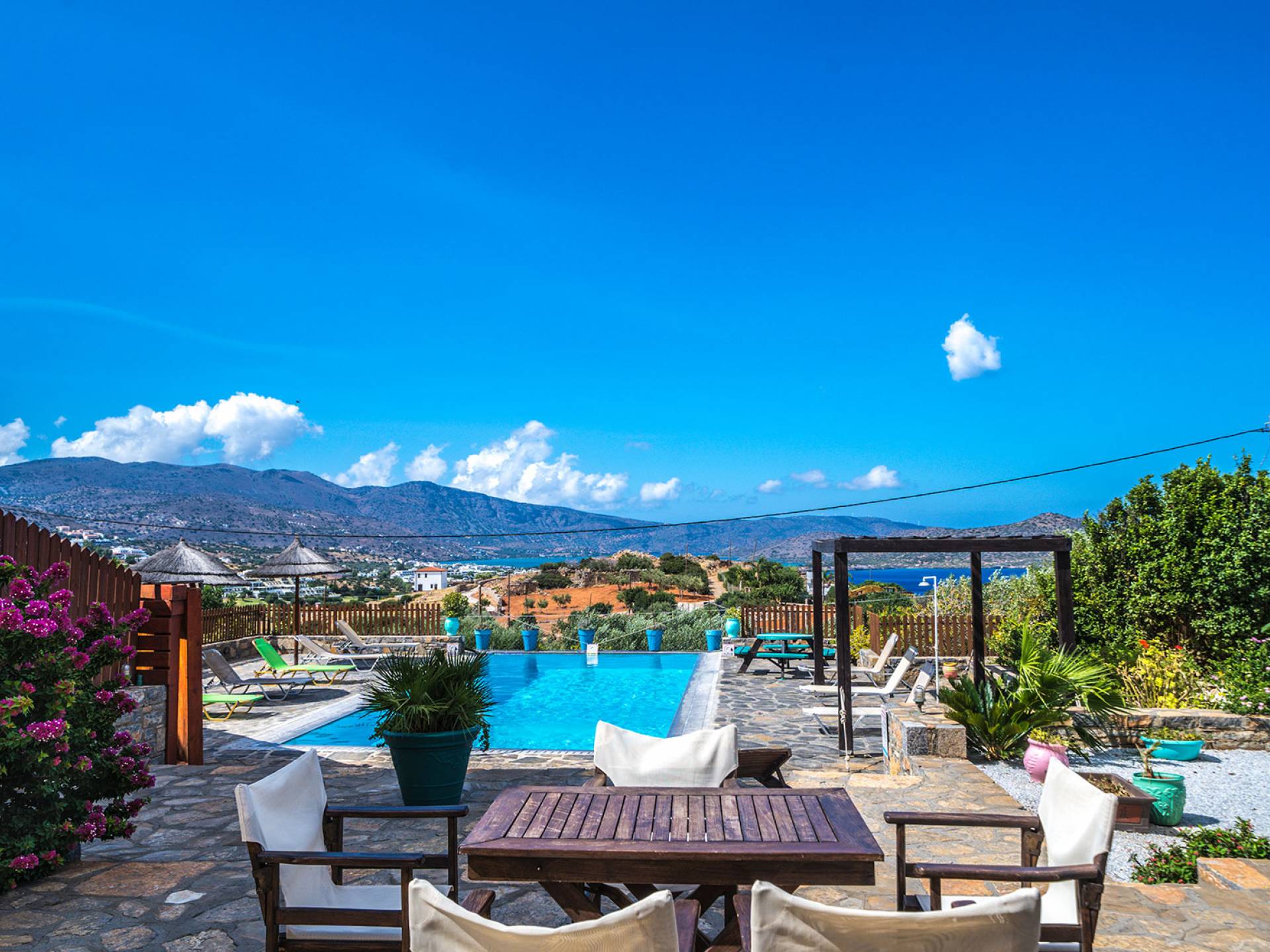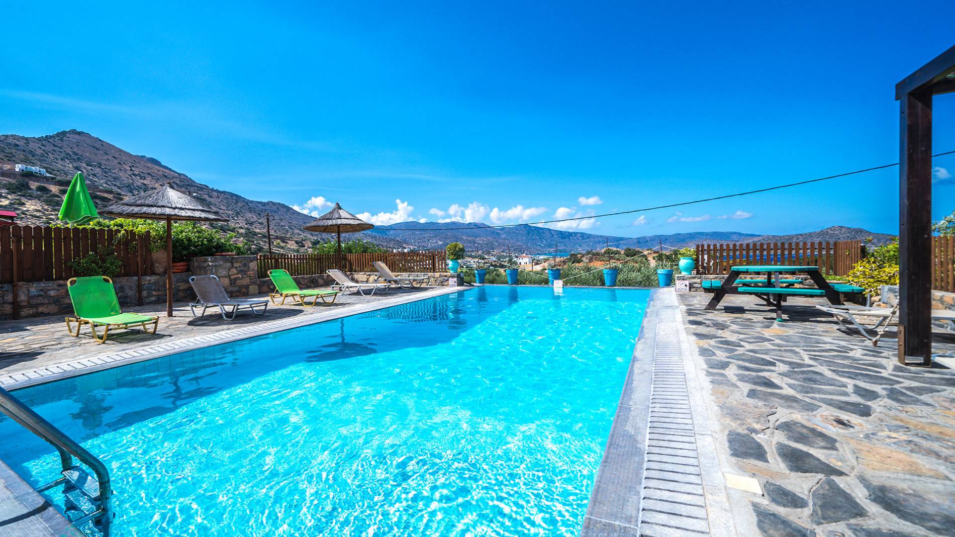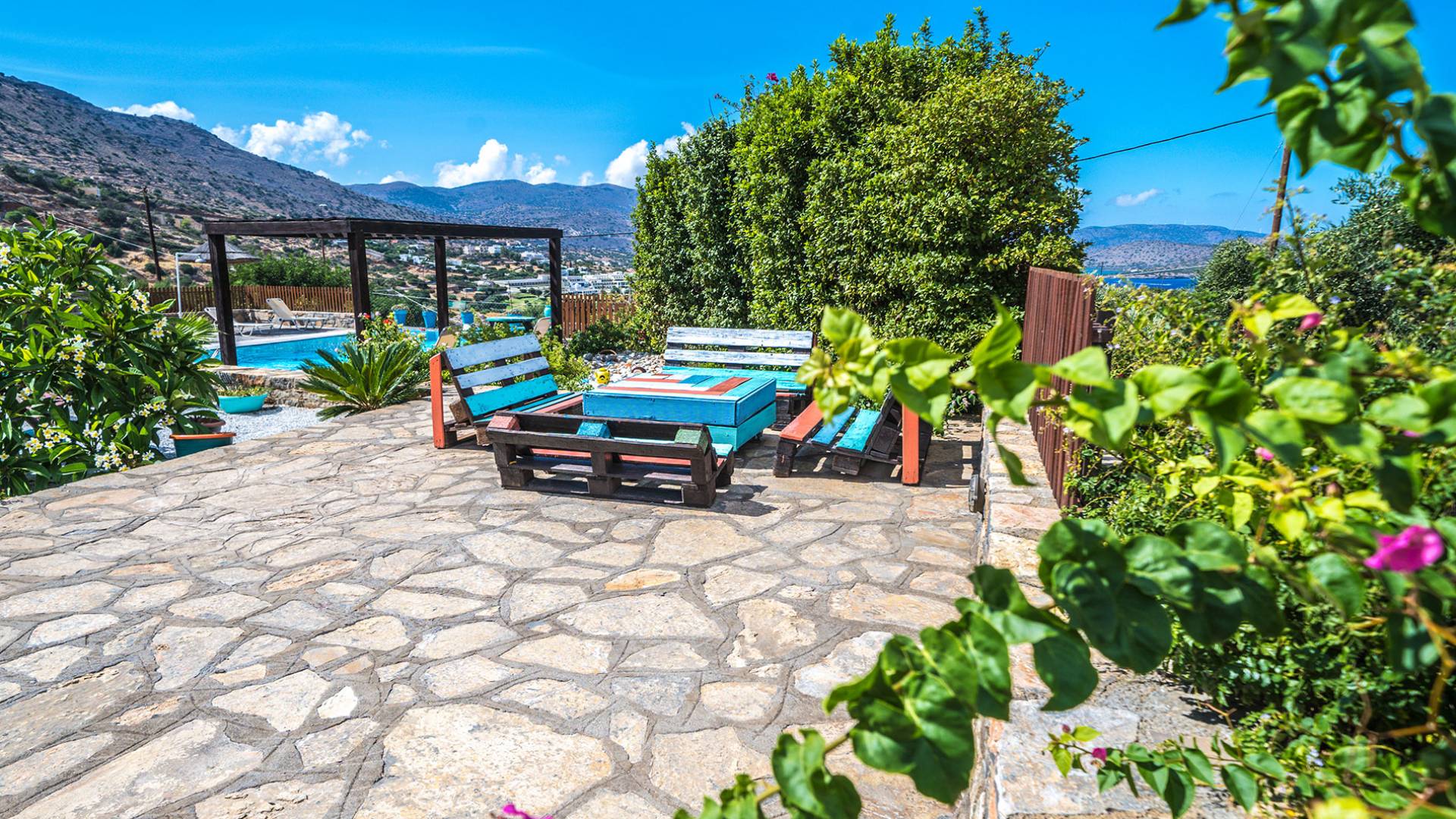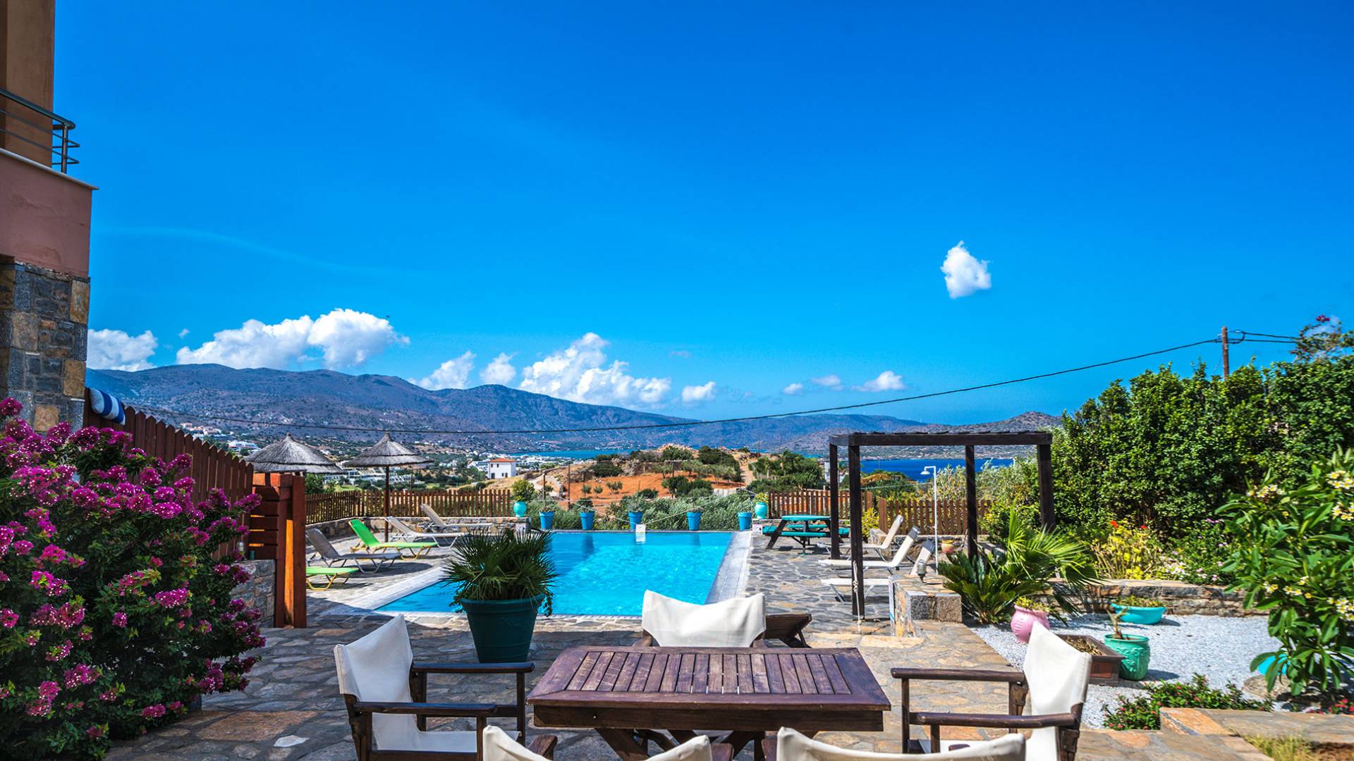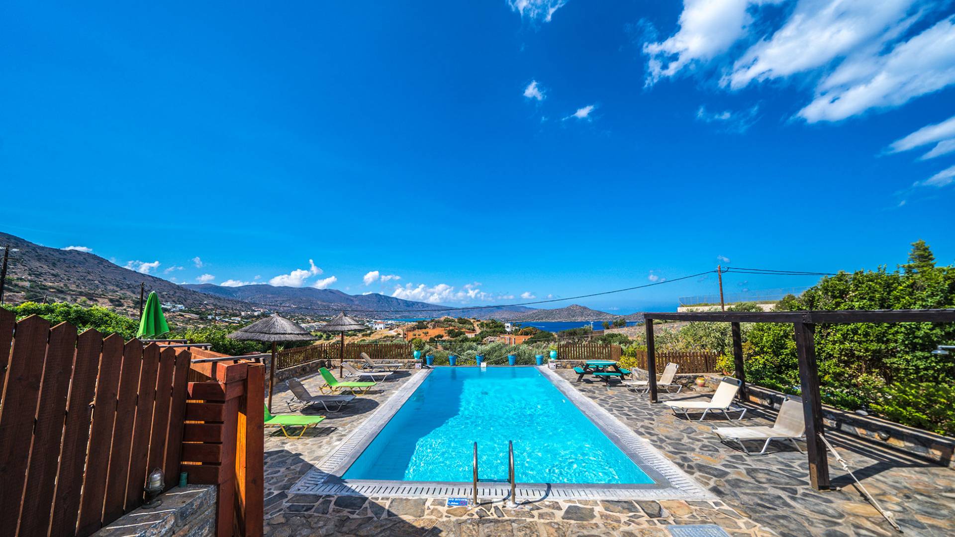 Снаружи кристально чистый частный бассейн окружен пышным садом с видом на близлежащие роскошные отели и Критское море, залив Мирабелло и остров Спиналонга. Несколько ухоженных террас ведут вверх по холмистой местности к дому и бассейну. Большой бассейн является эксклюзивным для виллы. У бассейна и в саду есть места как в прохладной тени, так и в ярком свете, а также уединение и бесконечный вид. Свет и виды зеленого и синего проникают через окна виллы.