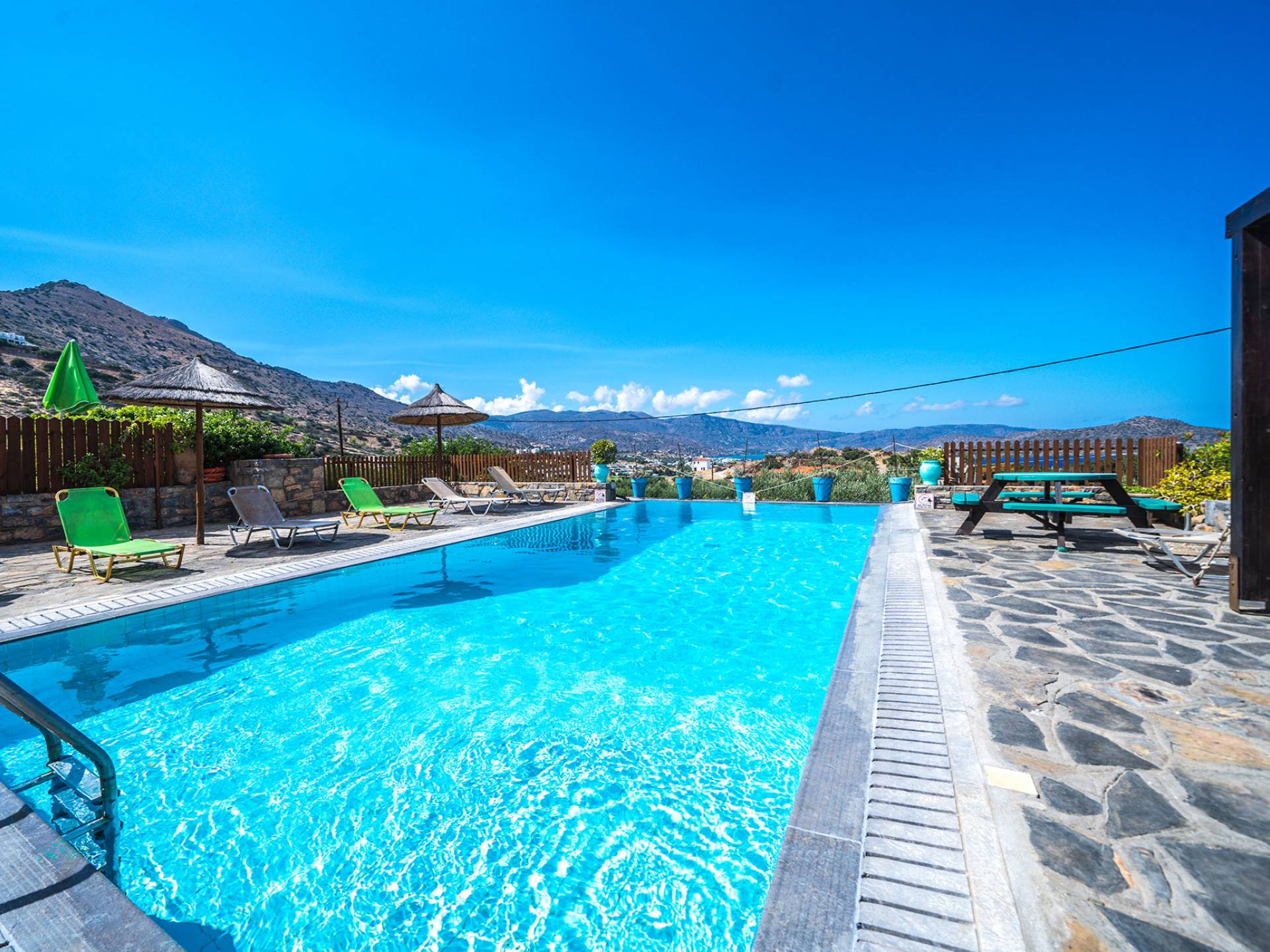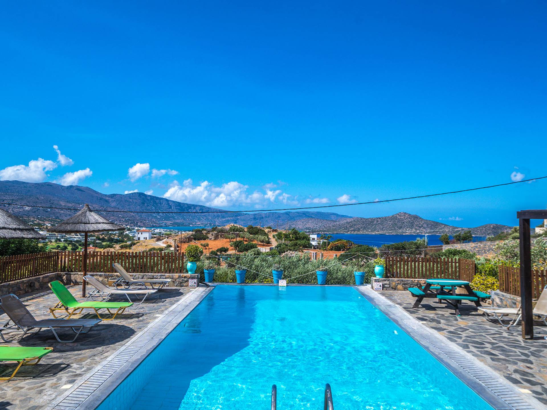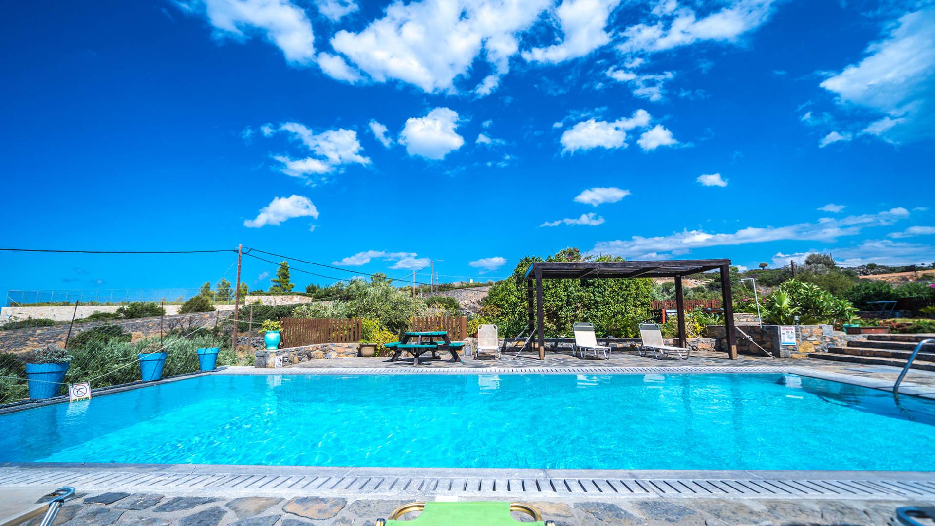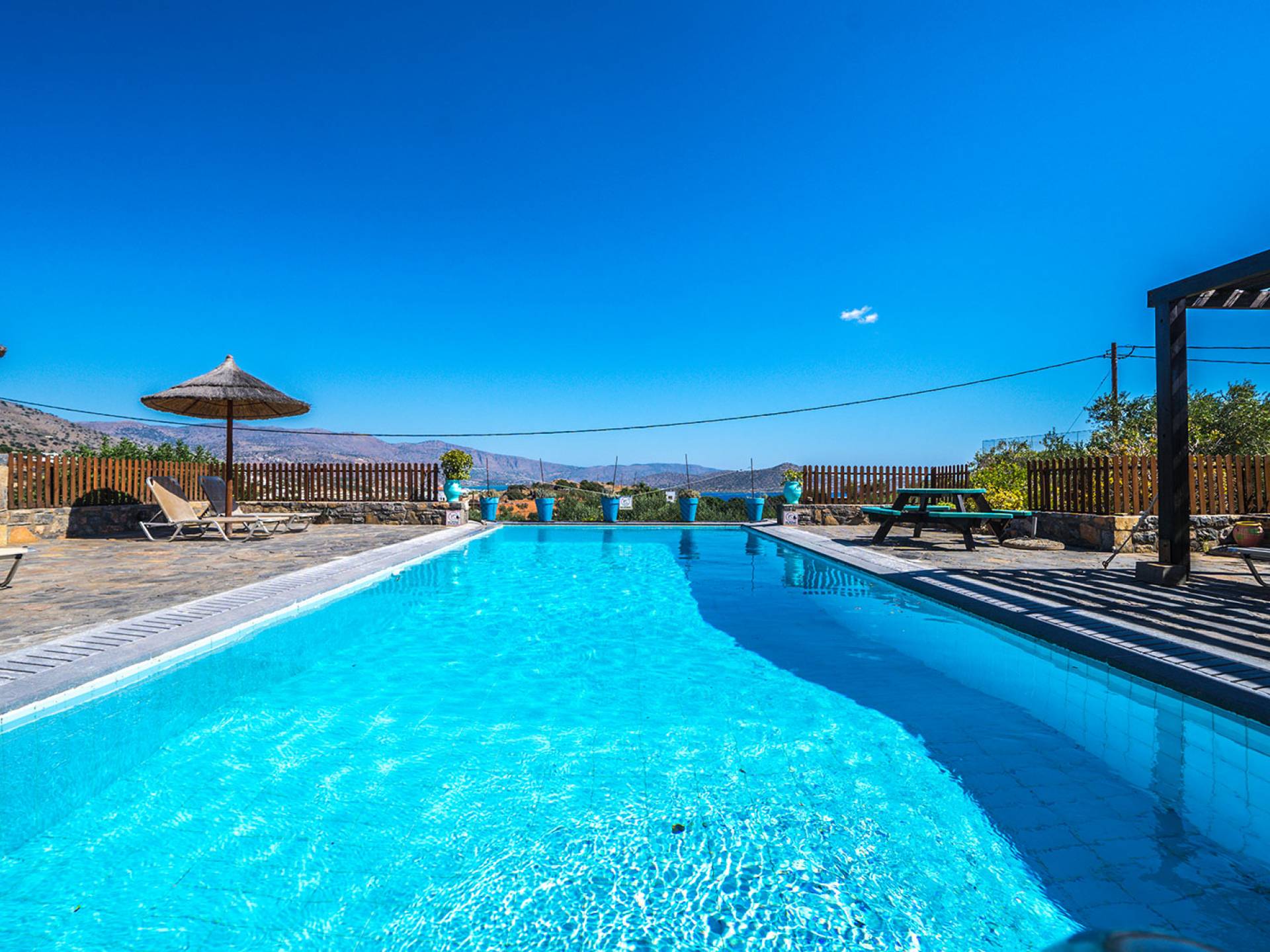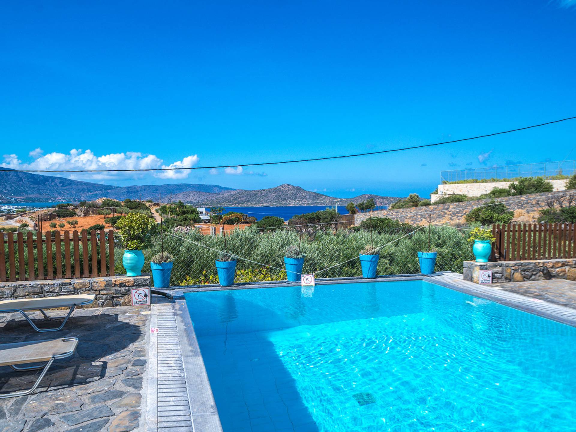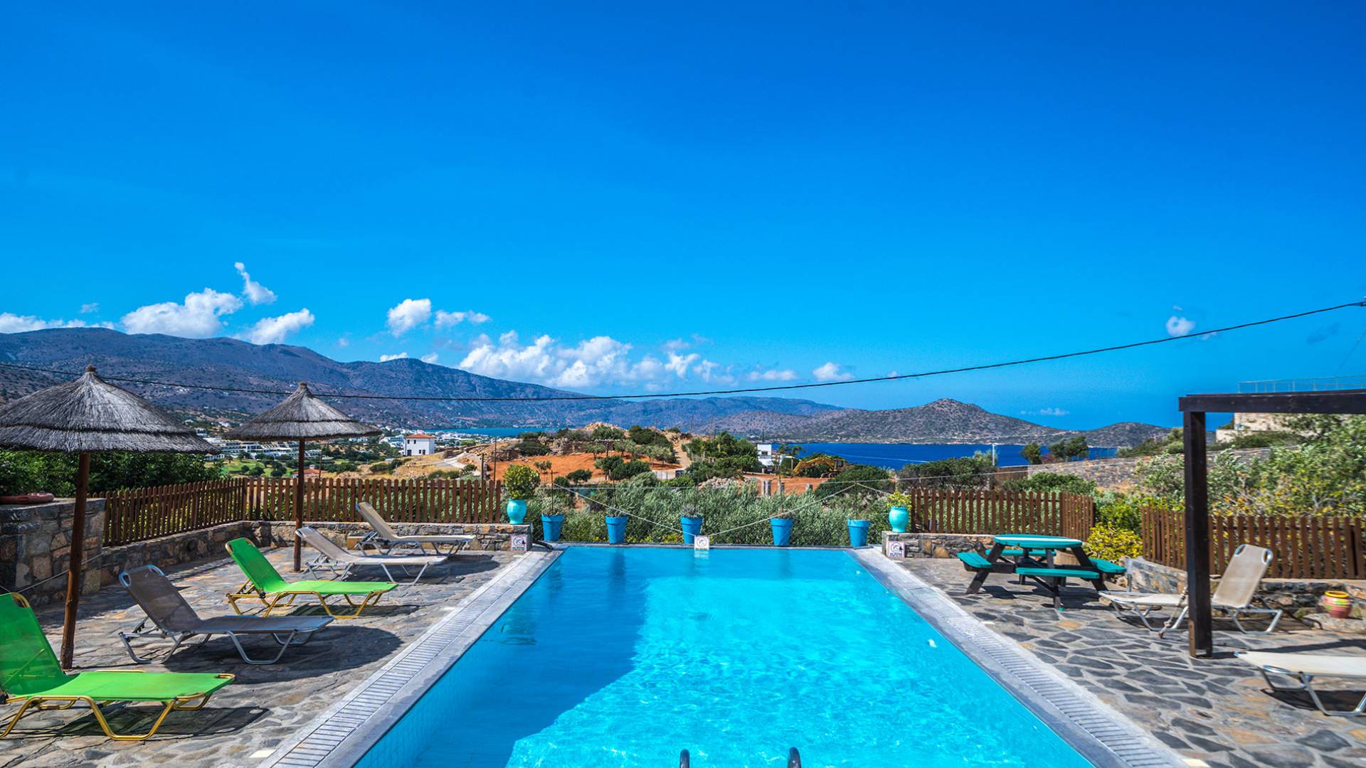 Снаружи кристально чистый частный бассейн окружен пышным садом с видом на близлежащие роскошные отели и Критское море, залив Мирабелло и остров Спиналонга. Несколько ухоженных террас ведут вверх по холмистой местности к дому и бассейну. Большой бассейн является эксклюзивным для виллы. У бассейна и в саду есть места как в прохладной тени, так и в ярком свете, а также уединение и бесконечный вид. Свет и виды зеленого и синего проникают через окна виллы.