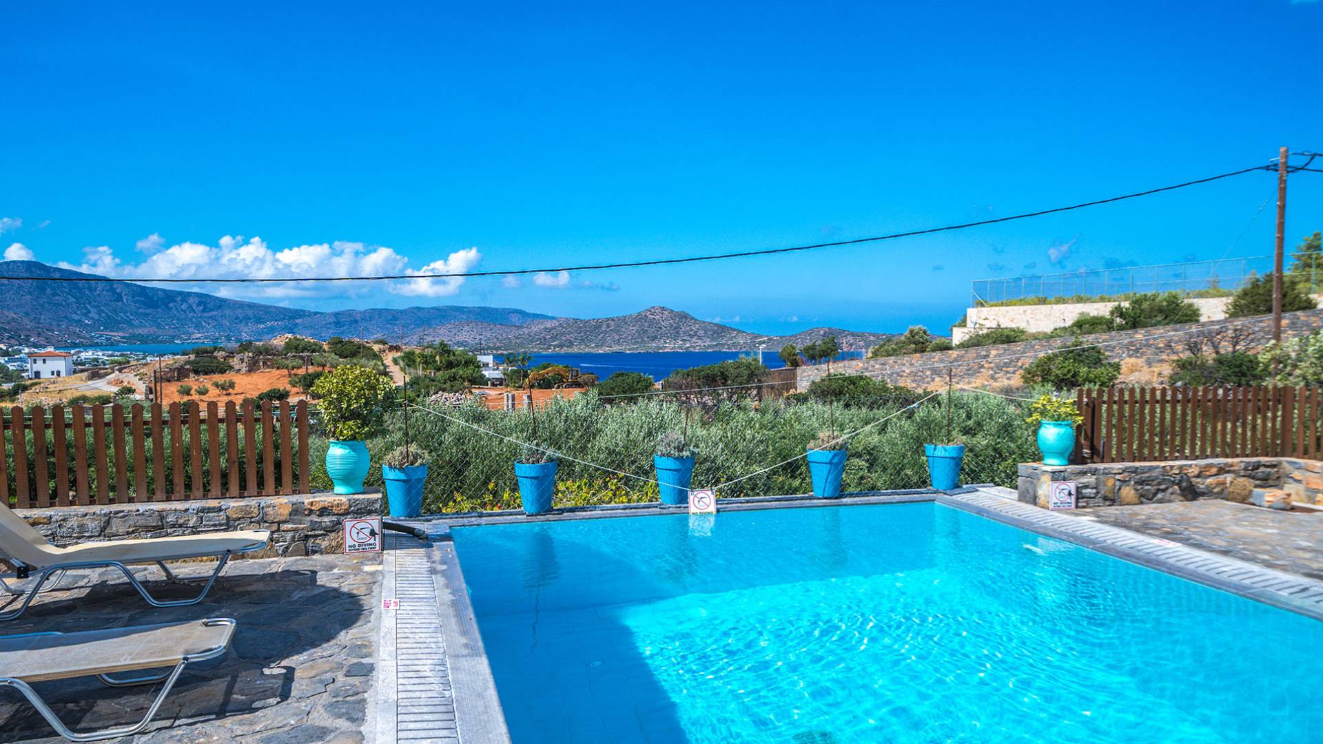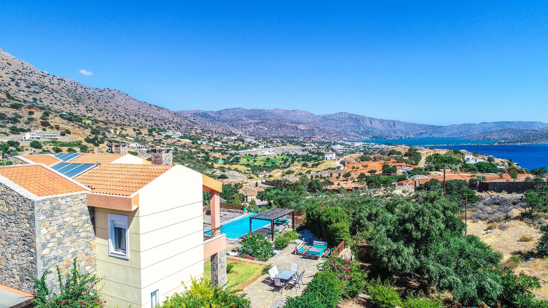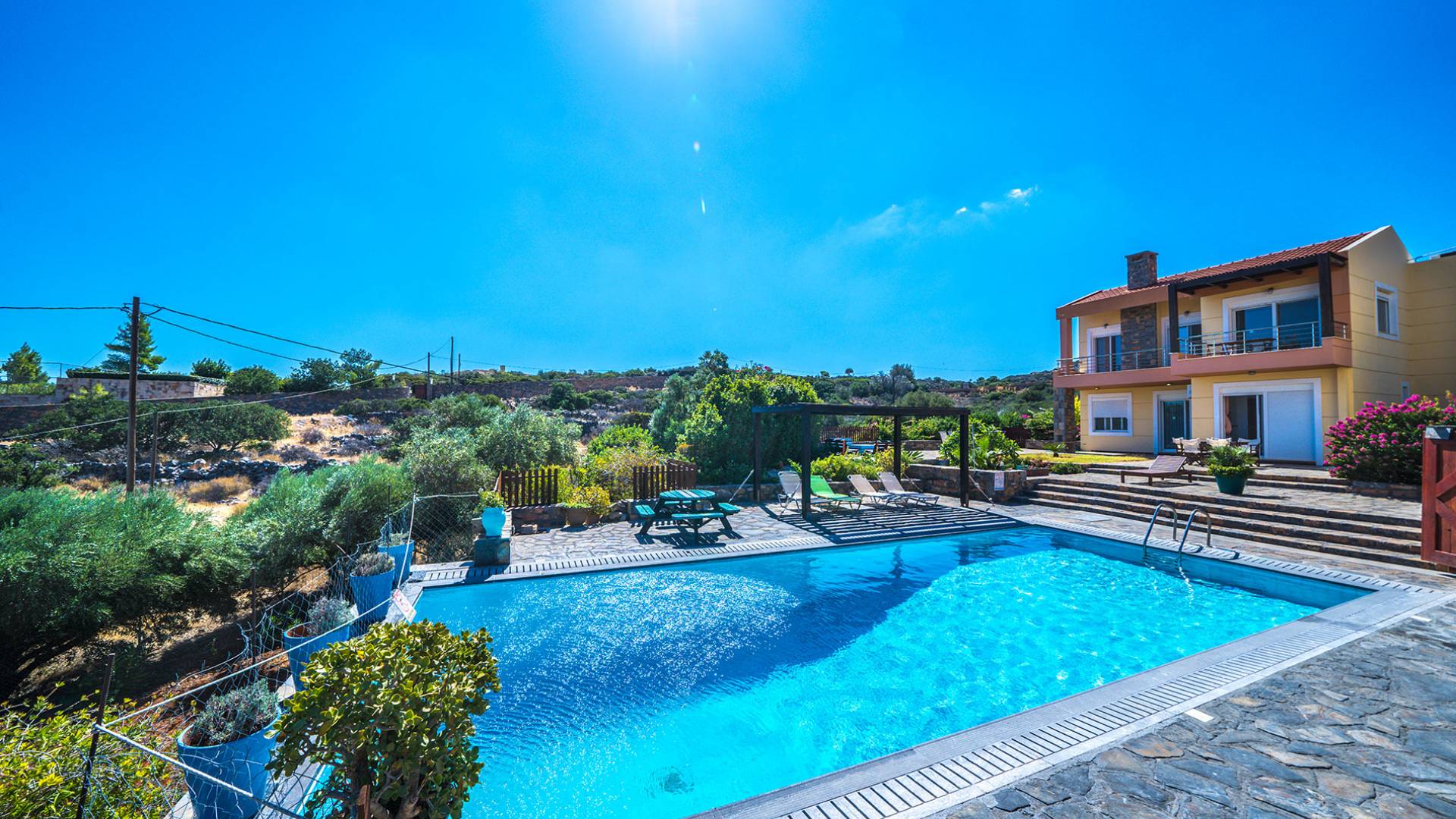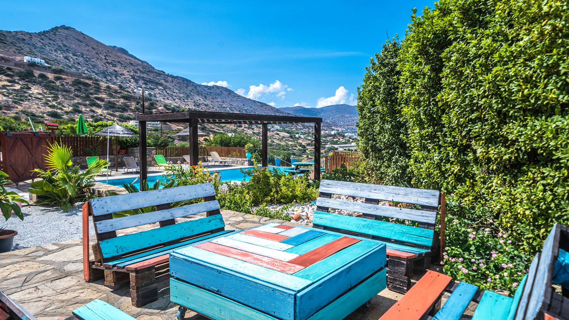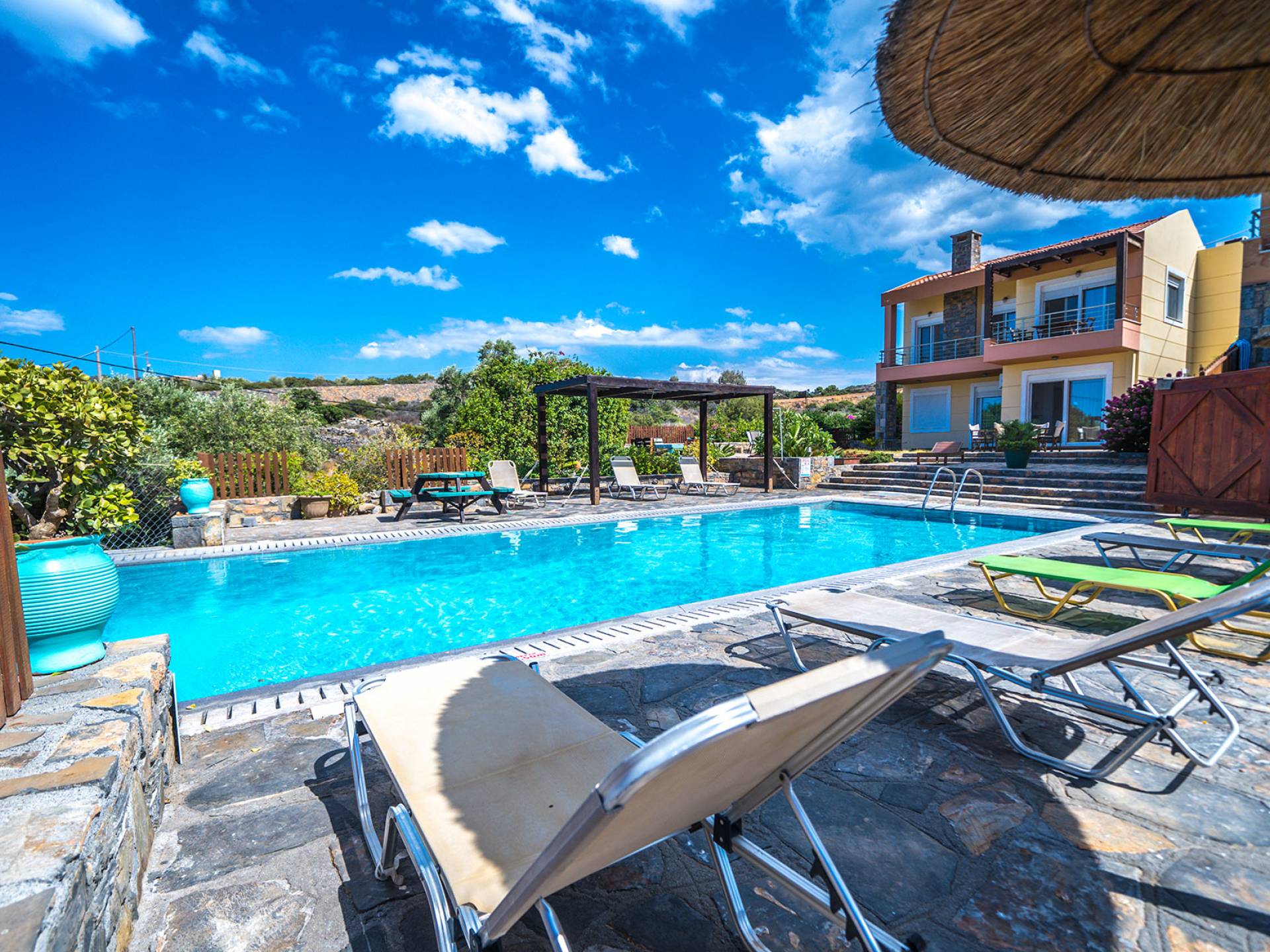 Снаружи кристально чистый частный бассейн окружен пышным садом с видом на близлежащие роскошные отели и Критское море, залив Мирабелло и остров Спиналонга. Несколько ухоженных террас ведут вверх по холмистой местности к дому и бассейну. Большой бассейн является эксклюзивным для виллы. У бассейна и в саду есть места как в прохладной тени, так и в ярком свете, а также уединение и бесконечный вид. Свет и виды зеленого и синего проникают через окна виллы.