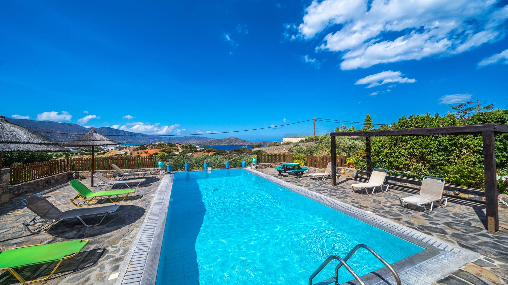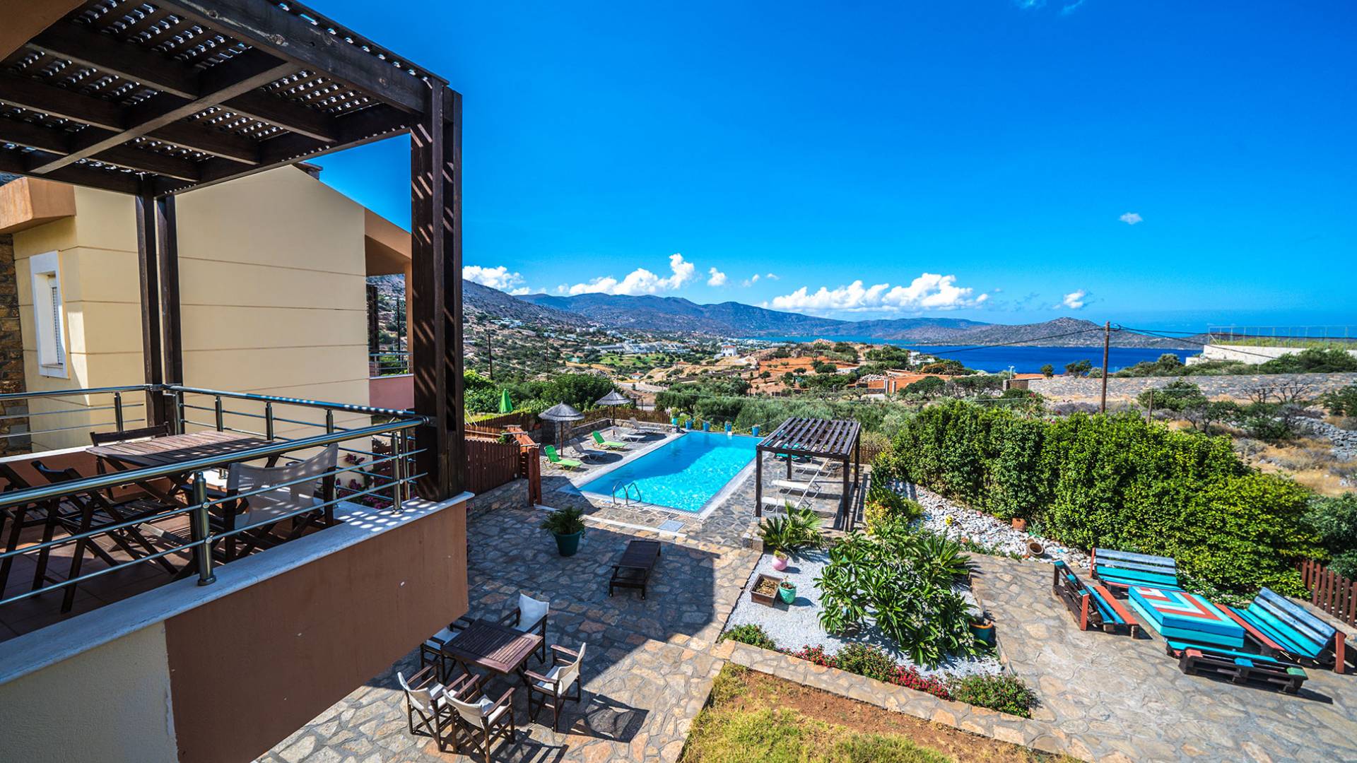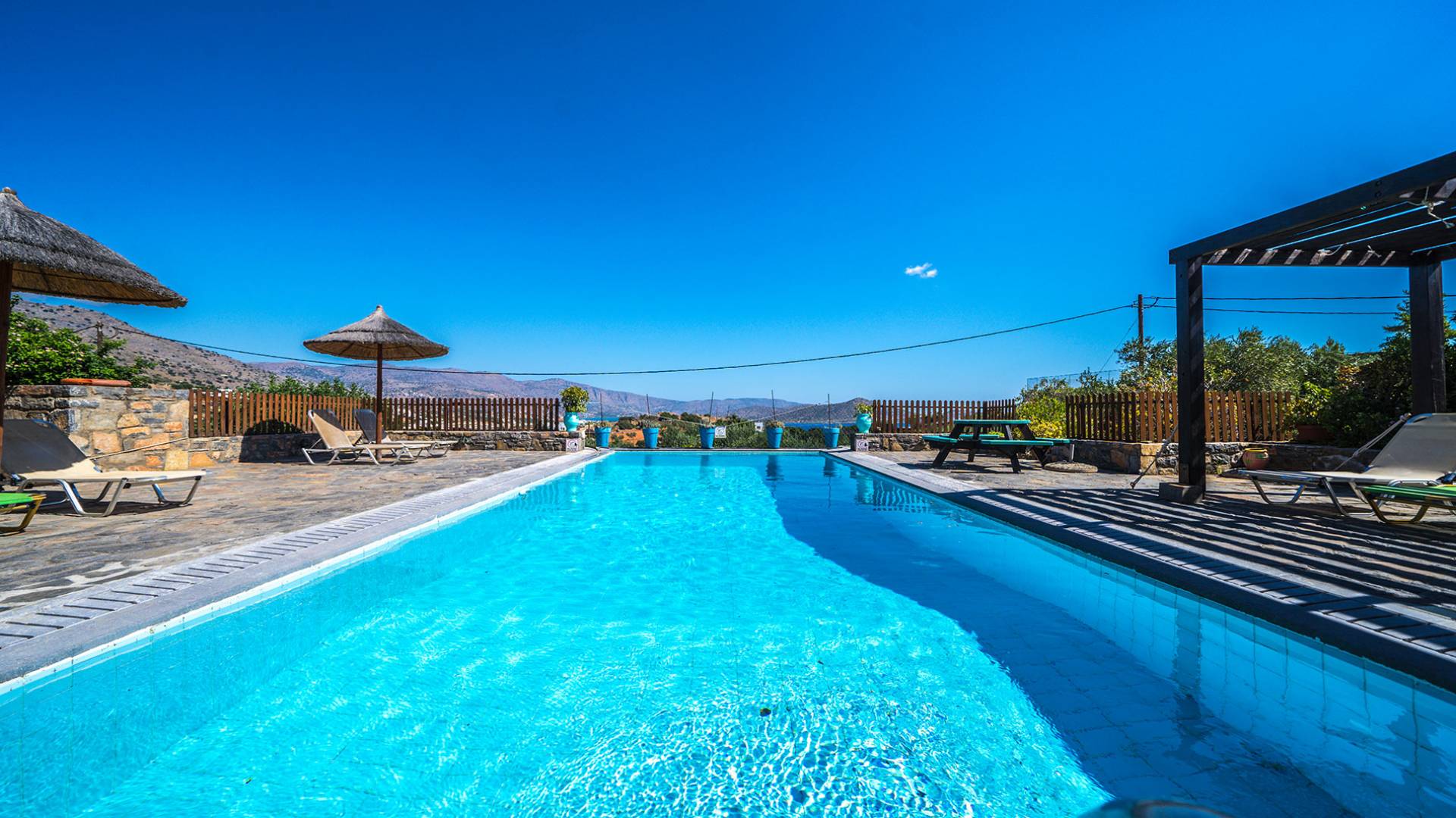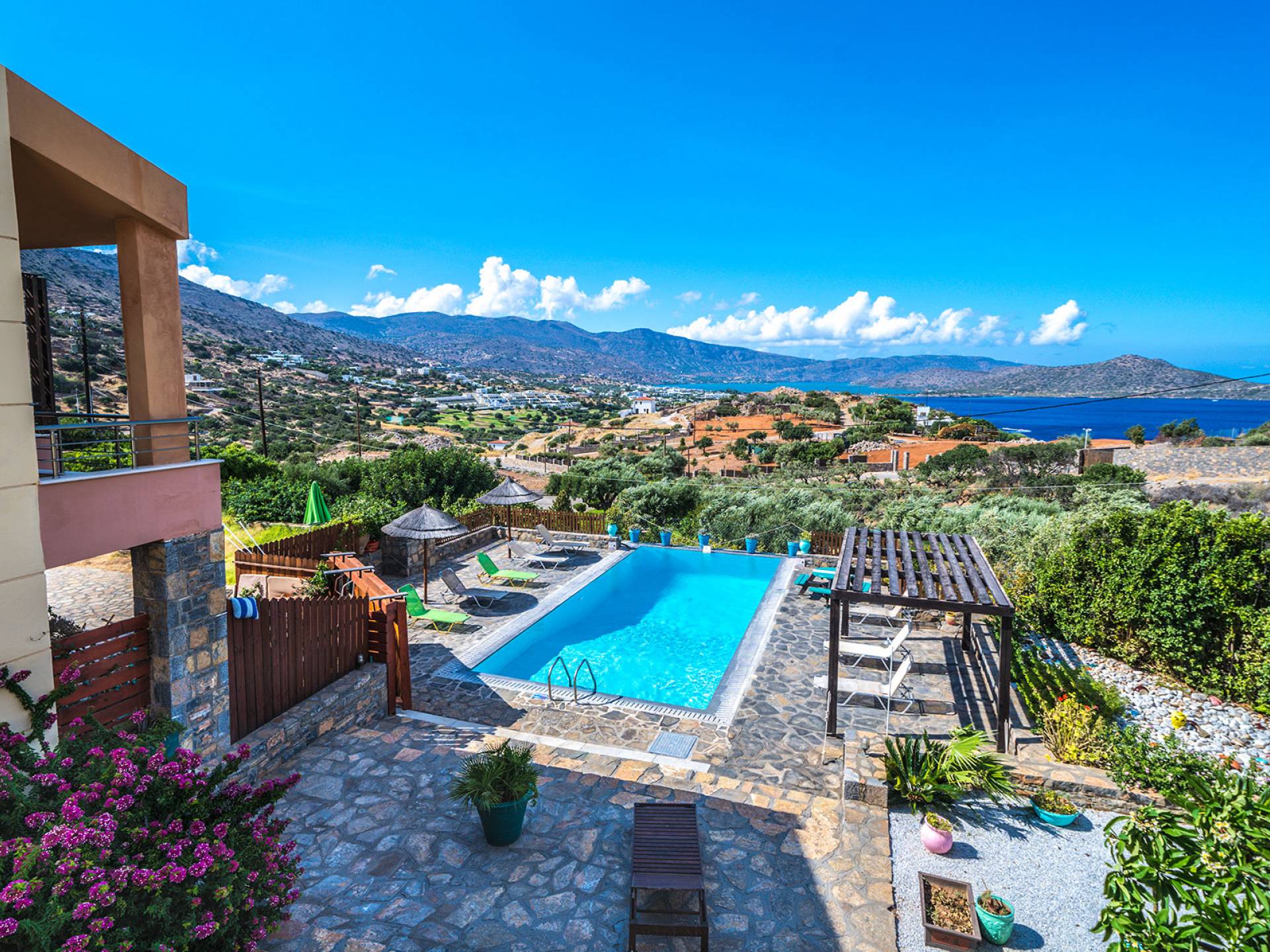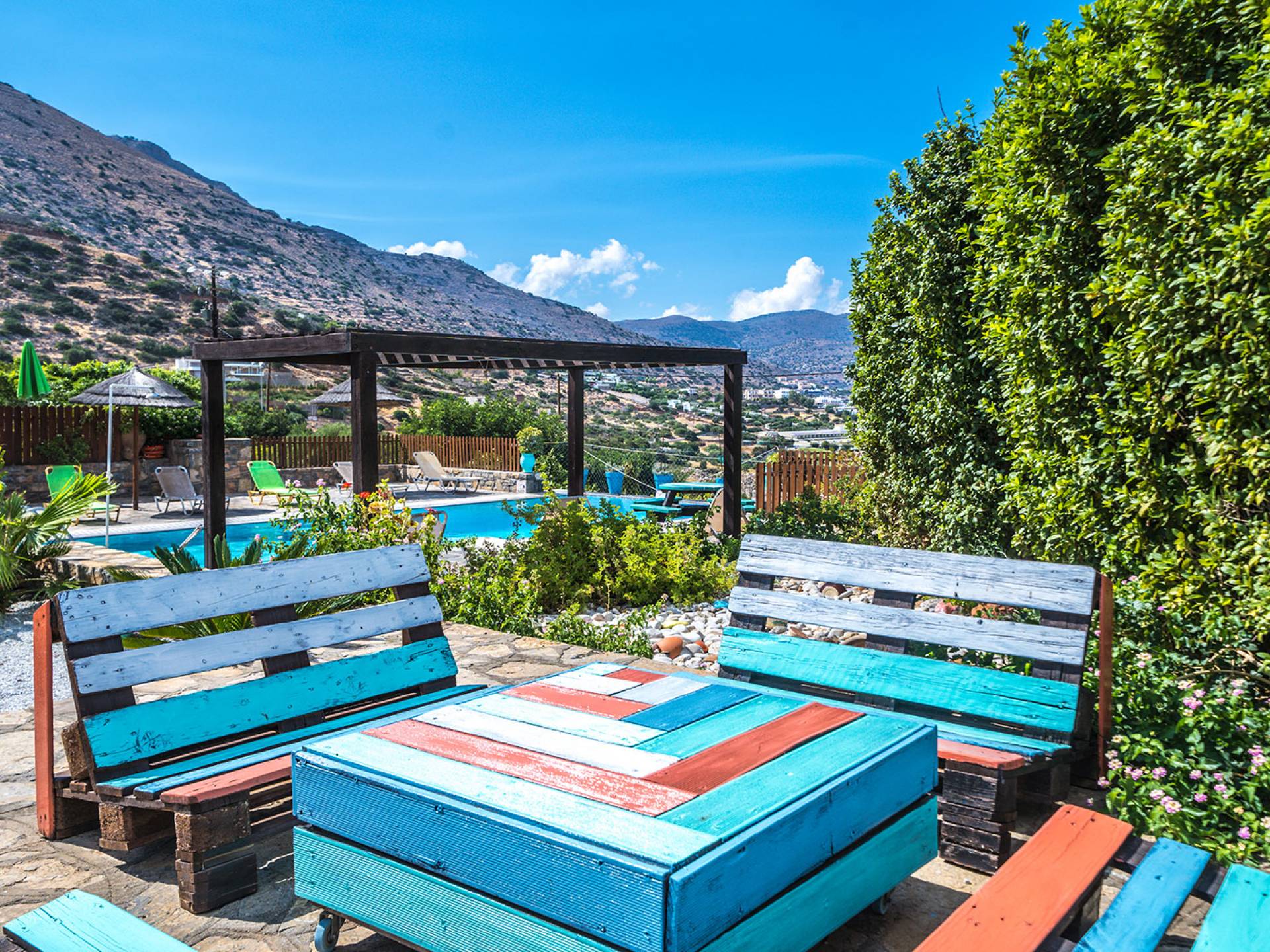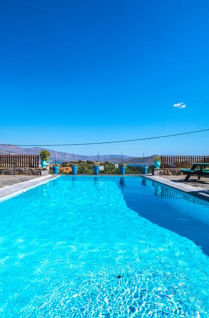 Снаружи кристально чистый частный бассейн окружен пышным садом с видом на близлежащие роскошные отели и Критское море, залив Мирабелло и остров Спиналонга. Несколько ухоженных террас ведут вверх по холмистой местности к дому и бассейну. Большой бассейн является эксклюзивным для виллы. У бассейна и в саду есть места как в прохладной тени, так и в ярком свете, а также уединение и бесконечный вид. Свет и виды зеленого и синего проникают через окна виллы.
