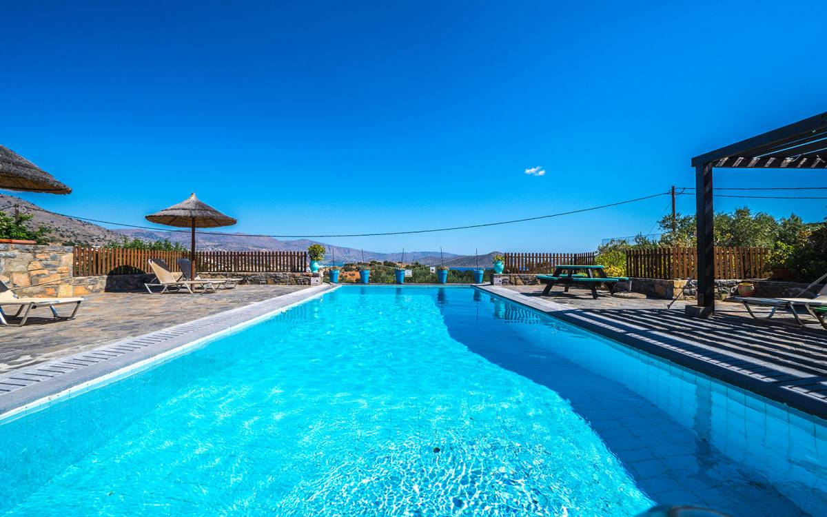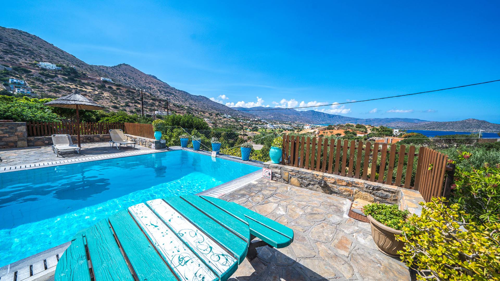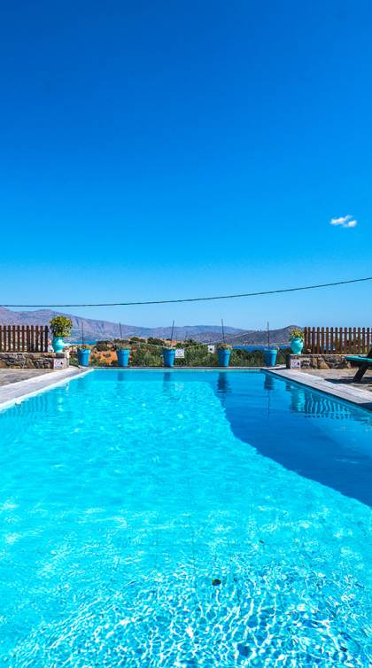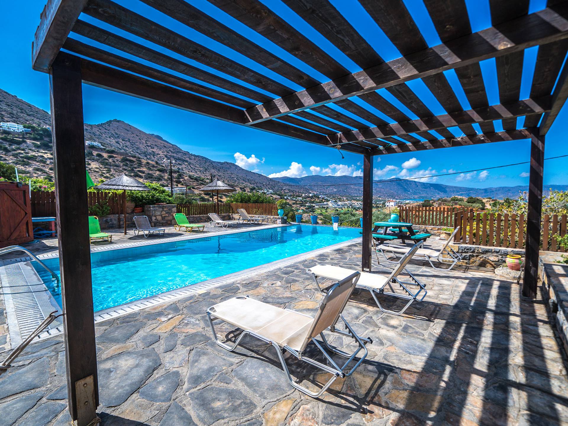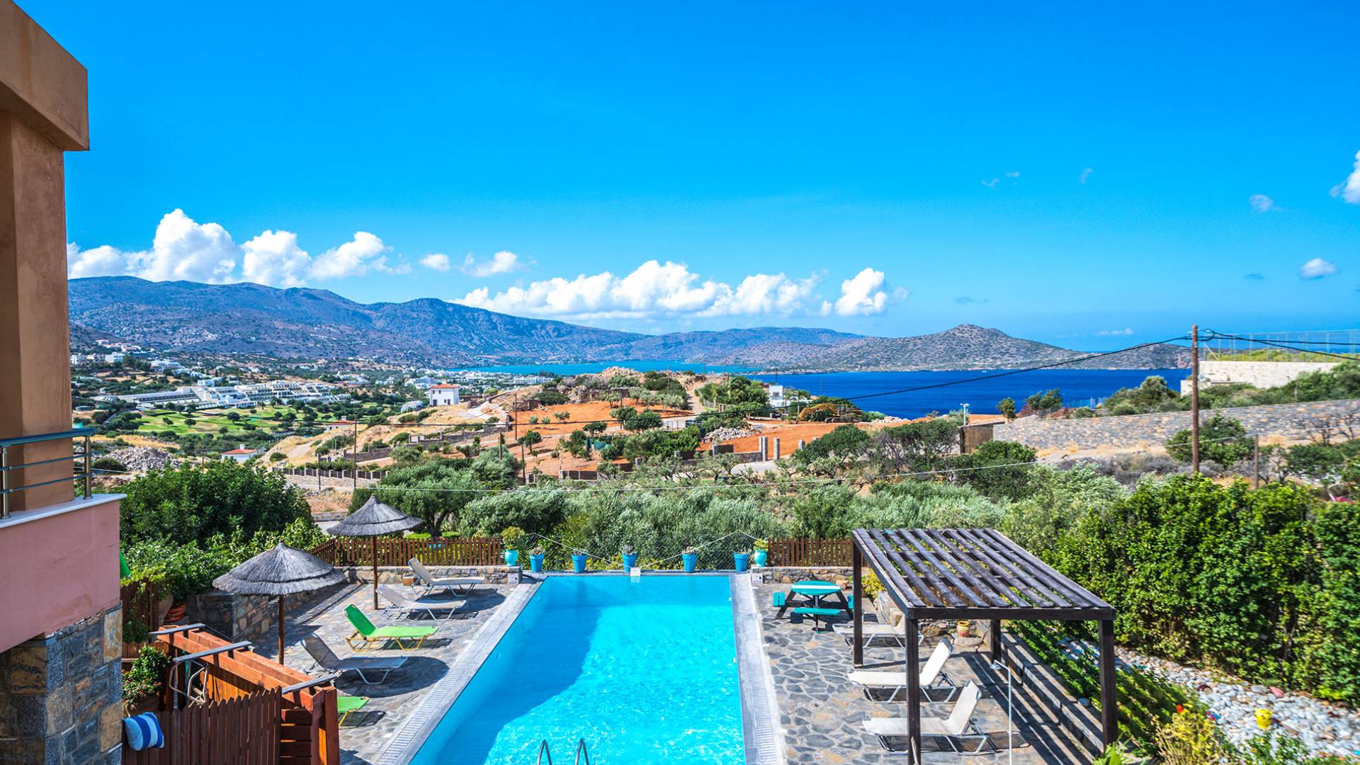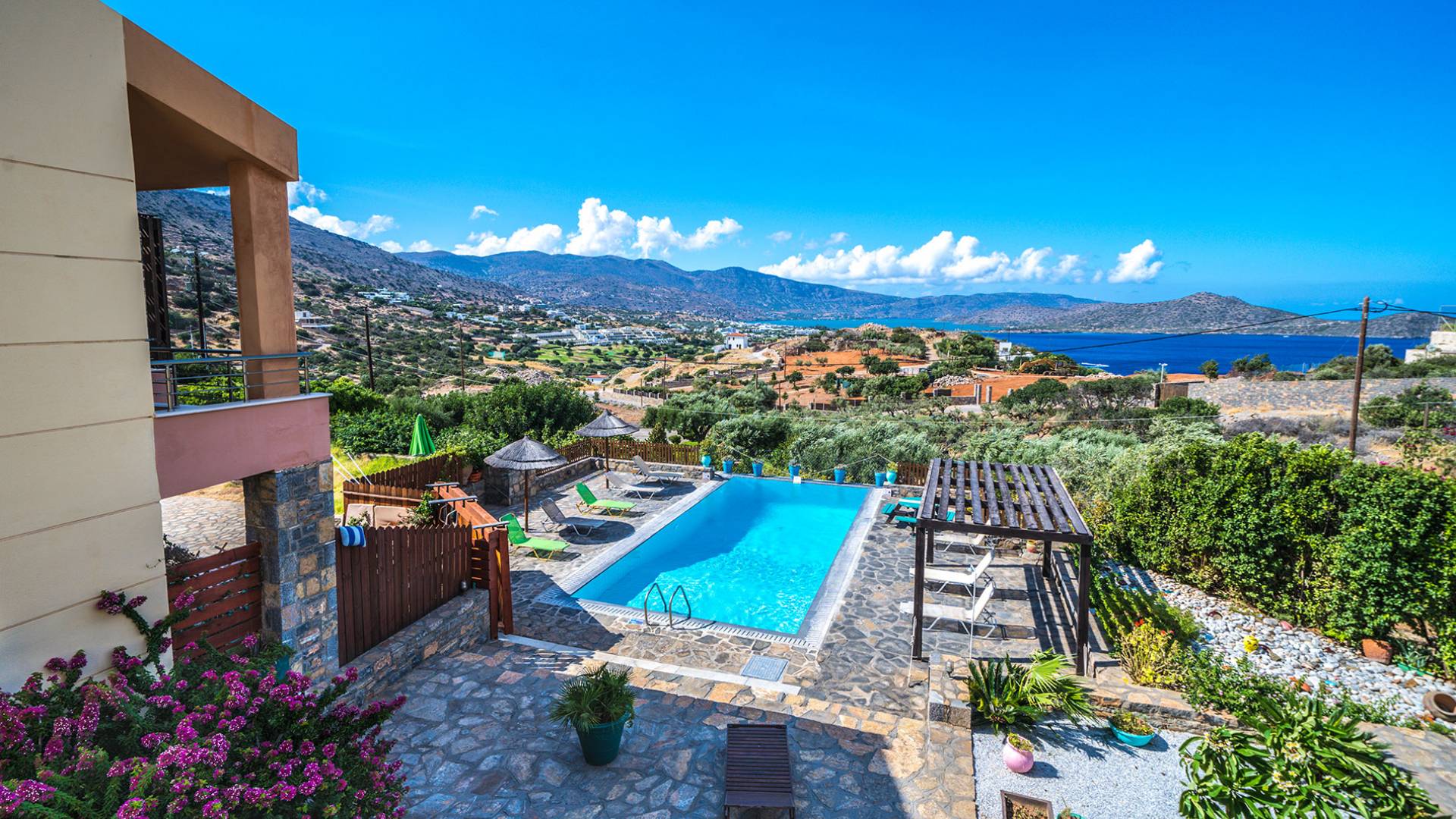 Снаружи кристально чистый частный бассейн окружен пышным садом с видом на близлежащие роскошные отели и Критское море, залив Мирабелло и остров Спиналонга. Несколько ухоженных террас ведут вверх по холмистой местности к дому и бассейну. Большой бассейн является эксклюзивным для виллы. У бассейна и в саду есть места как в прохладной тени, так и в ярком свете, а также уединение и бесконечный вид. Свет и виды зеленого и синего проникают через окна виллы.