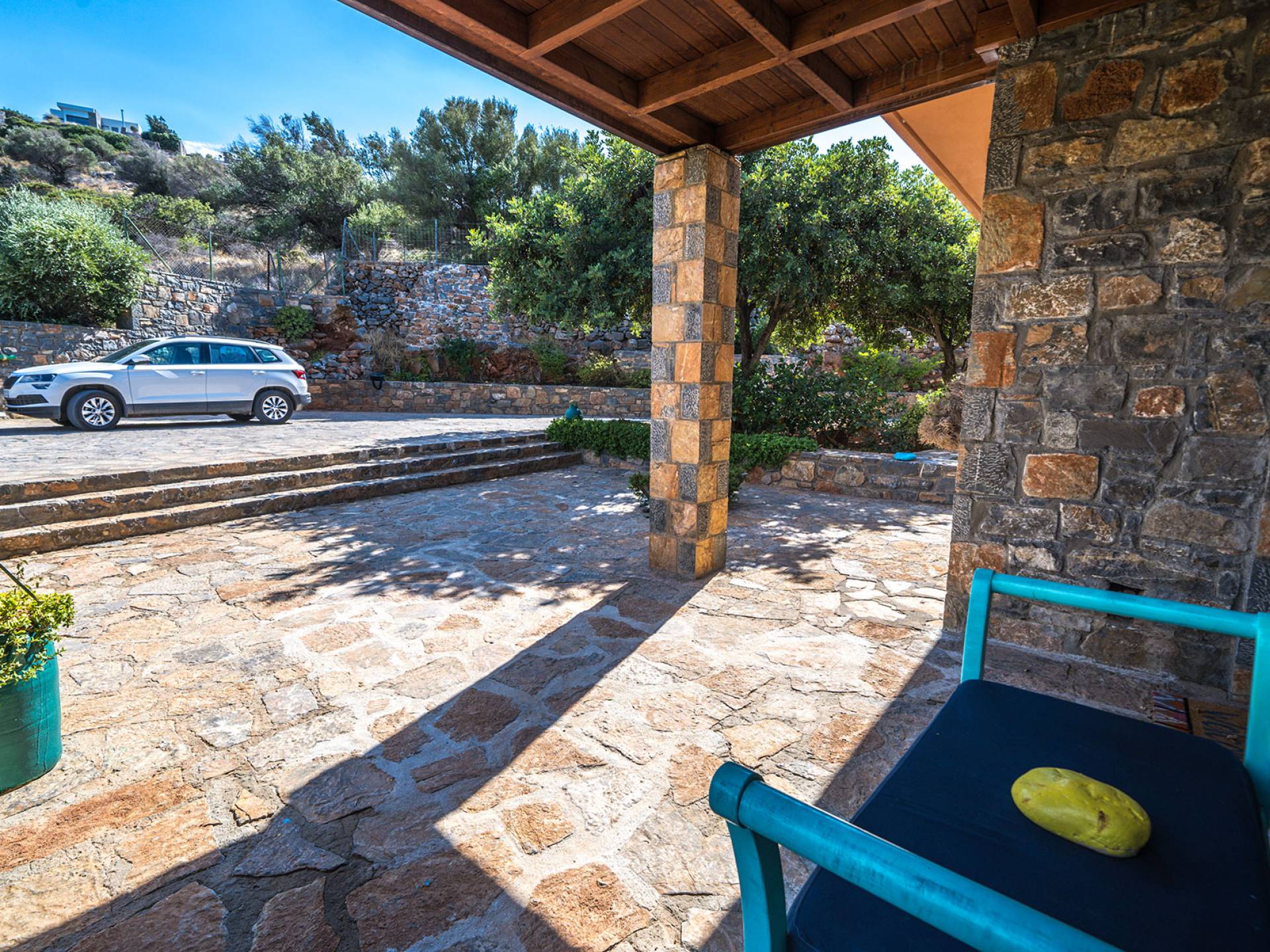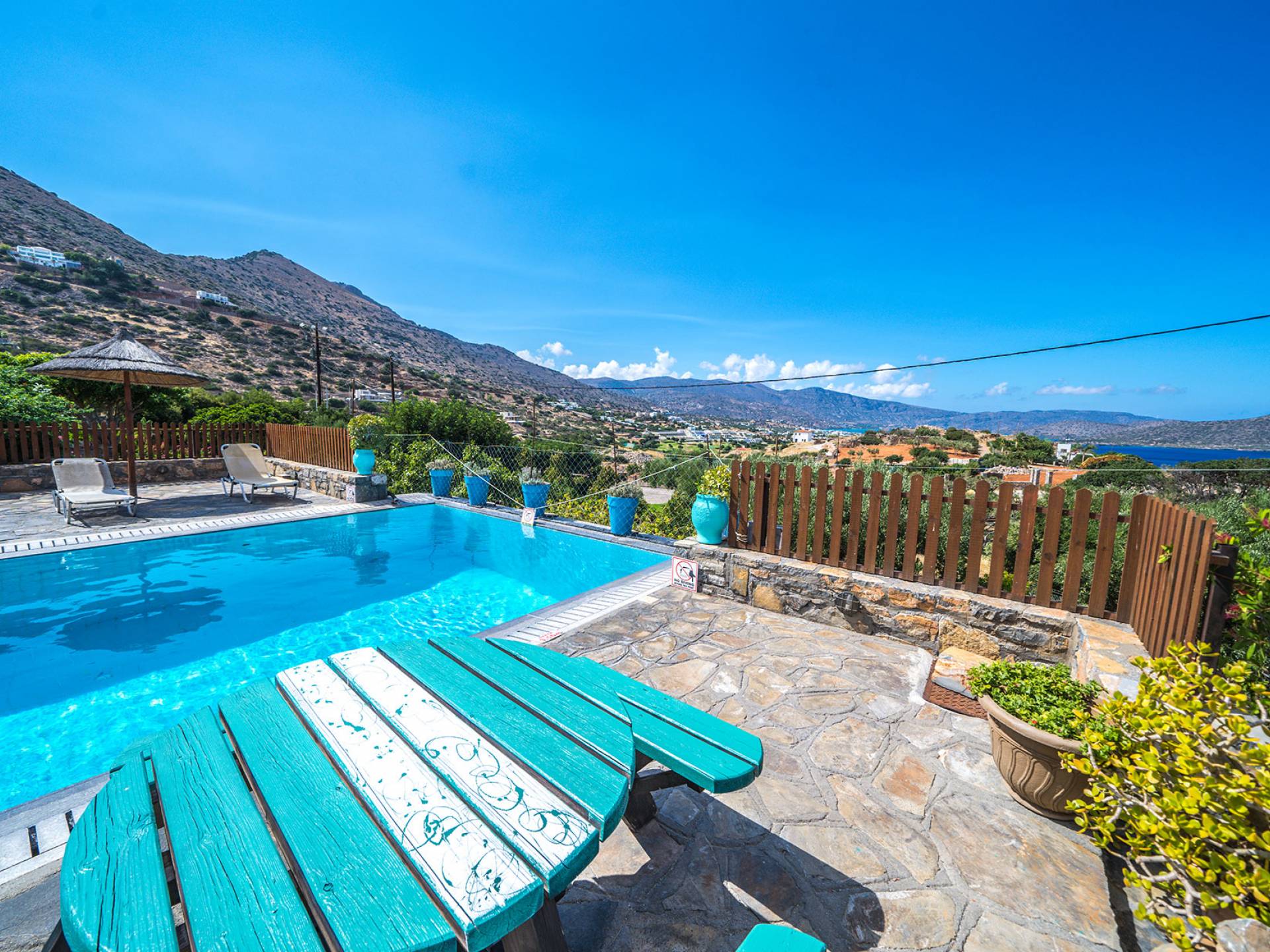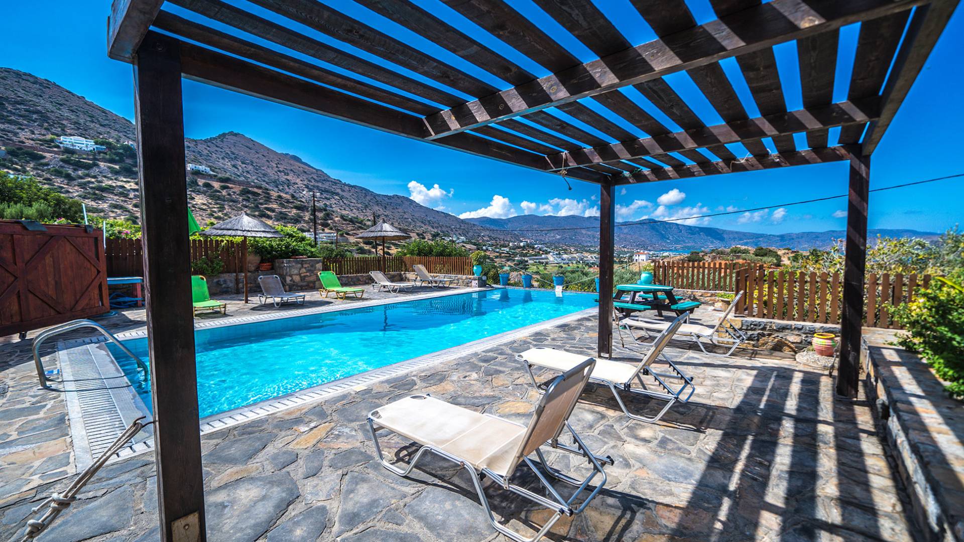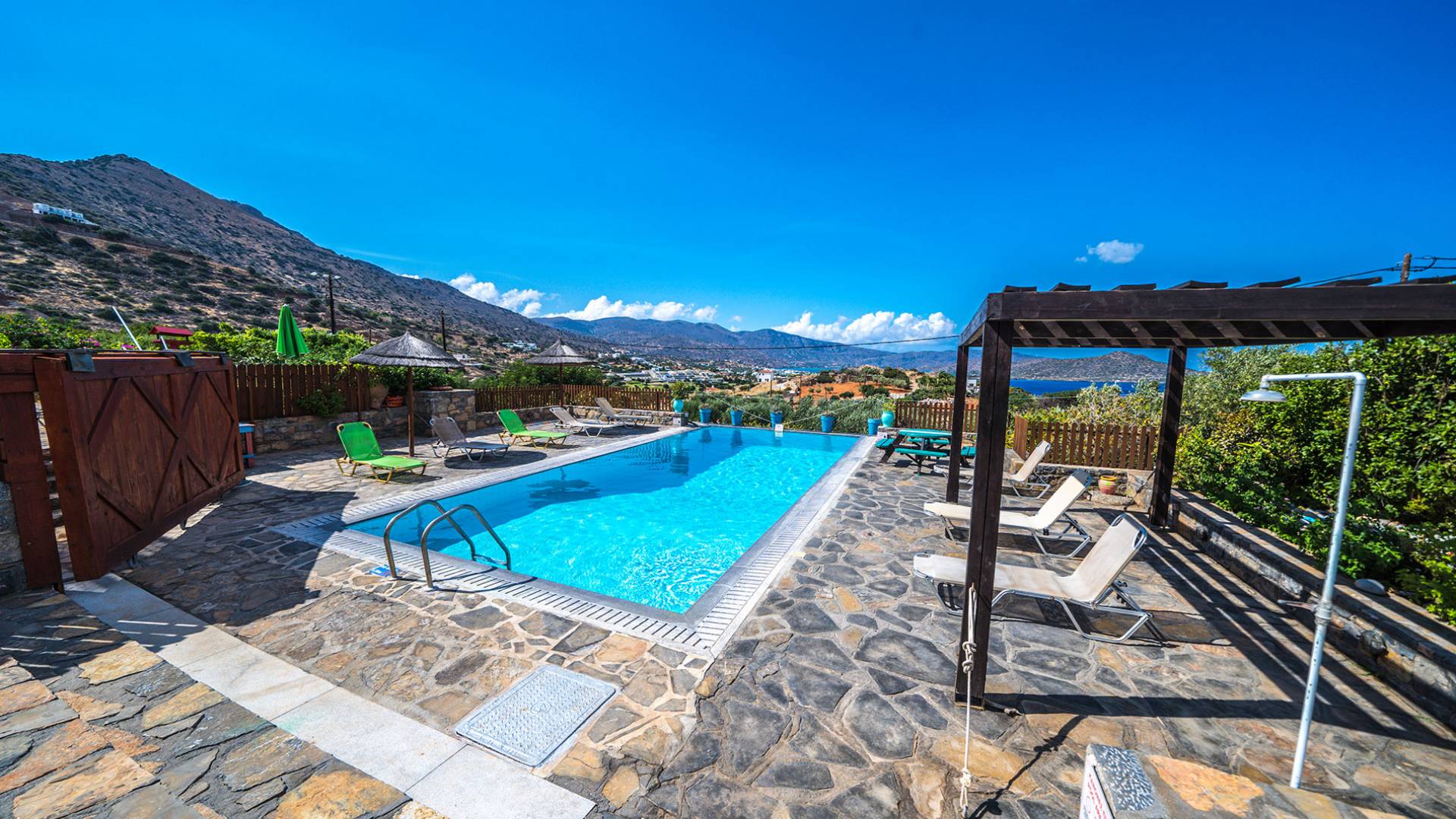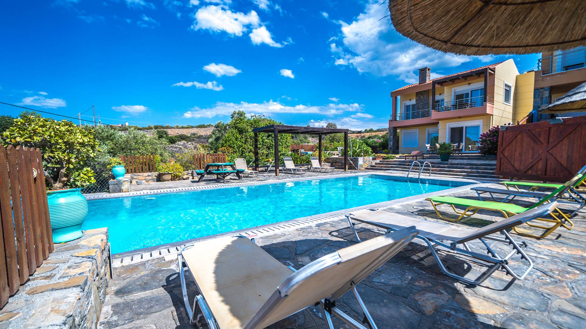 Снаружи кристально чистый частный бассейн окружен пышным садом с видом на близлежащие роскошные отели и Критское море, залив Мирабелло и остров Спиналонга. Несколько ухоженных террас ведут вверх по холмистой местности к дому и бассейну. Большой бассейн является эксклюзивным для виллы. У бассейна и в саду есть места как в прохладной тени, так и в ярком свете, а также уединение и бесконечный вид. Свет и виды зеленого и синего проникают через окна виллы.