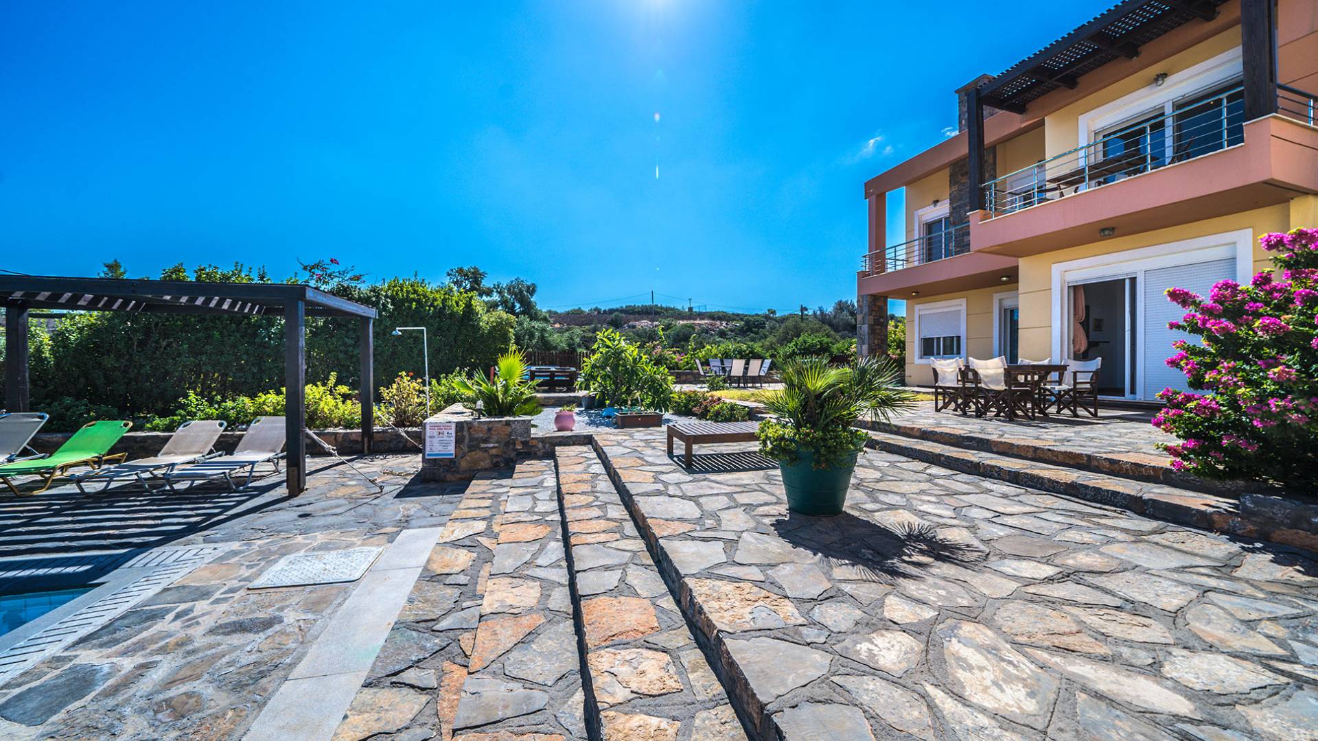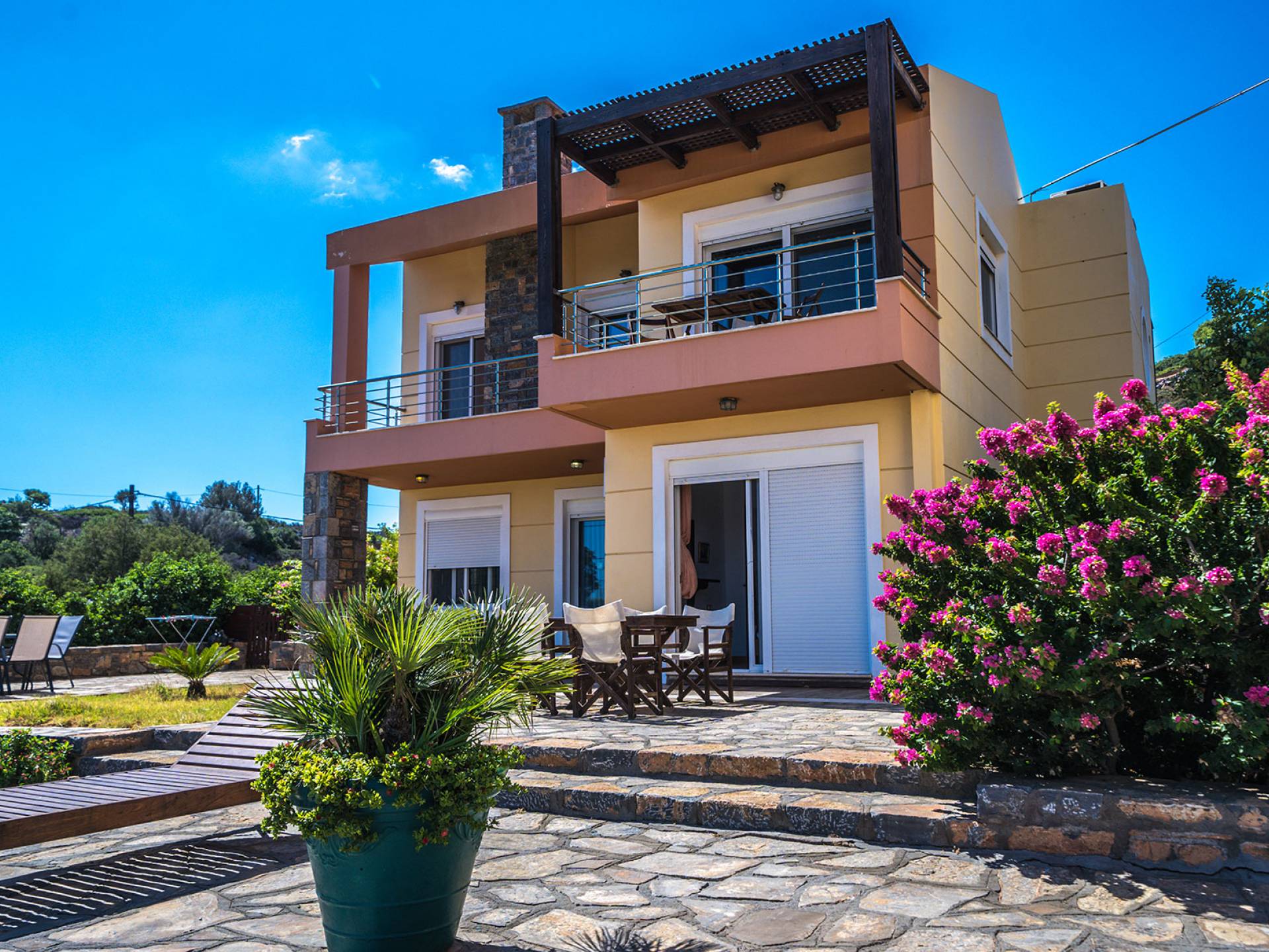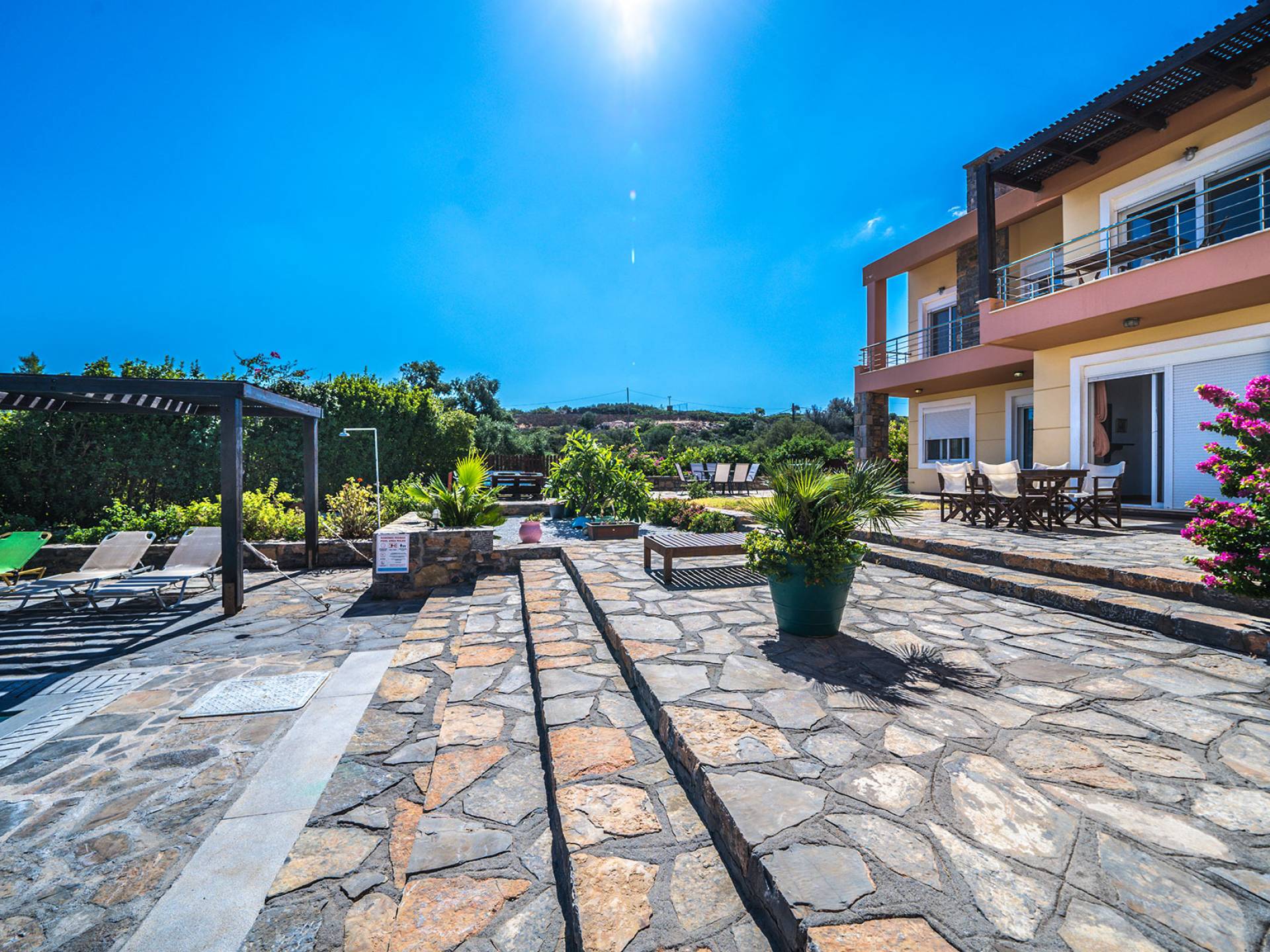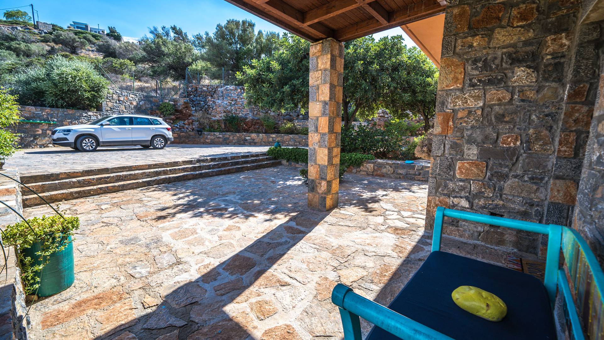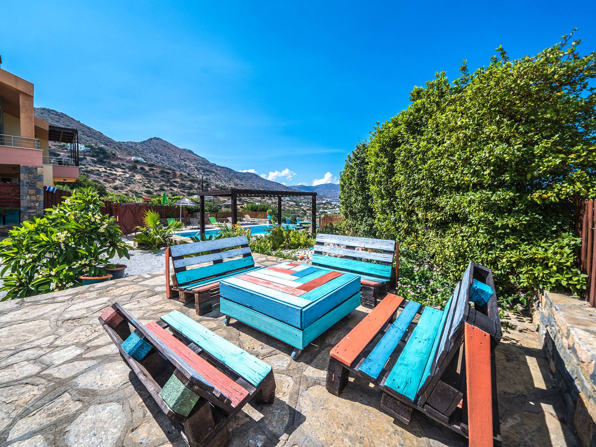 Снаружи кристально чистый частный бассейн окружен пышным садом с видом на близлежащие роскошные отели и Критское море, залив Мирабелло и остров Спиналонга. Несколько ухоженных террас ведут вверх по холмистой местности к дому и бассейну. Большой бассейн является эксклюзивным для виллы. У бассейна и в саду есть места как в прохладной тени, так и в ярком свете, а также уединение и бесконечный вид. Свет и виды зеленого и синего проникают через окна виллы.