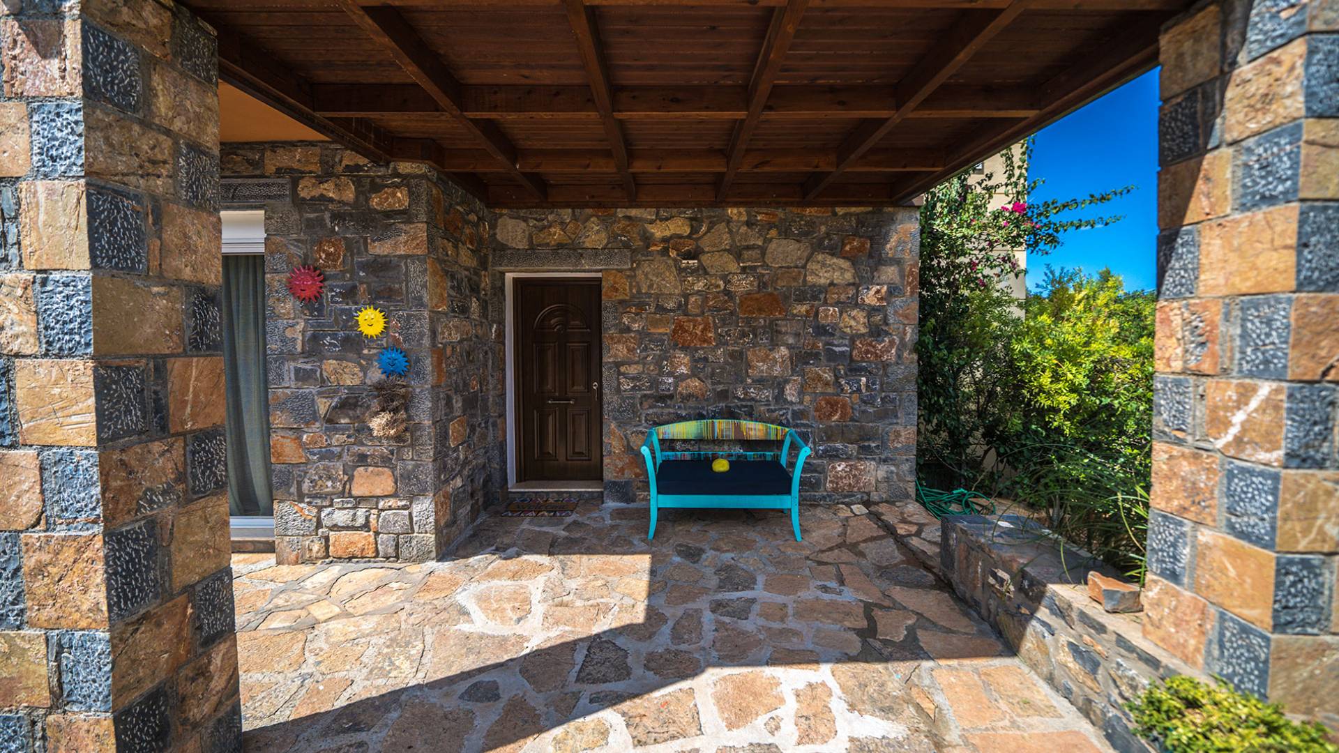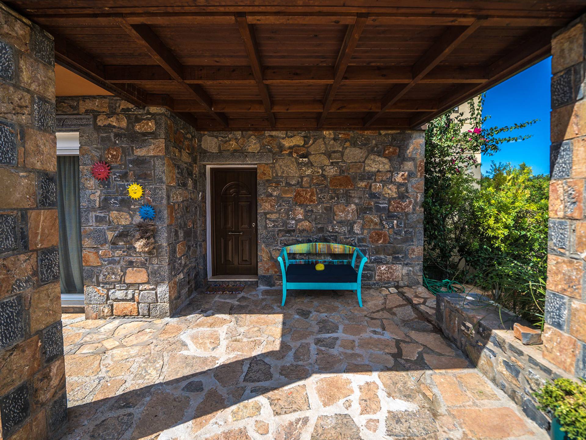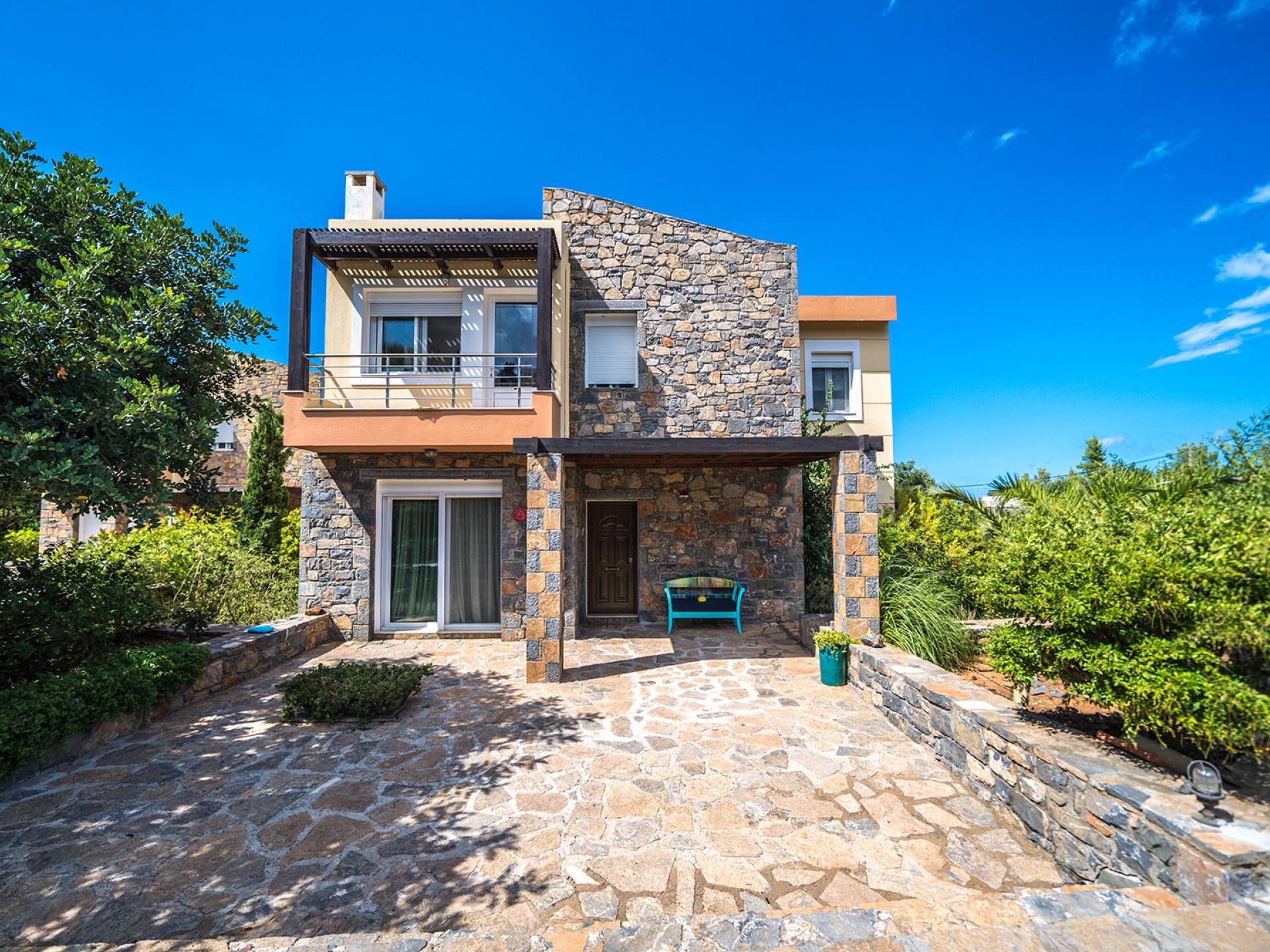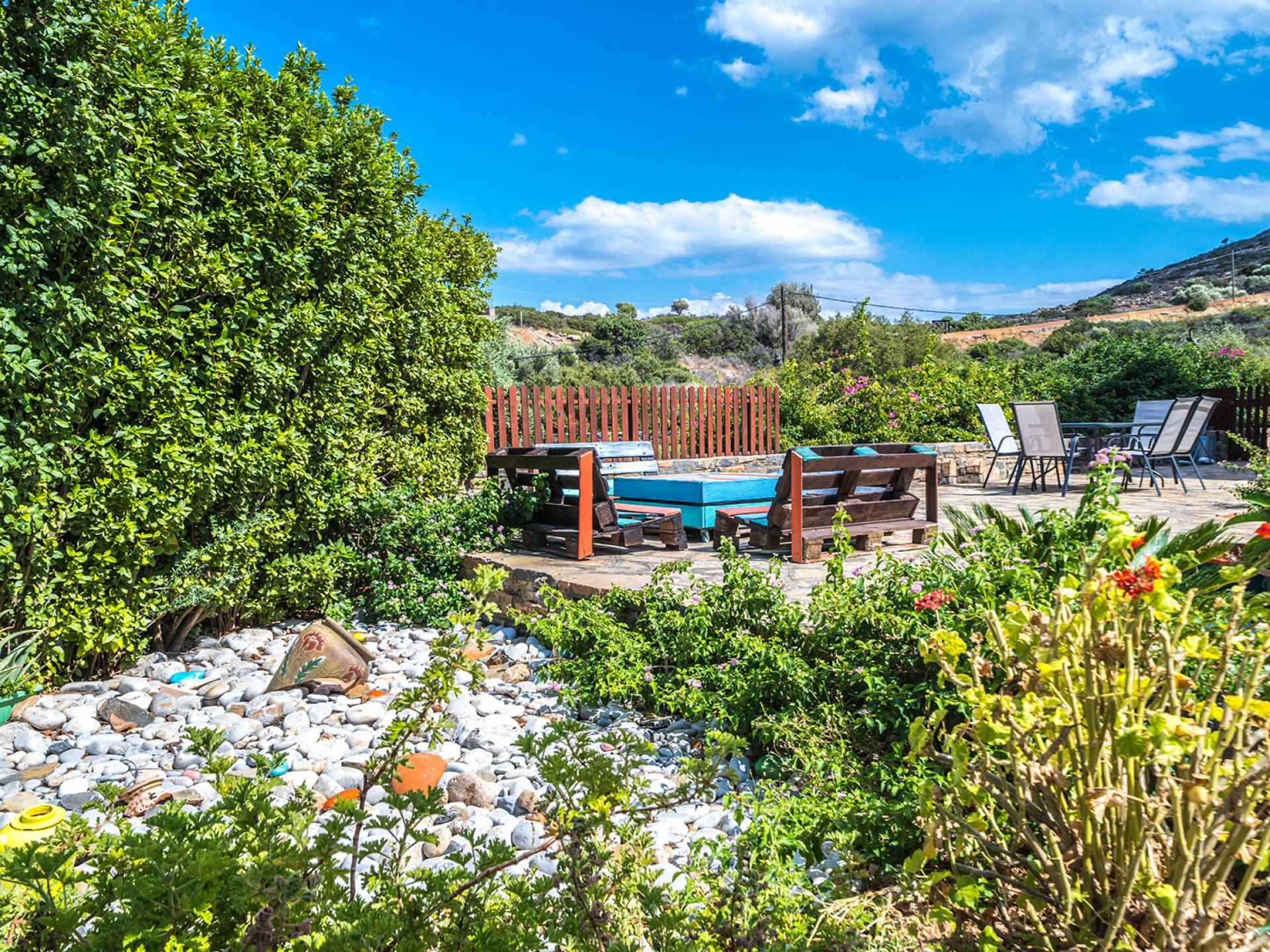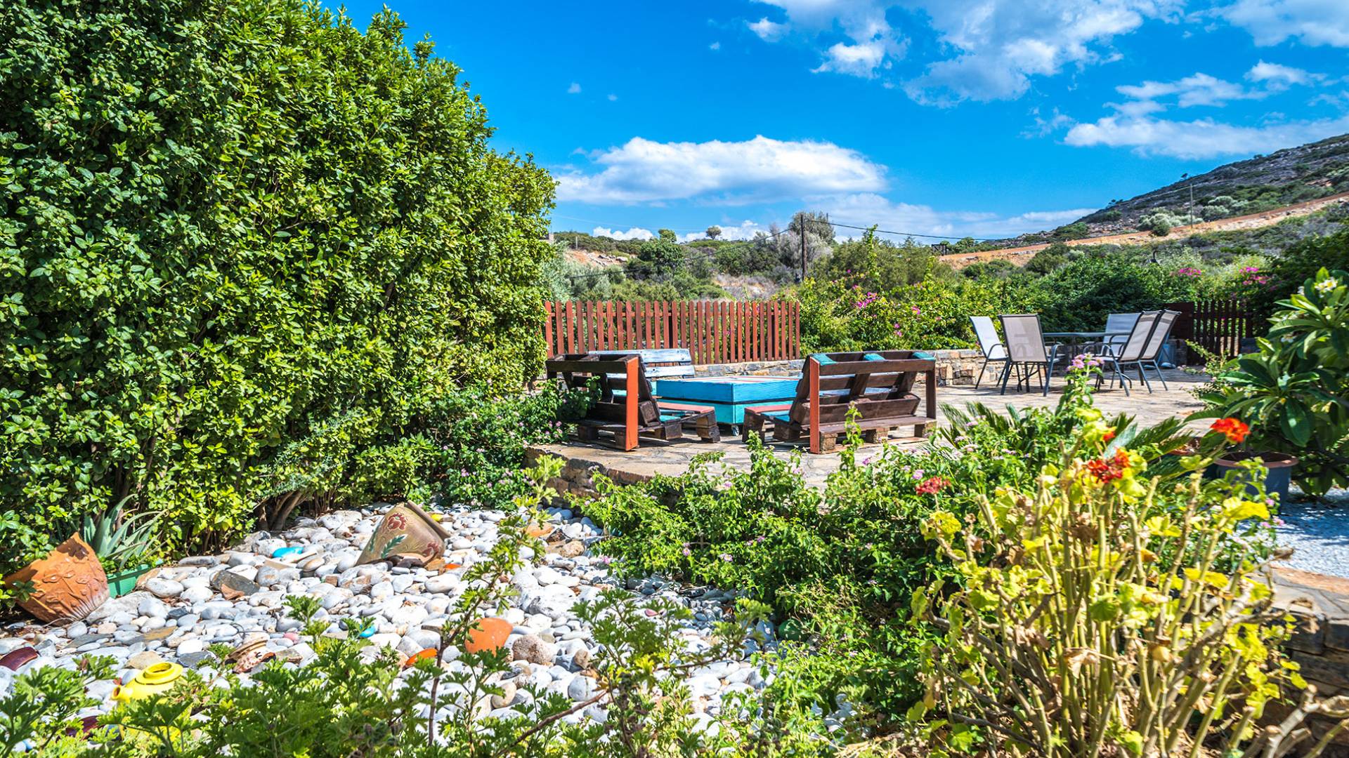 Снаружи кристально чистый частный бассейн окружен пышным садом с видом на близлежащие роскошные отели и Критское море, залив Мирабелло и остров Спиналонга. Несколько ухоженных террас ведут вверх по холмистой местности к дому и бассейну. Большой бассейн является эксклюзивным для виллы. У бассейна и в саду есть места как в прохладной тени, так и в ярком свете, а также уединение и бесконечный вид. Свет и виды зеленого и синего проникают через окна виллы.