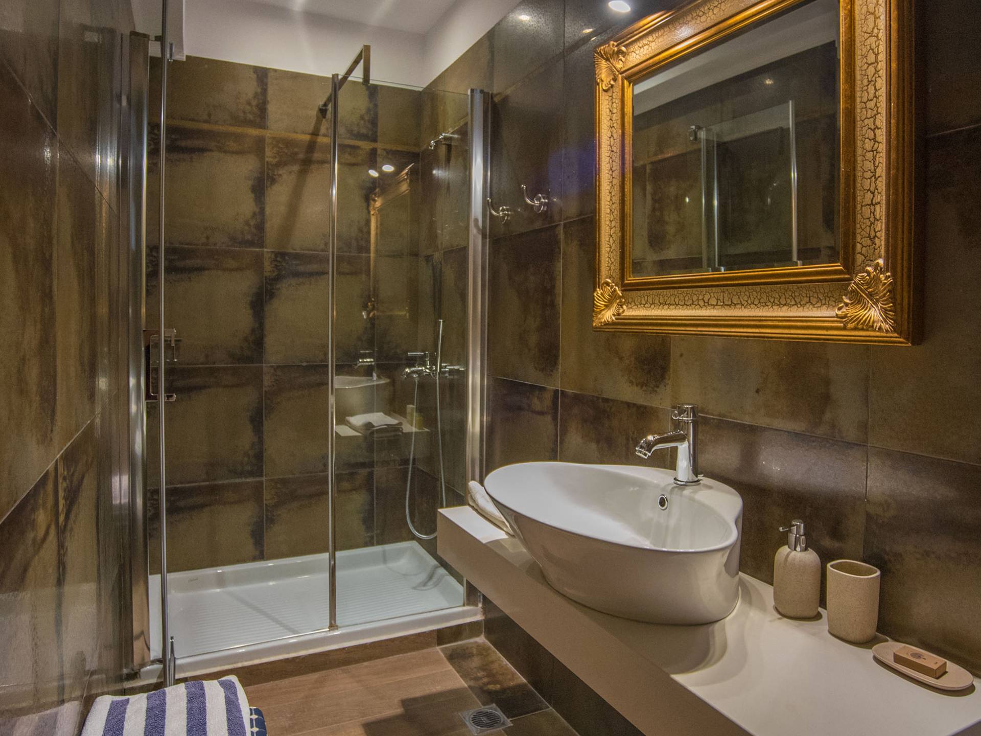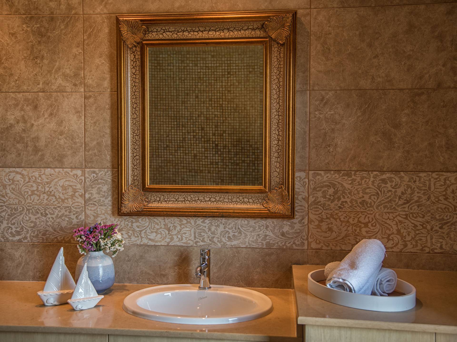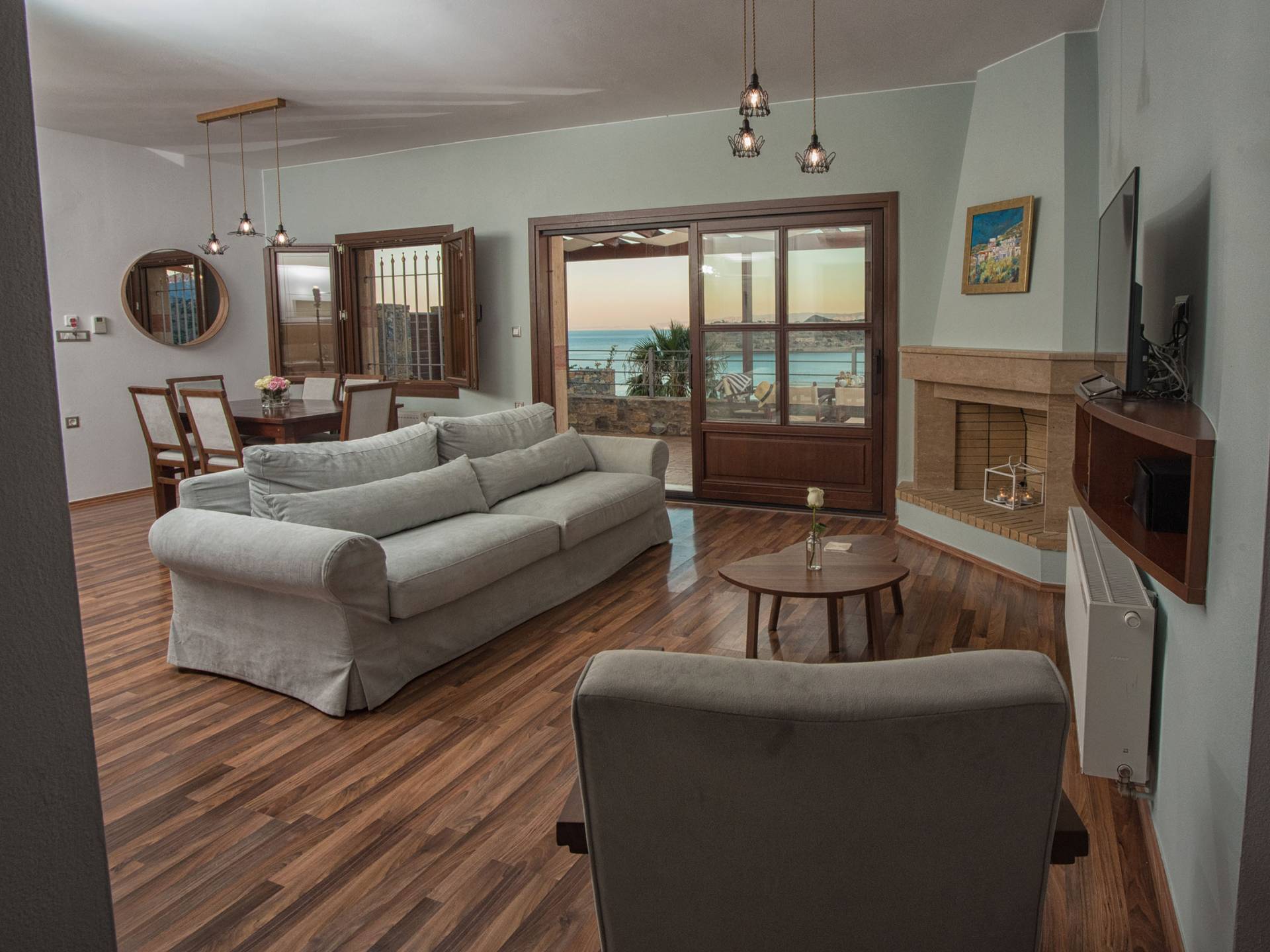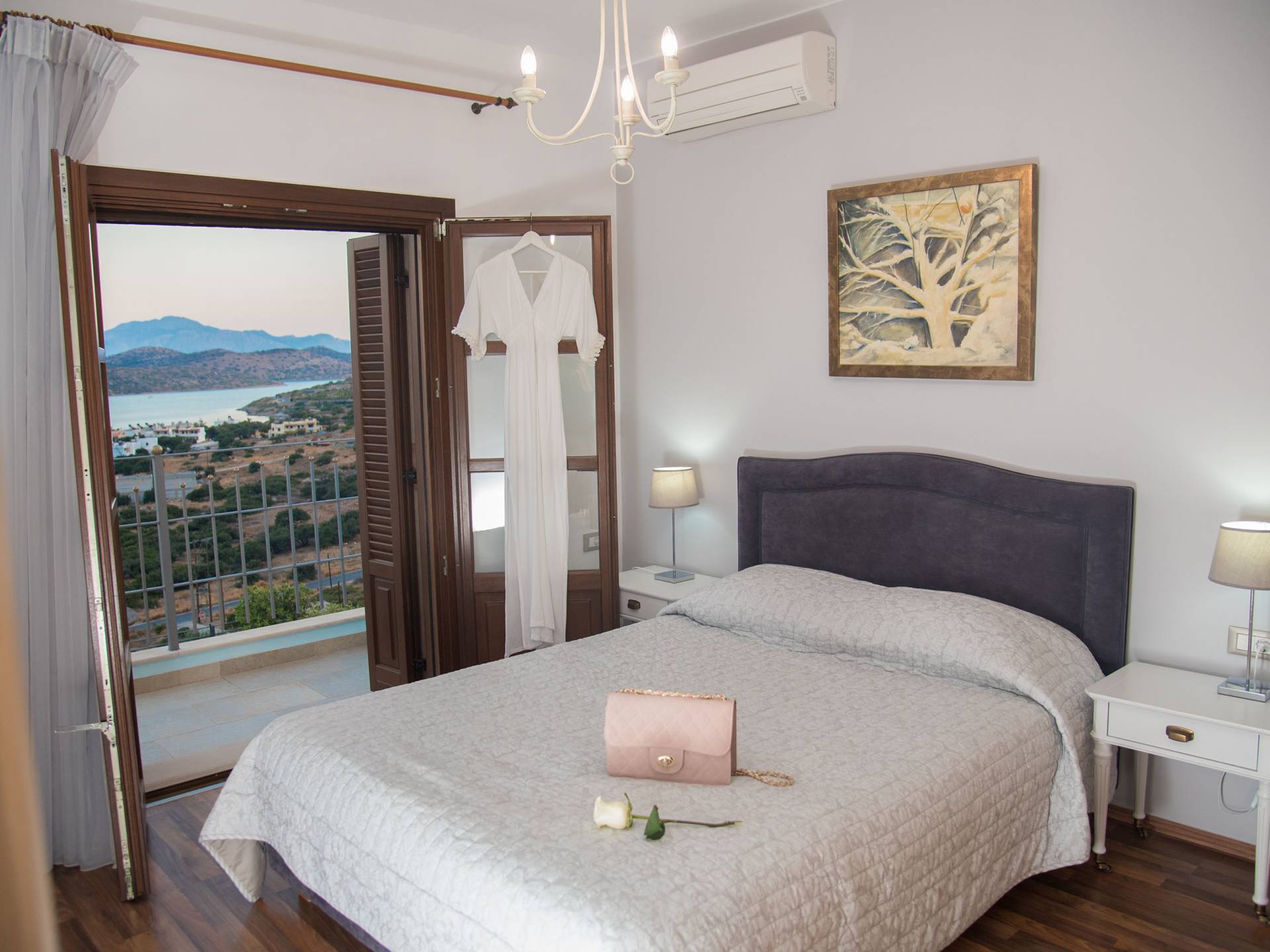 Двухуровневый верхний этаж, где находится вход, представляет собой открытую планировку с просторной гостиной с открытым камином, телевизором с плоским экраном и удобной мебелью; обеденная зона и полностью оборудованная кухня с холодильником / морозильной камерой, духовкой, посудомоечной машиной, кофеваркой, чайником, тостером, миксером и всей необходимой кухонной утварью; двери террасы ведут на меблированную верхнюю веранду с великолепным видом на залив Элунда и его бирюзово-синее море, с островком Спиналонга, стратегически расположенным в его центре. Три ступеньки ведут в первую главную спальню с балконом, спальню с двумя односпальными кроватями и ванную комнату с туалетом