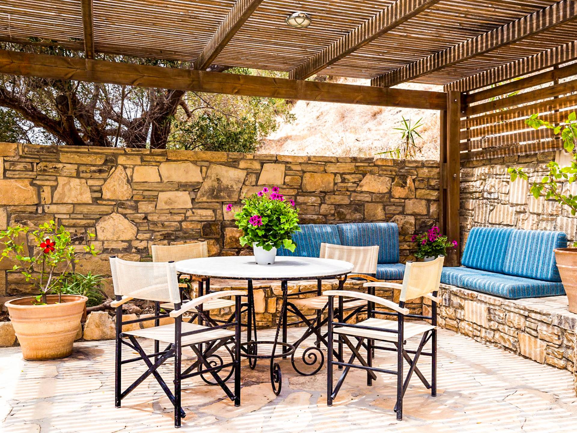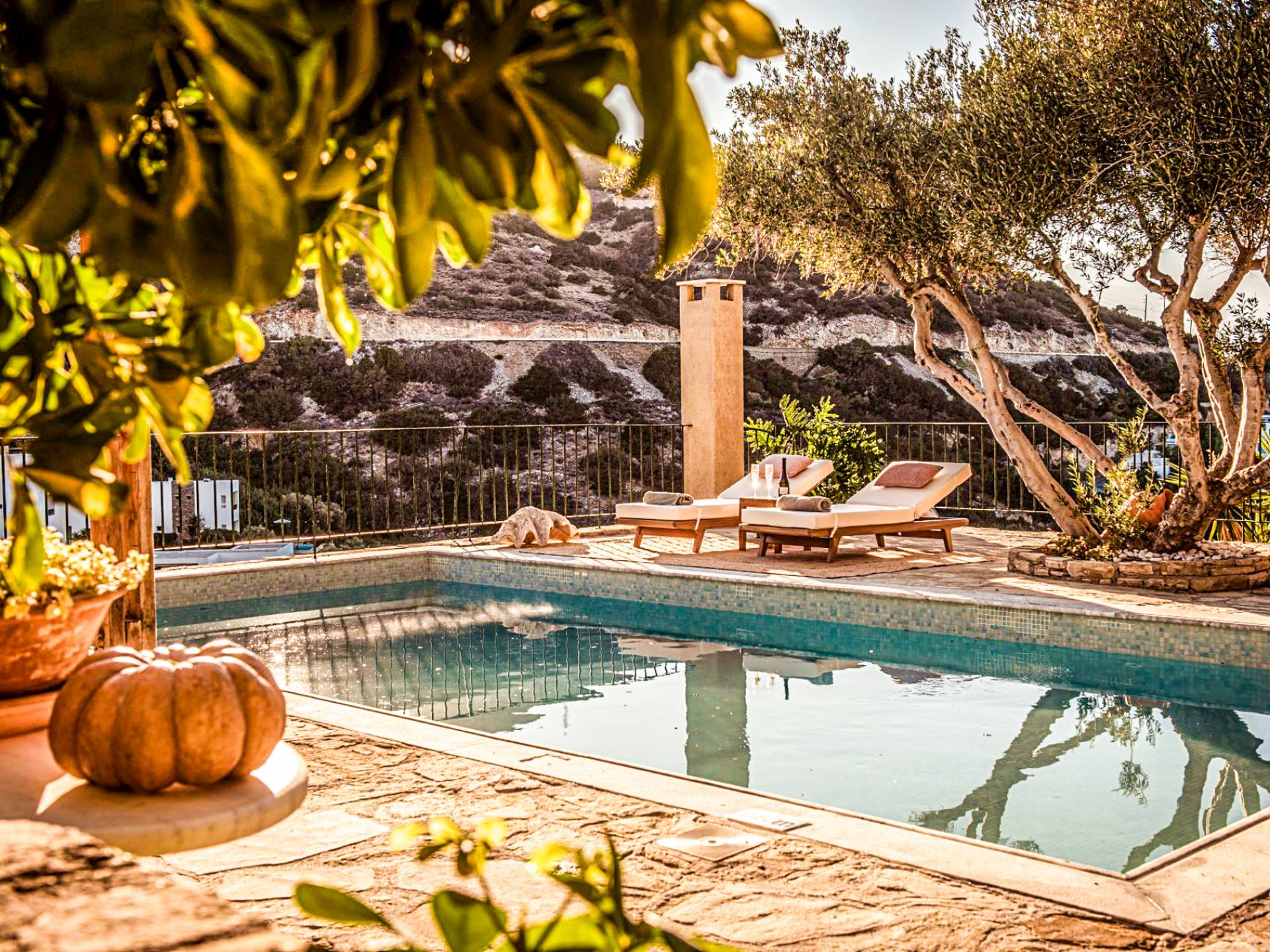 As the only villa on its level, with the mountain rising just behind it, you’ll enjoy complete privacy and stunning open views. Wooden pergolas and a parasol offer cool shade, creating the perfect outdoor space to relax and unwind under the Cretan sun.