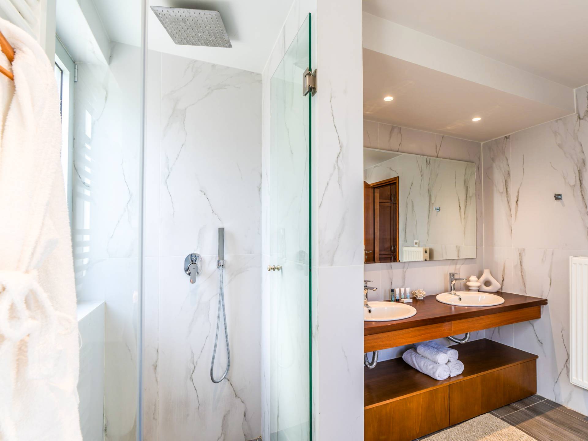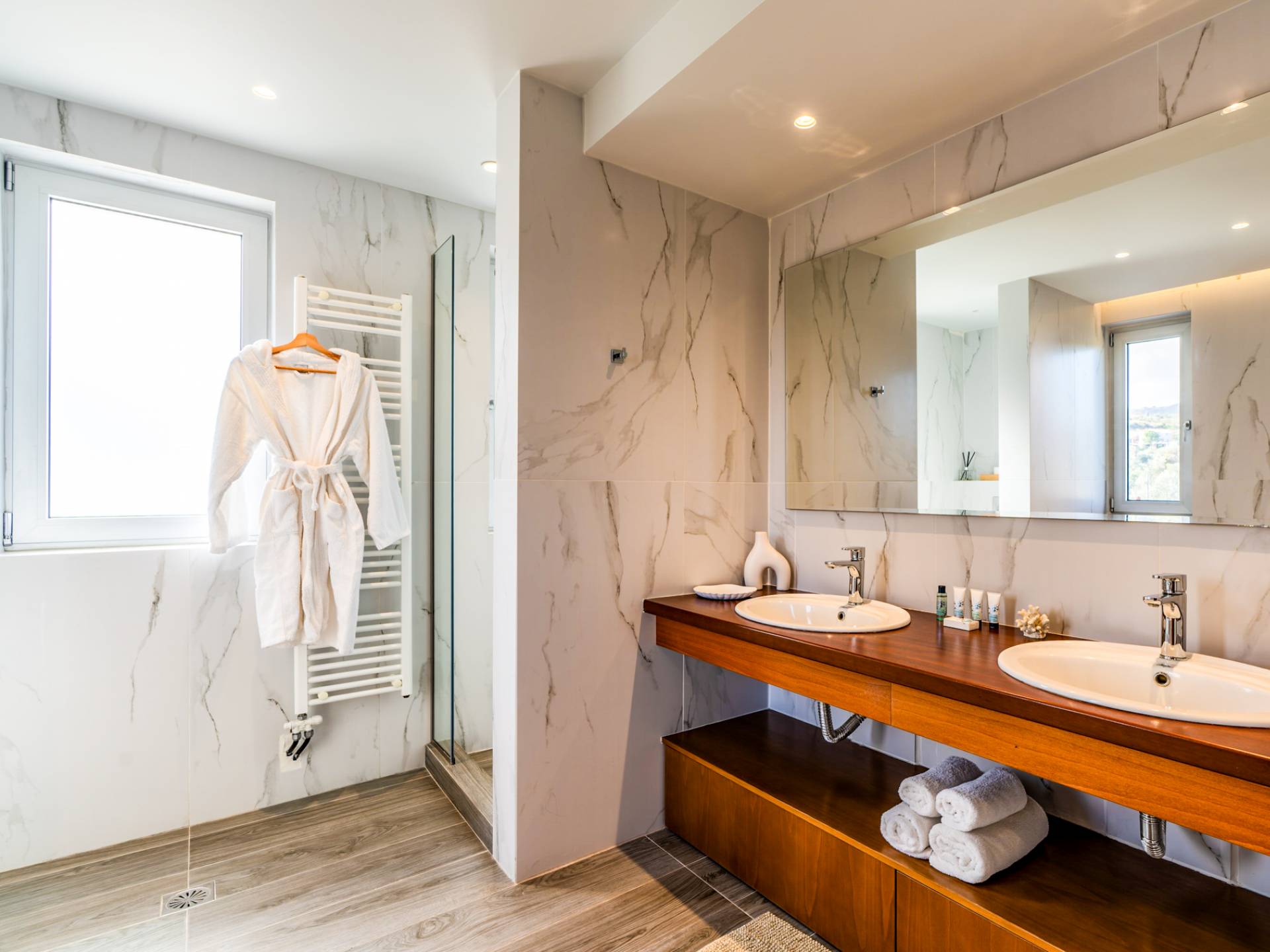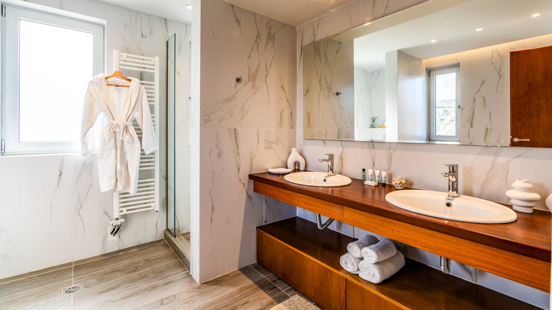 Роскошная ванная комната с двойной раковиной, душем и ванной