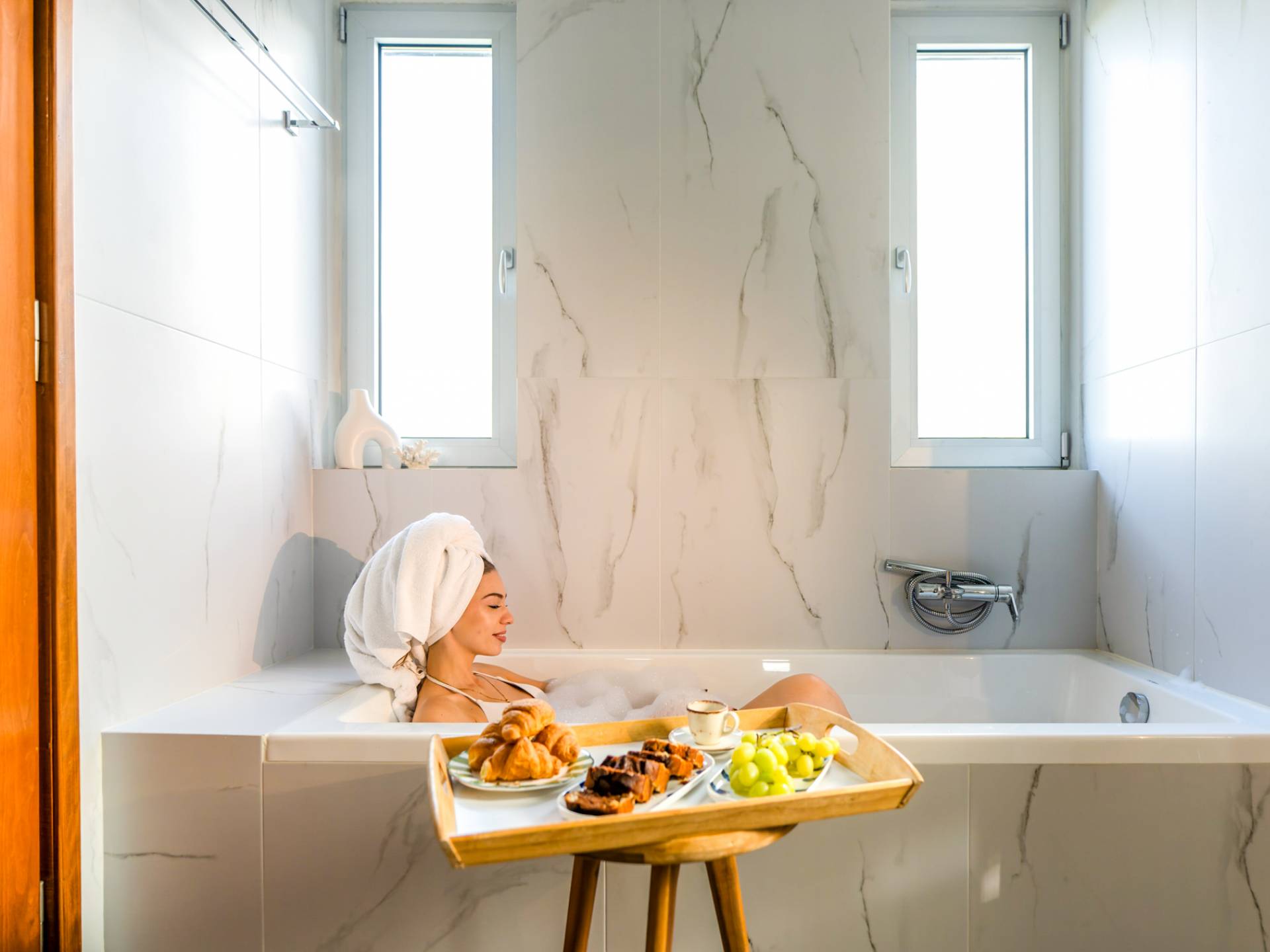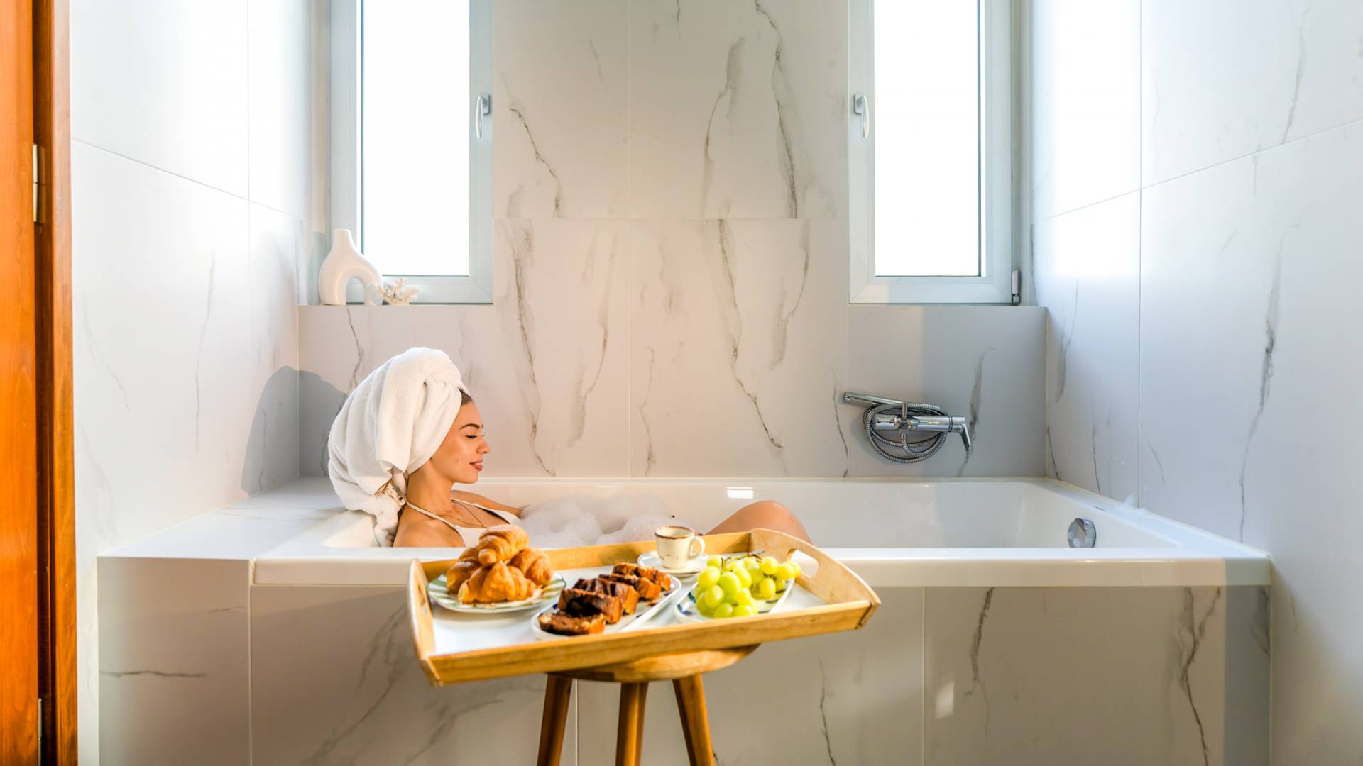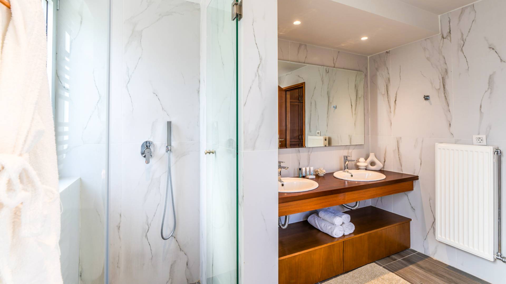 Роскошная ванная комната с двойной раковиной, душем и ванной