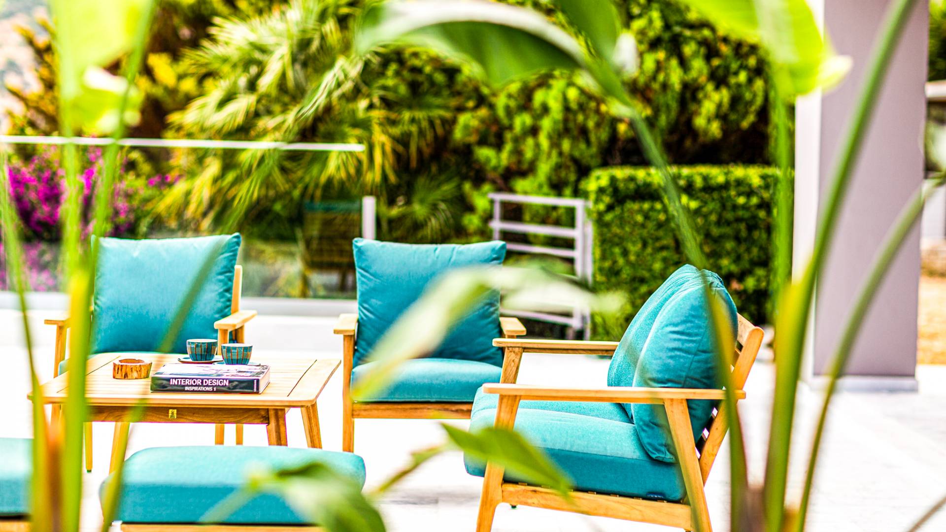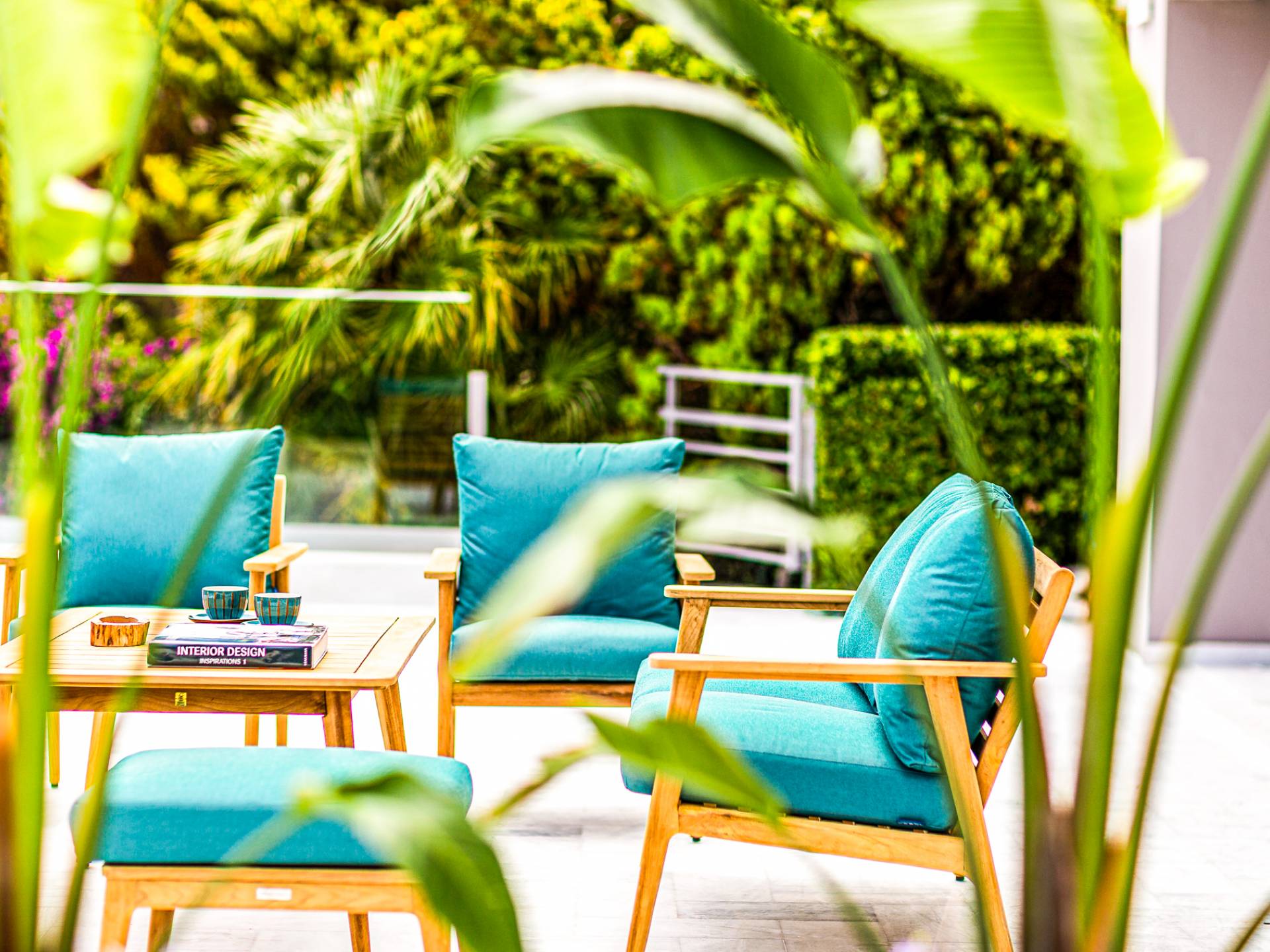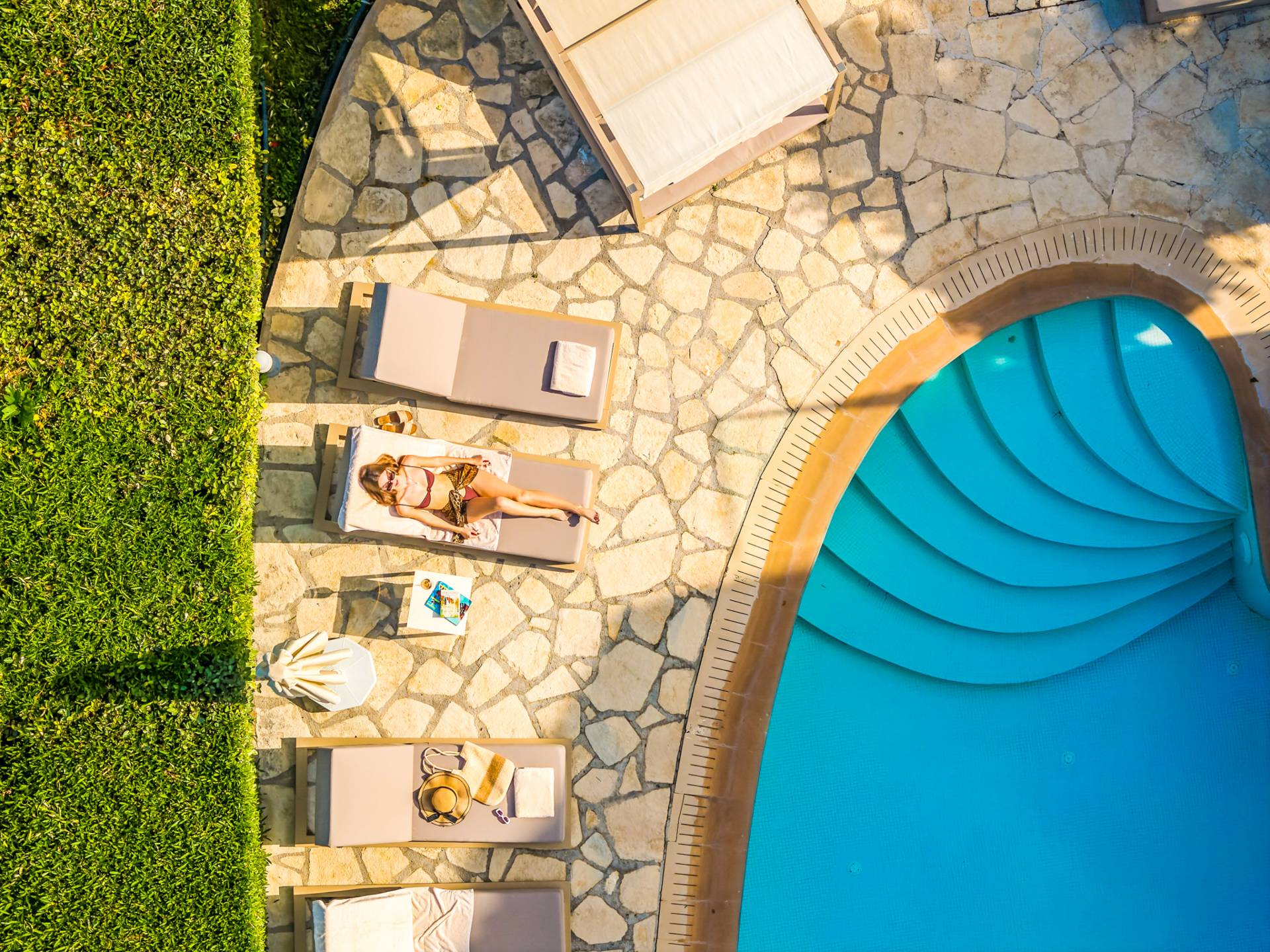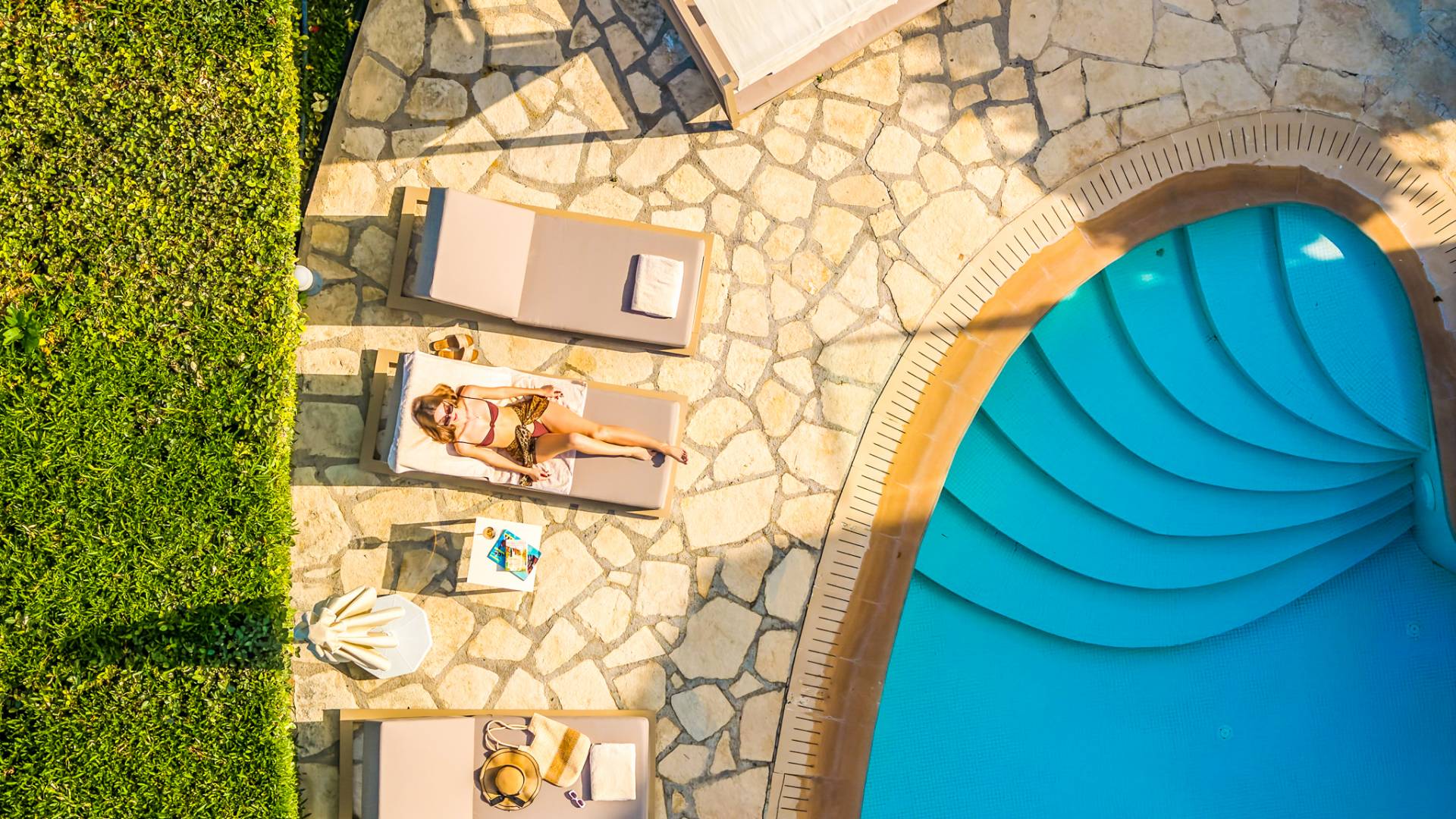 Зона для загара с шезлонгами, пуфами, лежаком и зонтами