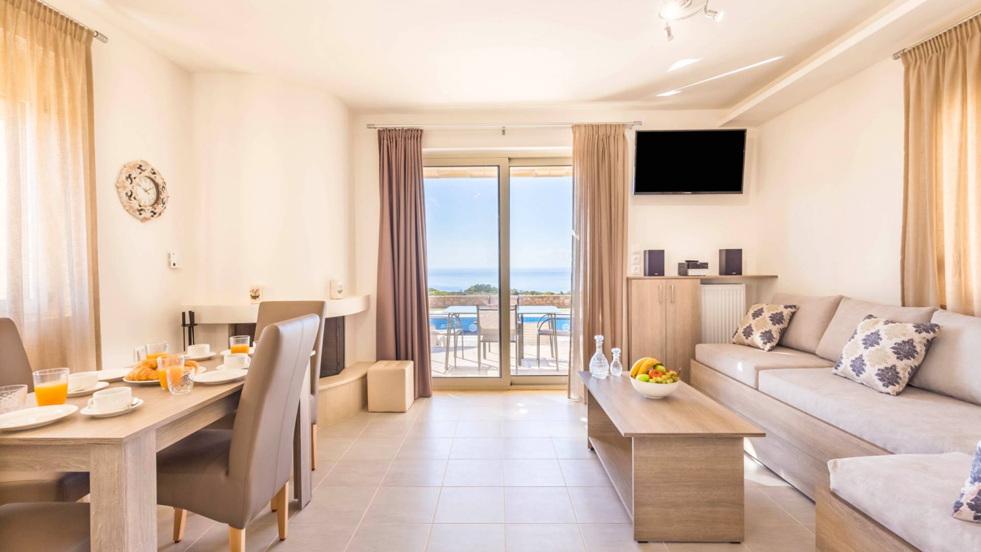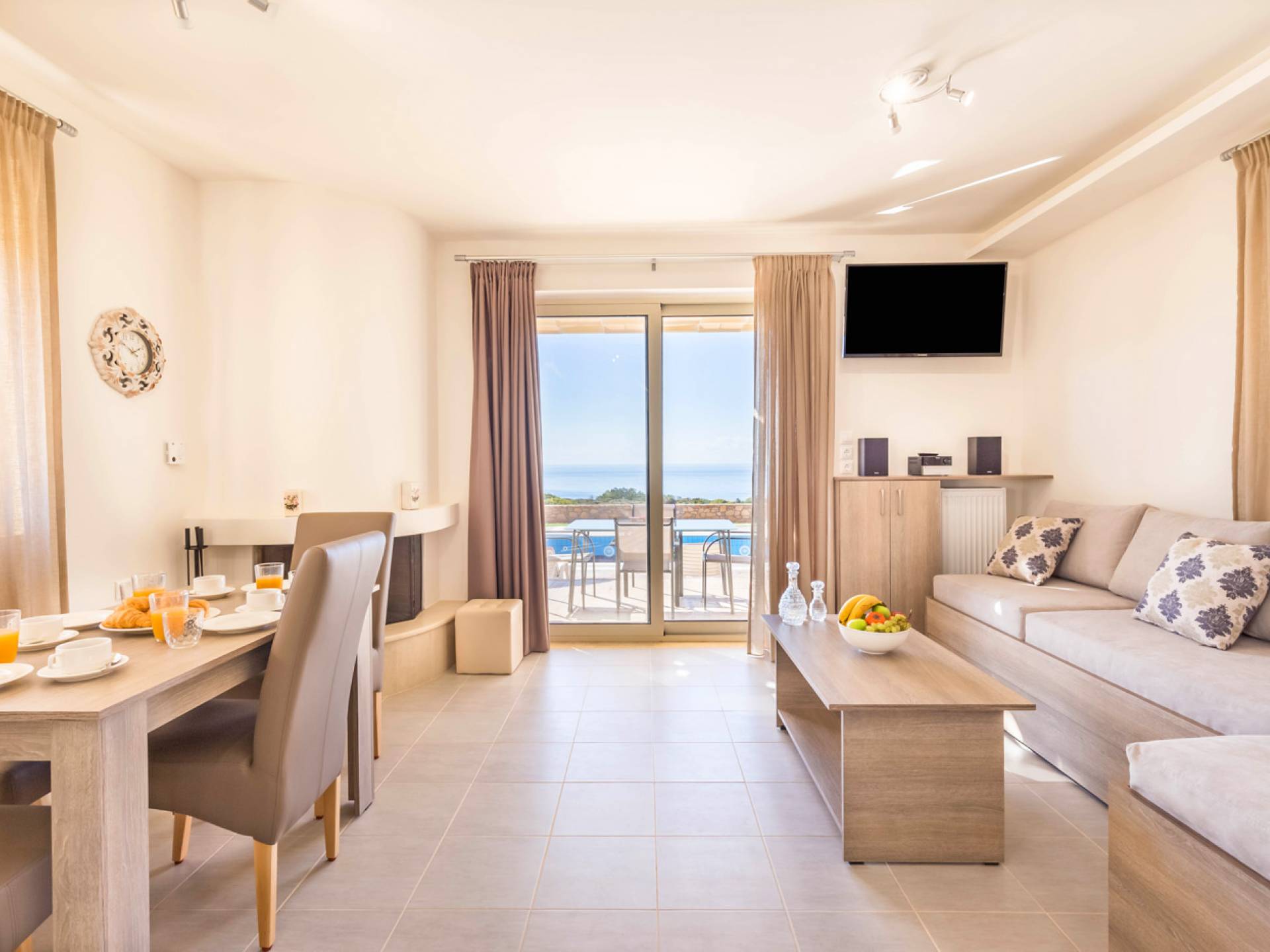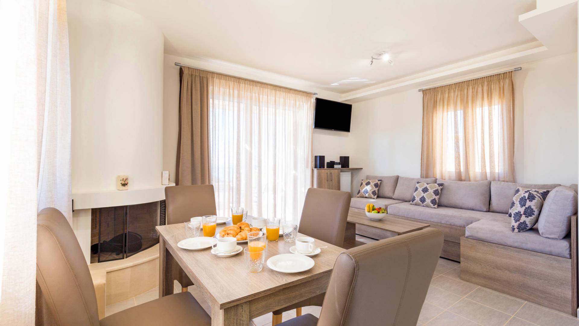- Elegant living area with fireplace, TV, Wi-Fi, and sound system
