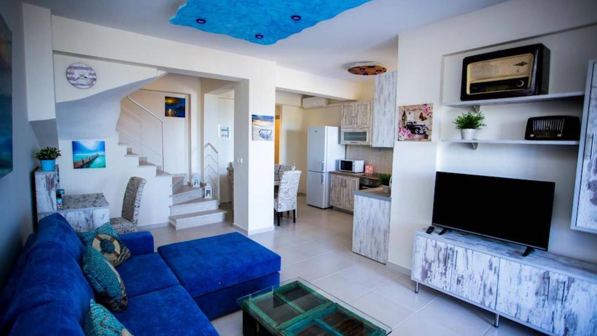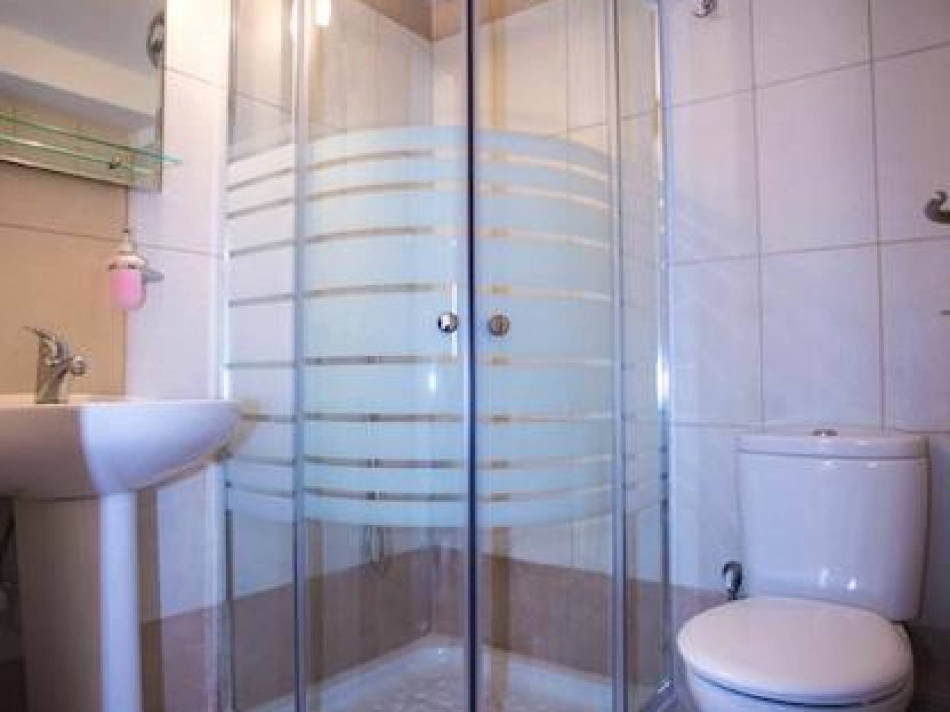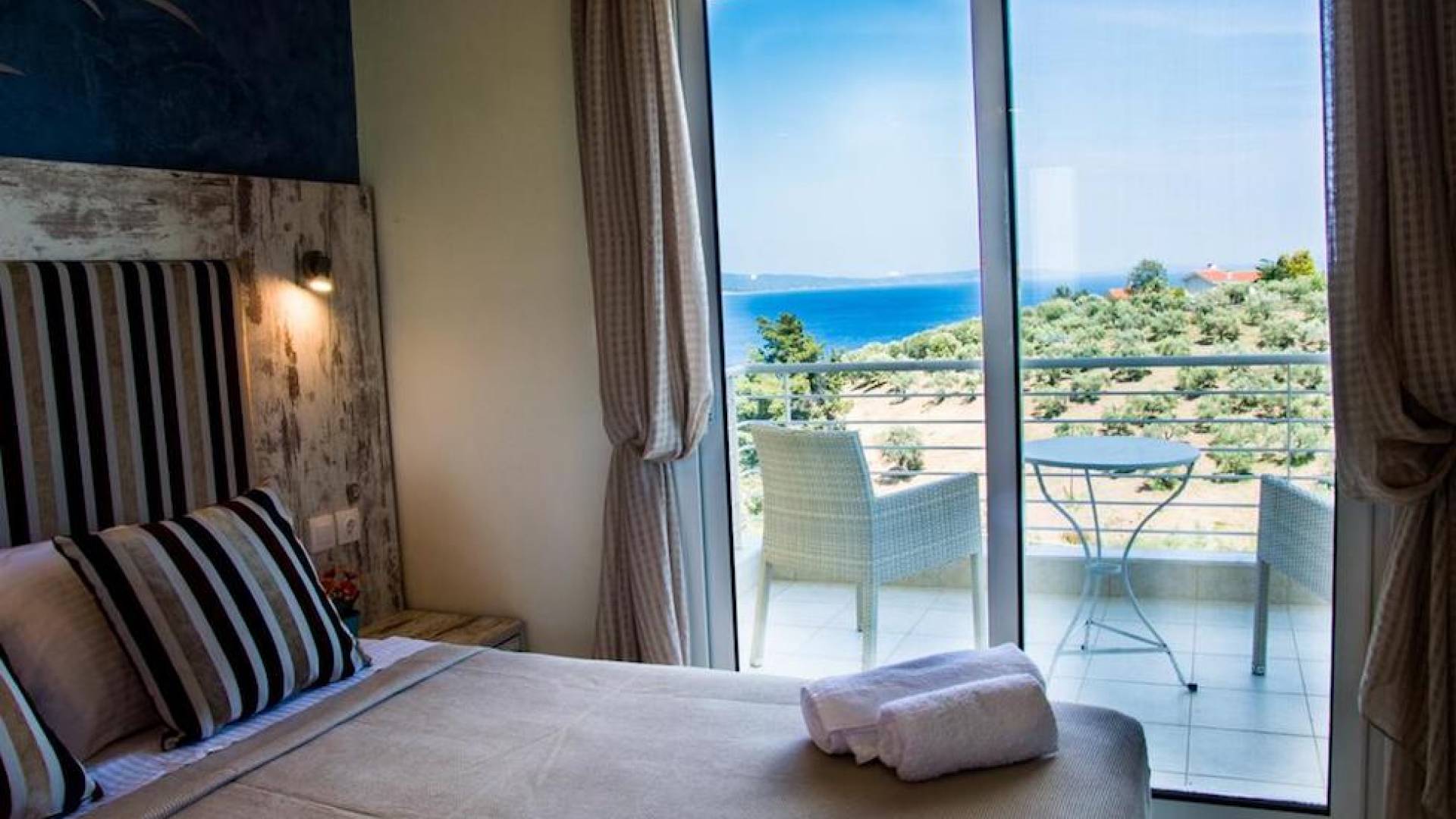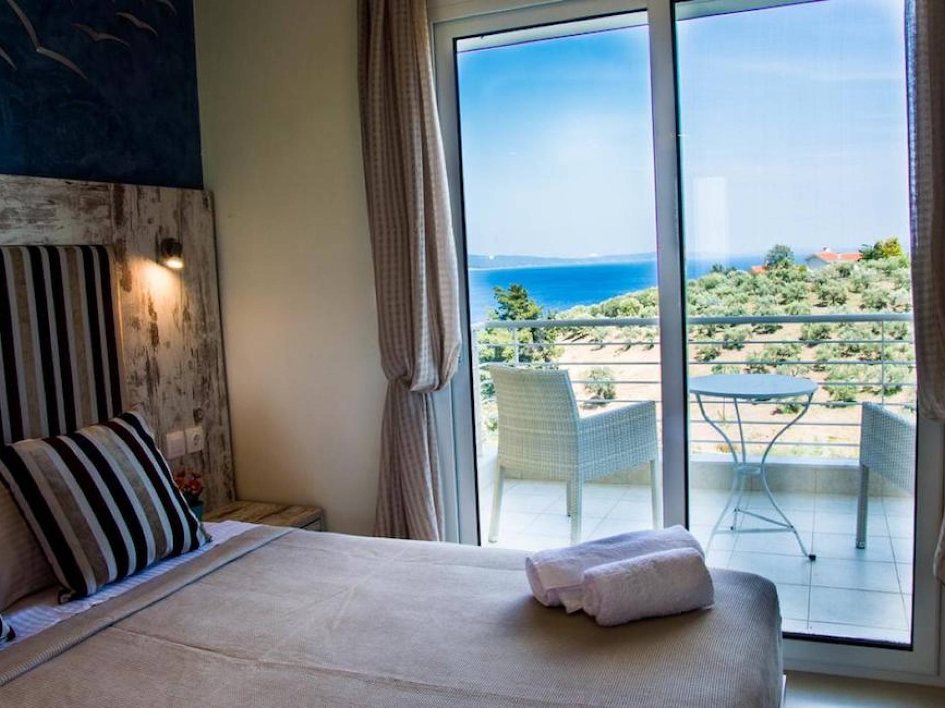 Вход в дом через главный вход - прихожая, которая ведет в комнату с двуспальной кроватью, мини-баром, 32-дюймовым телевизором и кондиционером, комнату с двуспальной кроватью и кондиционером. , и ванная комната с душевой кабиной. Обе комнаты имеют собственную террасу с панорамным видом на море и полуостров Афон. Наверху, над комнатами, находится чердак площадью 20 кв.м с двуспальной кроватью, 1 раскладывающимся двуспальным диваном, мини-баром, 32-дюймовым телевизором, кондиционером и туалетом. На первом этаже находится комната с 2 односпальными кроватями, которые можно составить в одну двуспальную кровать. Большая центральная роскошная ванная комната с душевой кабиной и стиральной машиной.