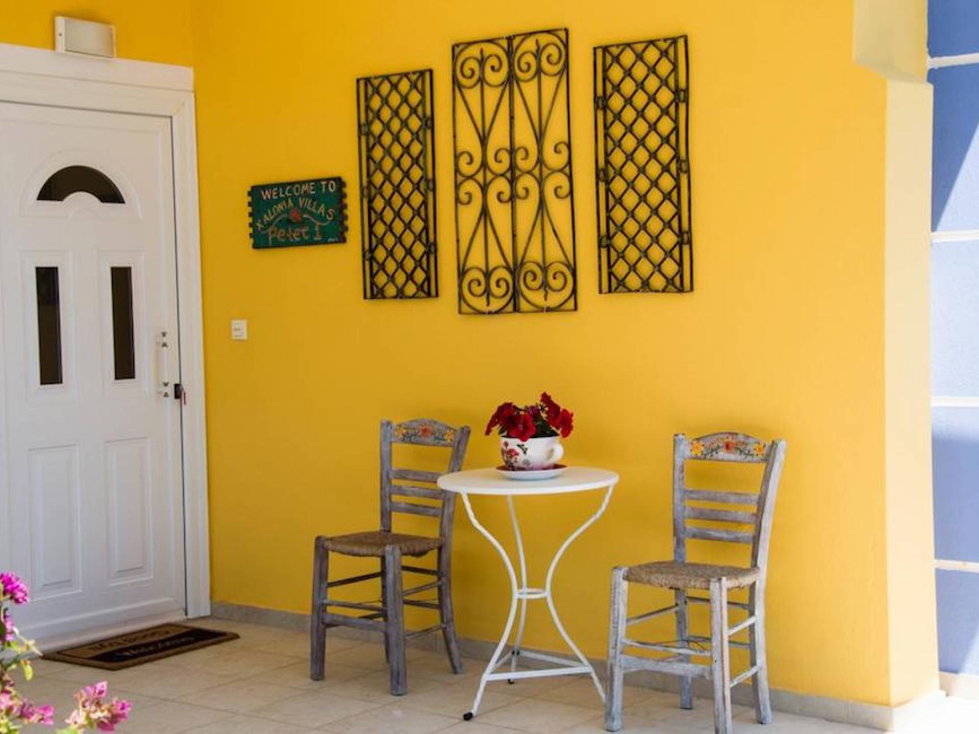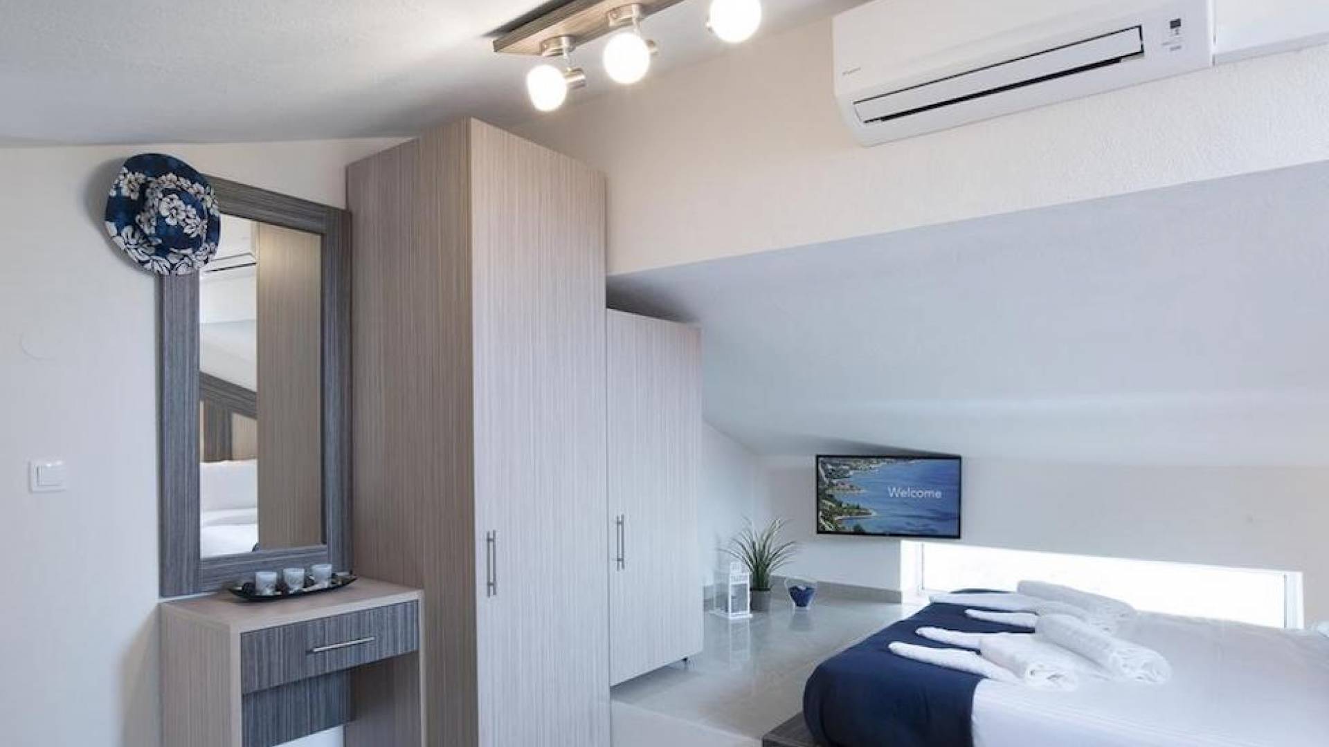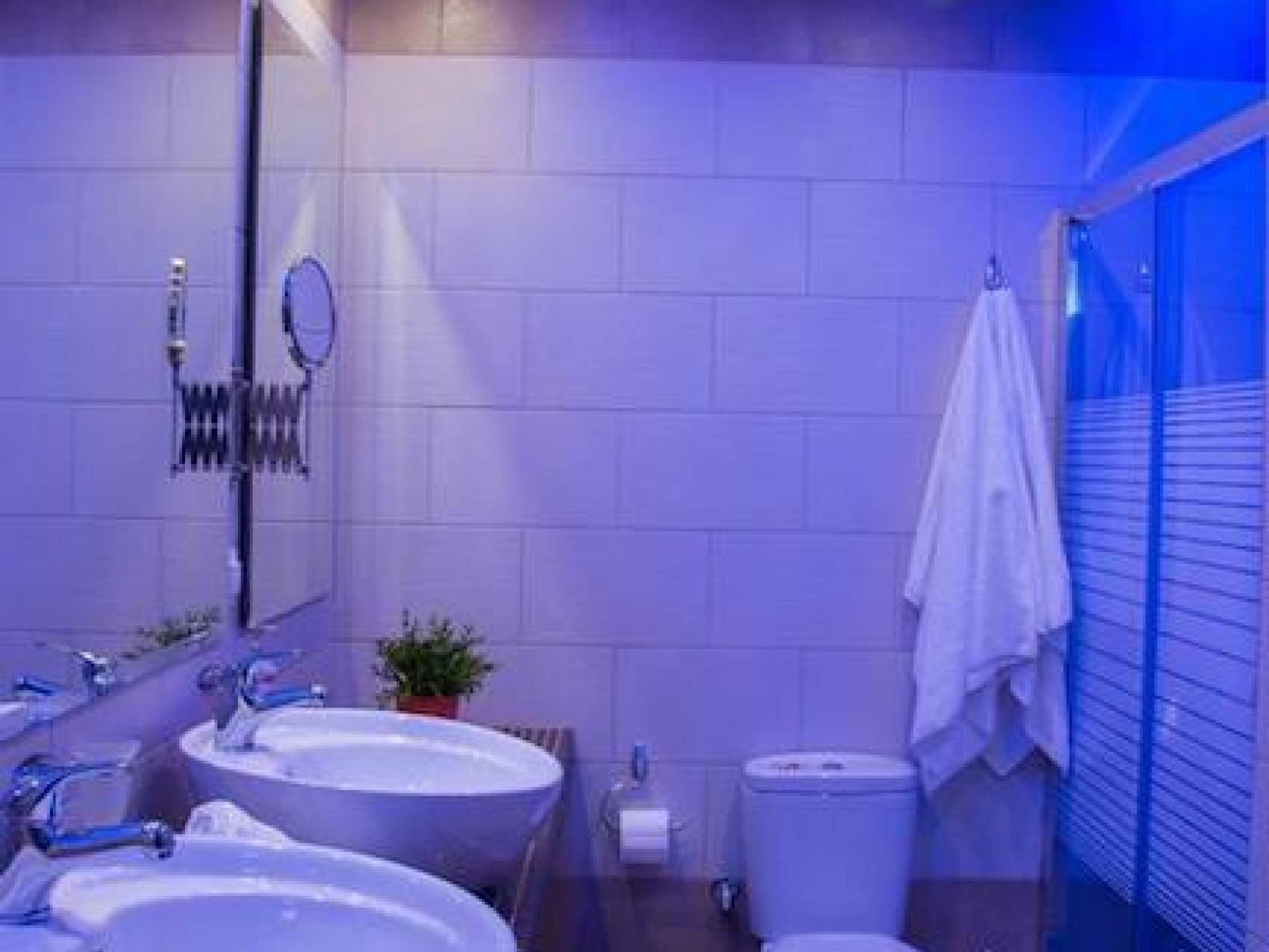 Вход в дом через главный вход - прихожая, которая ведет в комнату с двуспальной кроватью, мини-баром, 32-дюймовым телевизором и кондиционером, комнату с двуспальной кроватью и кондиционером. , и ванная комната с душевой кабиной. Обе комнаты имеют собственную террасу с панорамным видом на море и полуостров Афон. Наверху, над комнатами, находится чердак площадью 20 кв.м с двуспальной кроватью, 1 раскладывающимся двуспальным диваном, мини-баром, 32-дюймовым телевизором, кондиционером и туалетом. На первом этаже находится комната с 2 односпальными кроватями, которые можно составить в одну двуспальную кровать. Большая центральная роскошная ванная комната с душевой кабиной и стиральной машиной.