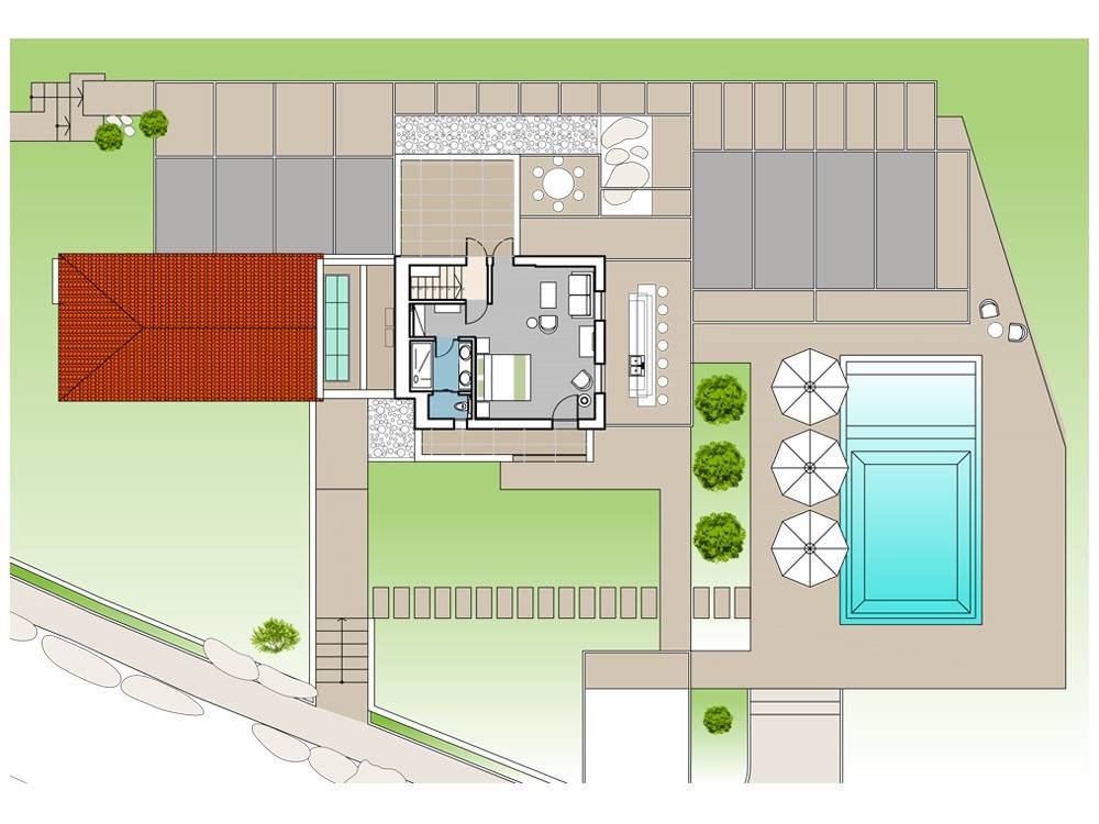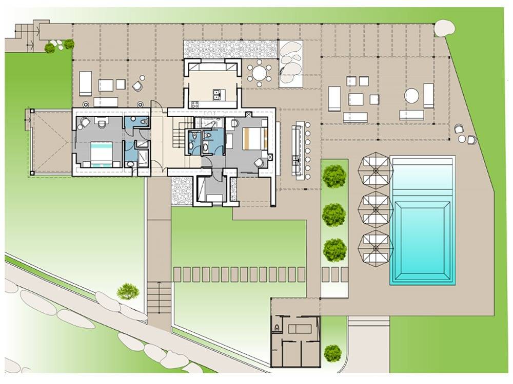 На первом этаже площадью 55 м2 находится главная спальня с гостиной и ванной комнатой с яркой непринужденной роскошью и величественным видом на Крифтос и гору Афон. На просторном первом этаже площадью 130 м2 расположены 2 изысканные спальни с отличительной архитектурой и элементами дизайна интерьера, окна от пола до потолка, 2 ванные комнаты, кухня и зимняя столовая.