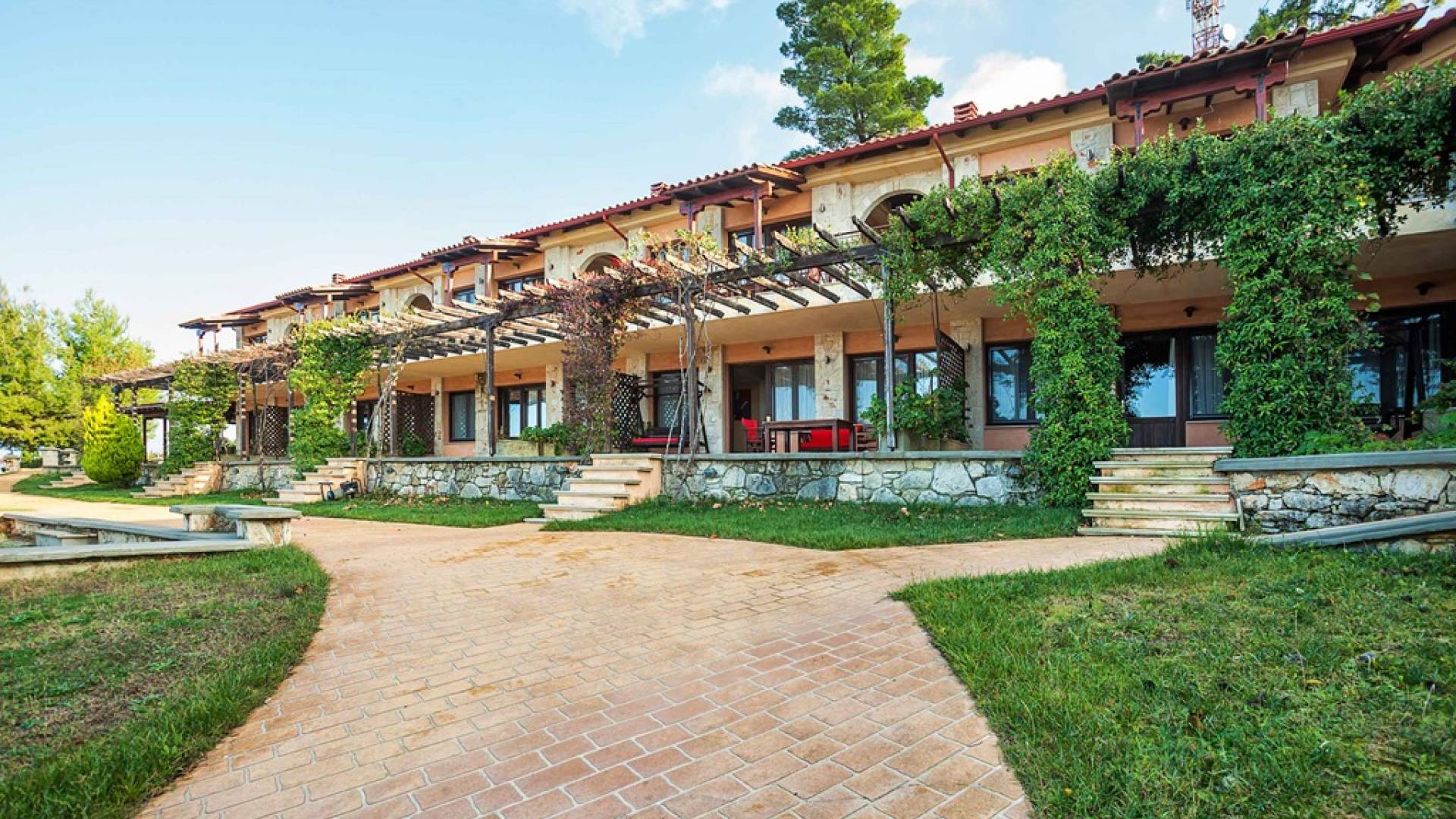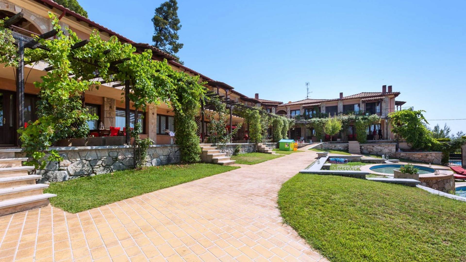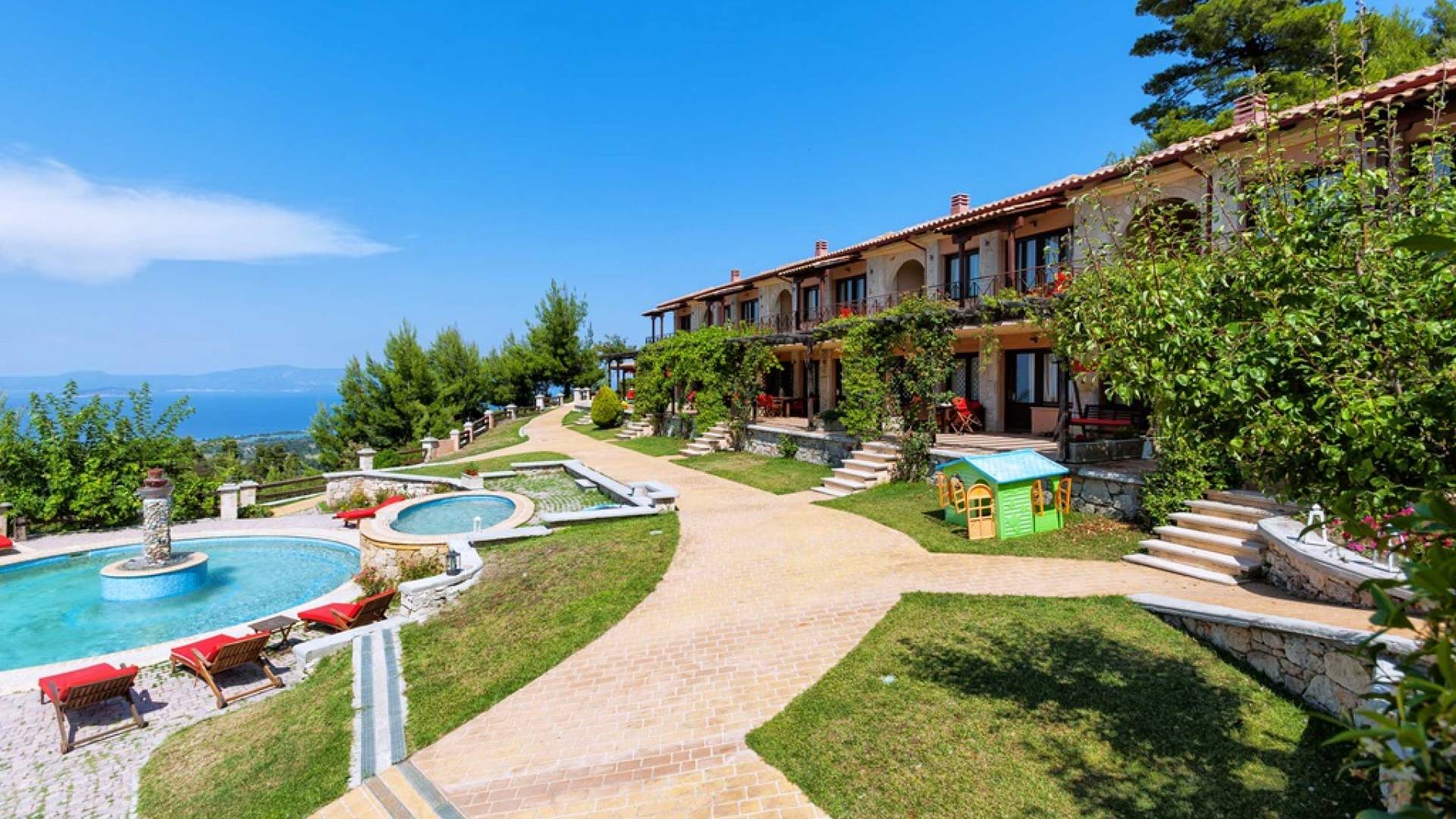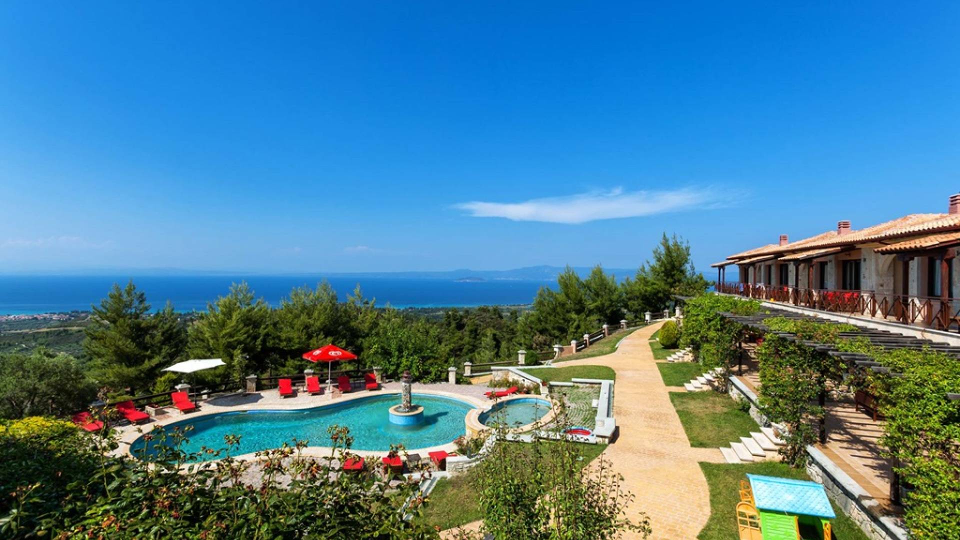 Это приятное и безмятежное место включает в себя три мастерски построенных жилых комплекса, из которых открывается панорамный вид на залив Торонайос. Все резиденции (2 частные виллы, 13 роскошных вилл, 12 люксов) выходят окнами на сады, бассейны и, конечно же, на бескрайнюю синеву моря и неба.