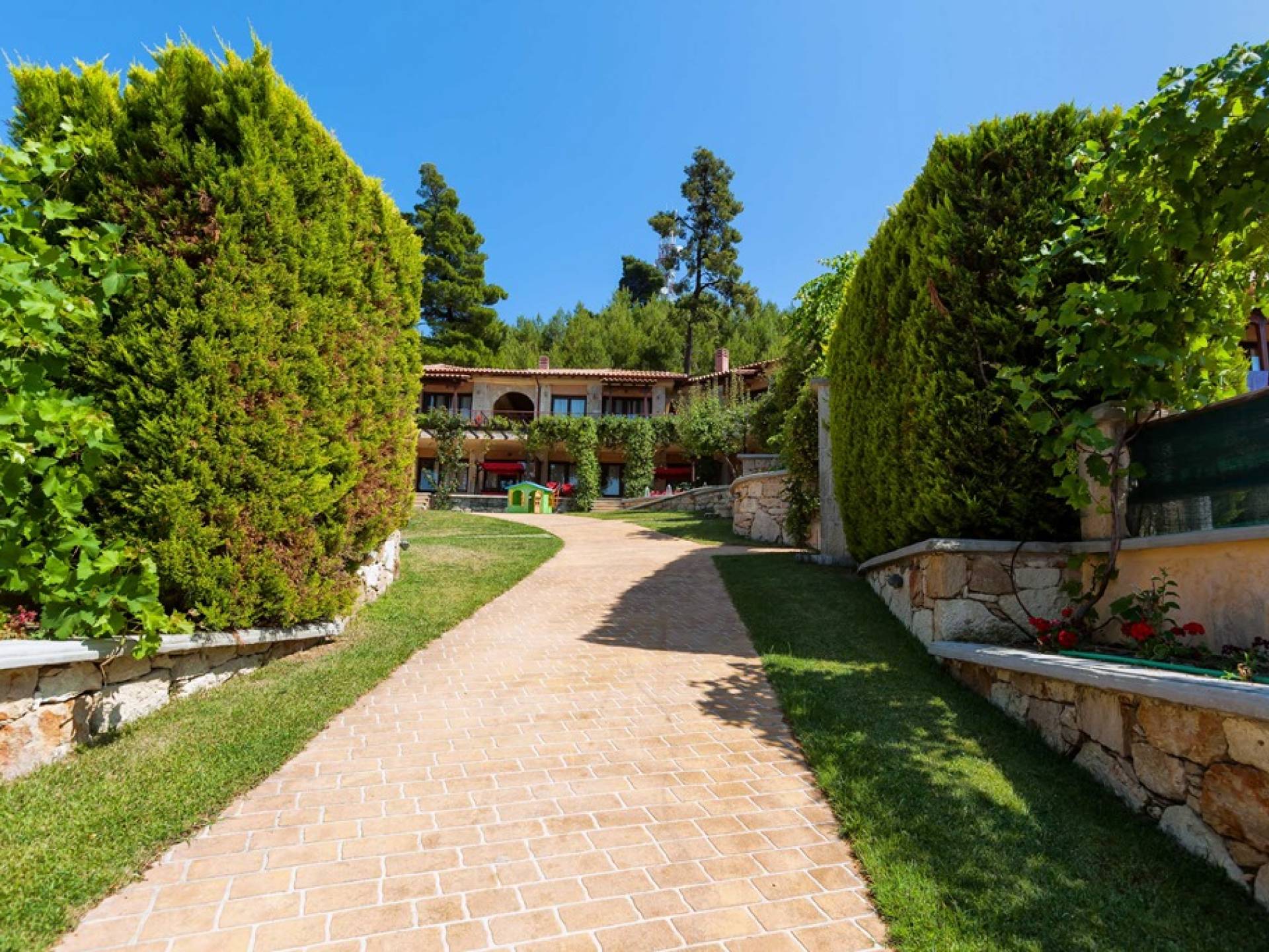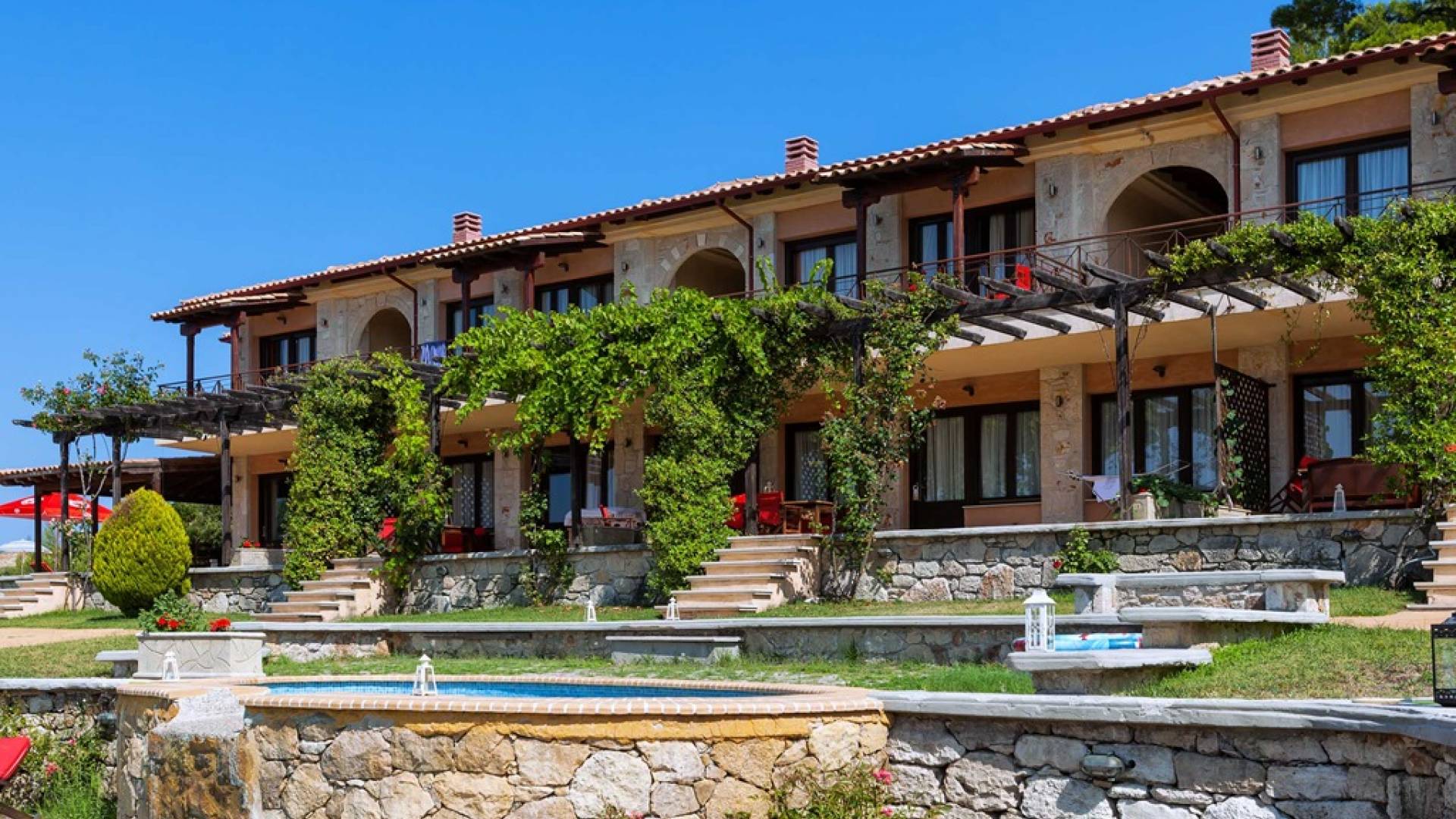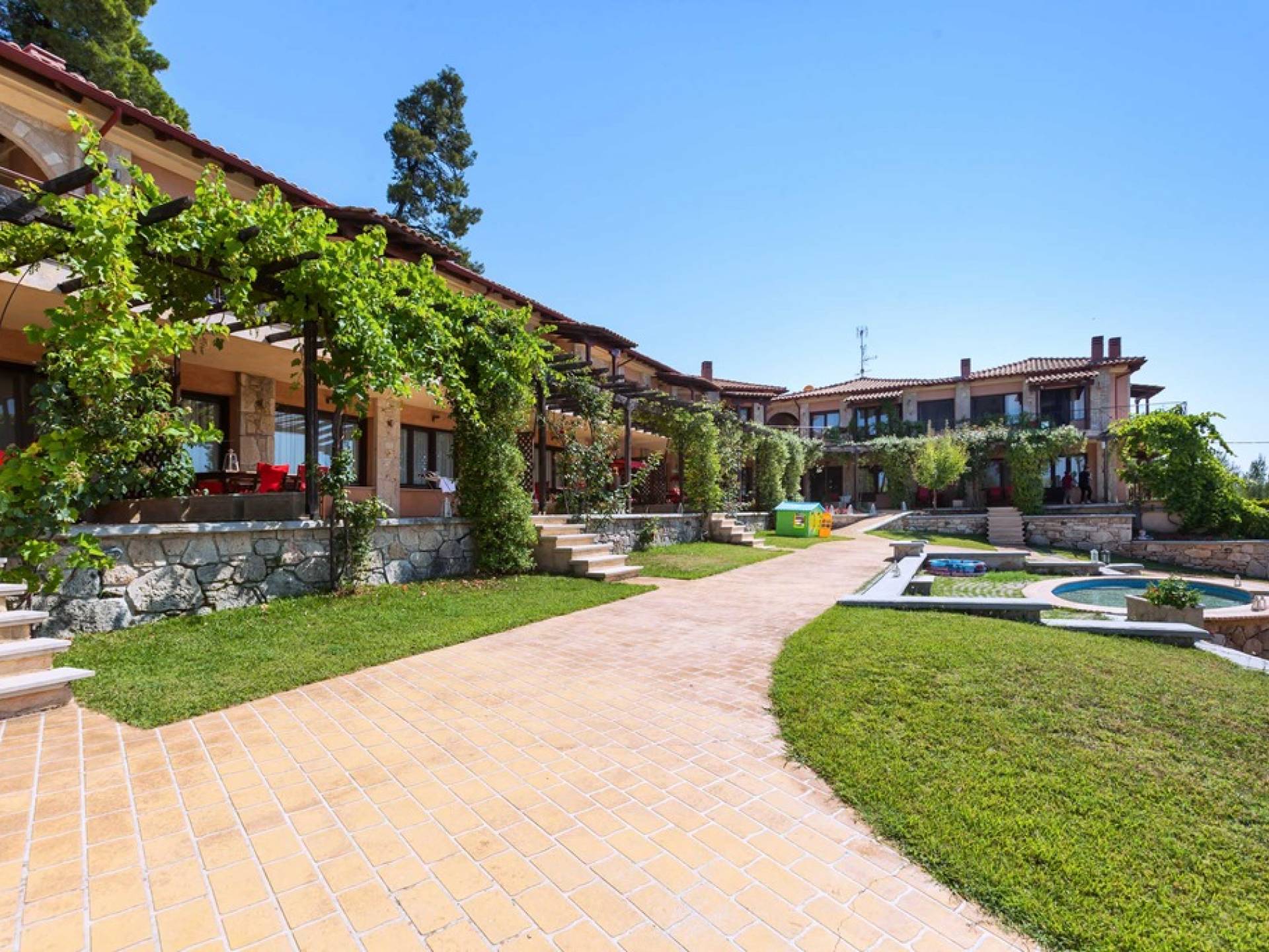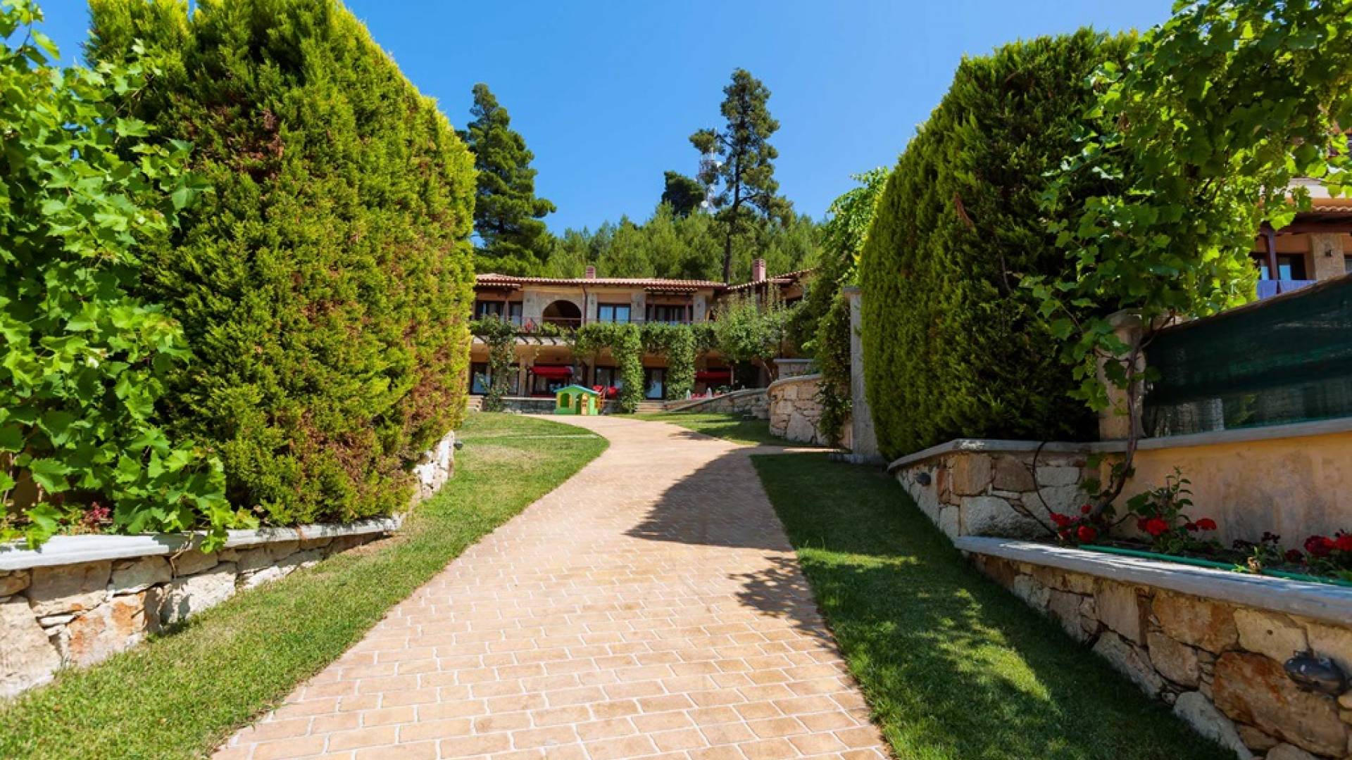 Это приятное и безмятежное место включает в себя три мастерски построенных жилых комплекса, из которых открывается панорамный вид на залив Торонайос. Все резиденции (2 частные виллы, 13 роскошных вилл, 12 люксов) выходят окнами на сады, бассейны и, конечно же, на бескрайнюю синеву моря и неба.