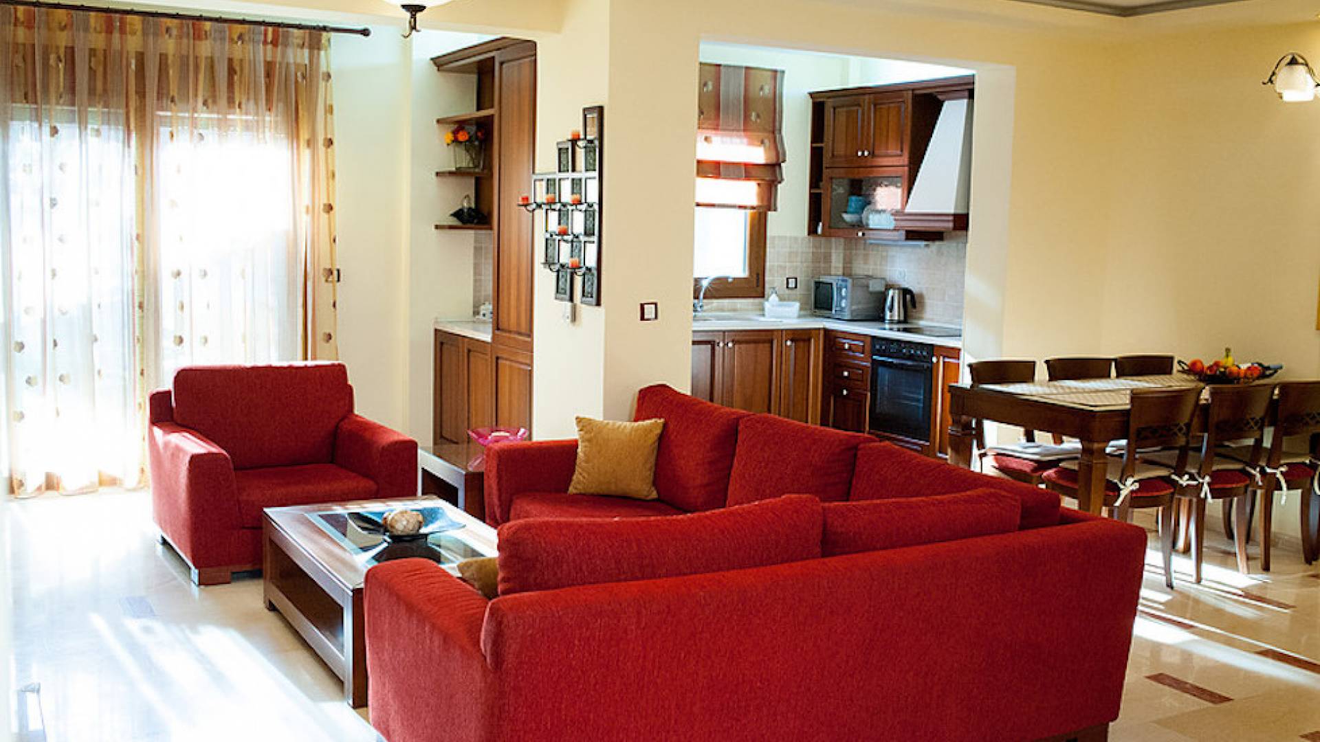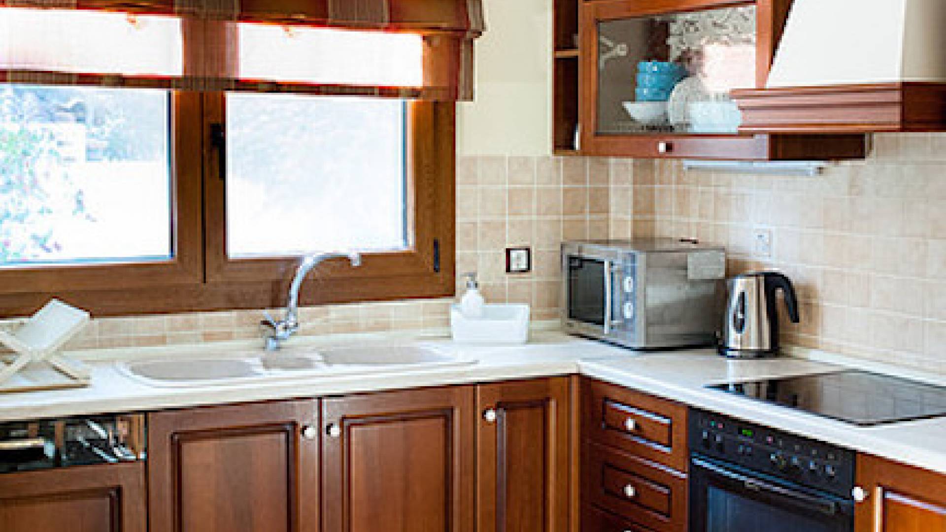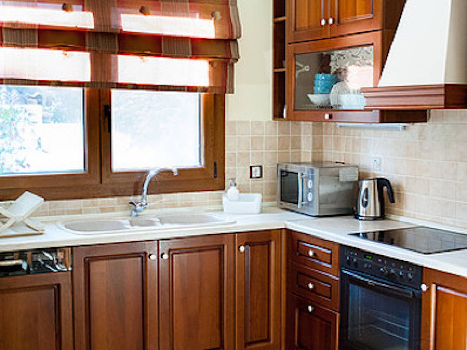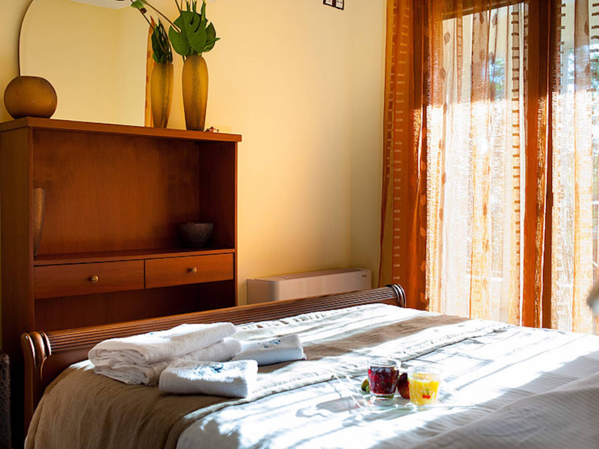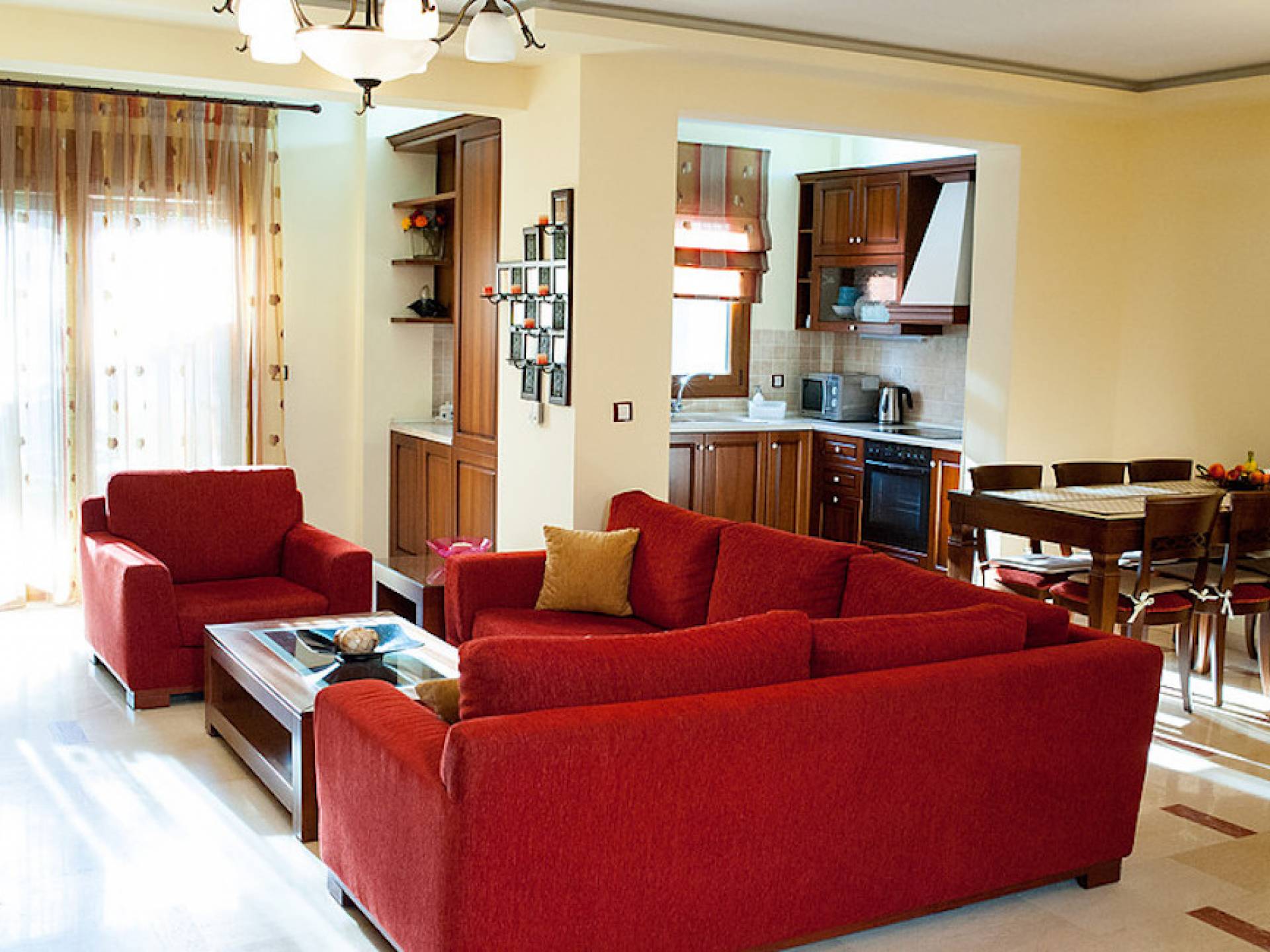 Первый этаж: крытая гостиная с плоской сб. ТВ и обеденная зона в помещении на 6 человек. Полностью оборудованная кухня. Гостевой туалет. Спальня с двуспальной кроватью размера "queen-size", ванная комната. Первый этаж: спальня с двуспальной кроватью размера «queen-size», ванная комната, балкон с боковым видом на море / сад. Спальня с двумя односпальными кроватями или с большой двуспальной кроватью и балконом с боковым видом на море / сад. Вторая полностью оборудованная ванная комната.