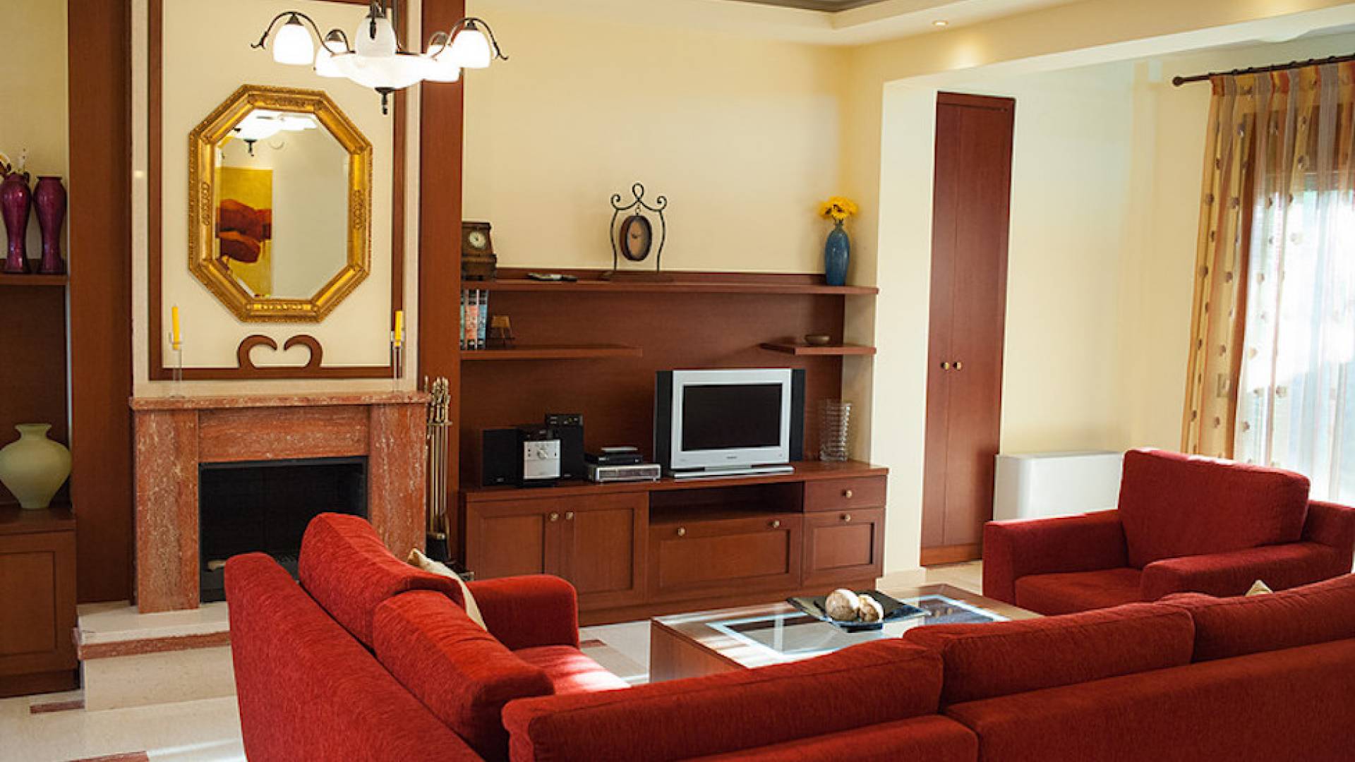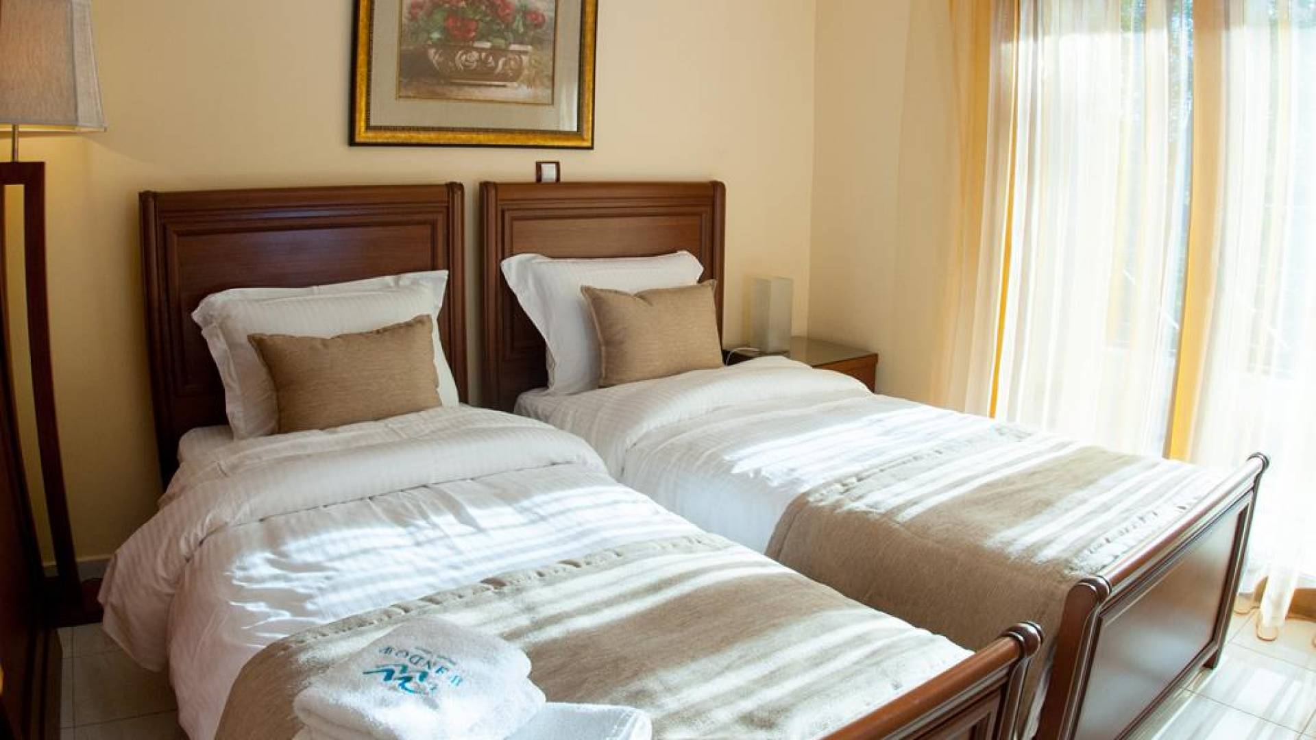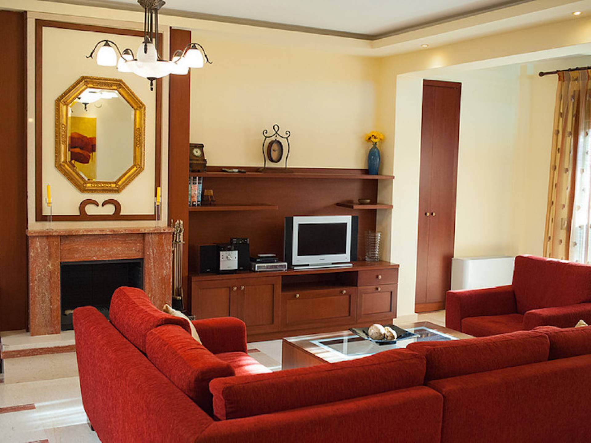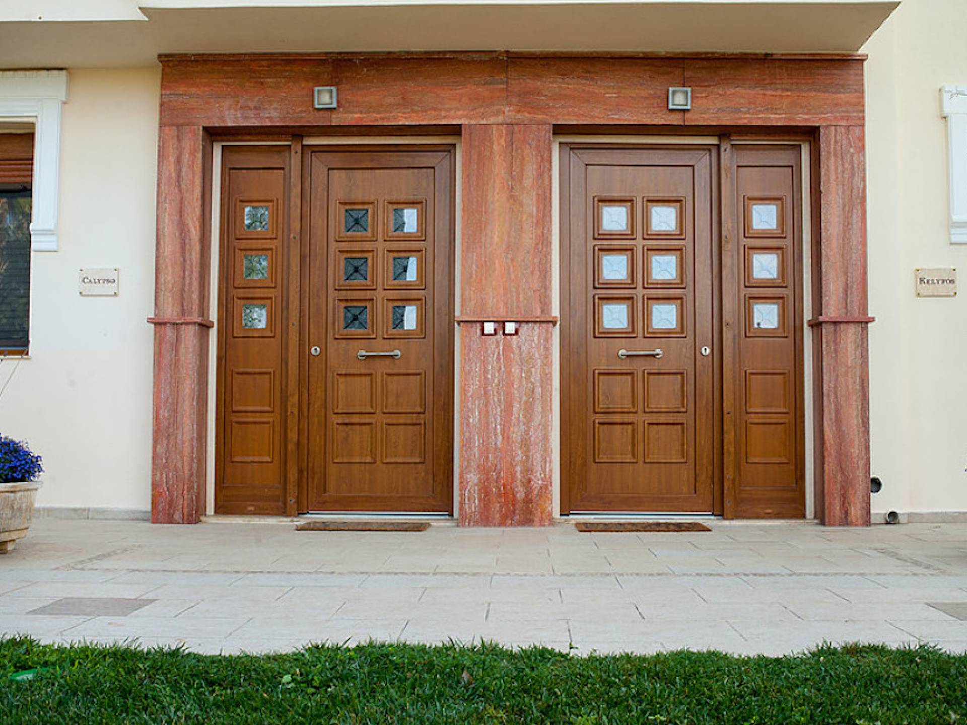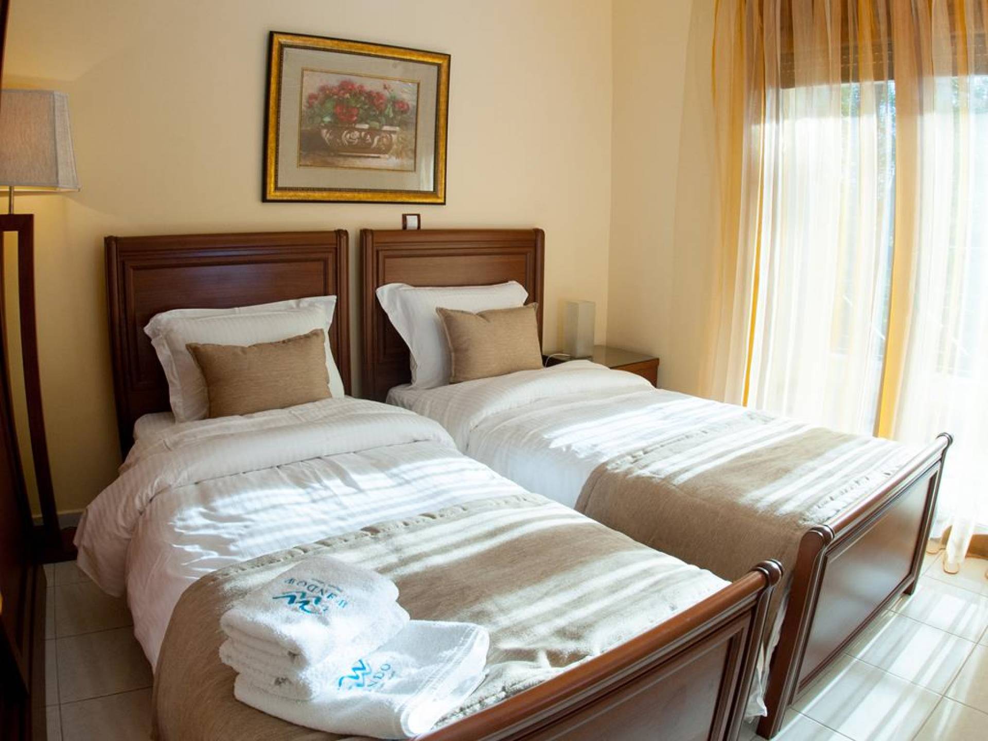Первый этаж: крытая гостиная с плоской сб. ТВ и обеденная зона в помещении на 6 человек. Полностью оборудованная кухня. Гостевой туалет. Спальня с двуспальной кроватью размера "queen-size", ванная комната. Первый этаж: спальня с двуспальной кроватью размера «queen-size», ванная комната, балкон с боковым видом на море / сад. Спальня с двумя односпальными кроватями или с большой двуспальной кроватью и балконом с боковым видом на море / сад. Вторая полностью оборудованная ванная комната.