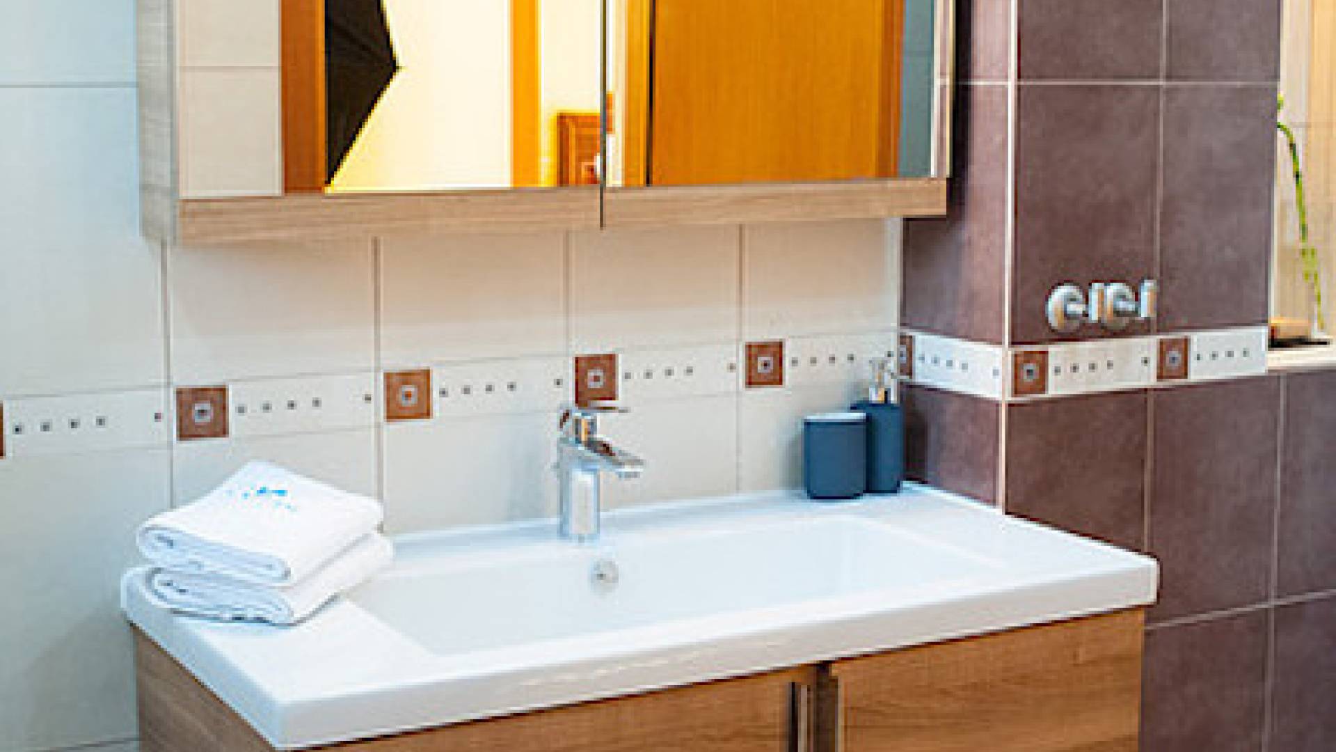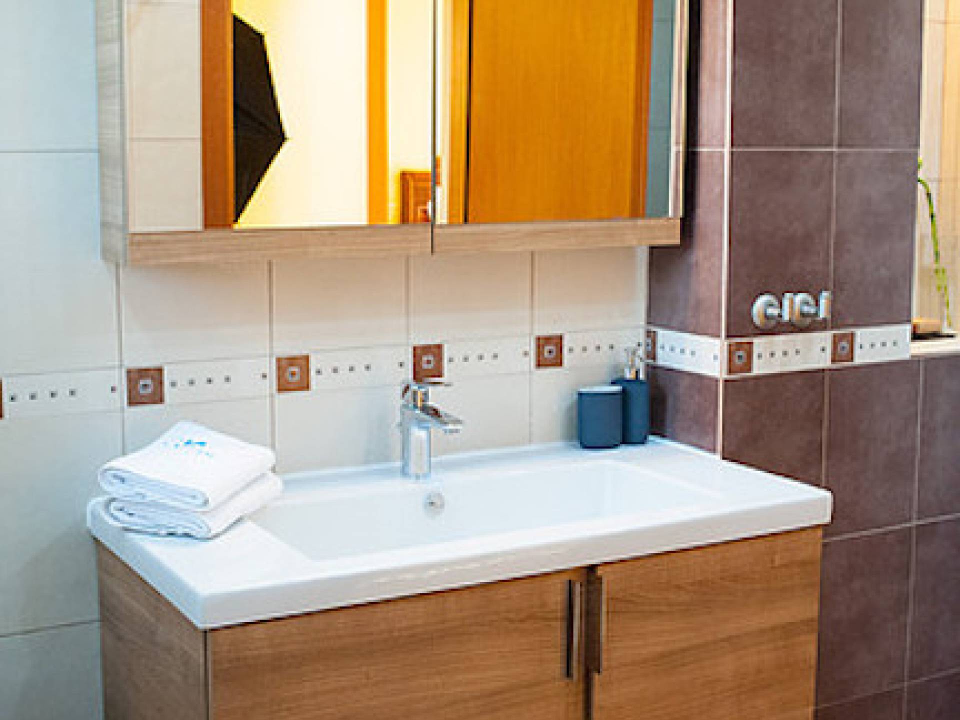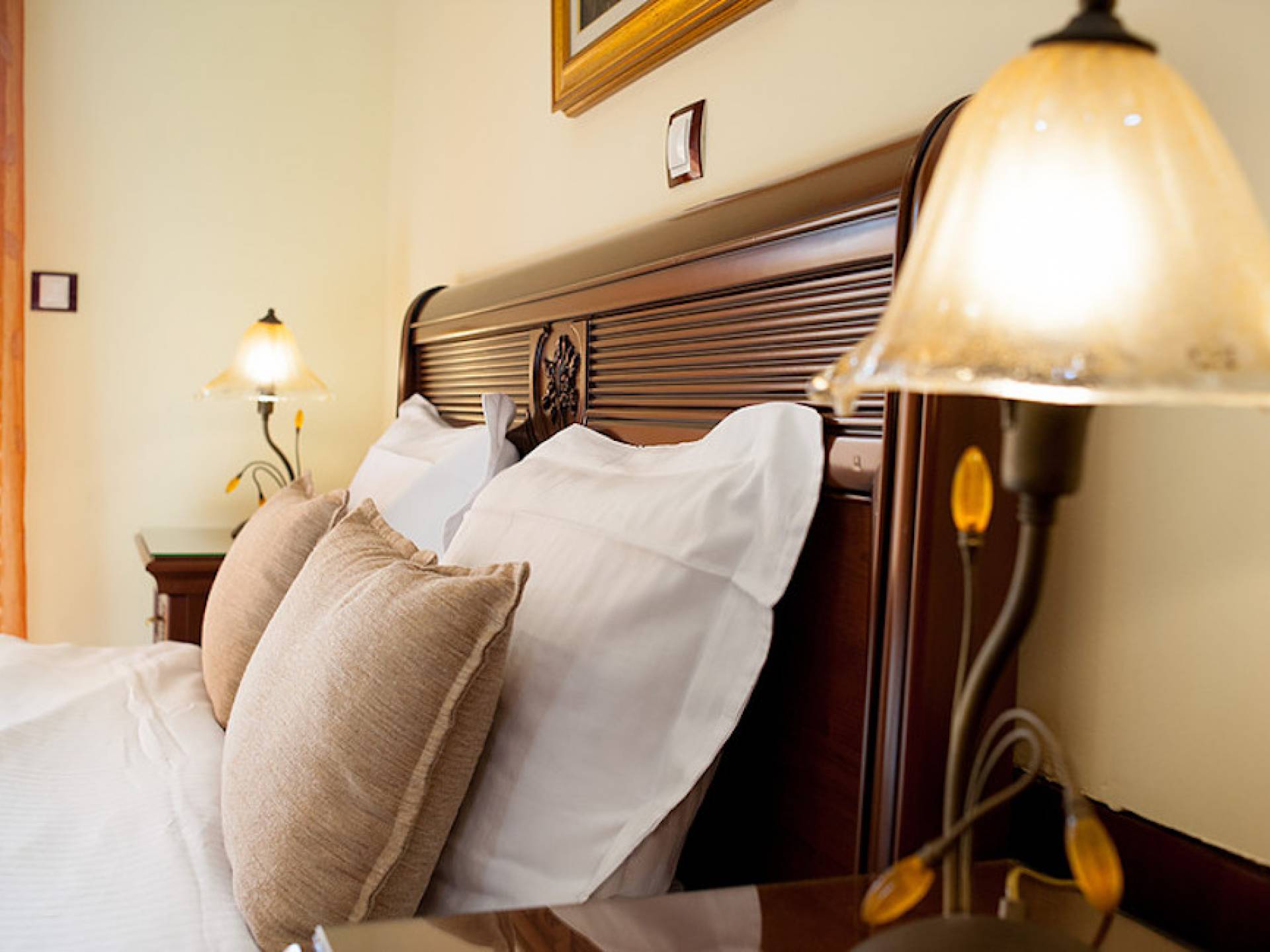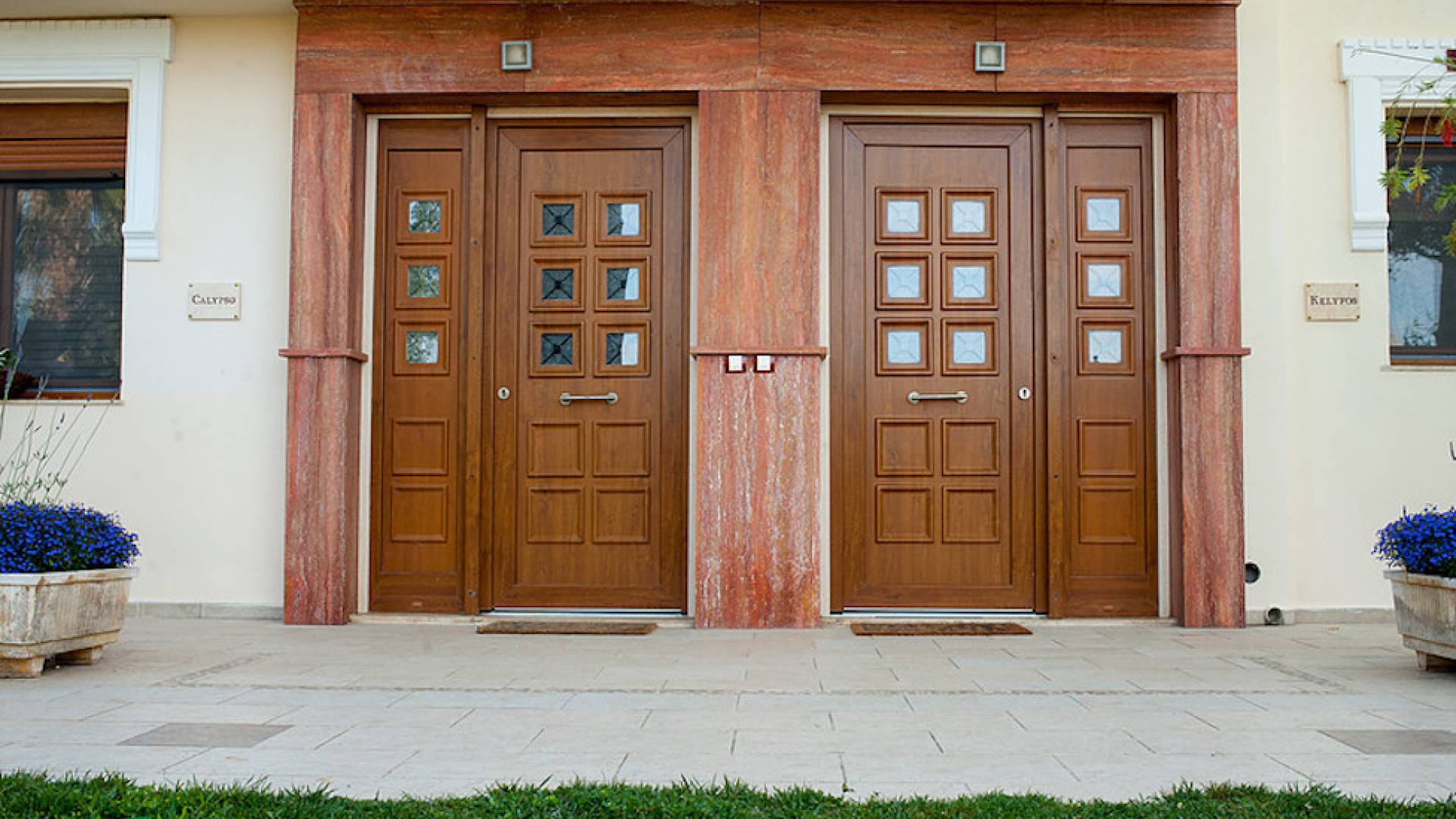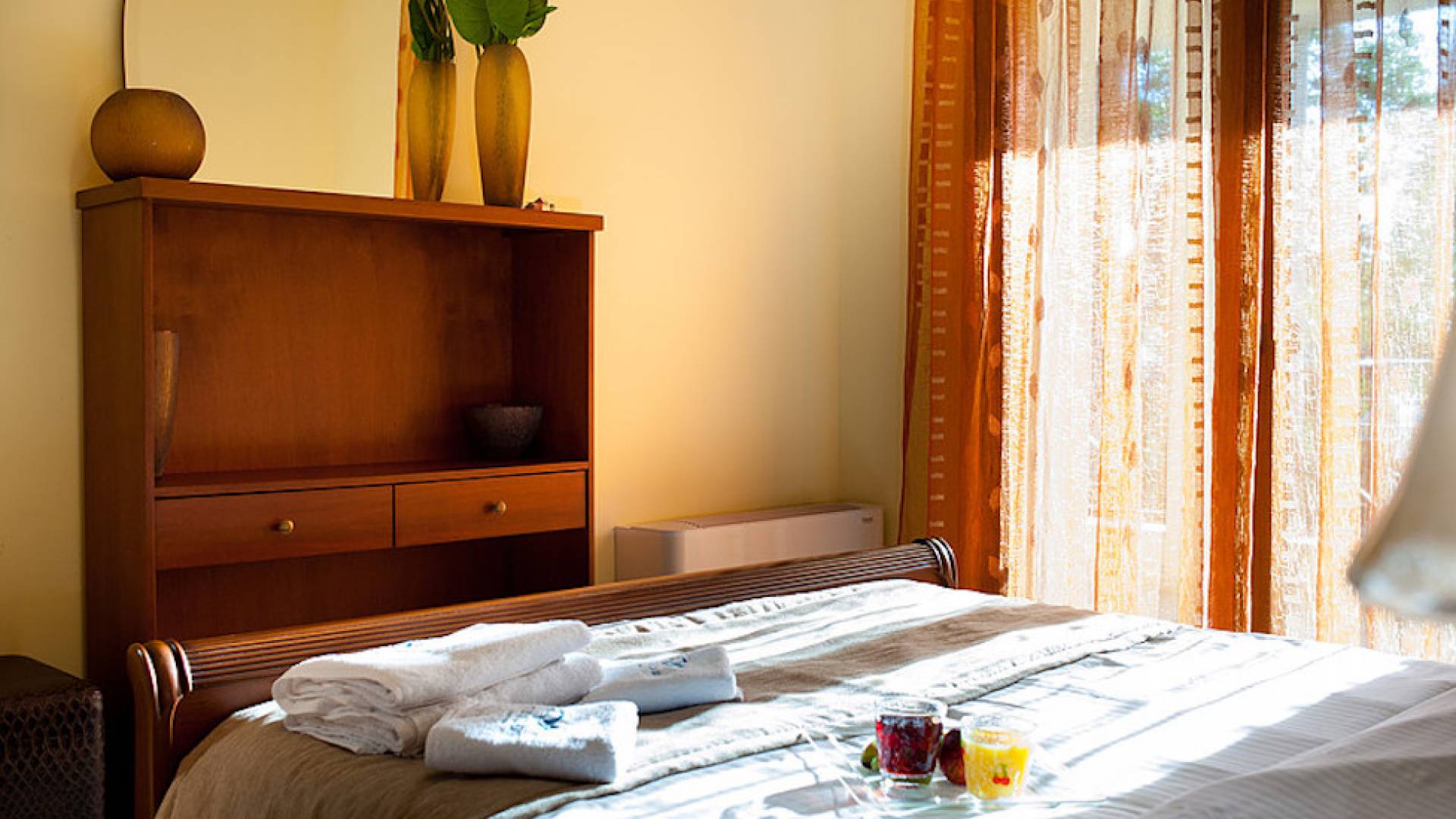Первый этаж: крытая гостиная с плоской сб. ТВ и обеденная зона в помещении на 6 человек. Полностью оборудованная кухня. Гостевой туалет. Спальня с двуспальной кроватью размера "queen-size", ванная комната. Первый этаж: спальня с двуспальной кроватью размера «queen-size», ванная комната, балкон с боковым видом на море / сад. Спальня с двумя односпальными кроватями или с большой двуспальной кроватью и балконом с боковым видом на море / сад. Вторая полностью оборудованная ванная комната.
