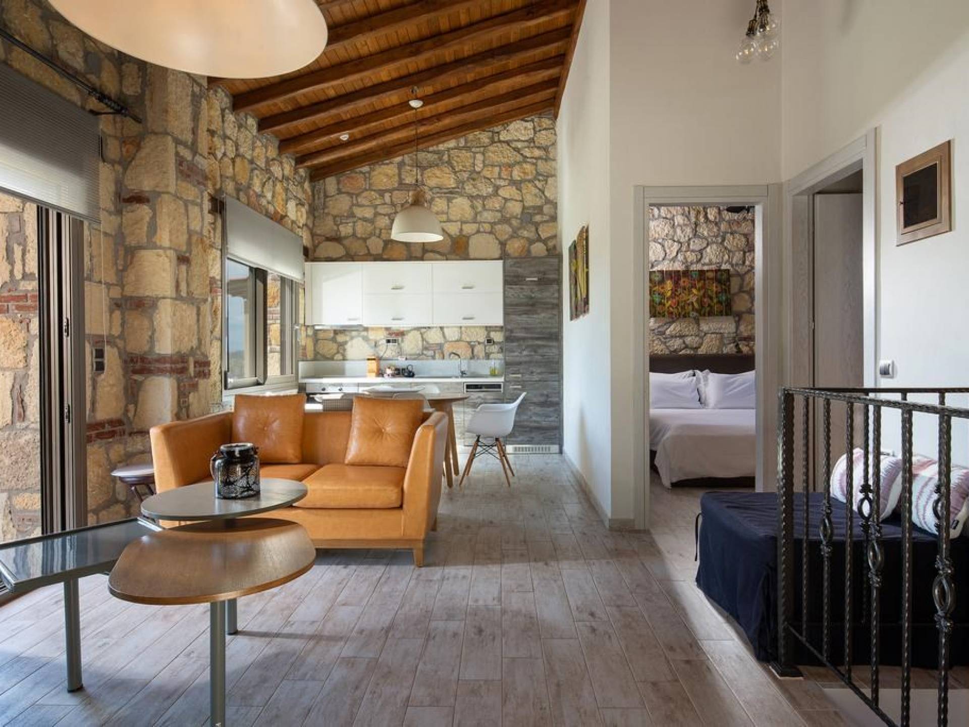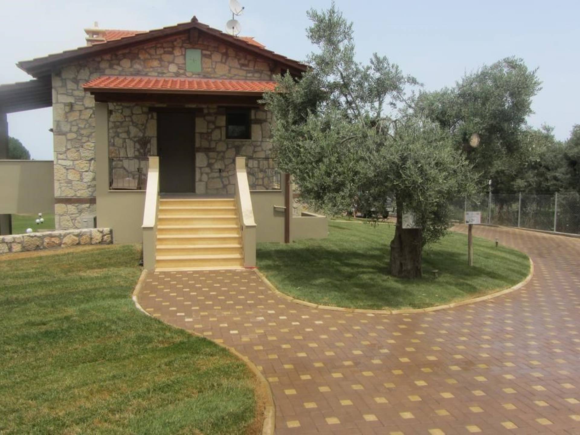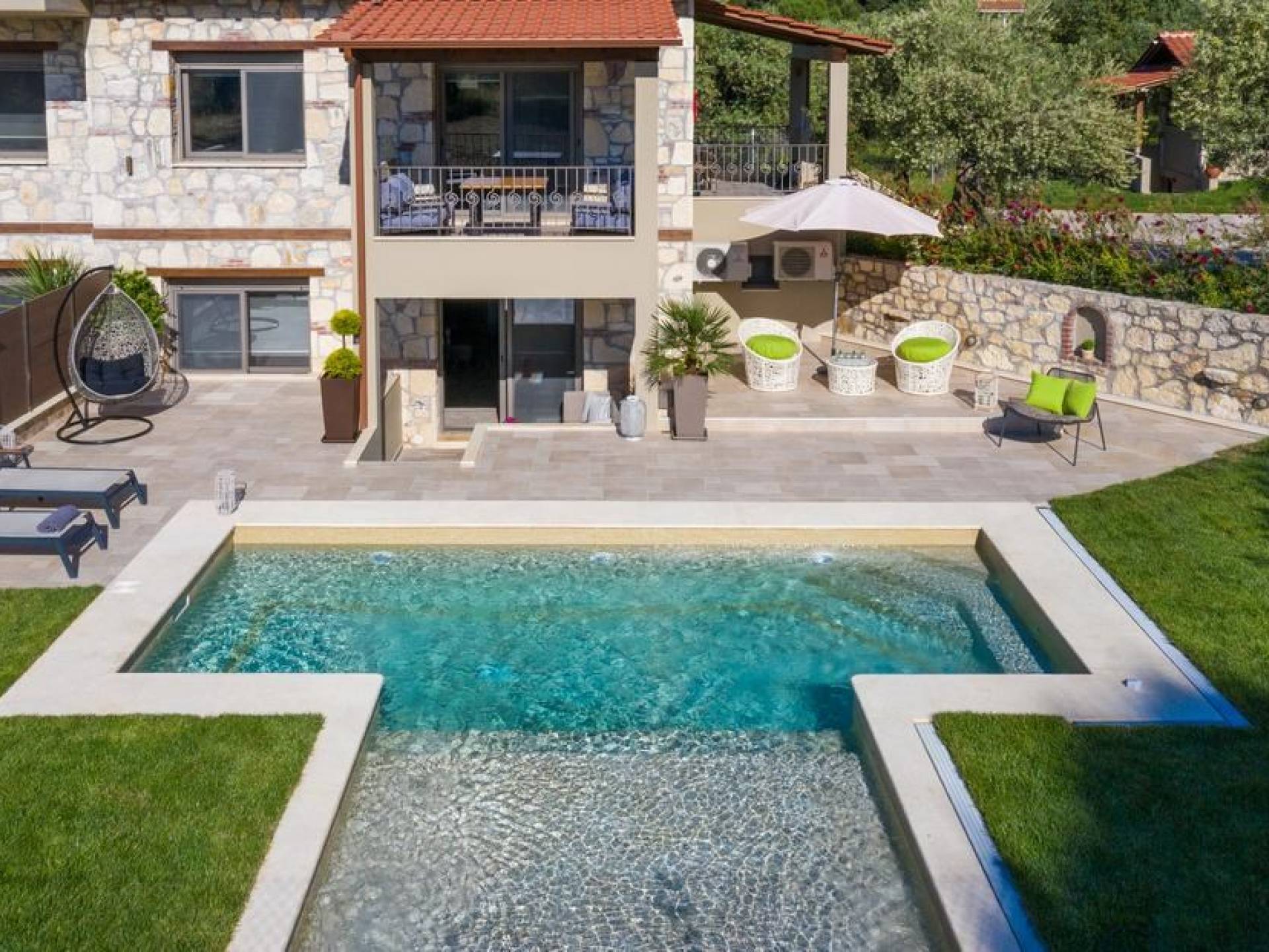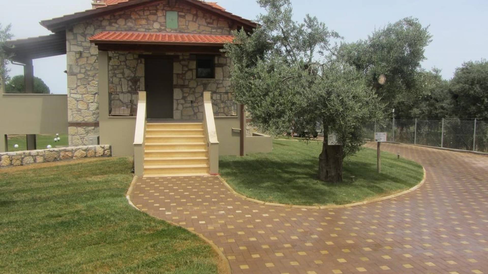 Вилла Осфриси построена на разных уровнях. Он характеризуется просторными и солнечными комнатами. Его дизайн представляет собой уникальную архитектурную линию, сочетающую камень с современными элементами. На первом уровне находится гостиная с диваном-кроватью, спальня с ванной комнатой и веранда с выходом в сад. На втором уровне находится лаунж-зона, современная кухня со столовой, спальня, санузел с душевой кабиной и главный вход. На обоих уровнях есть меблированные веранды.