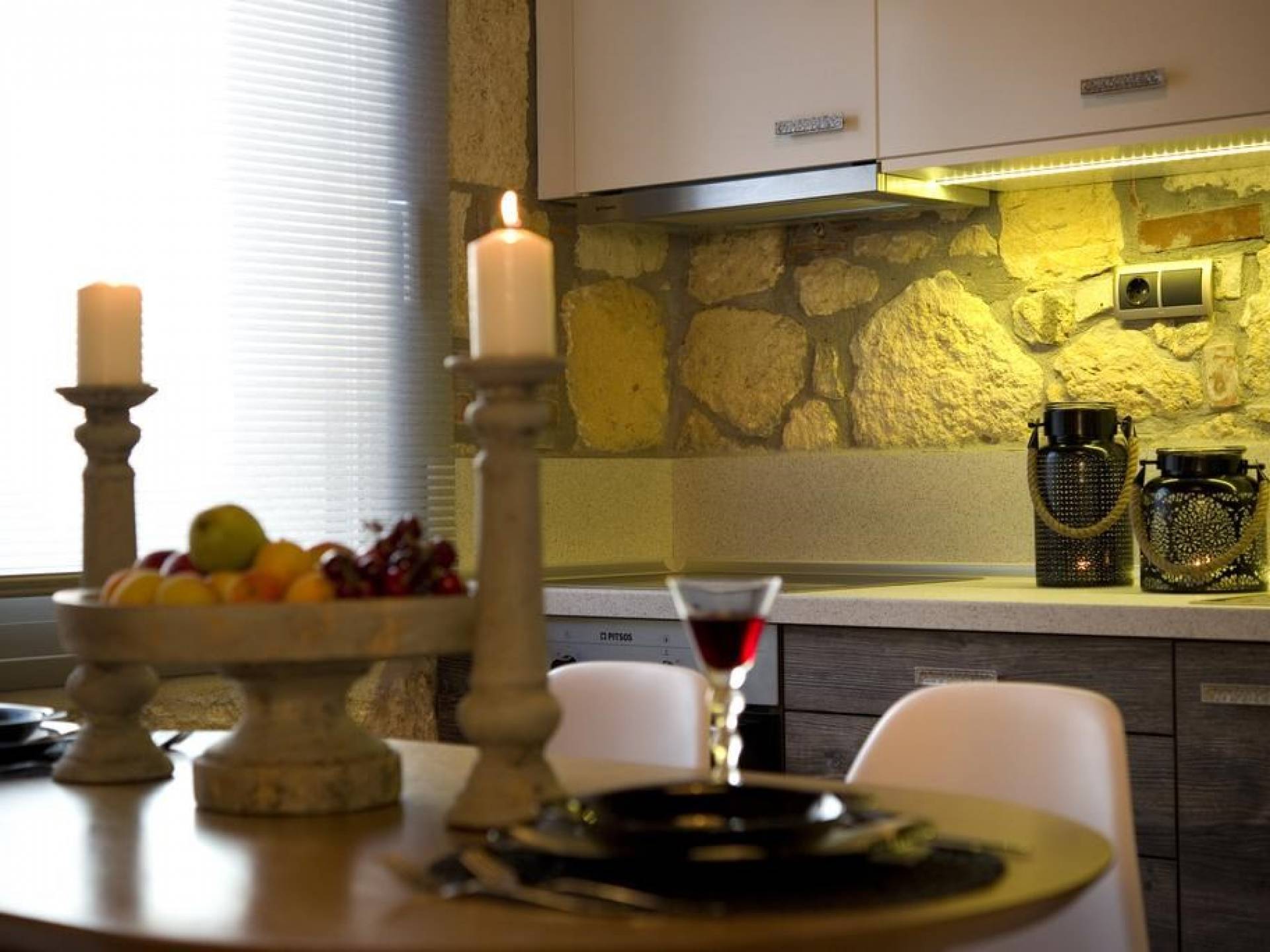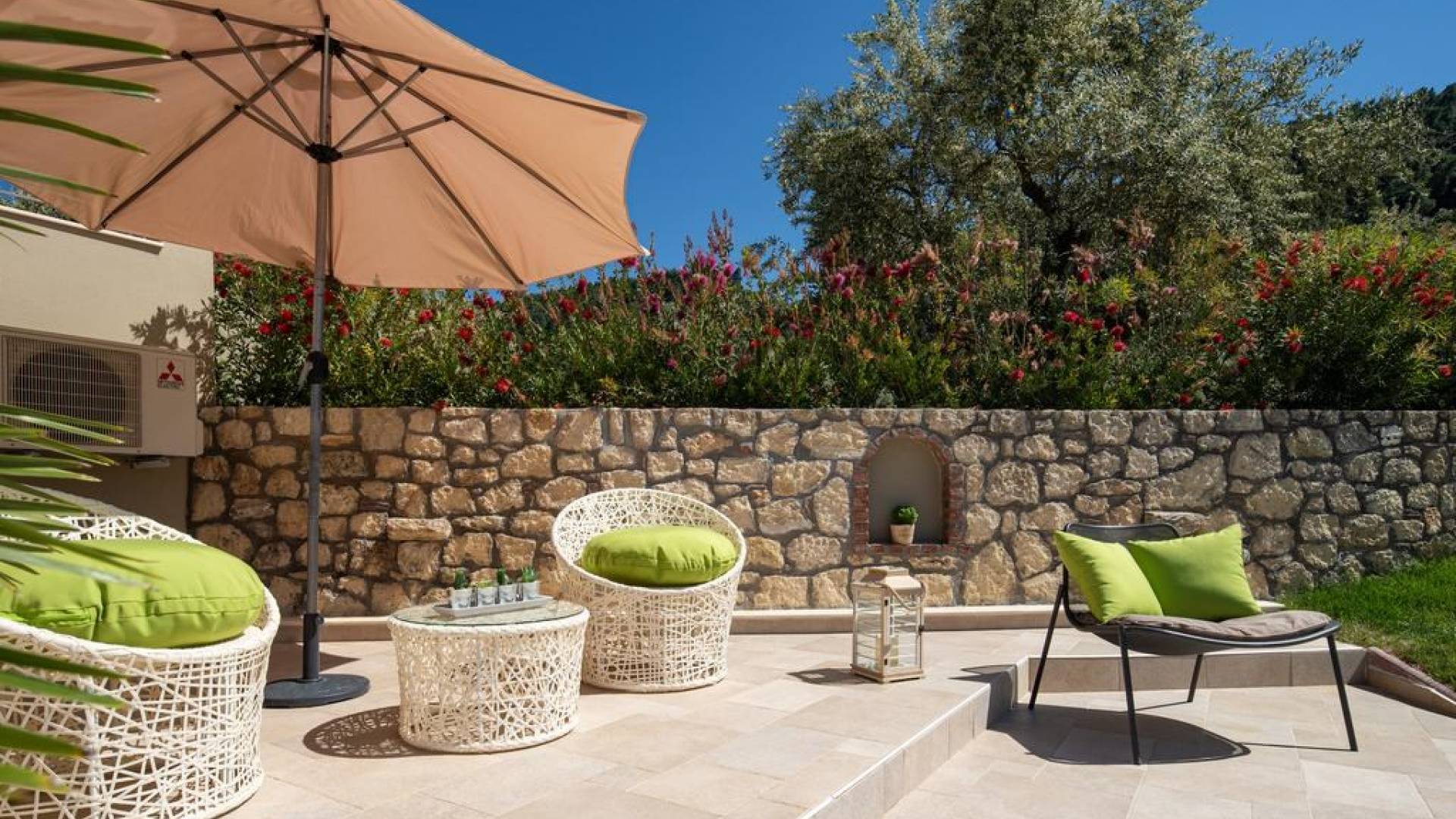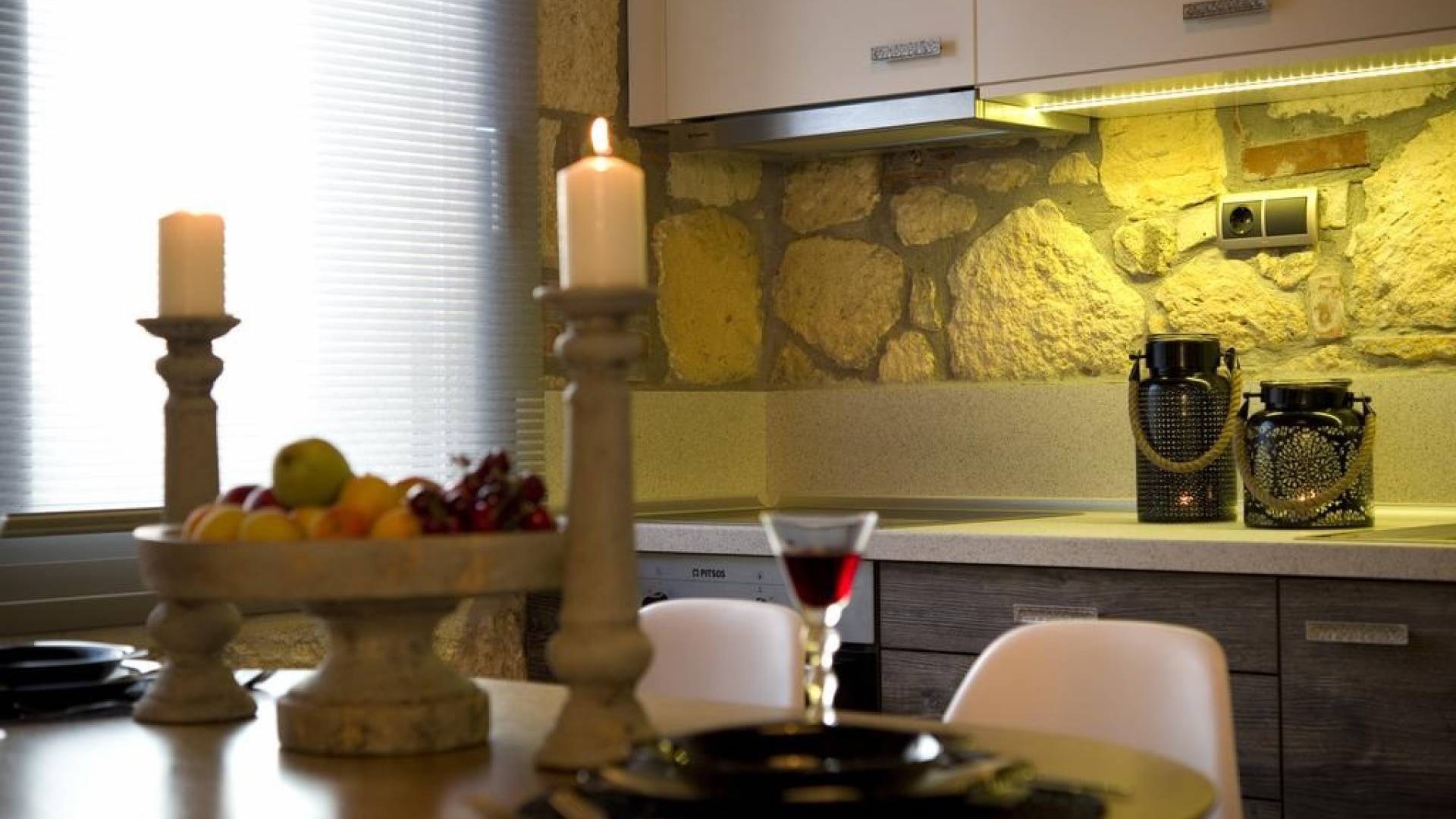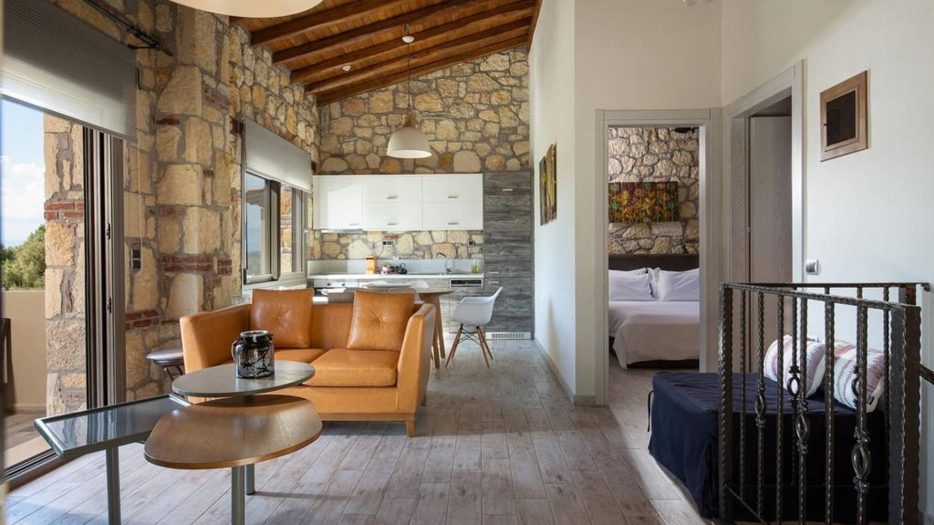 Вилла Осфриси построена на разных уровнях. Он характеризуется просторными и солнечными комнатами. Его дизайн представляет собой уникальную архитектурную линию, сочетающую камень с современными элементами. На первом уровне находится гостиная с диваном-кроватью, спальня с ванной комнатой и веранда с выходом в сад. На втором уровне находится лаунж-зона, современная кухня со столовой, спальня, санузел с душевой кабиной и главный вход. На обоих уровнях есть меблированные веранды.