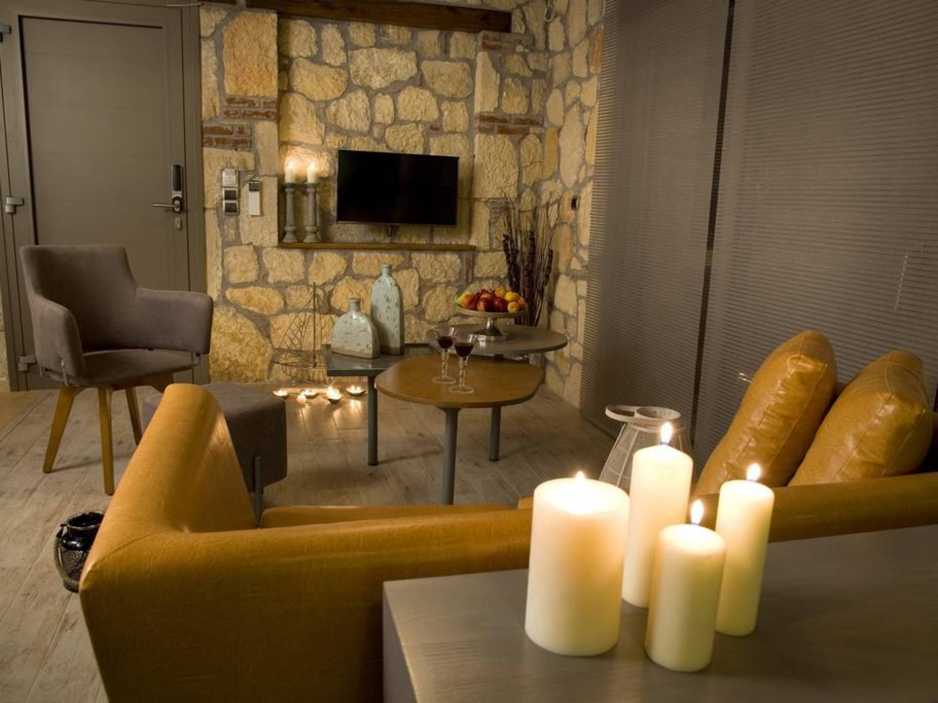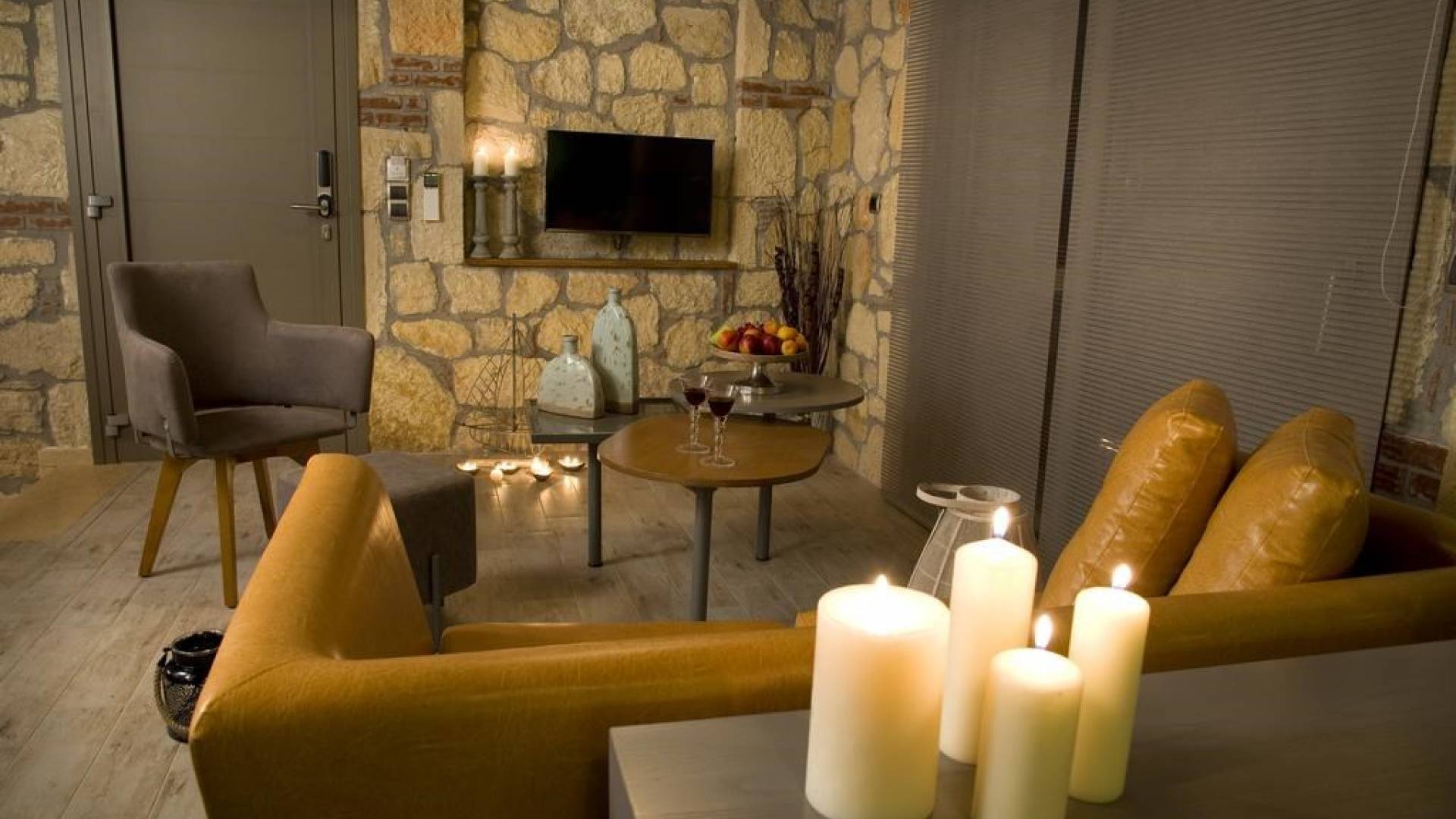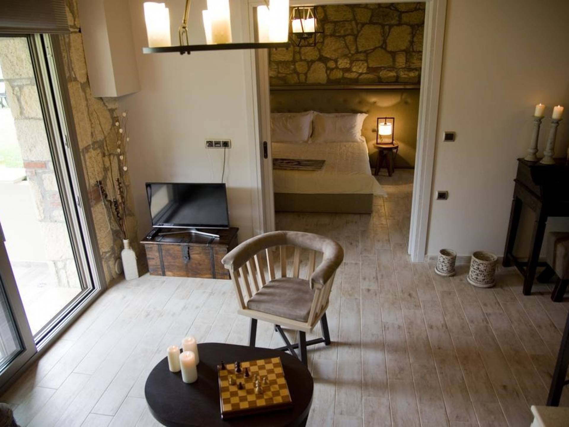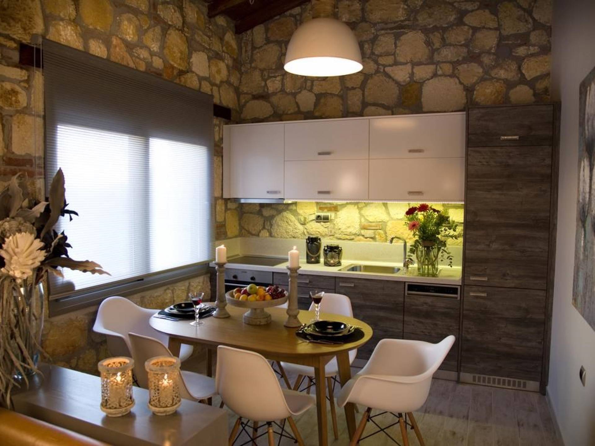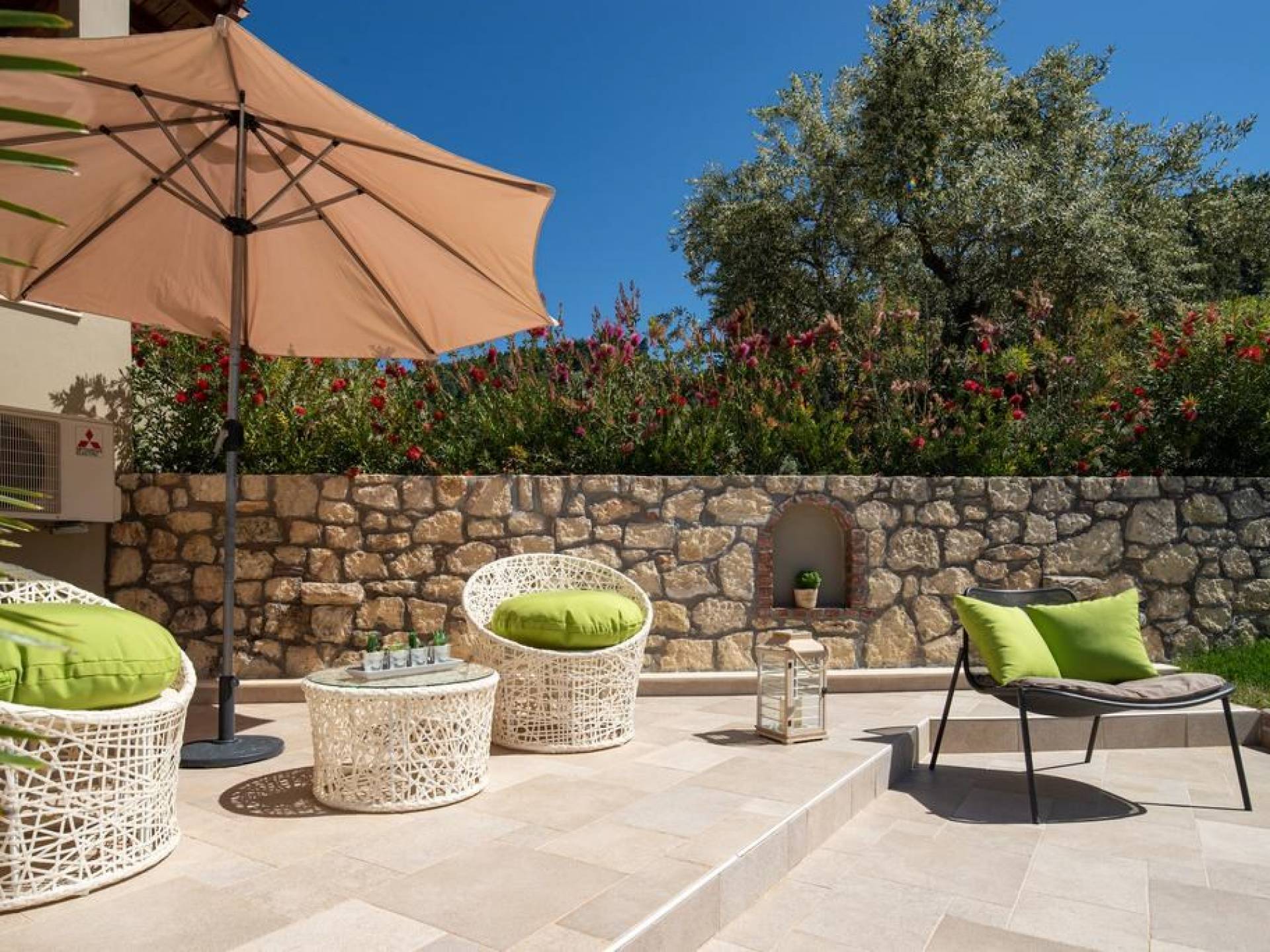Вилла Осфриси построена на разных уровнях. Он характеризуется просторными и солнечными комнатами. Его дизайн представляет собой уникальную архитектурную линию, сочетающую камень с современными элементами. На первом уровне находится гостиная с диваном-кроватью, спальня с ванной комнатой и веранда с выходом в сад. На втором уровне находится лаунж-зона, современная кухня со столовой, спальня, санузел с душевой кабиной и главный вход. На обоих уровнях есть меблированные веранды.