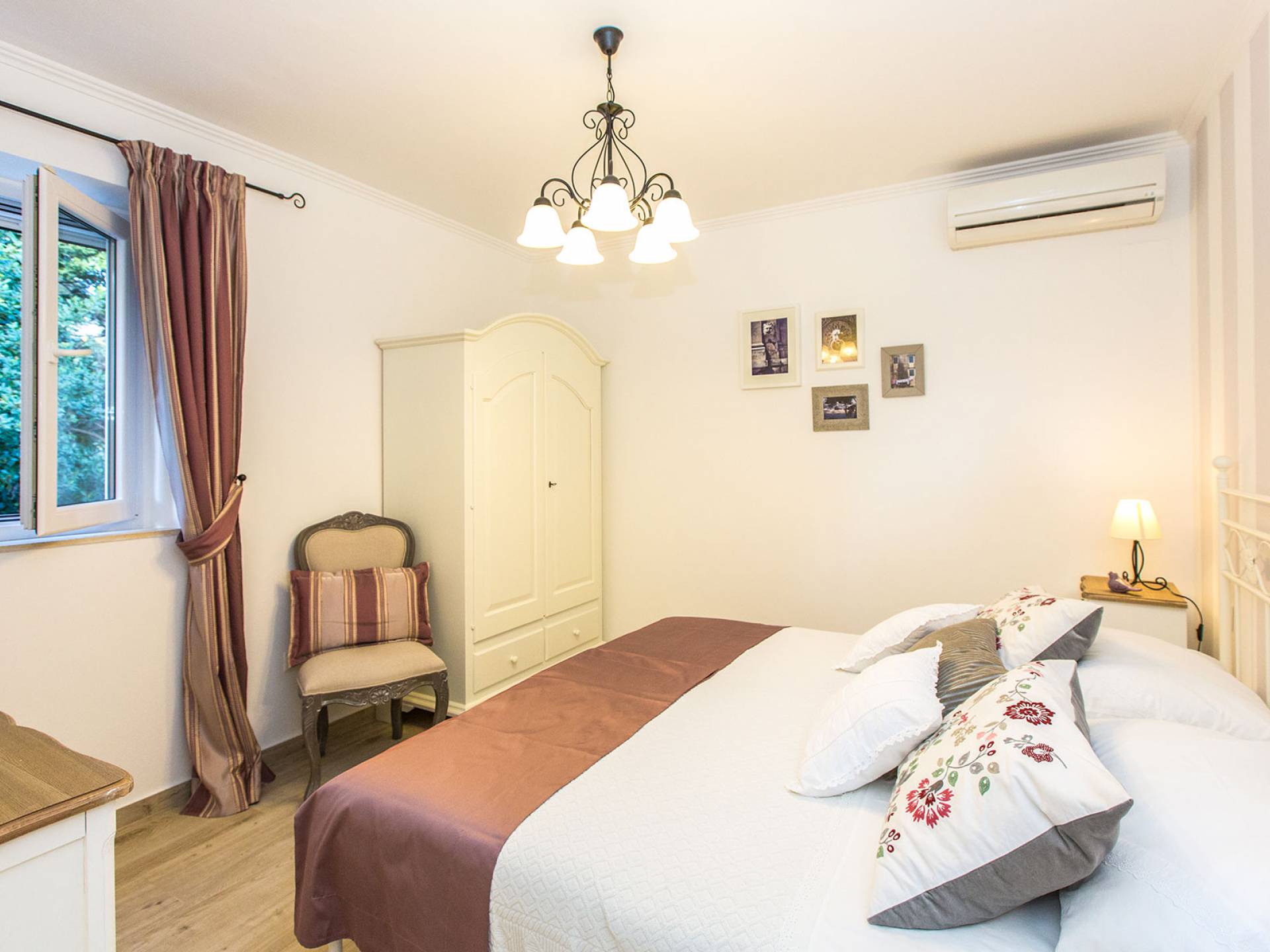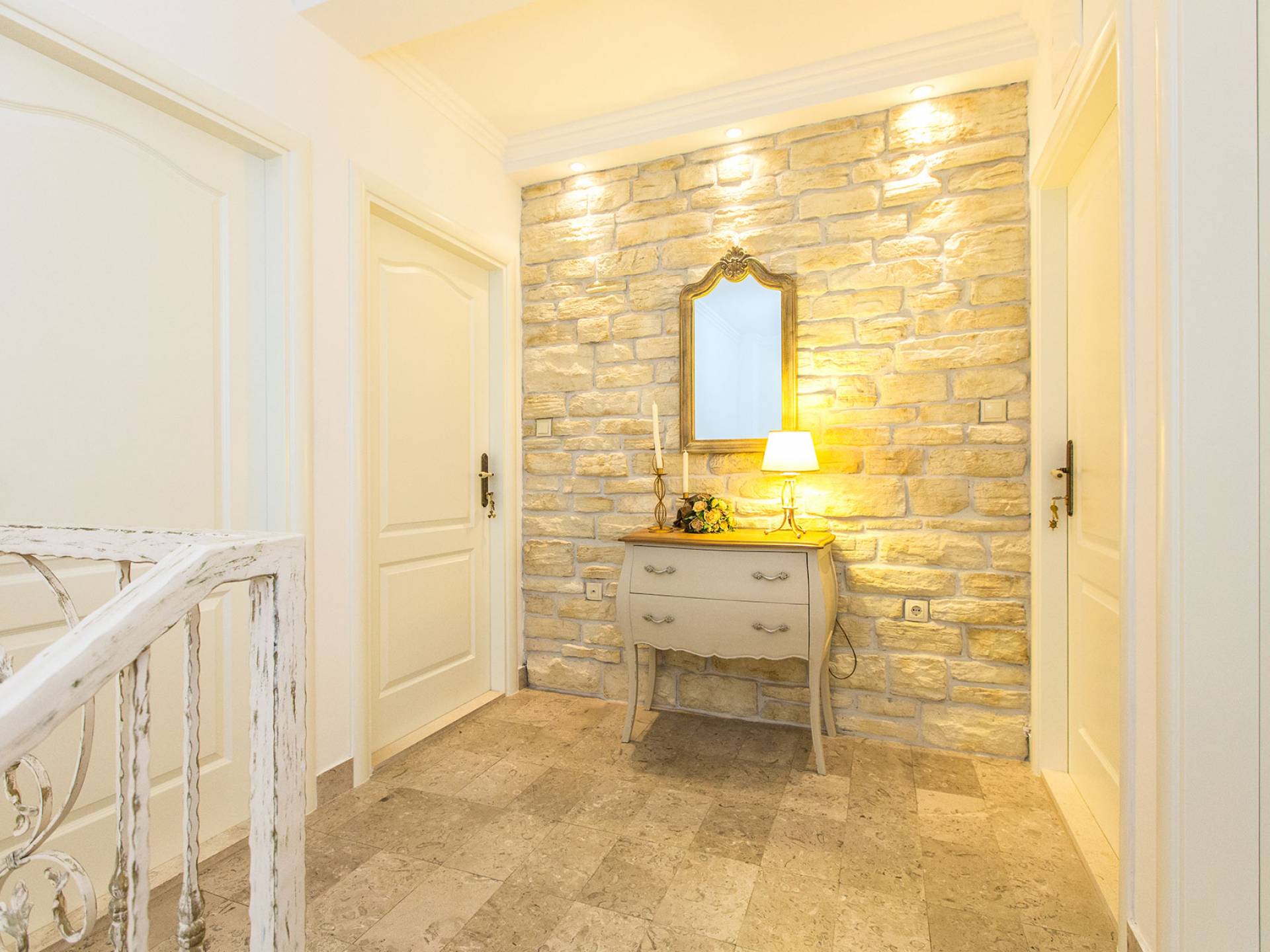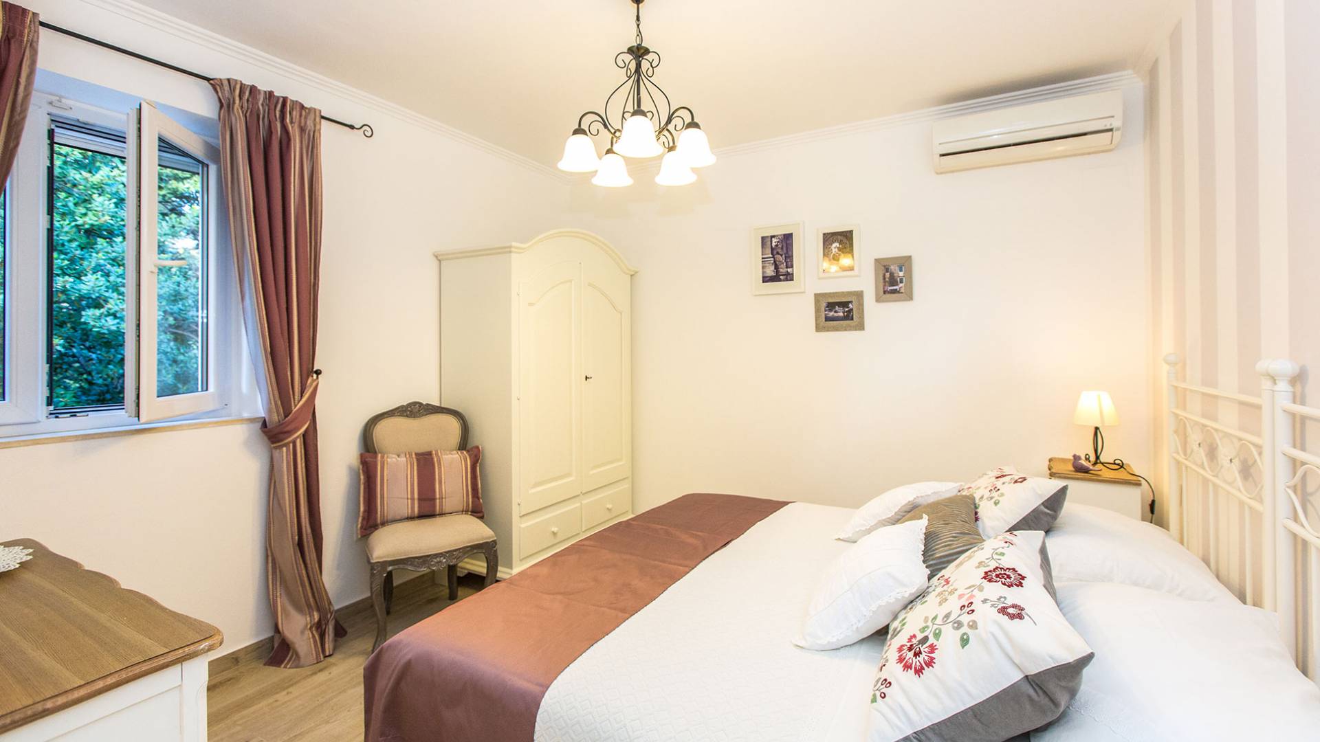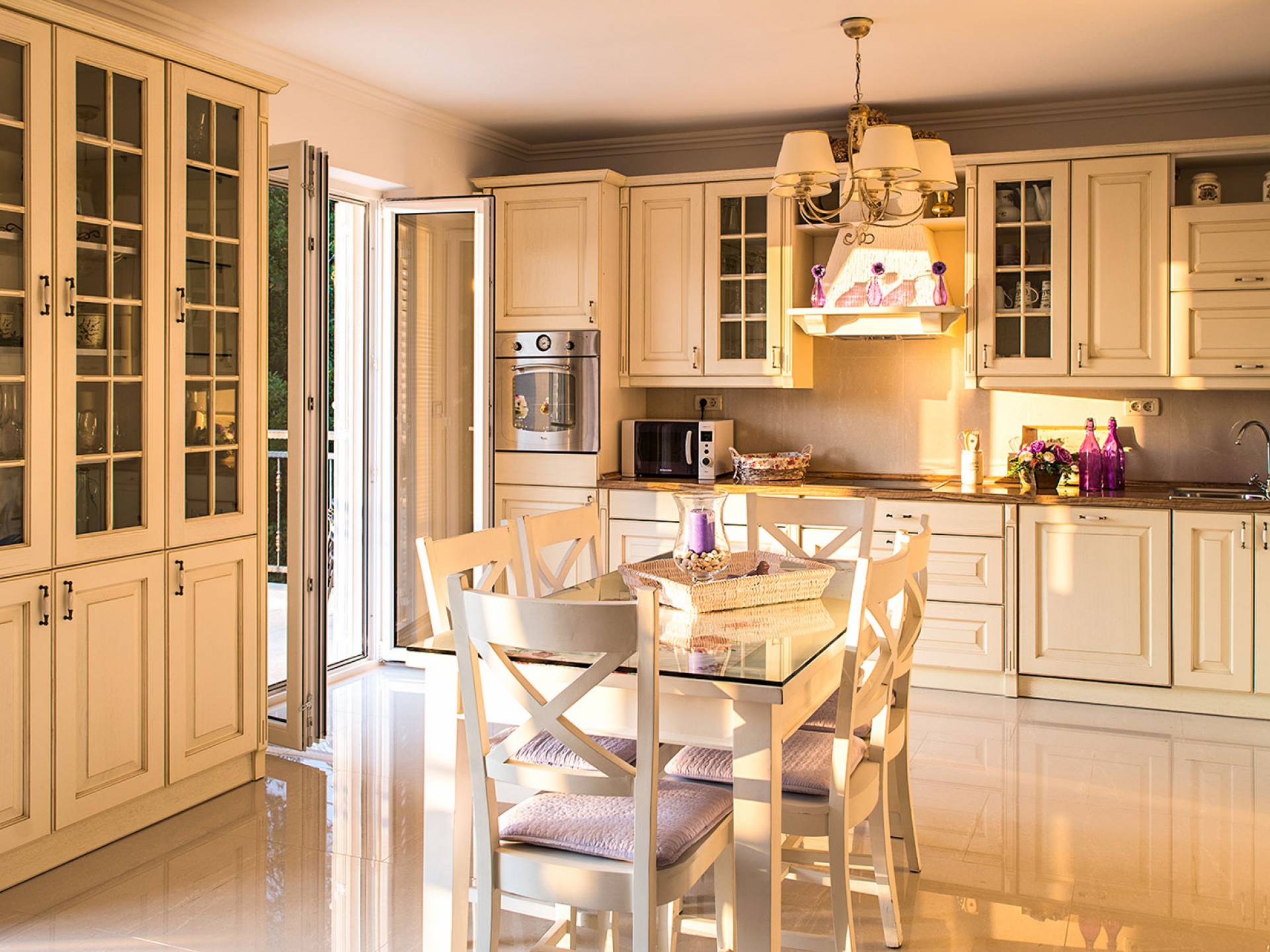 На первом этаже виллы La Perla Cavtat есть залитая солнцем кухня, выходящая на большую панорамную террасу с обеденным столом на открытом воздухе. Кухня оборудована качественной стальной техникой, в том числе четырехконфорочной плитой, духовкой, холодильником с морозильной камерой, посудомоечной машиной, микроволновой печью, а также кофеваркой, чайником и тостером. Также имеется гостиная зона, элегантно оформленная в мягких нейтральных тонах и со вкусом обставленная антикварной мебелью. Современные удобства включают кондиционер, большую плазму со спутниковым приемом, компьютер и бесплатный Wi-Fi на всей территории виллы. Подсобное помещение со стиральной машиной и первая спальня с собственной старинной отдельно стоящей ванной, наконец, расположены на первом этаже.