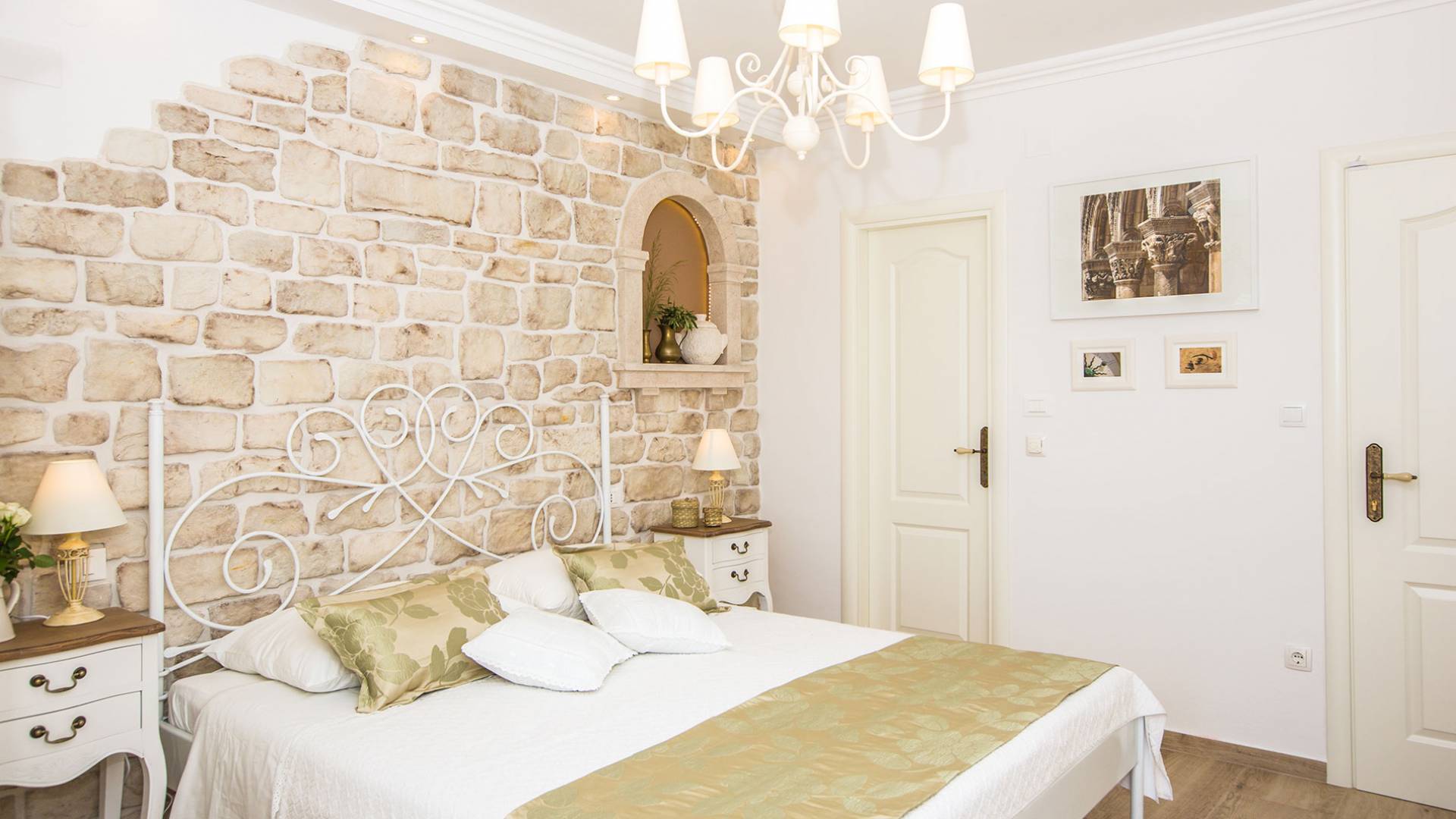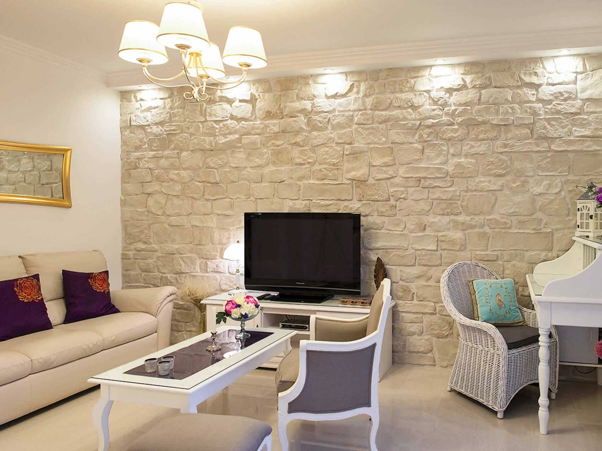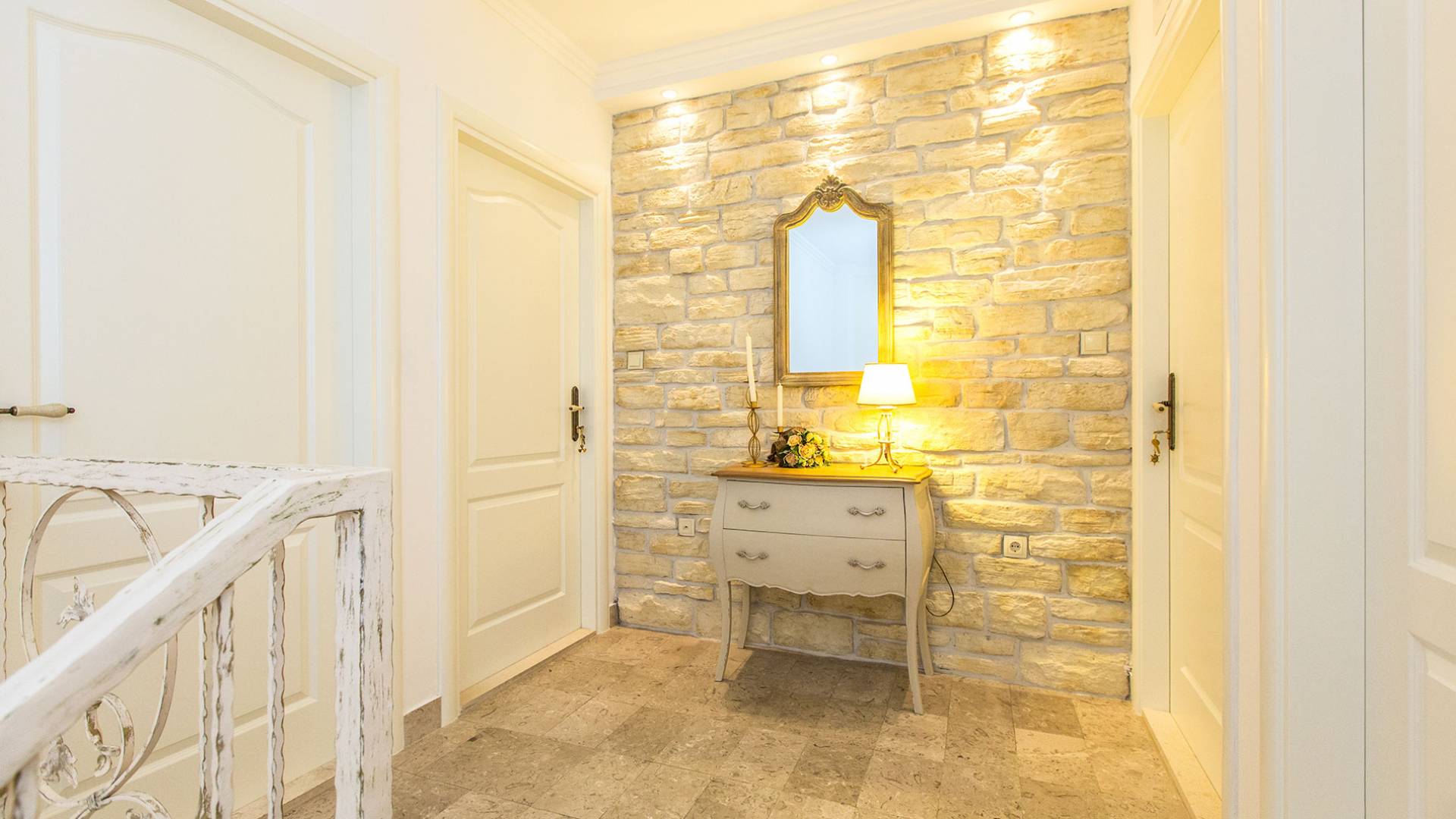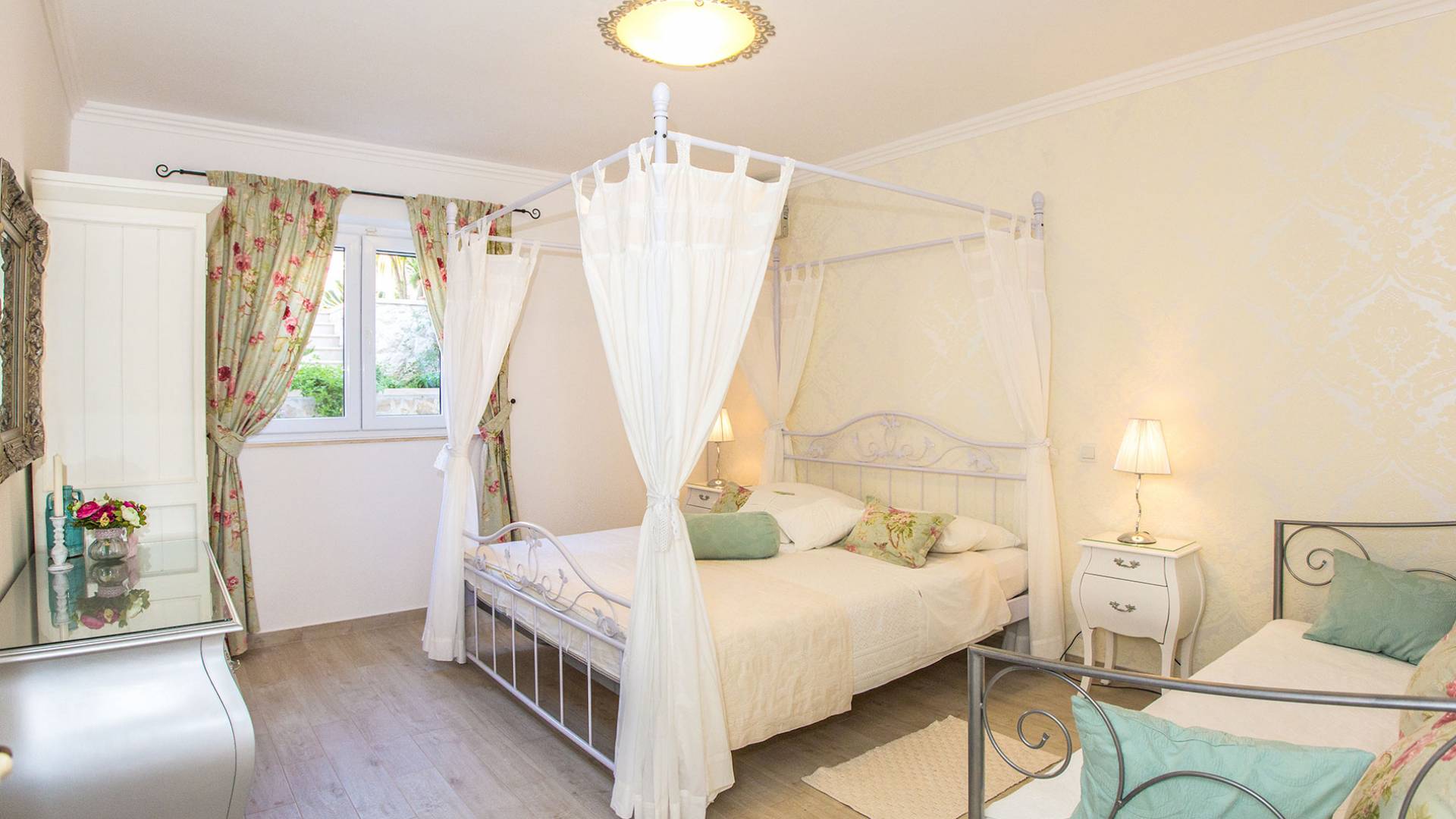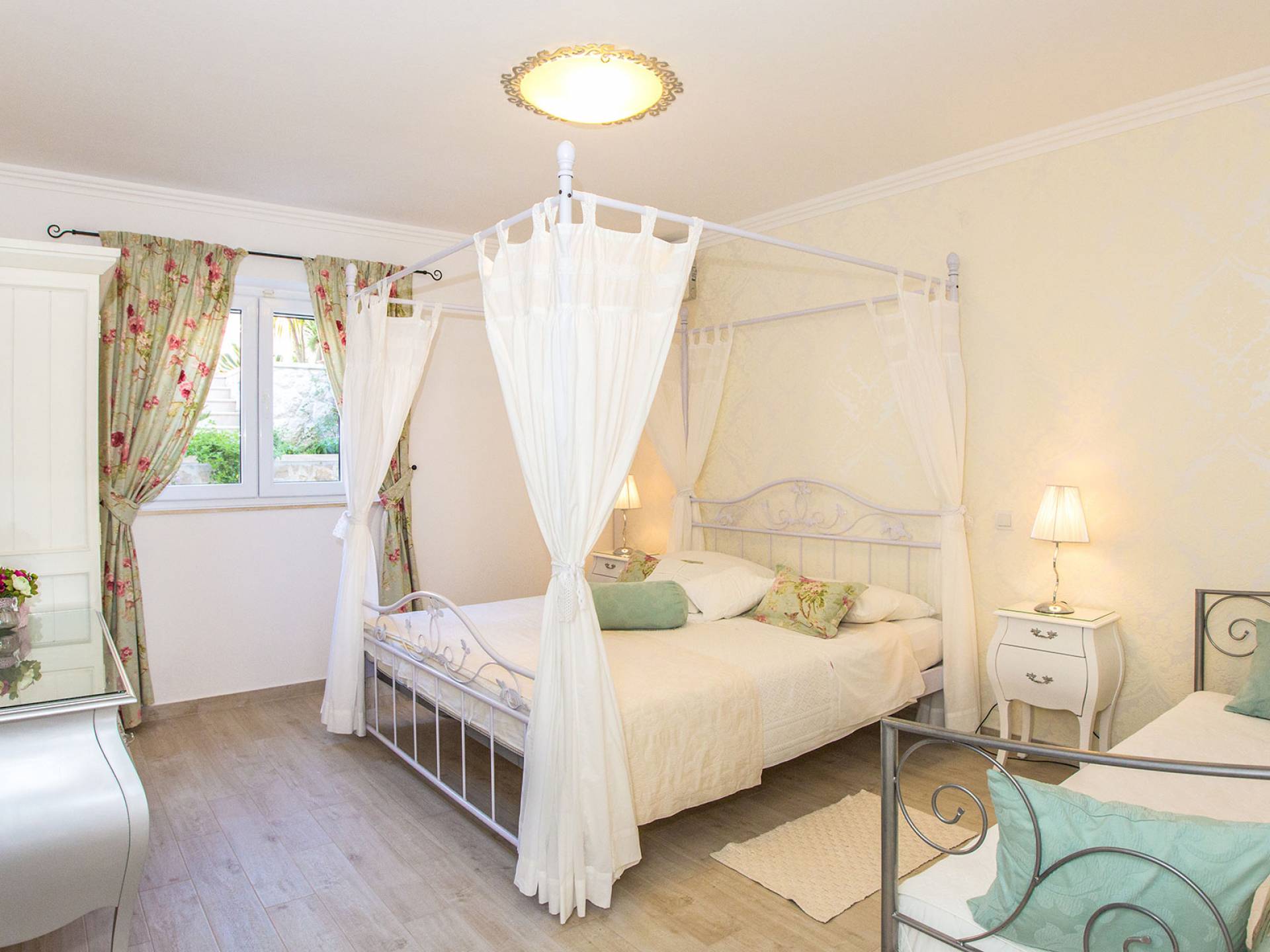 На первом этаже виллы La Perla Cavtat есть залитая солнцем кухня, выходящая на большую панорамную террасу с обеденным столом на открытом воздухе. Кухня оборудована качественной стальной техникой, в том числе четырехконфорочной плитой, духовкой, холодильником с морозильной камерой, посудомоечной машиной, микроволновой печью, а также кофеваркой, чайником и тостером. Также имеется гостиная зона, элегантно оформленная в мягких нейтральных тонах и со вкусом обставленная антикварной мебелью. Современные удобства включают кондиционер, большую плазму со спутниковым приемом, компьютер и бесплатный Wi-Fi на всей территории виллы. Подсобное помещение со стиральной машиной и первая спальня с собственной старинной отдельно стоящей ванной, наконец, расположены на первом этаже.