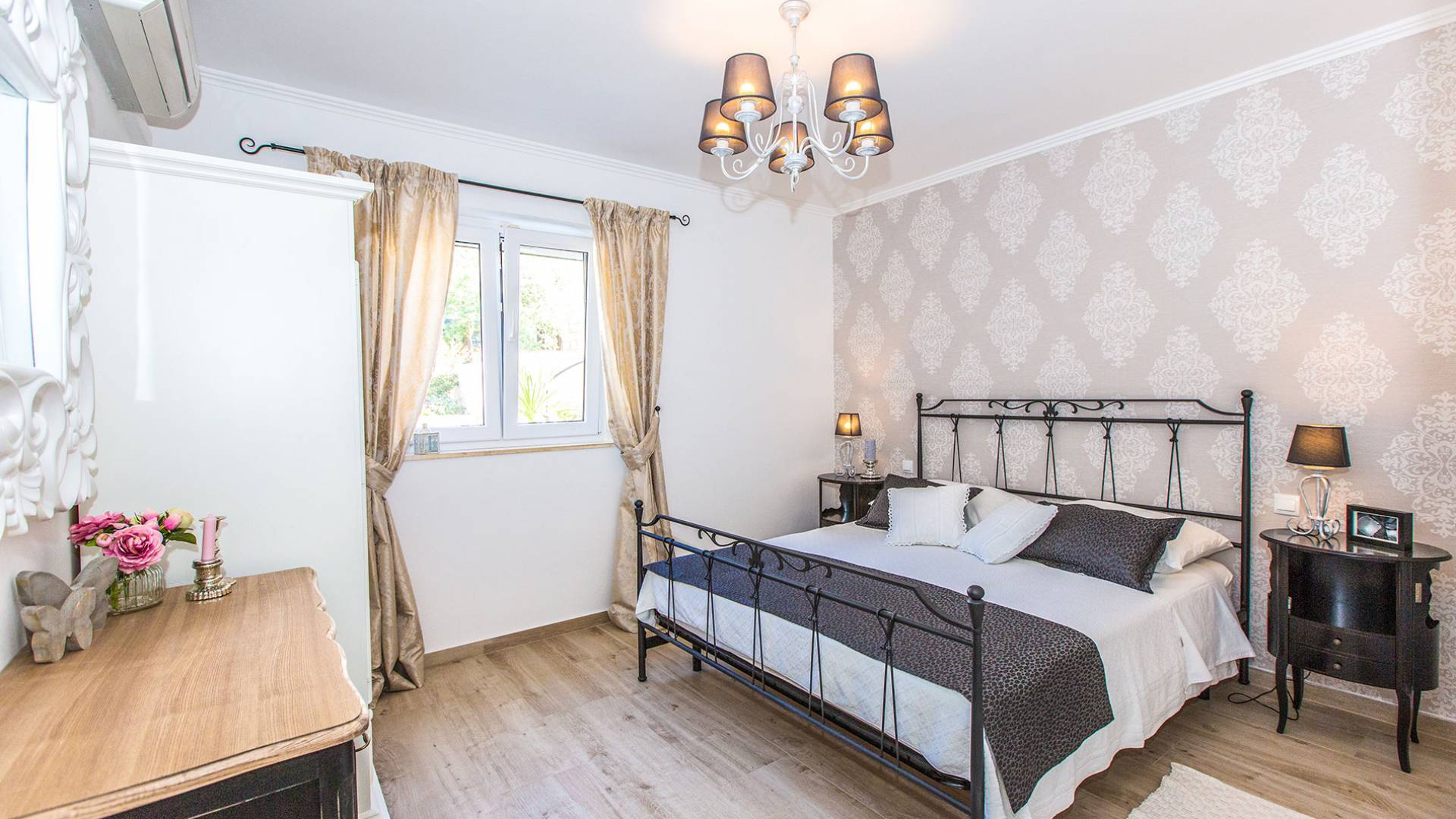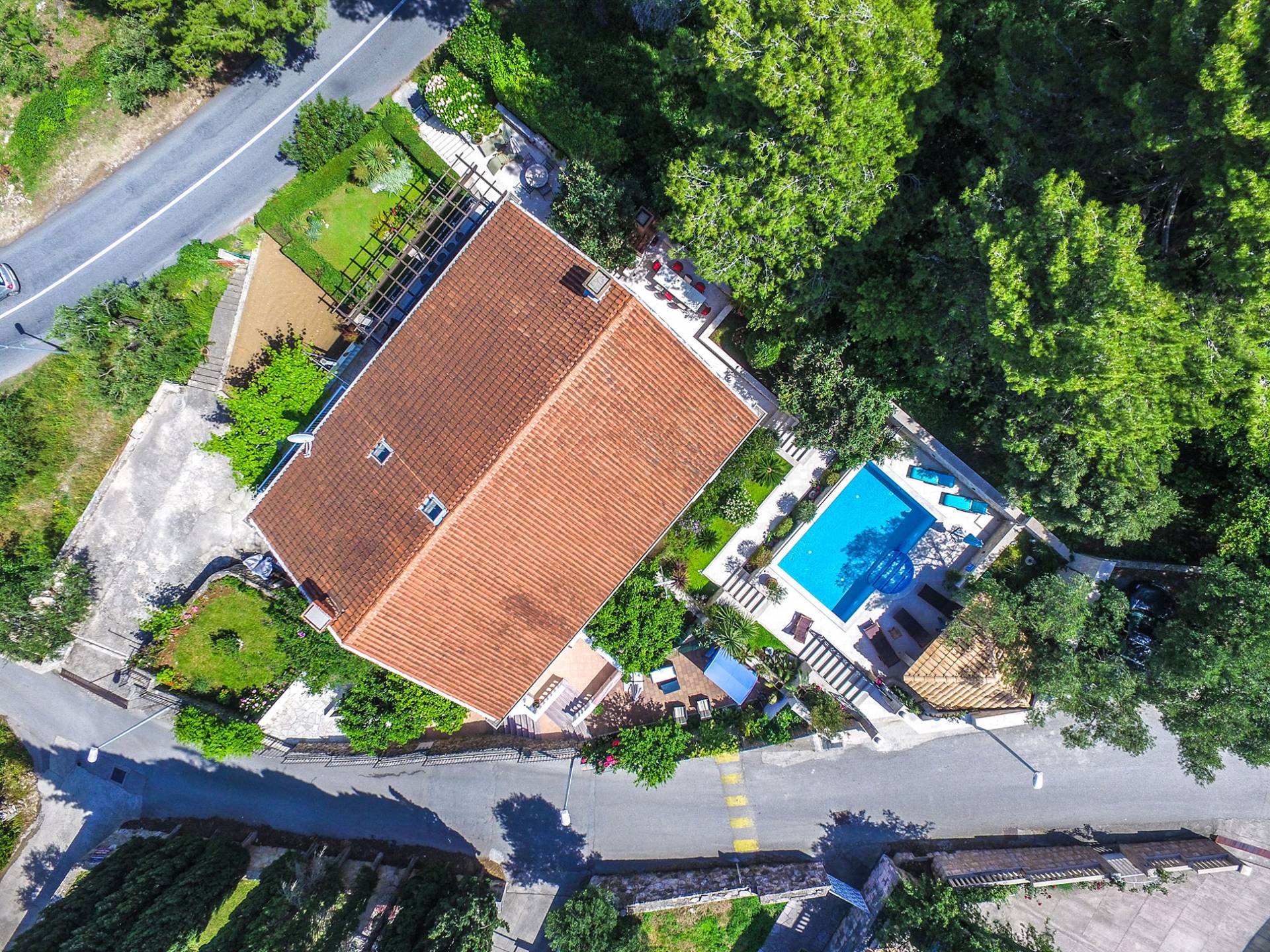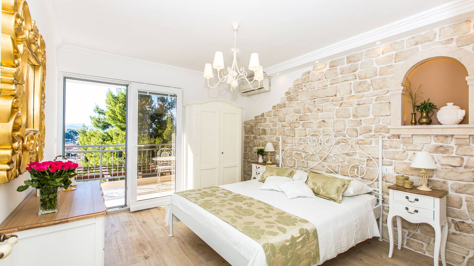 На верхнем уровне находятся остальные четыре спальни, все с душевыми кабинами. Два из них имеют балконы с видом на море и два с видом на сад. В спальнях также есть шкаф, кондиционер и вентиляция. Снаружи бассейн окружен шезлонгами и зонтиками, а на крытой террасе есть широкий обеденный стол на свежем воздухе, камин и гриль для барбекю.
