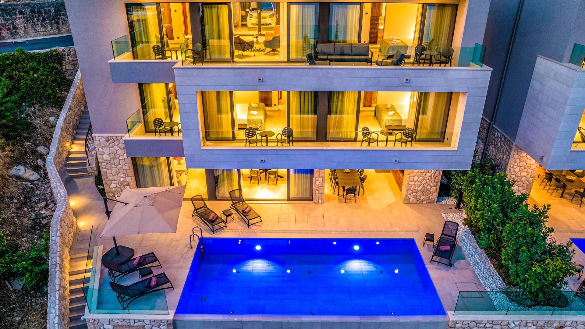 Вилла Альба - это современная трехэтажная вилла с 5 спальнями с ванными комнатами - идеально подходит для группы из 10 человек. Пройдя через главные двери на первом этаже, вы попадете в две спальни с двуспальными кроватями. Во всех спальнях с кондиционером есть хорошее постельное белье, роскошные ванные комнаты и множество пушистых полотенец, которыми можно побаловать себя после дня, проведенного в море или у бассейна. Из номеров открывается потрясающий вид прямо на море или окружающий зеленый пейзаж.