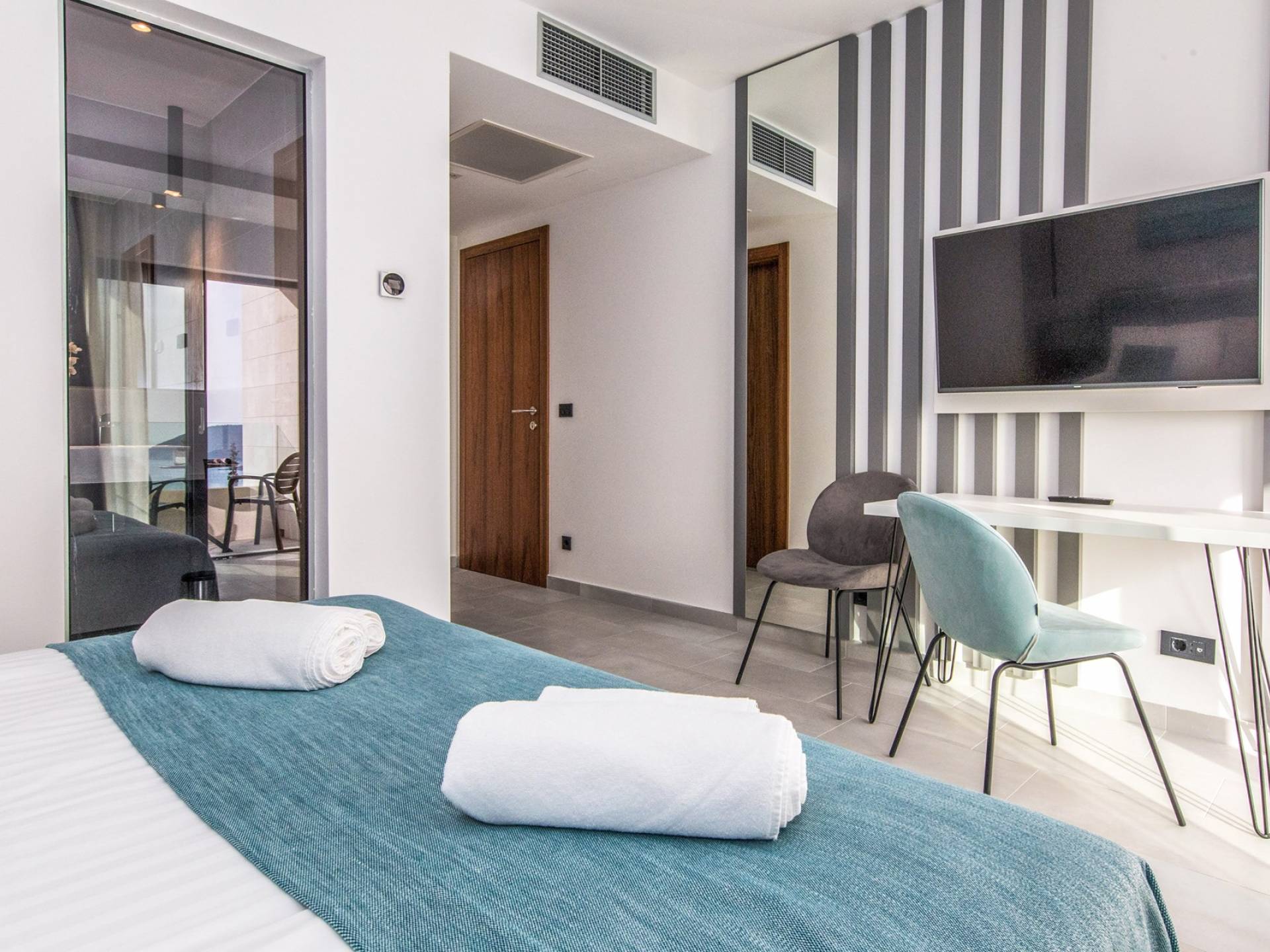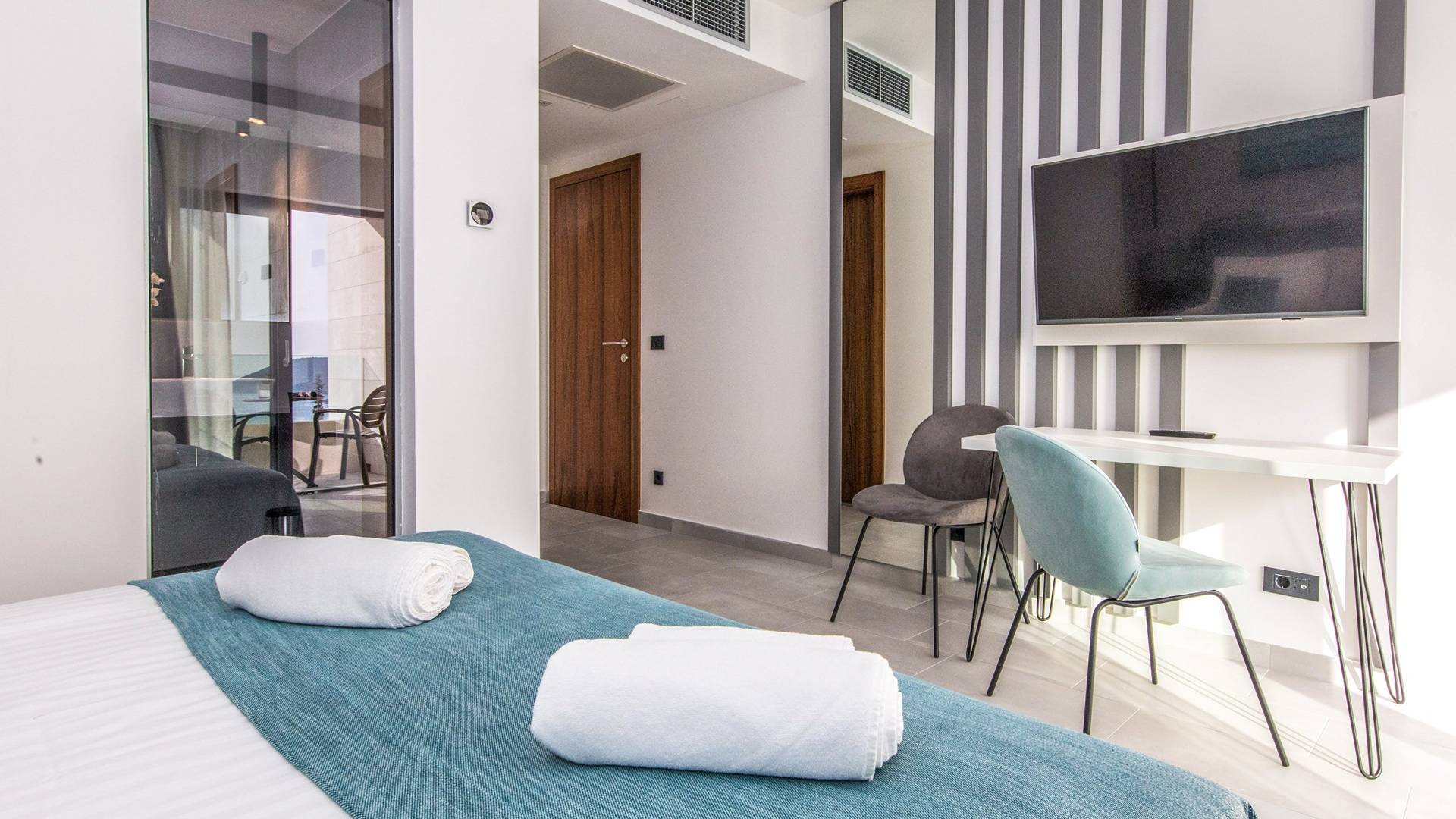 Внутренняя лестница ведет на нижний уровень, где вы найдете еще три спальни с ванными комнатами, все с видом на море, и одна спальня с двумя односпальными кроватями. На нижнем этаже находится центральная гостиная с большим удобным диваном, обеденная зона, современная и полностью оборудованная кухня со всей бытовой техникой. На этом же уровне есть ванная комната для гостей. Гостиная ведет на просторную террасу с гостиной и обеденной зоной, что делает обед на свежем воздухе неизбежным.