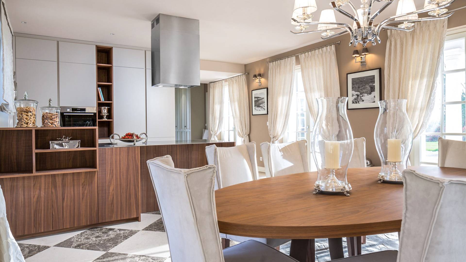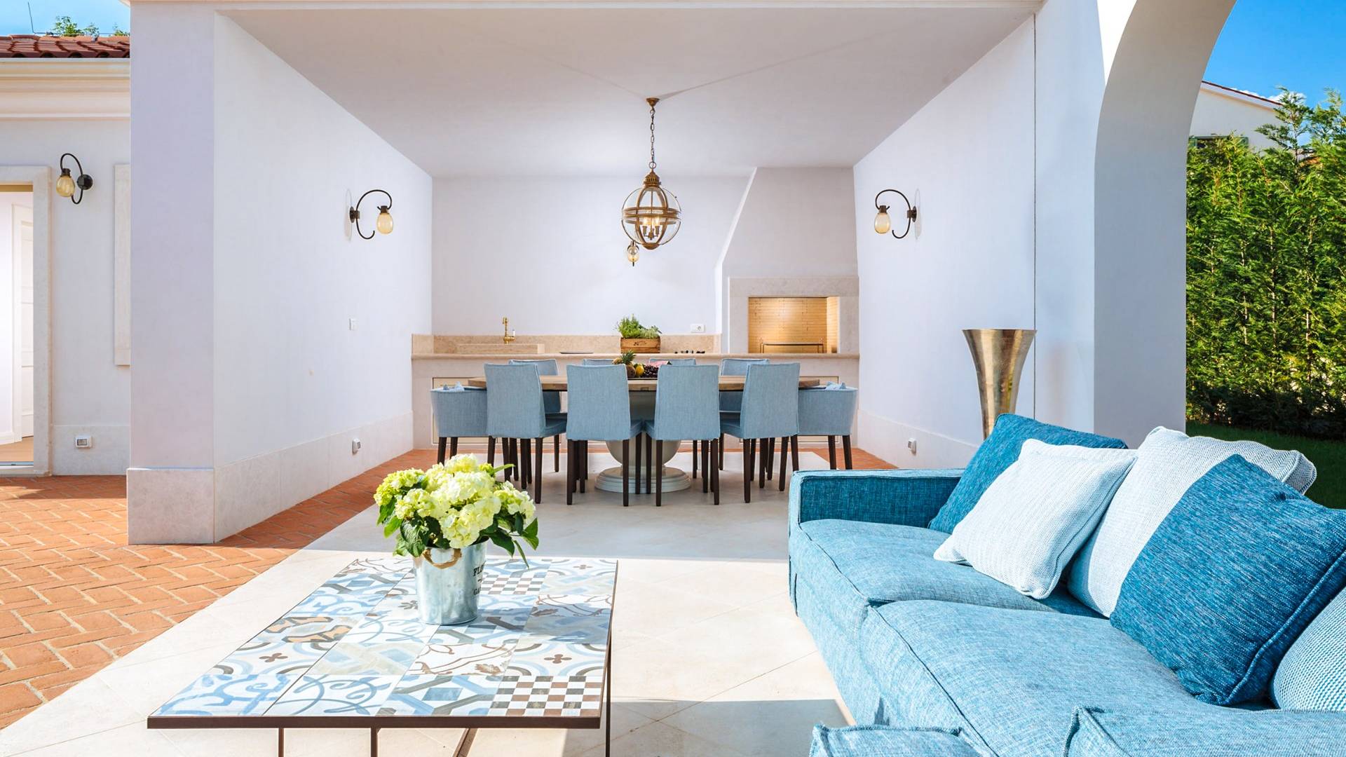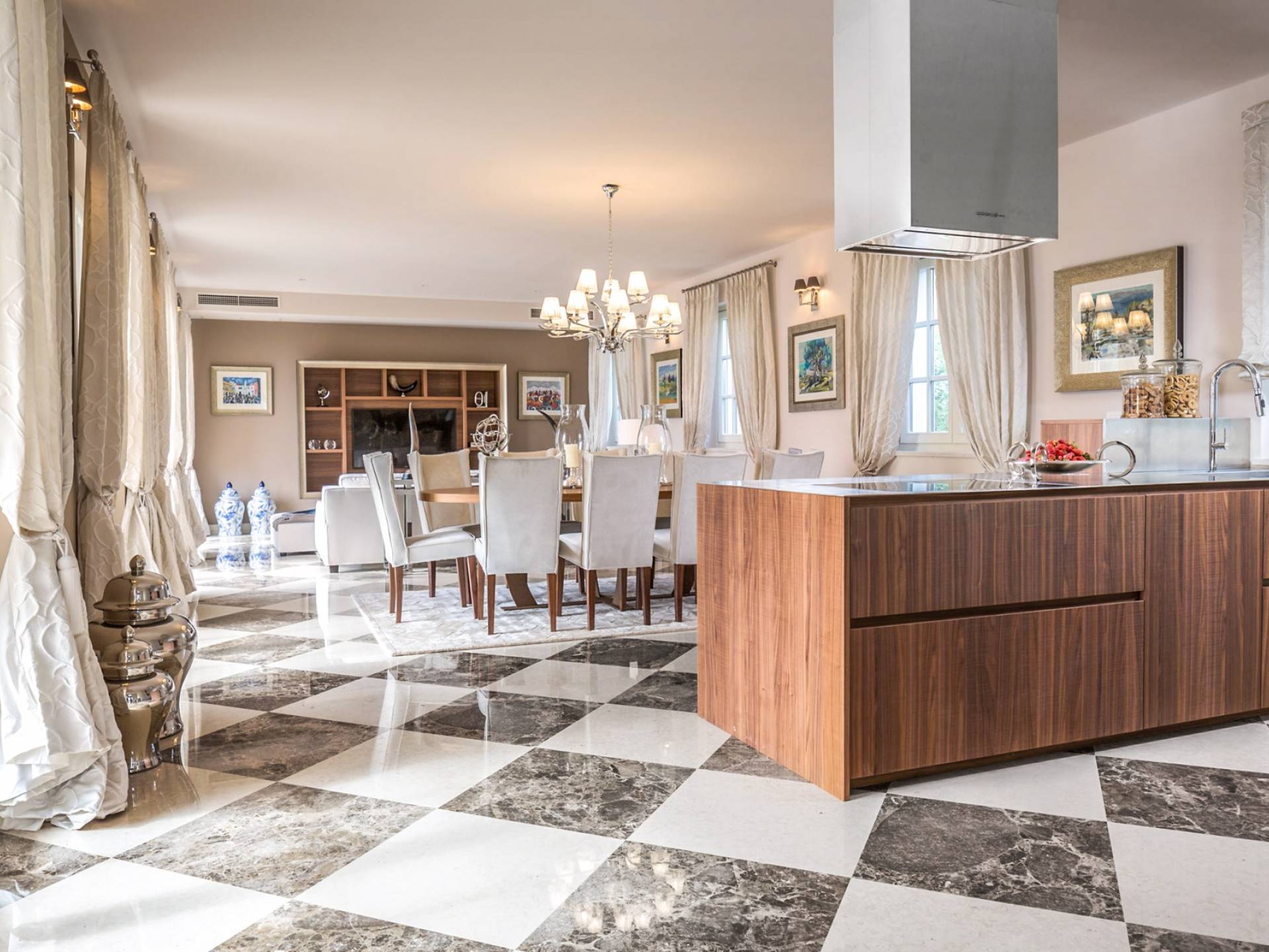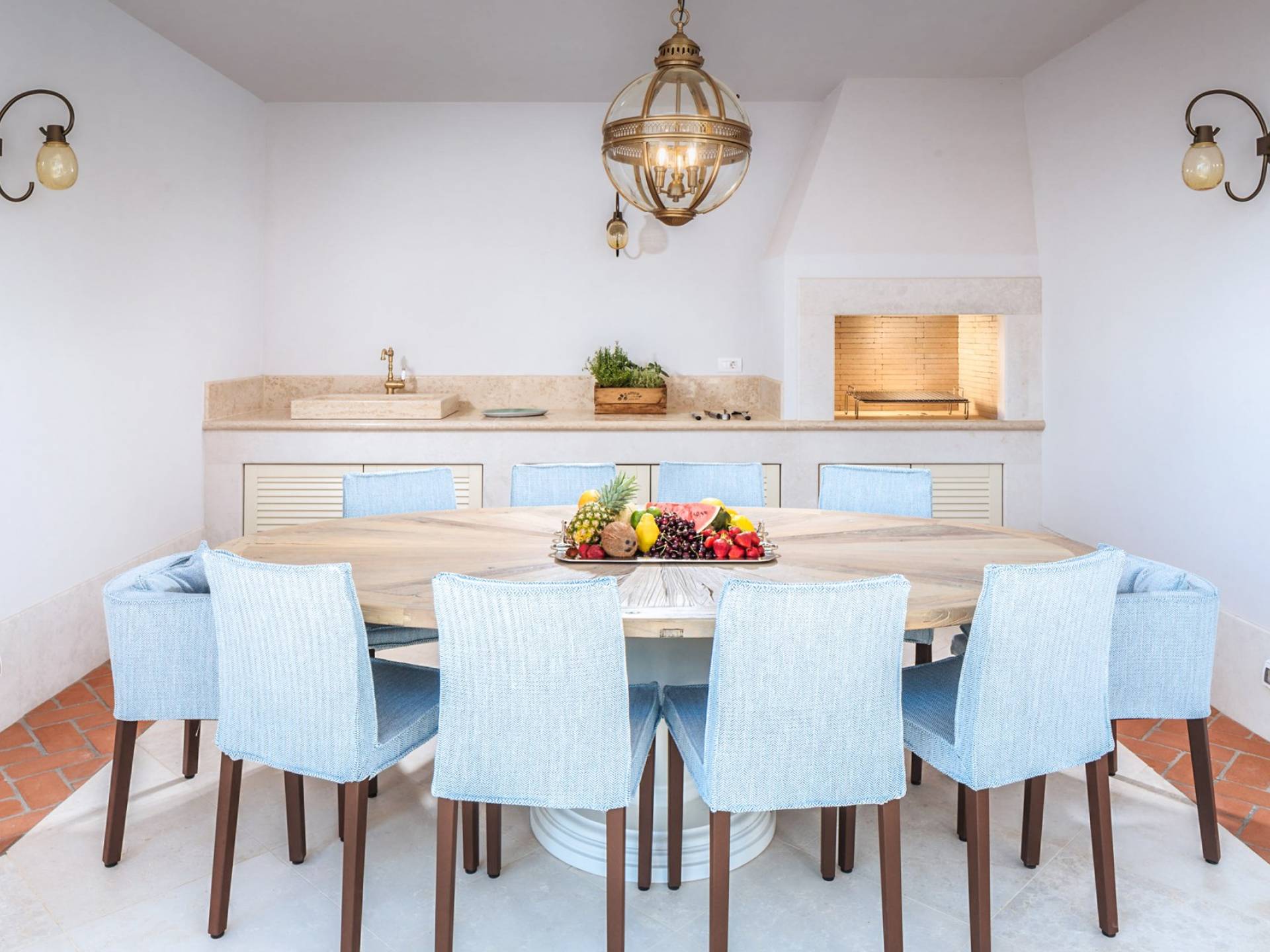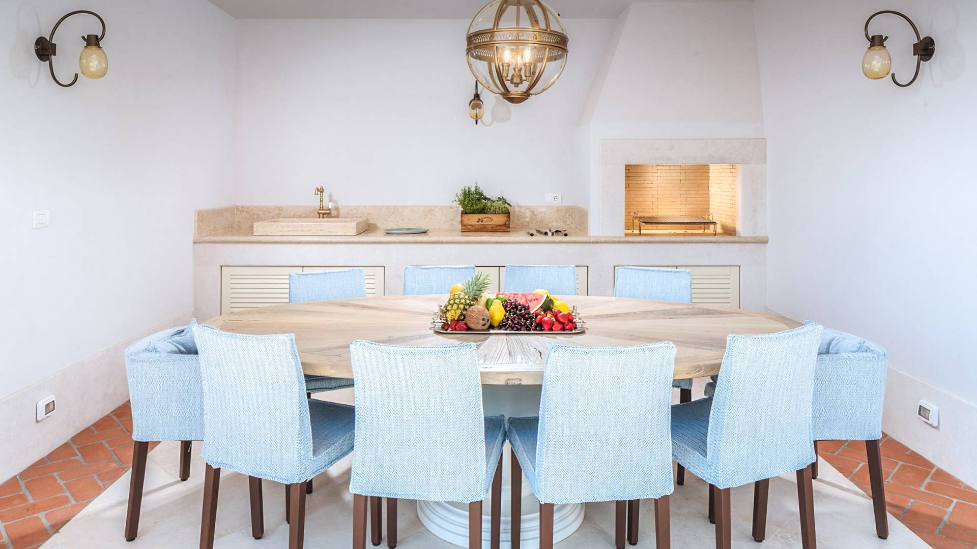 На первом этаже расположена уютная гостиная с оборудованной кухней, большим обеденным столом и зоной отдыха, украшенной произведениями искусства известных хорватских художников, а также спутниковым телевидением, беспроводным доступом в Интернет и кондиционированием воздуха во всех помещениях. это вид и выход к бассейну и саду, а сбоку есть крытая летняя кухня и площадка для барбекю со столом и стульями