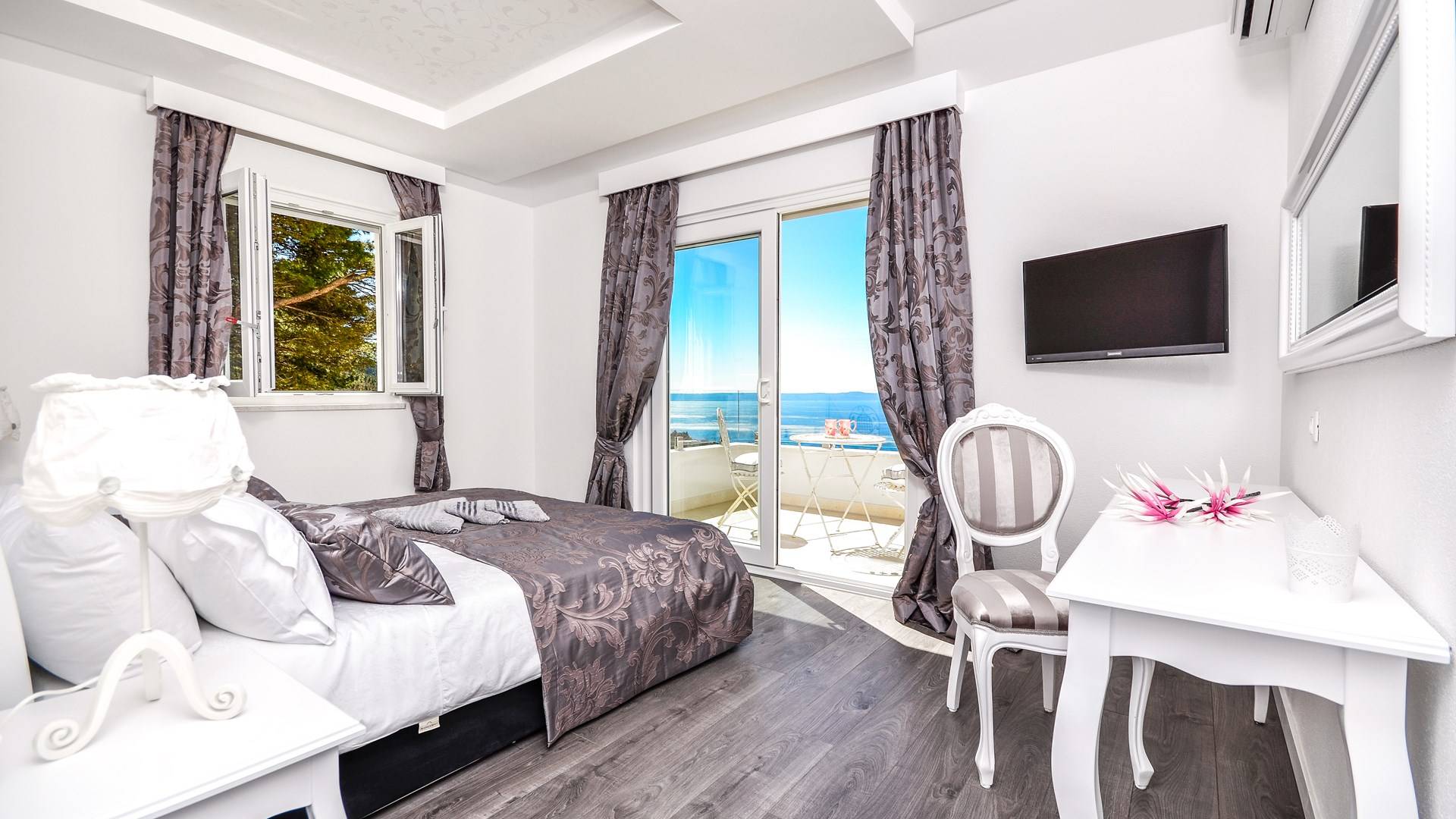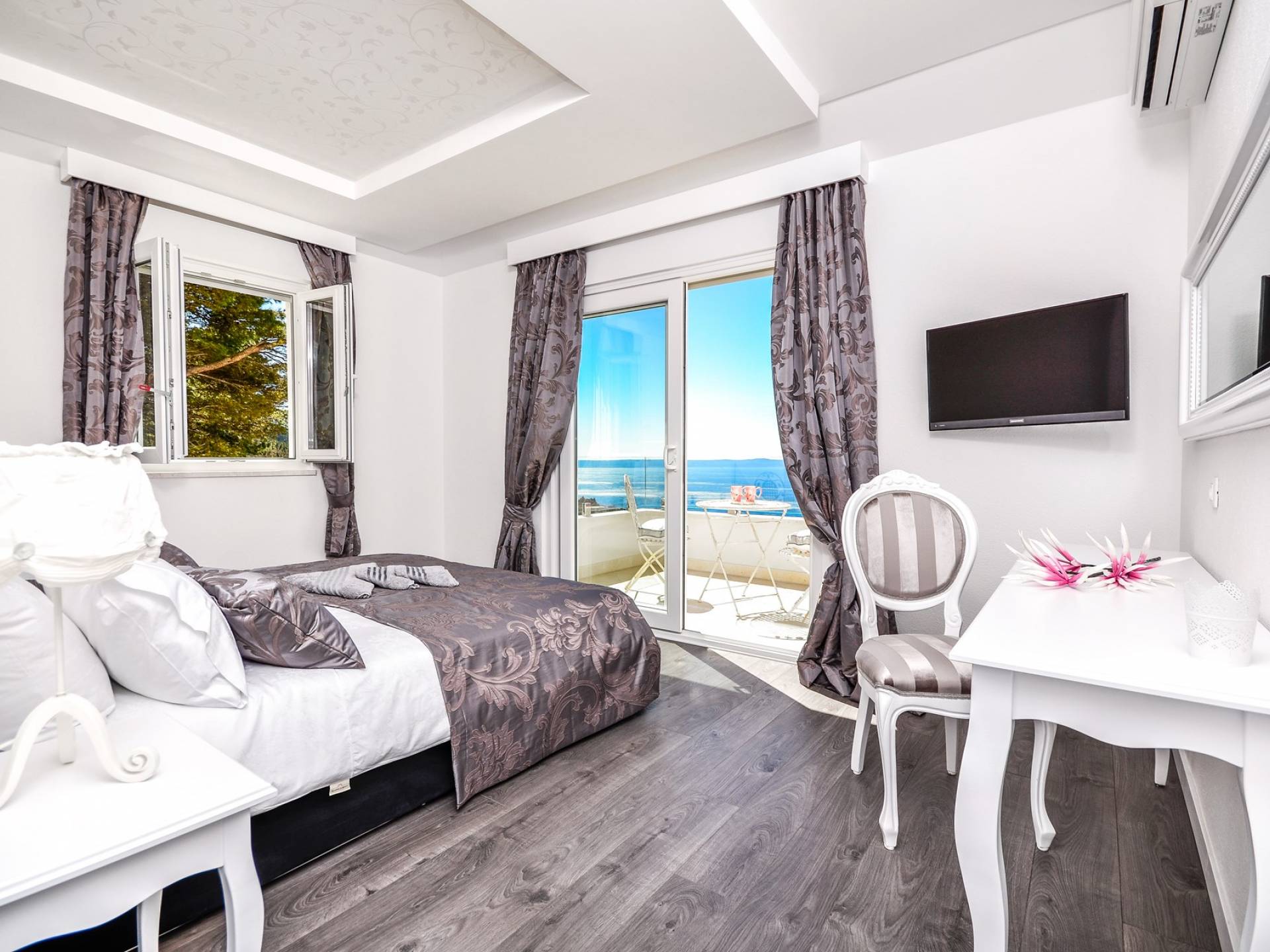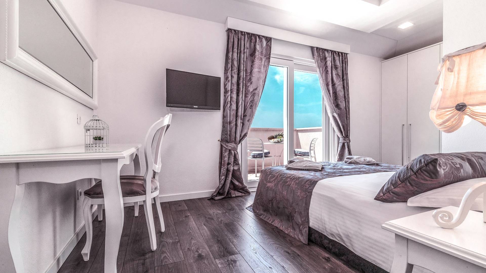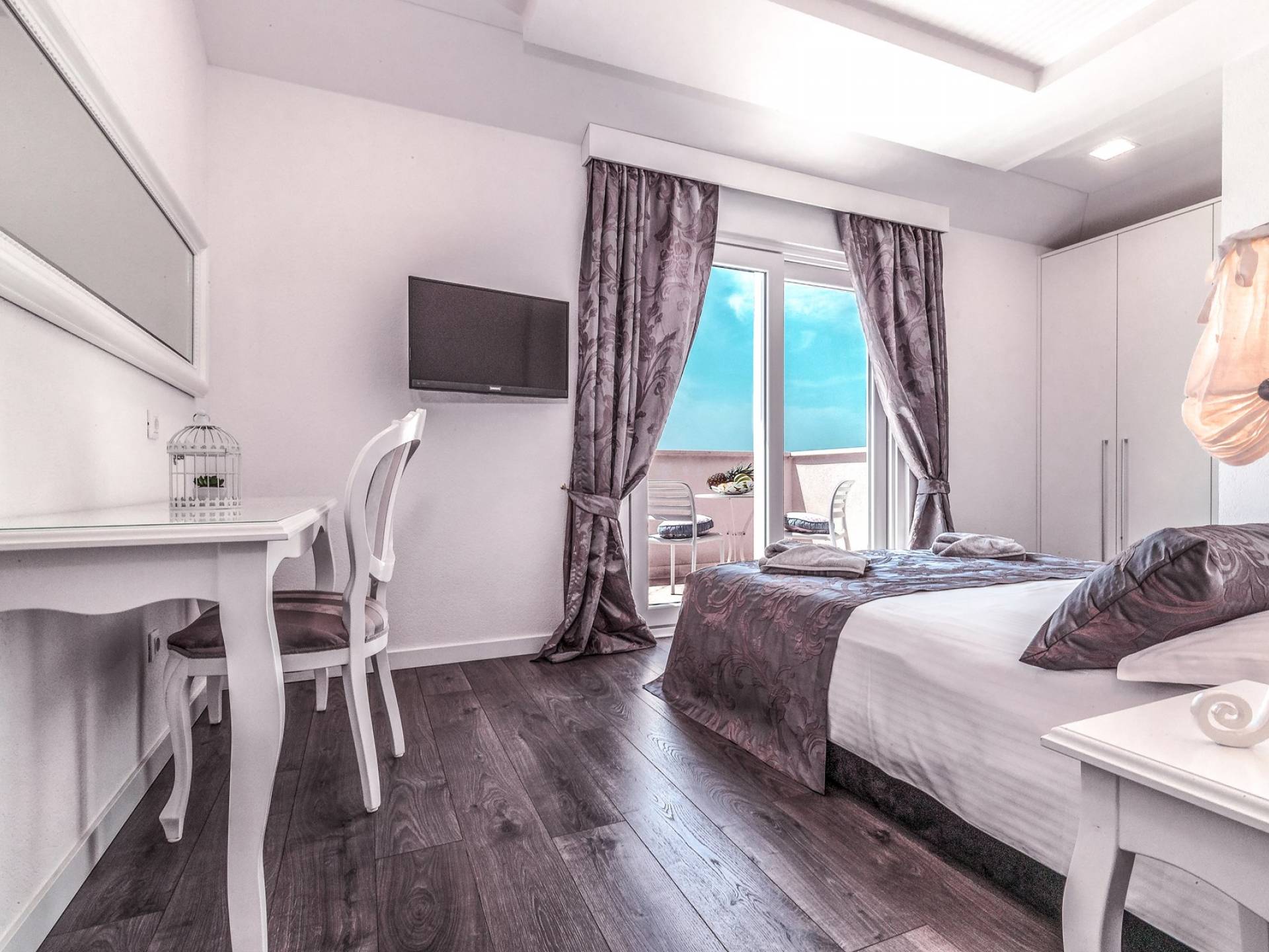 Номер 1: ориентирован на юг, с одной двуспальной кроватью (180 × 200), ванной комнатой с гидромассажной ванной, балконом с видом на море.
