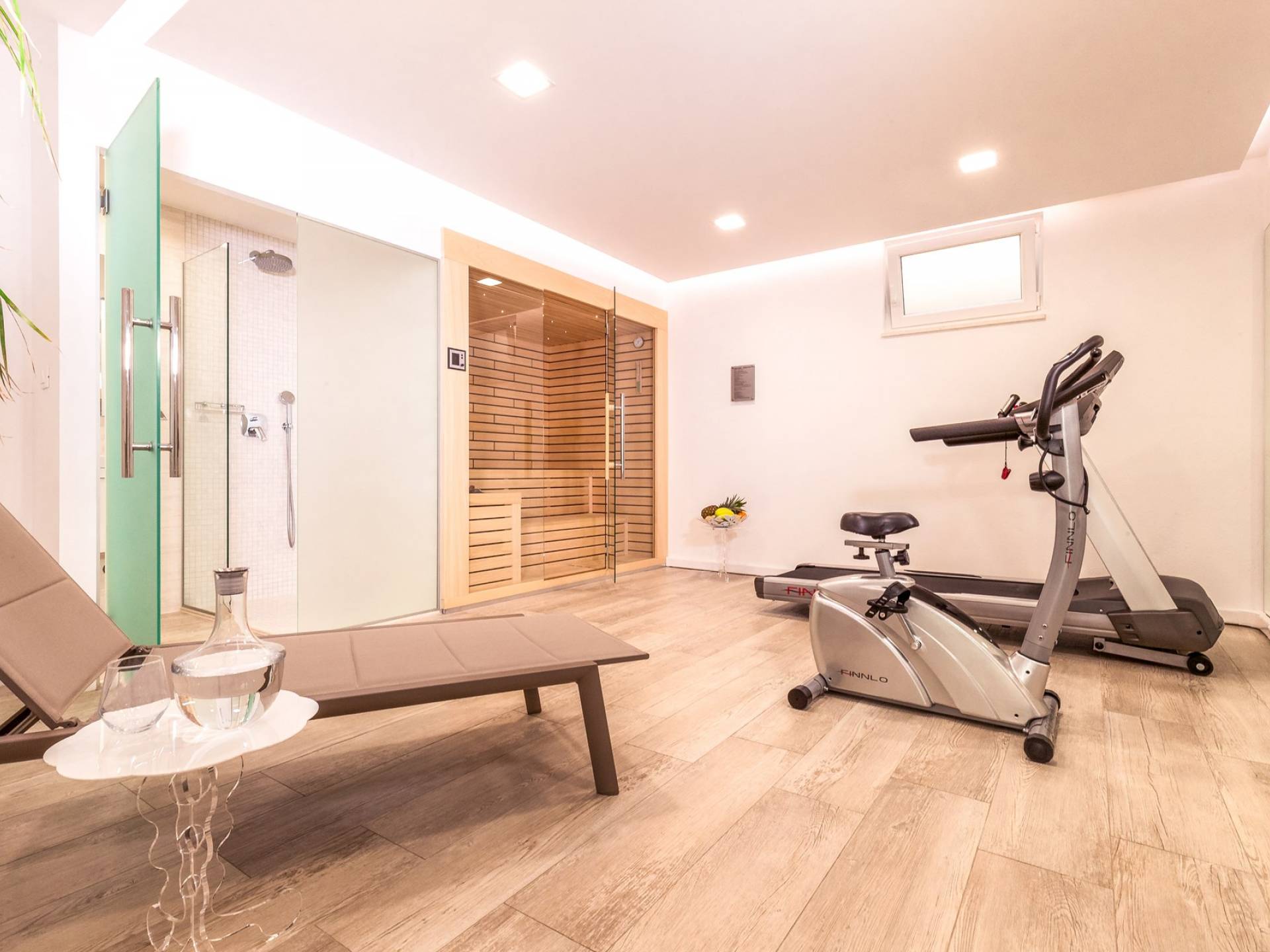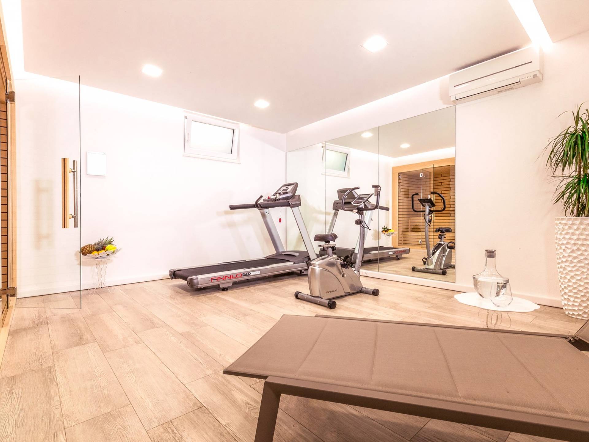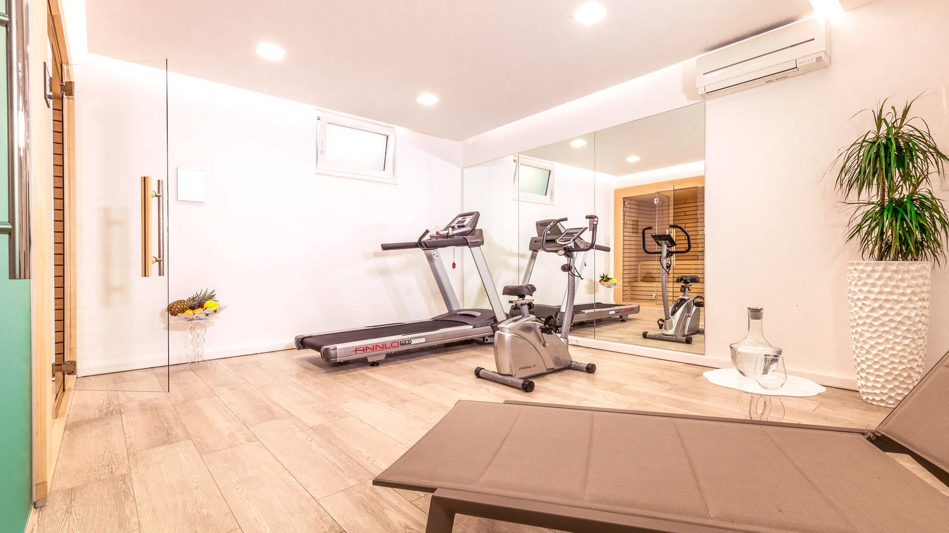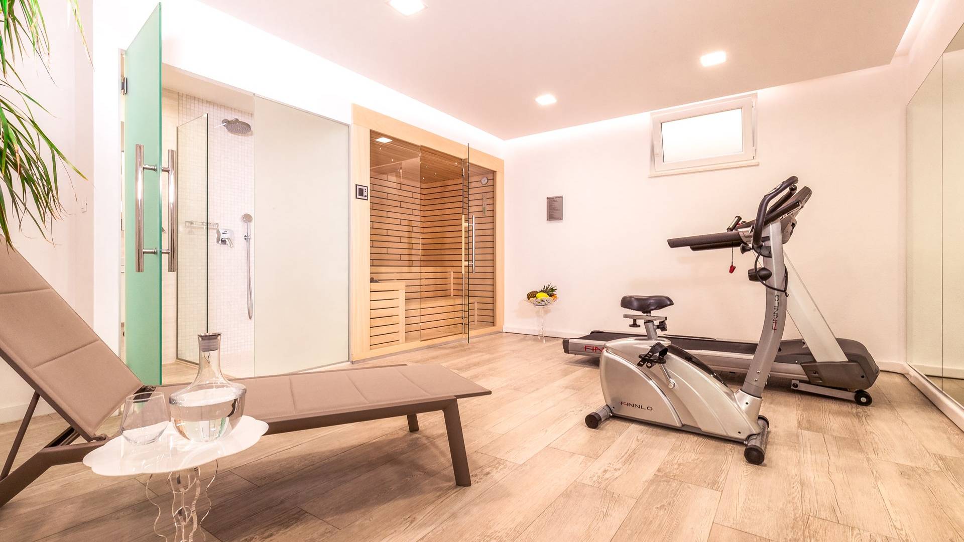 Здесь же находится тренажерный зал с сауной и санузлом. Площадь бассейна 24м2, окружена большой террасой с 10 шезлонгами и видом на море. Бассейн оборудован современной системой очистки воды, системами водного и воздушного массажа, а также светодиодной светотерапией.