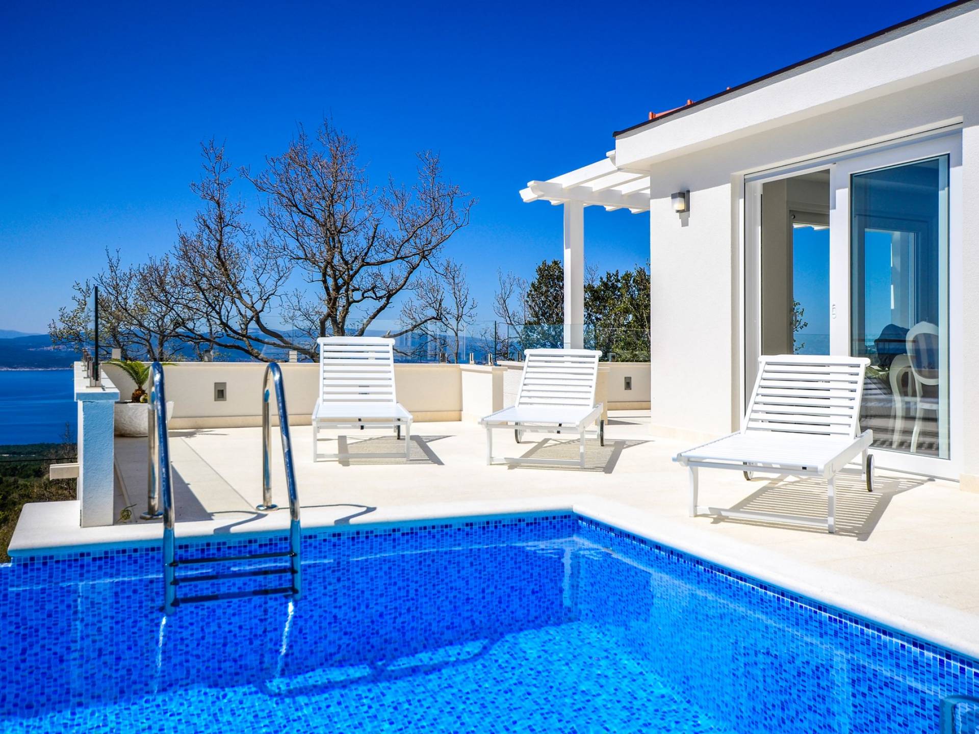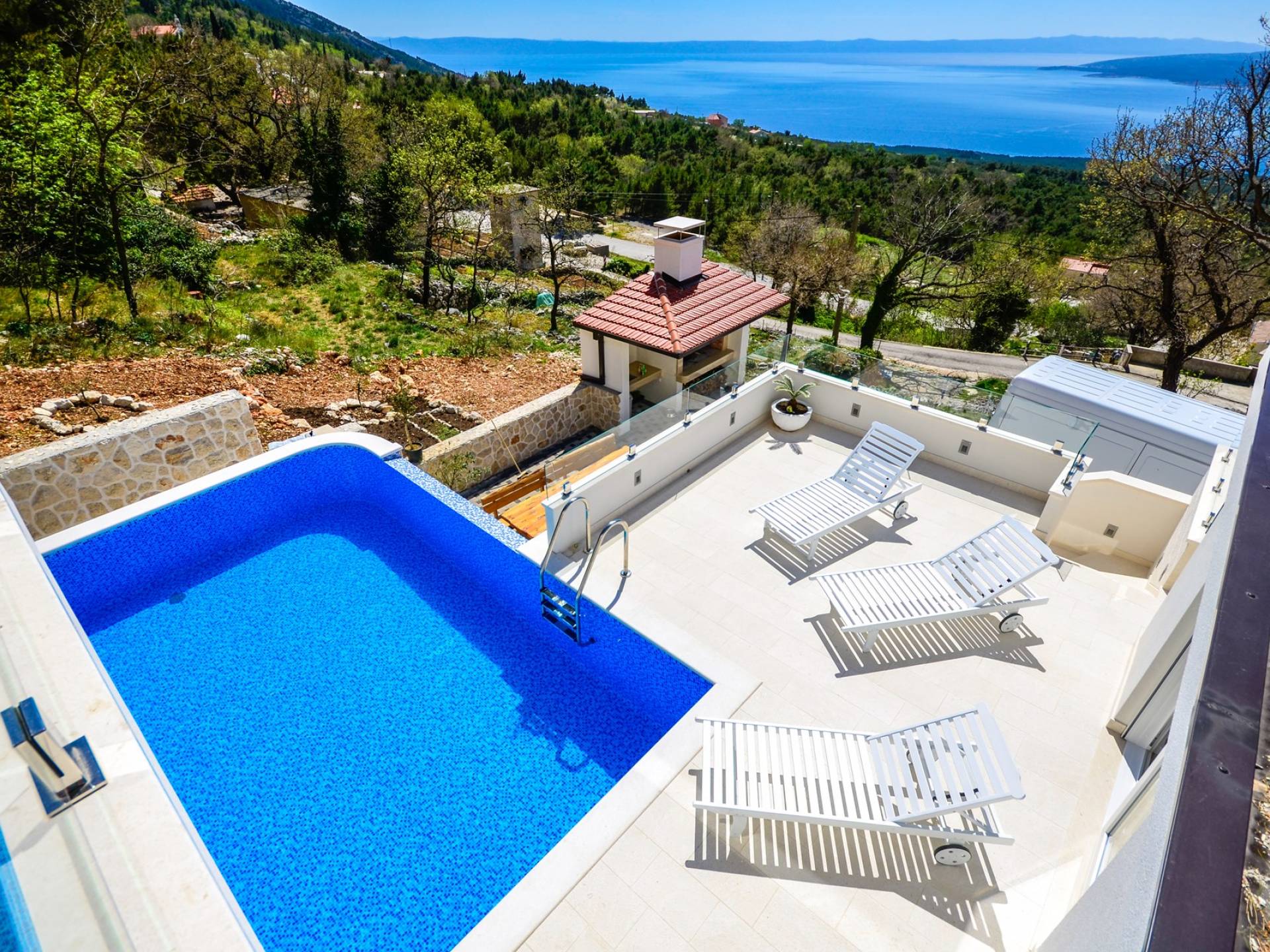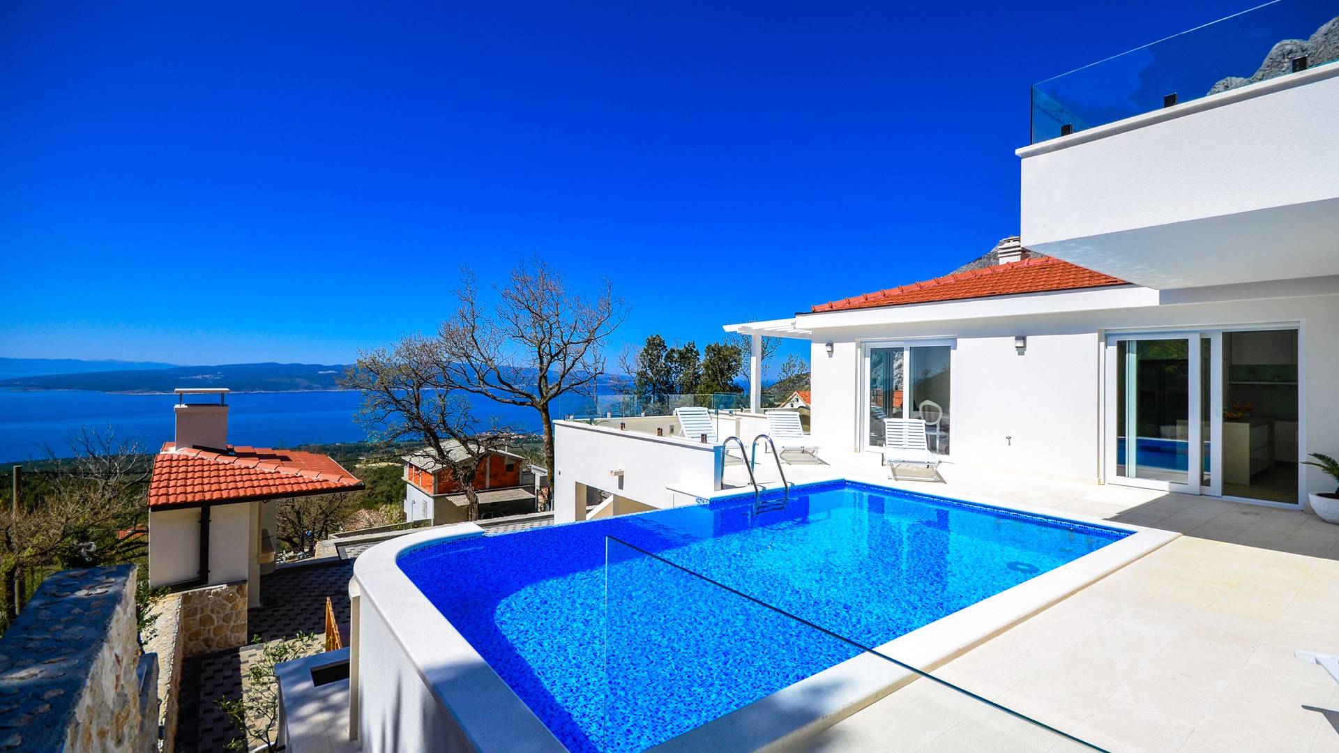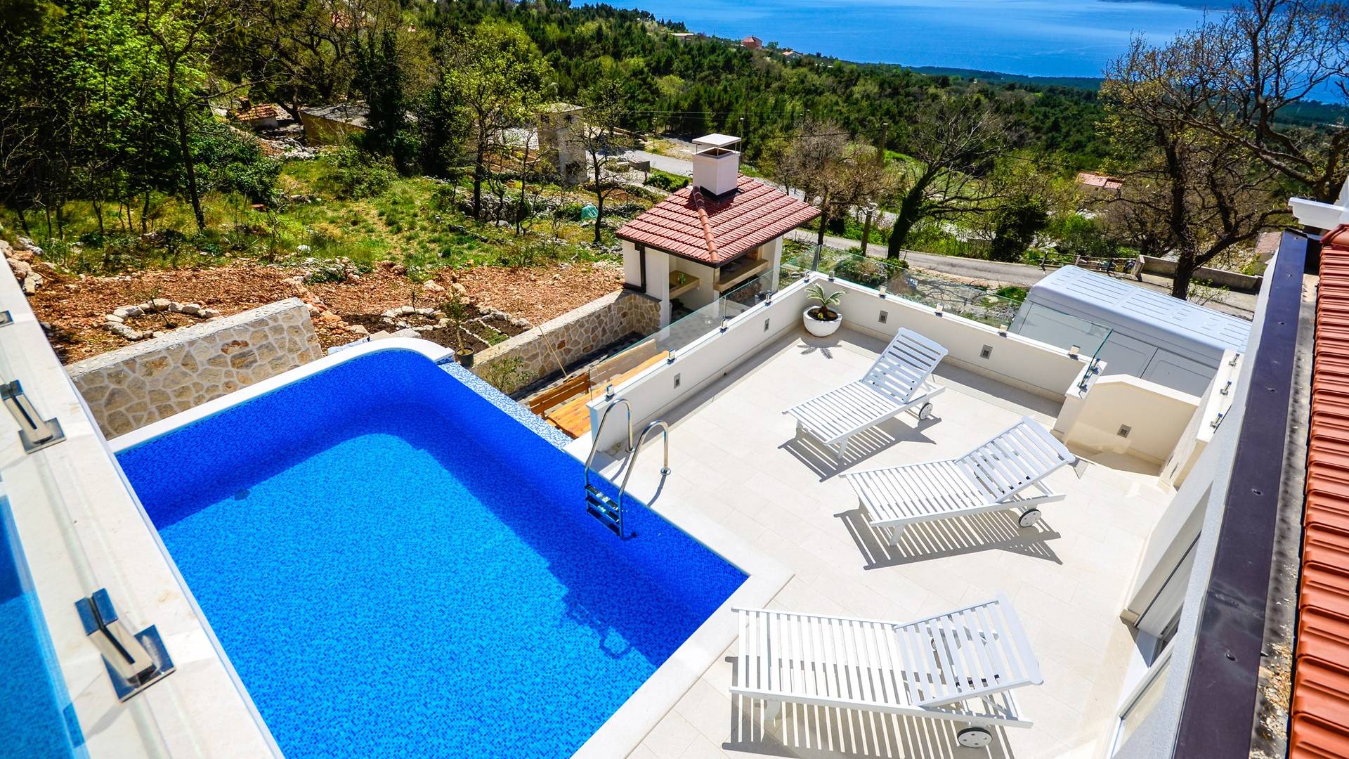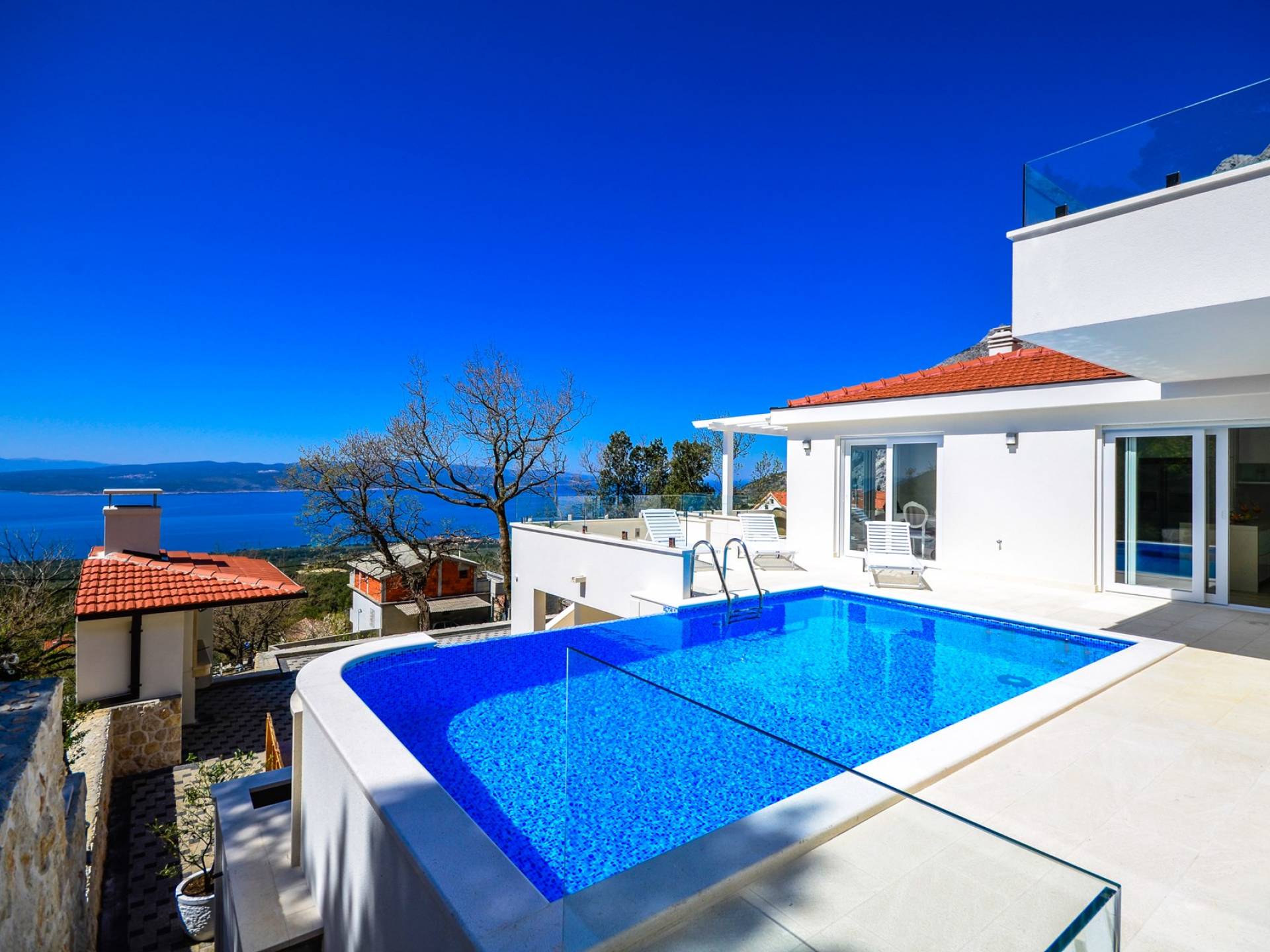 Здесь же находится тренажерный зал с сауной и санузлом. Площадь бассейна 24м2, окружена большой террасой с 10 шезлонгами и видом на море. Бассейн оборудован современной системой очистки воды, системами водного и воздушного массажа, а также светодиодной светотерапией.