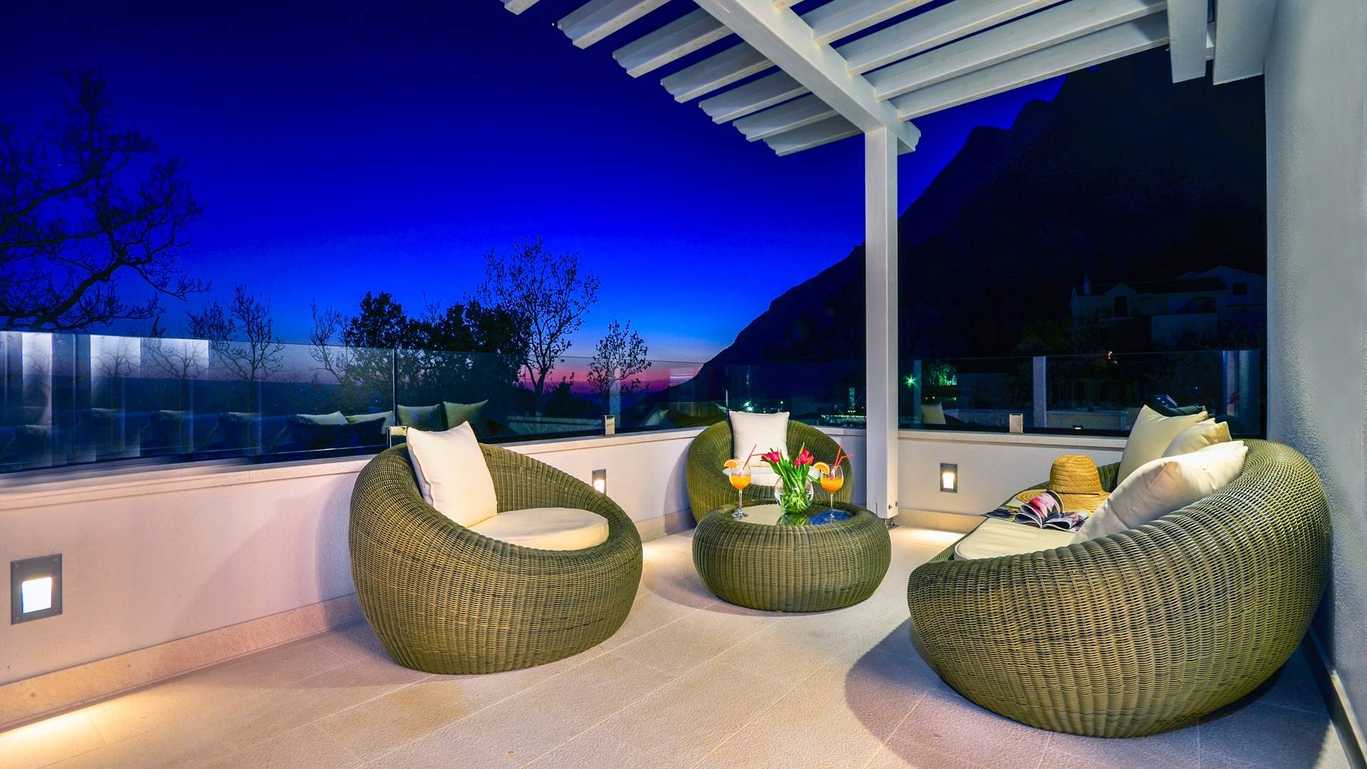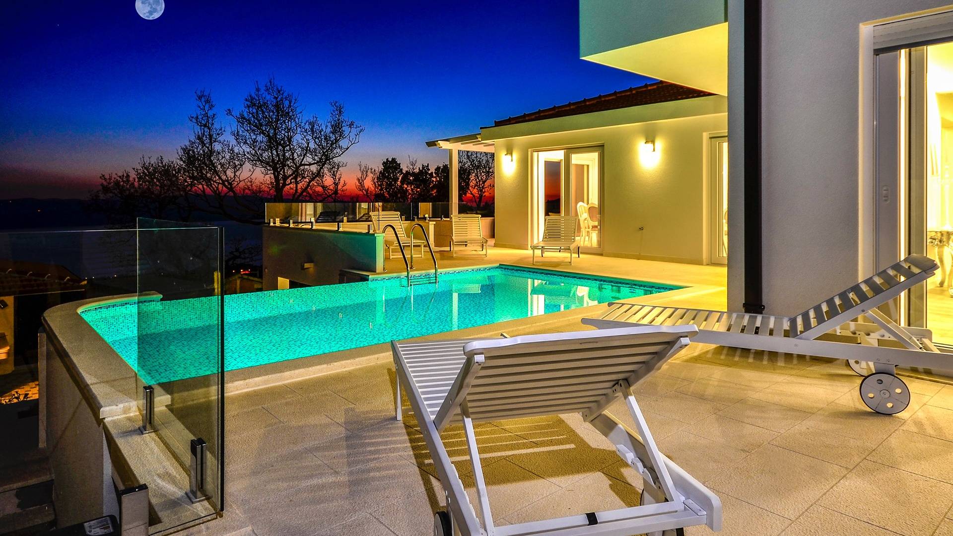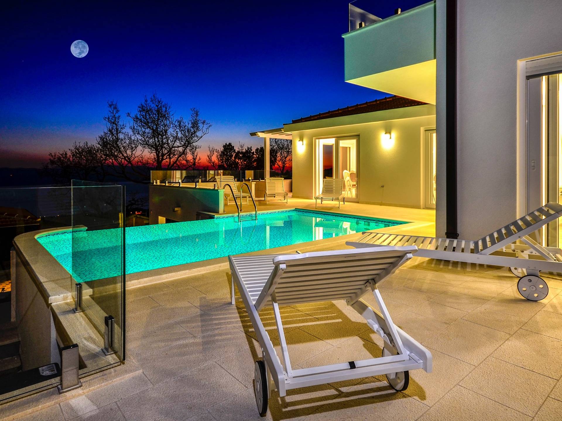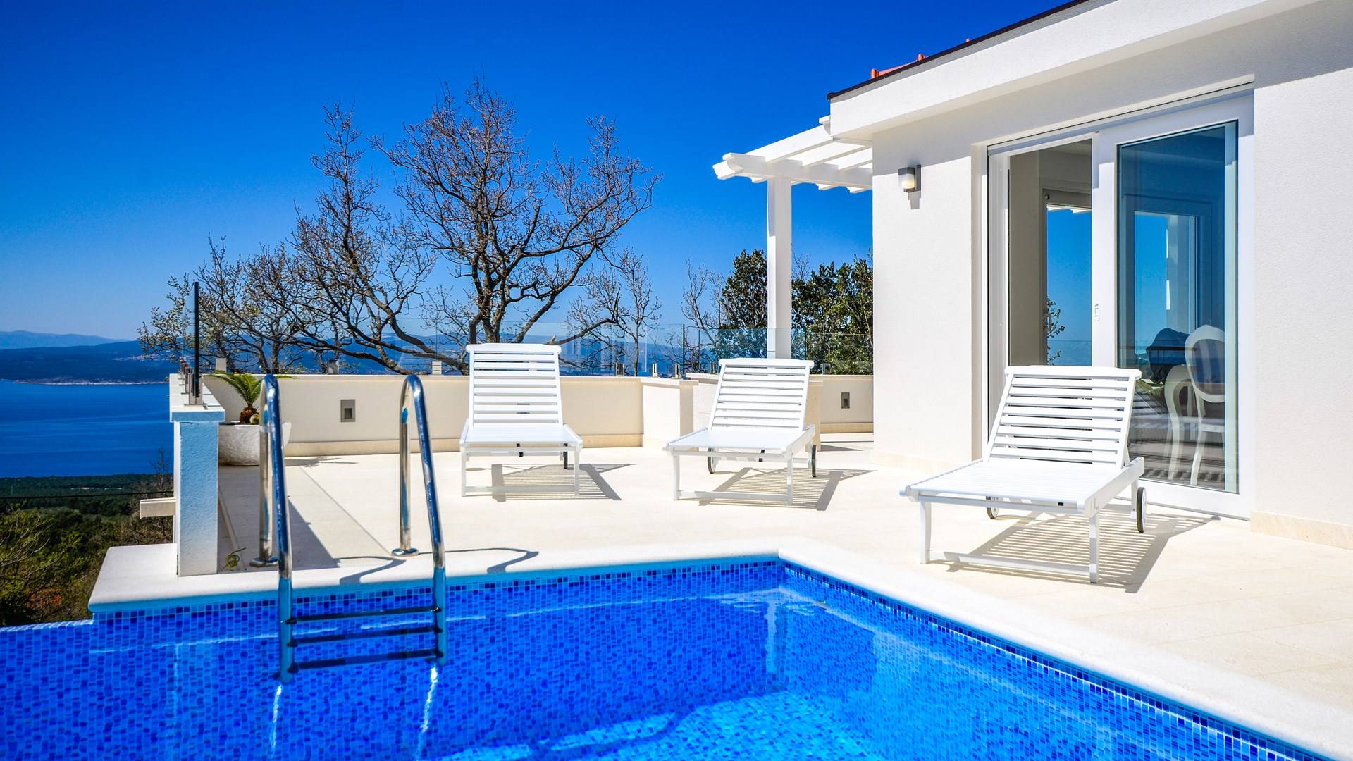 Здесь же находится тренажерный зал с сауной и санузлом. Площадь бассейна 24м2, окружена большой террасой с 10 шезлонгами и видом на море. Бассейн оборудован современной системой очистки воды, системами водного и воздушного массажа, а также светодиодной светотерапией.