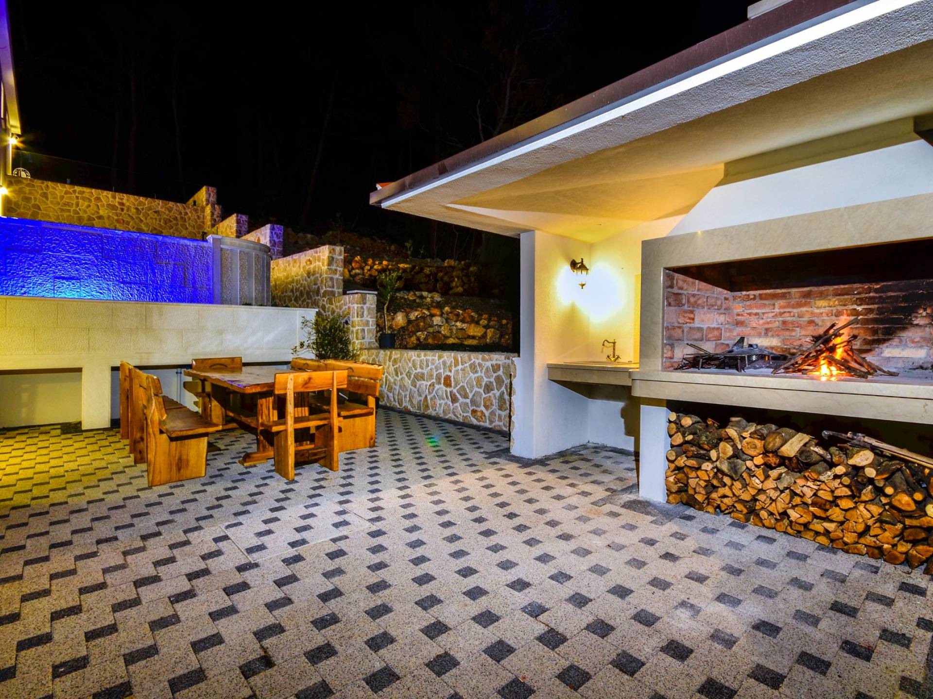 На первом этаже находится таверна с уютной обеденной зоной в деревенском стиле и полностью оборудованной кухней, спальней с ванной комнатой и отдельным туалетом. Таверна имеет выход в сад. На крытой террасе вы можете насладиться утренним солнцем и своим первым кофе.