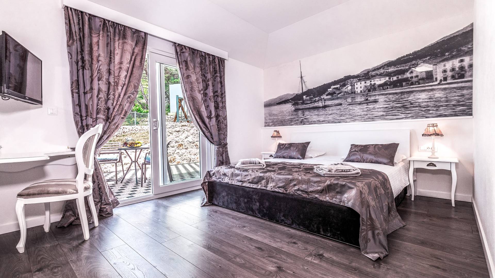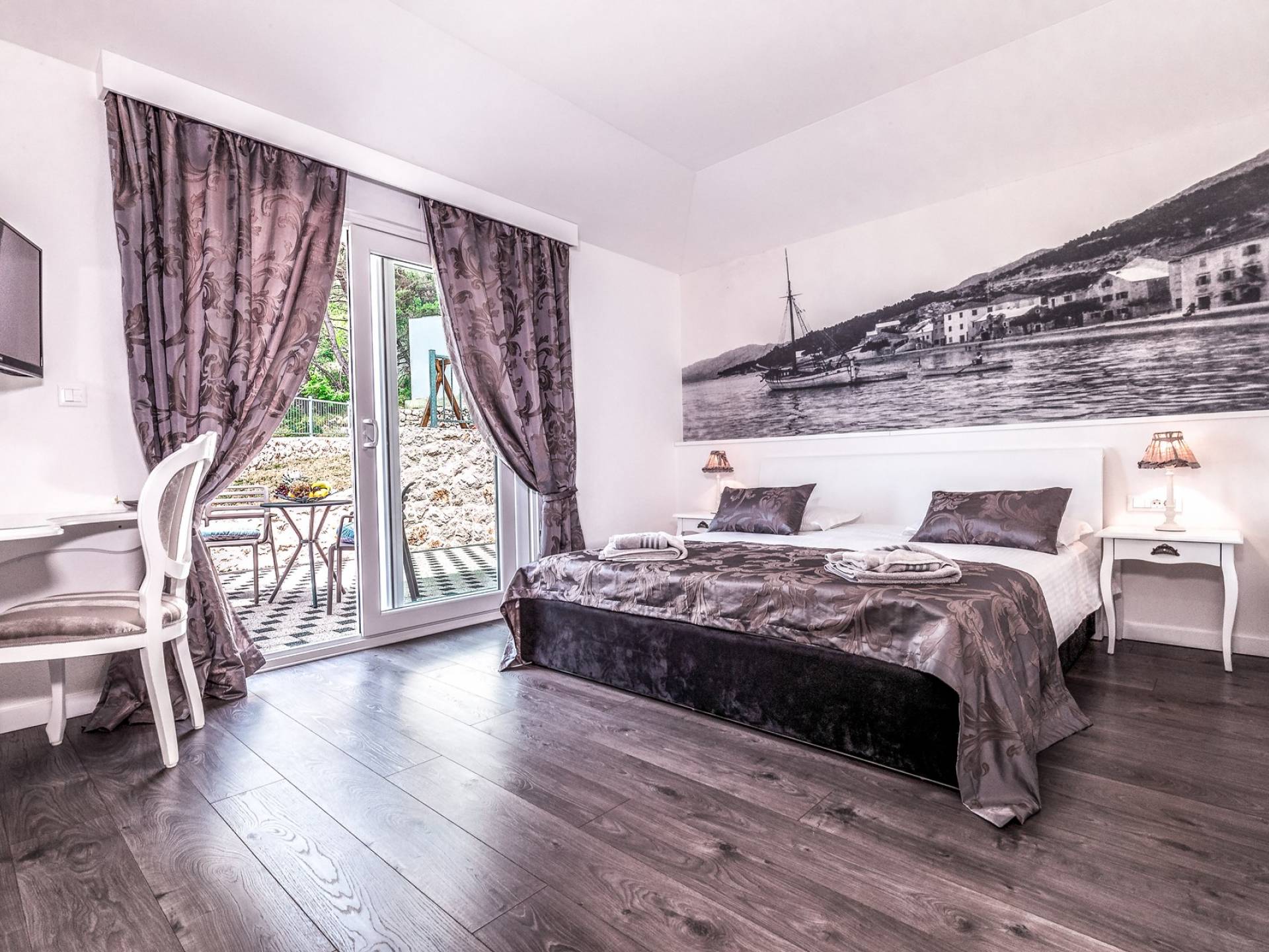 Номер 4: номер с западной ориентацией, двуспальная кровать (180 × 200), ванная комната с душем, терраса с видом на море.