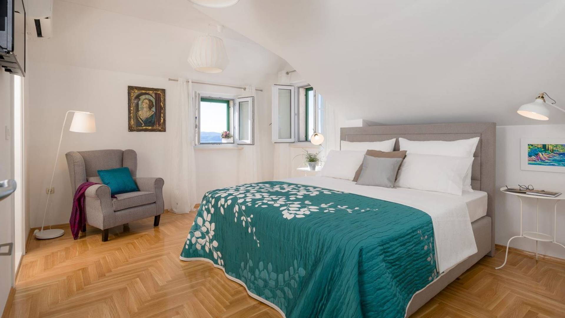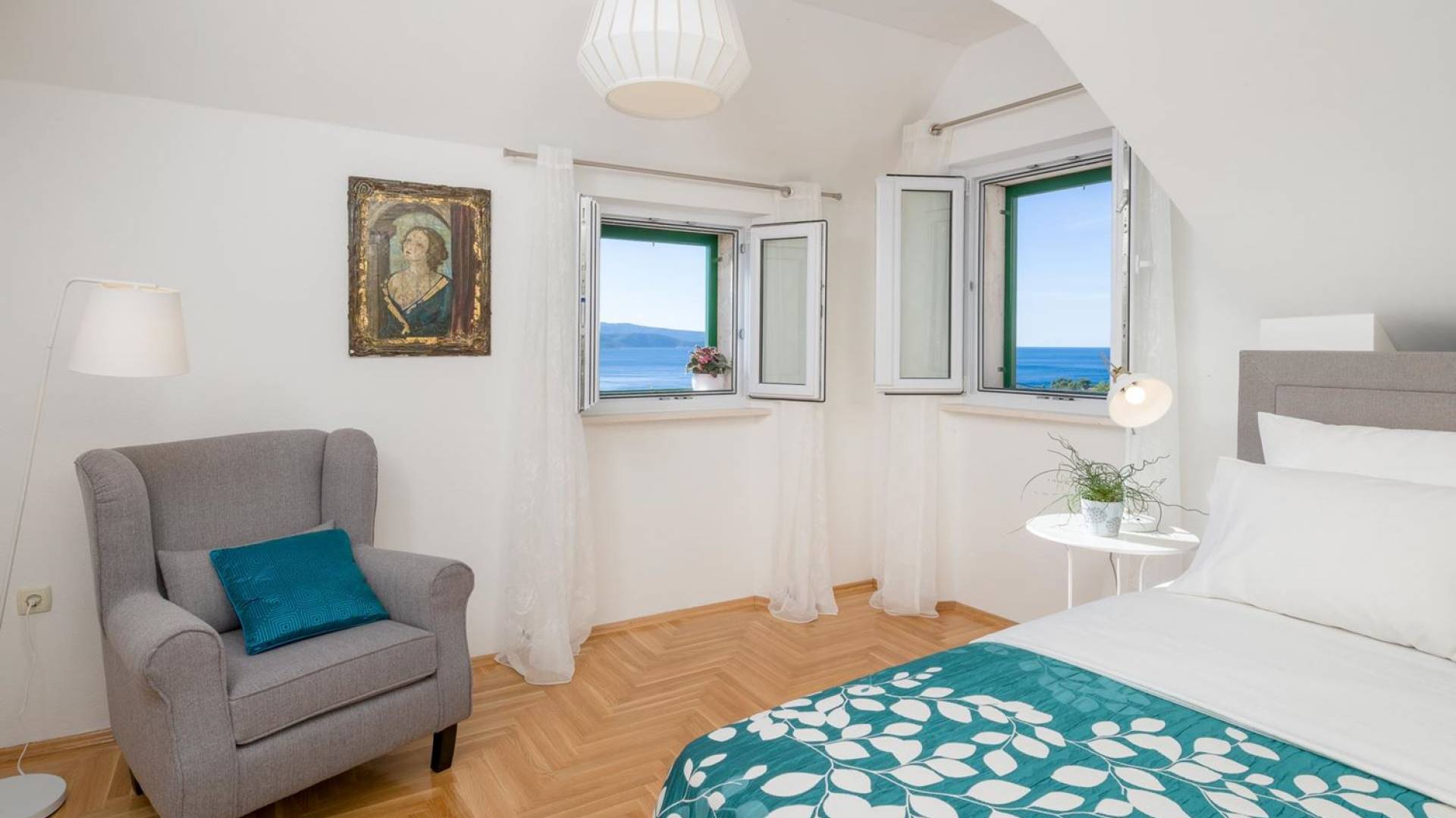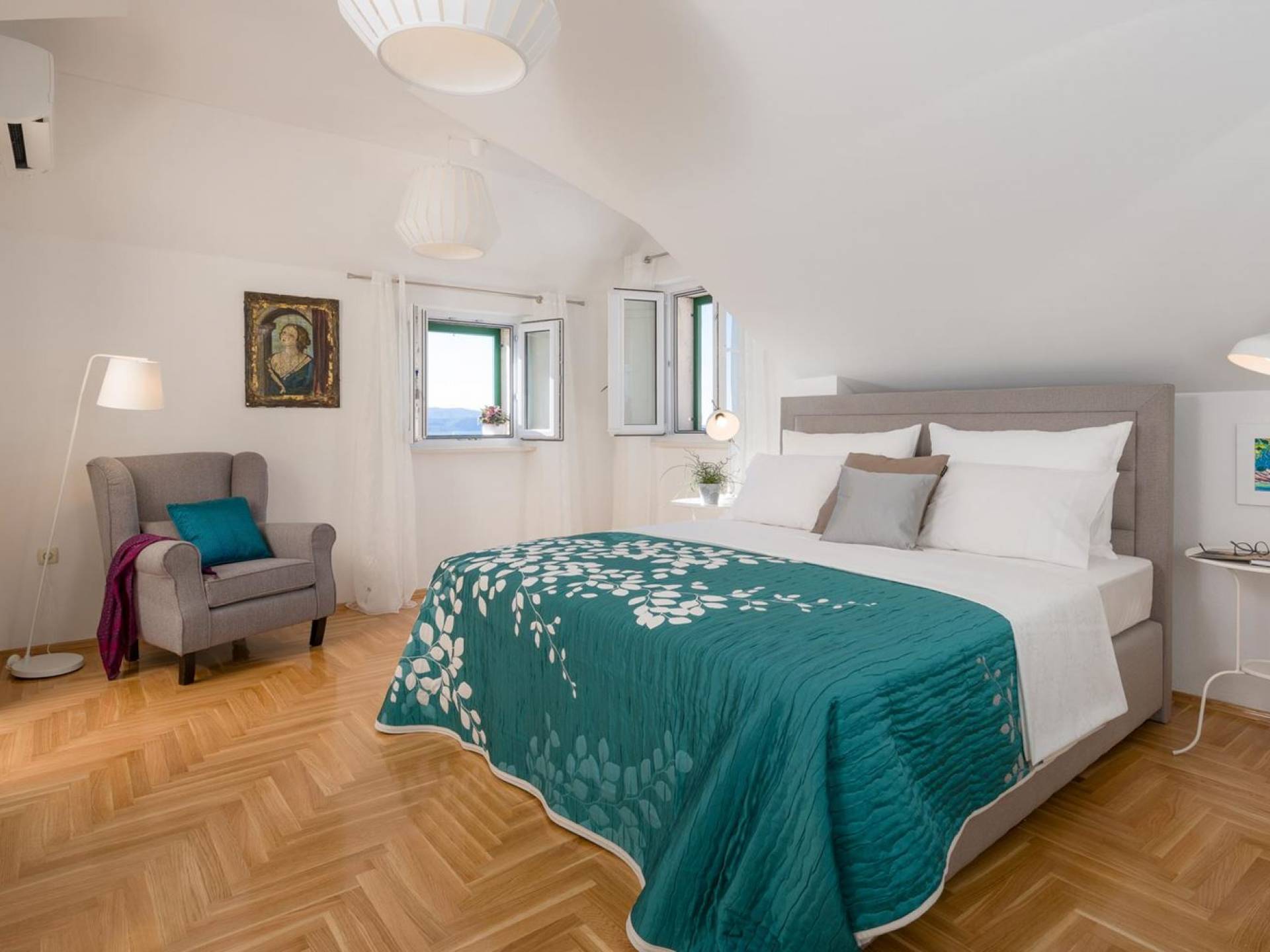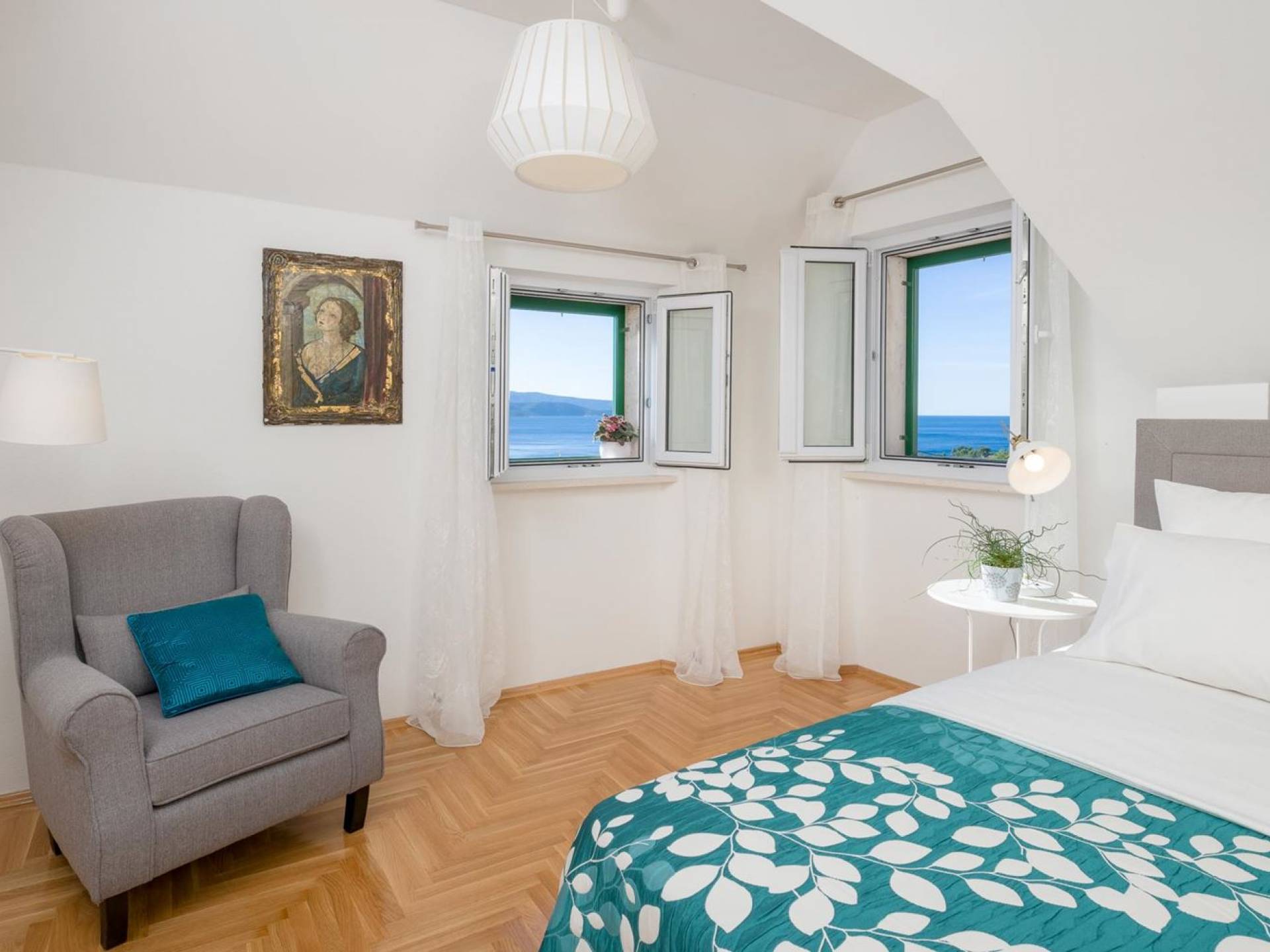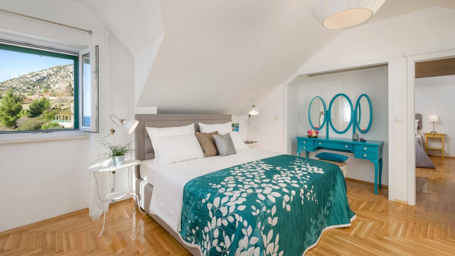 На верхнем этаже есть две спальни хорошего размера, обе с паркетным полом, одна с двуспальной кроватью, а другая с двумя односпальными кроватями. В каждом номере есть ванная комната. Спальня с двуспальной кроватью имеет вид на юг и запад, а это значит, что из нее открывается прекрасный вид на море.