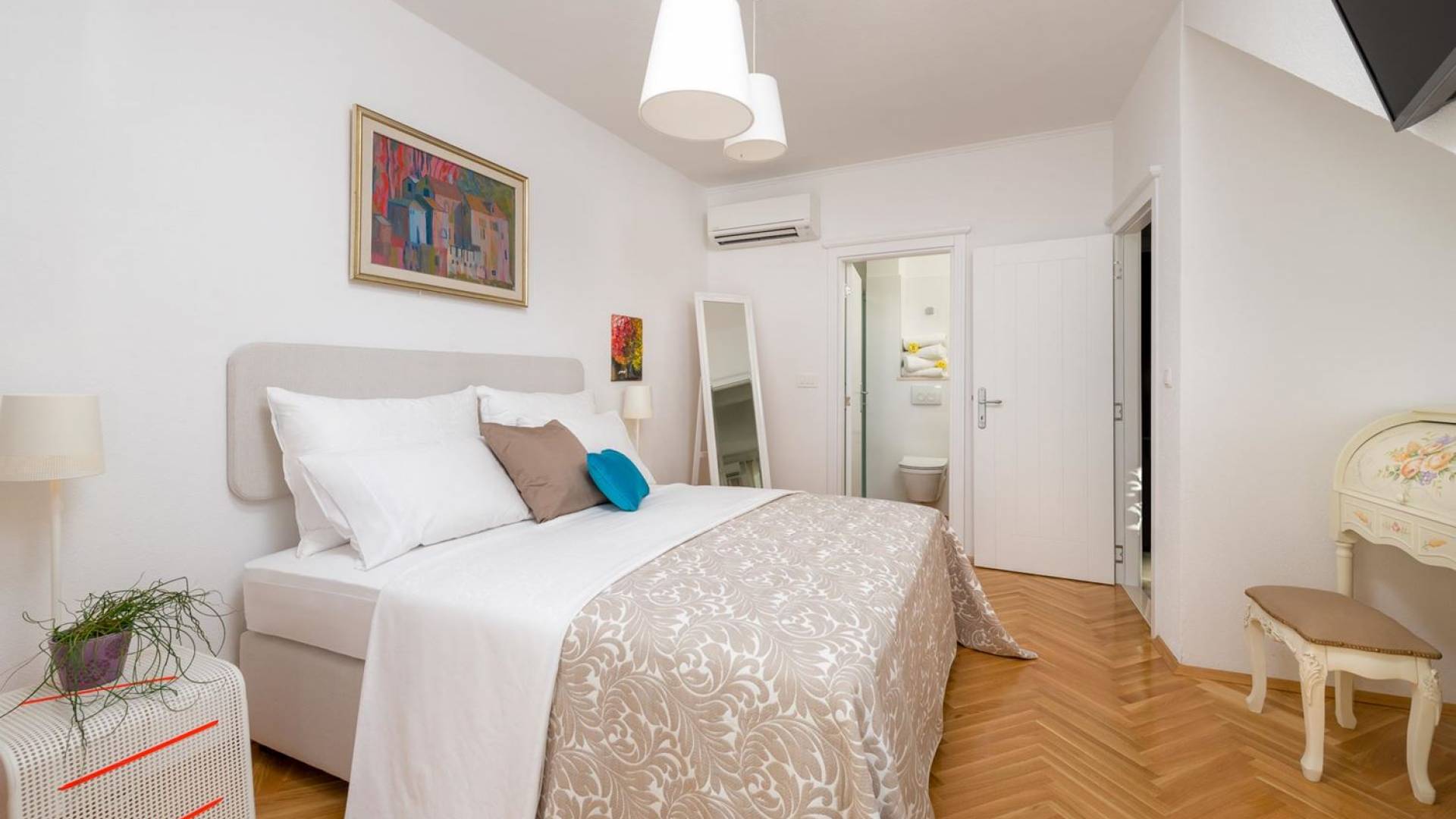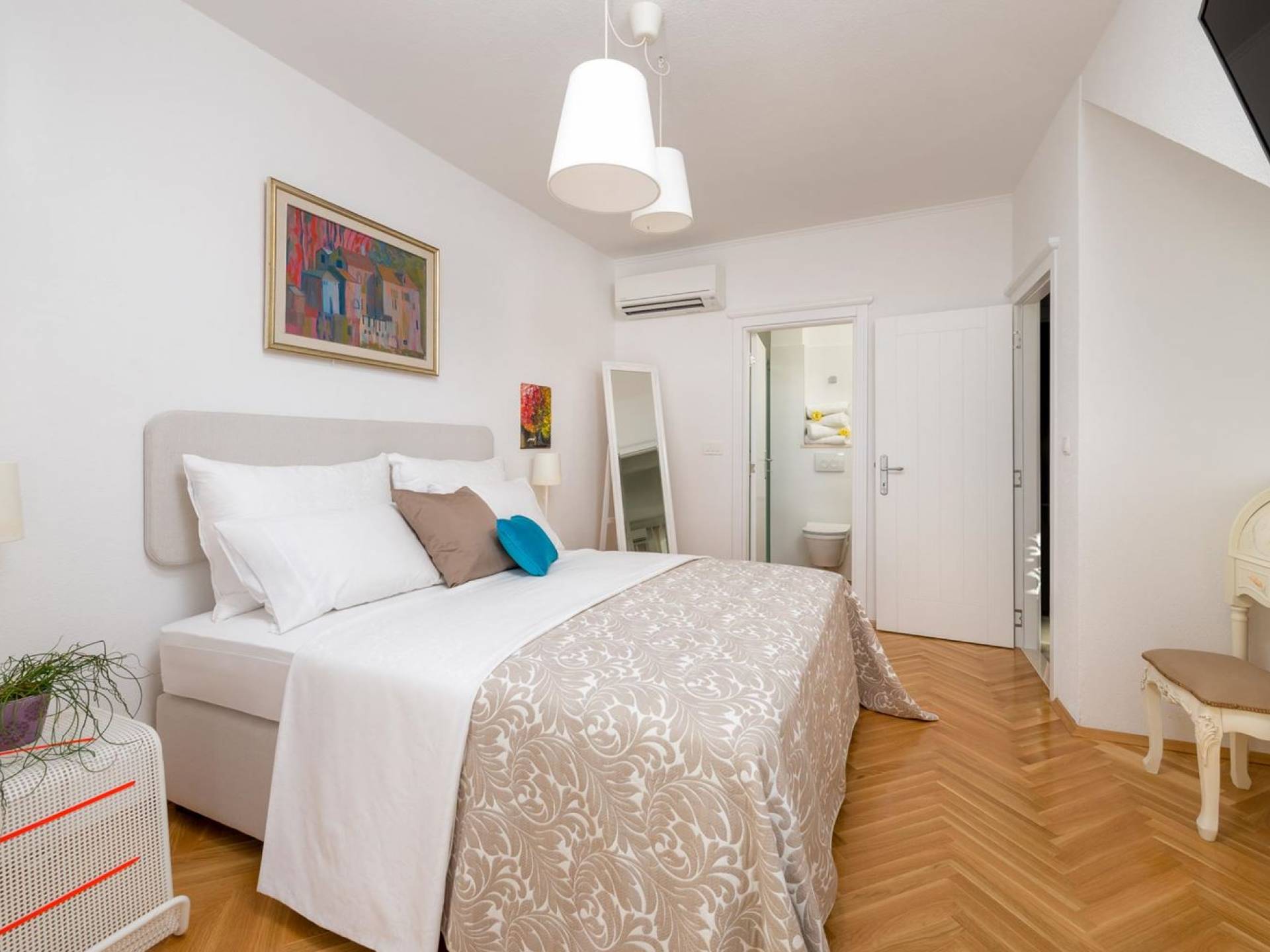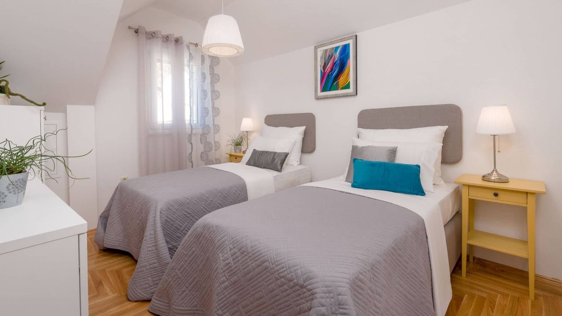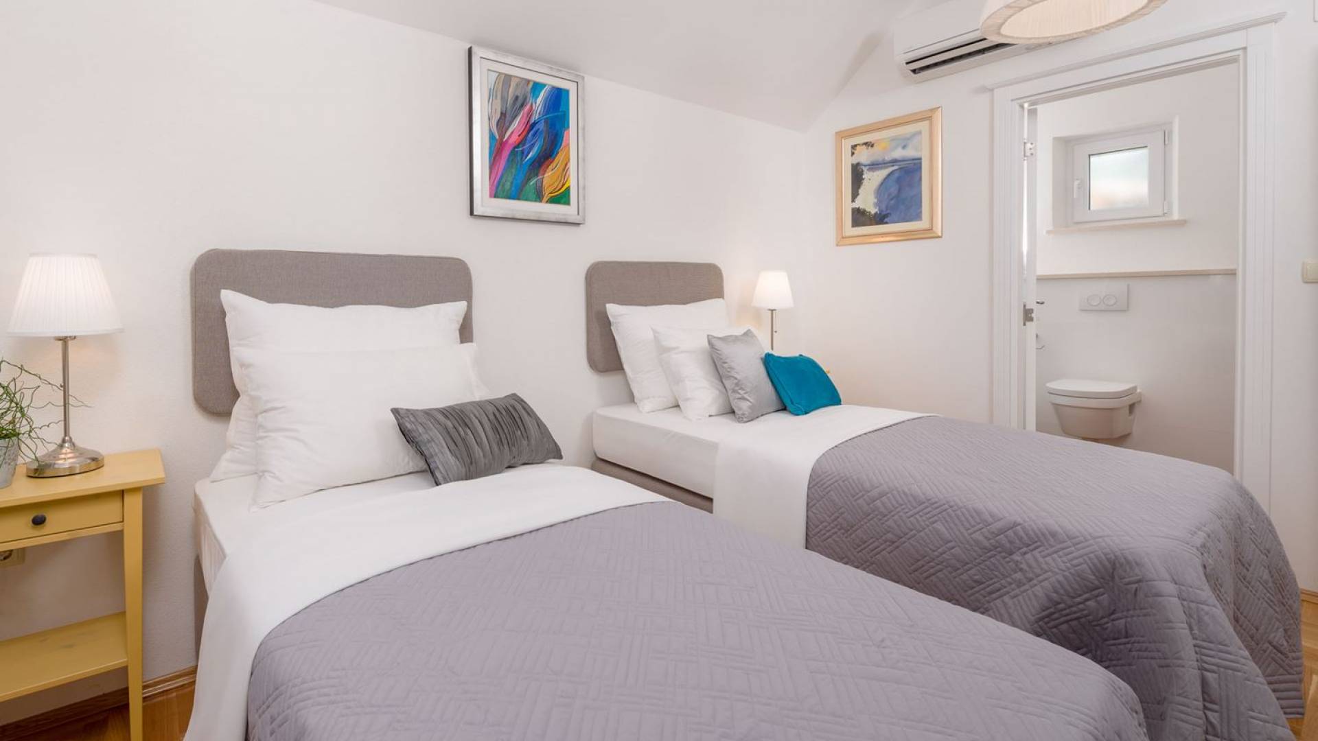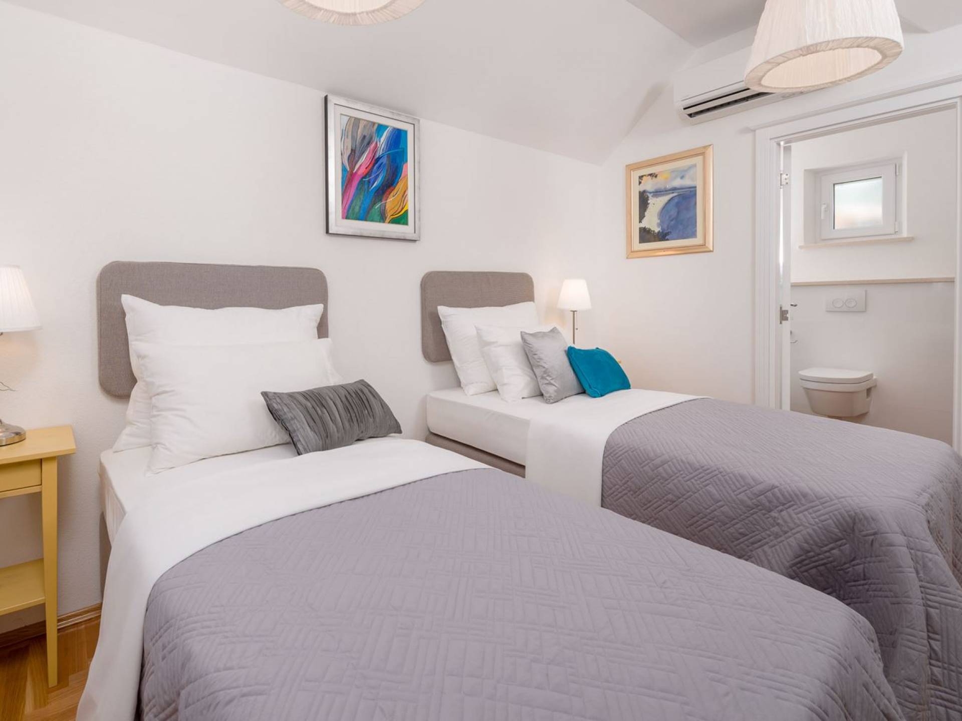 На верхнем этаже есть две спальни хорошего размера, обе с паркетным полом, одна с двуспальной кроватью, а другая с двумя односпальными кроватями. В каждом номере есть ванная комната. Спальня с двуспальной кроватью имеет вид на юг и запад, а это значит, что из нее открывается прекрасный вид на море.