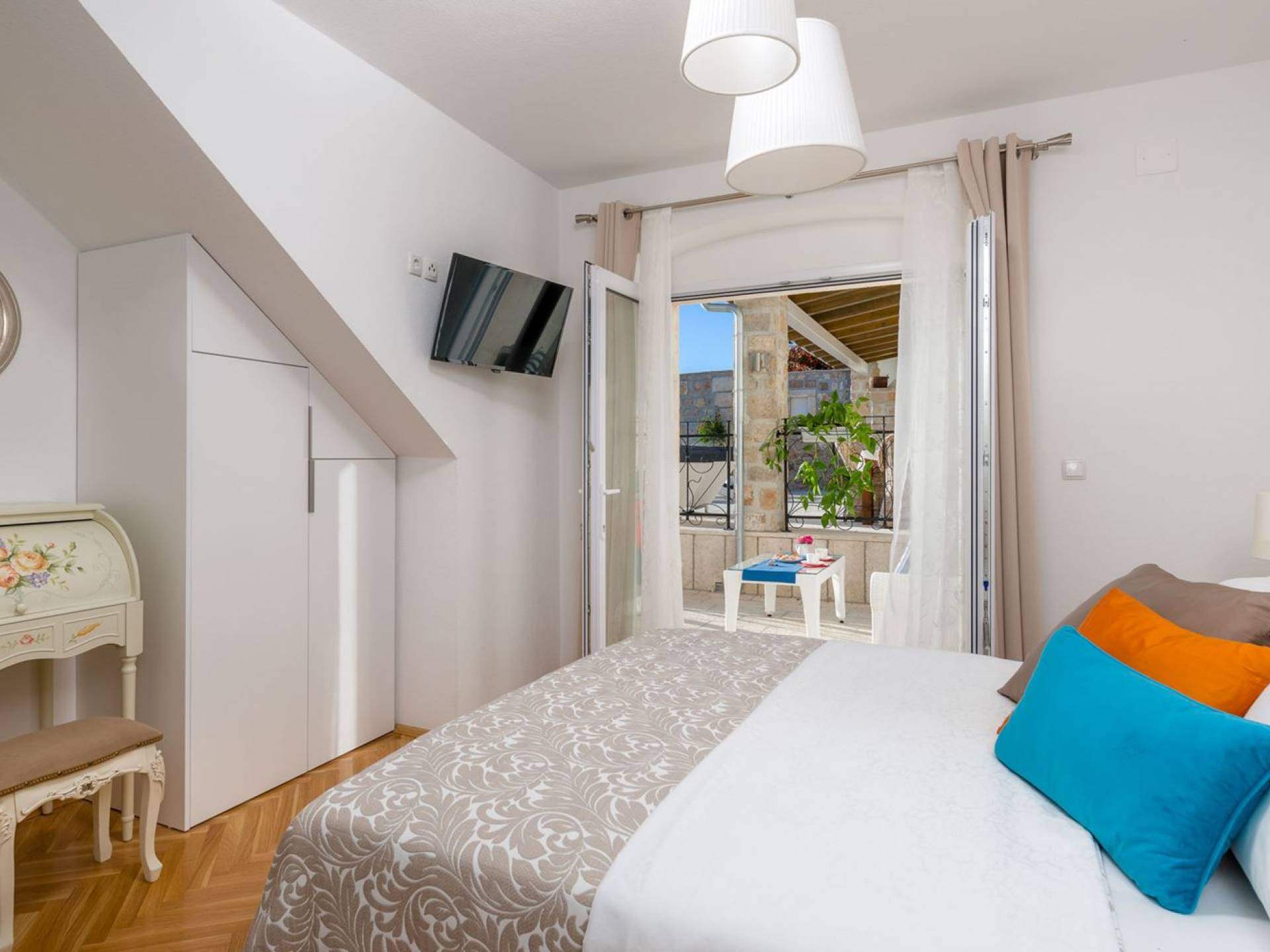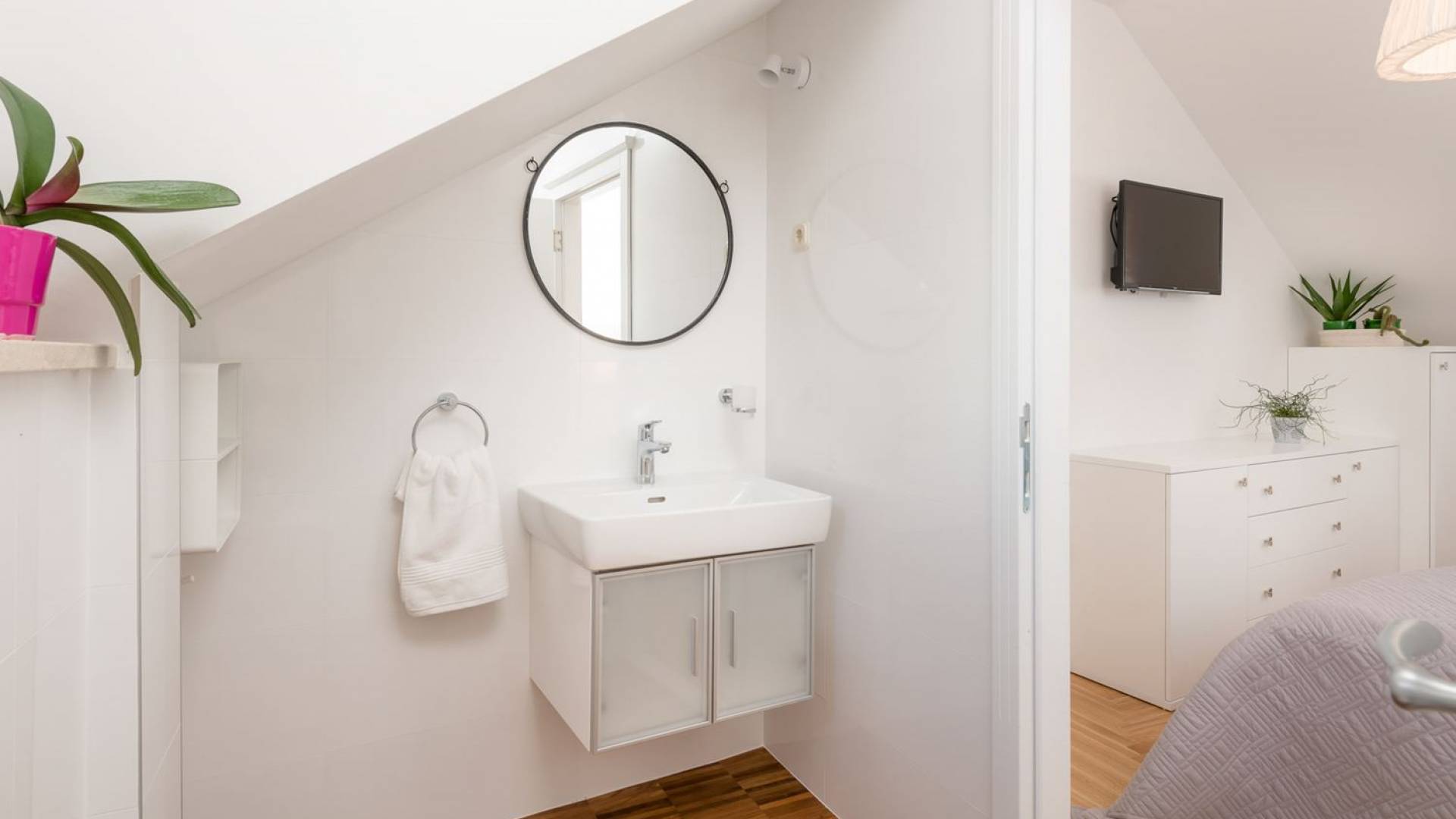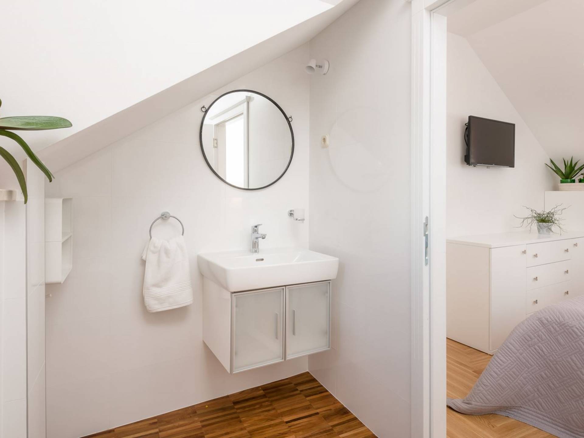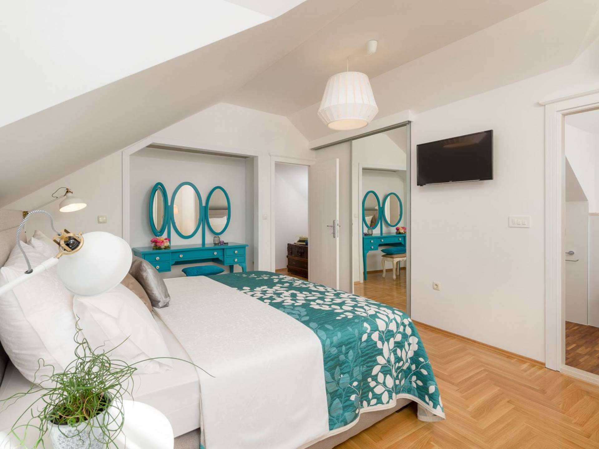 На верхнем этаже есть две спальни хорошего размера, обе с паркетным полом, одна с двуспальной кроватью, а другая с двумя односпальными кроватями. В каждом номере есть ванная комната. Спальня с двуспальной кроватью имеет вид на юг и запад, а это значит, что из нее открывается прекрасный вид на море.