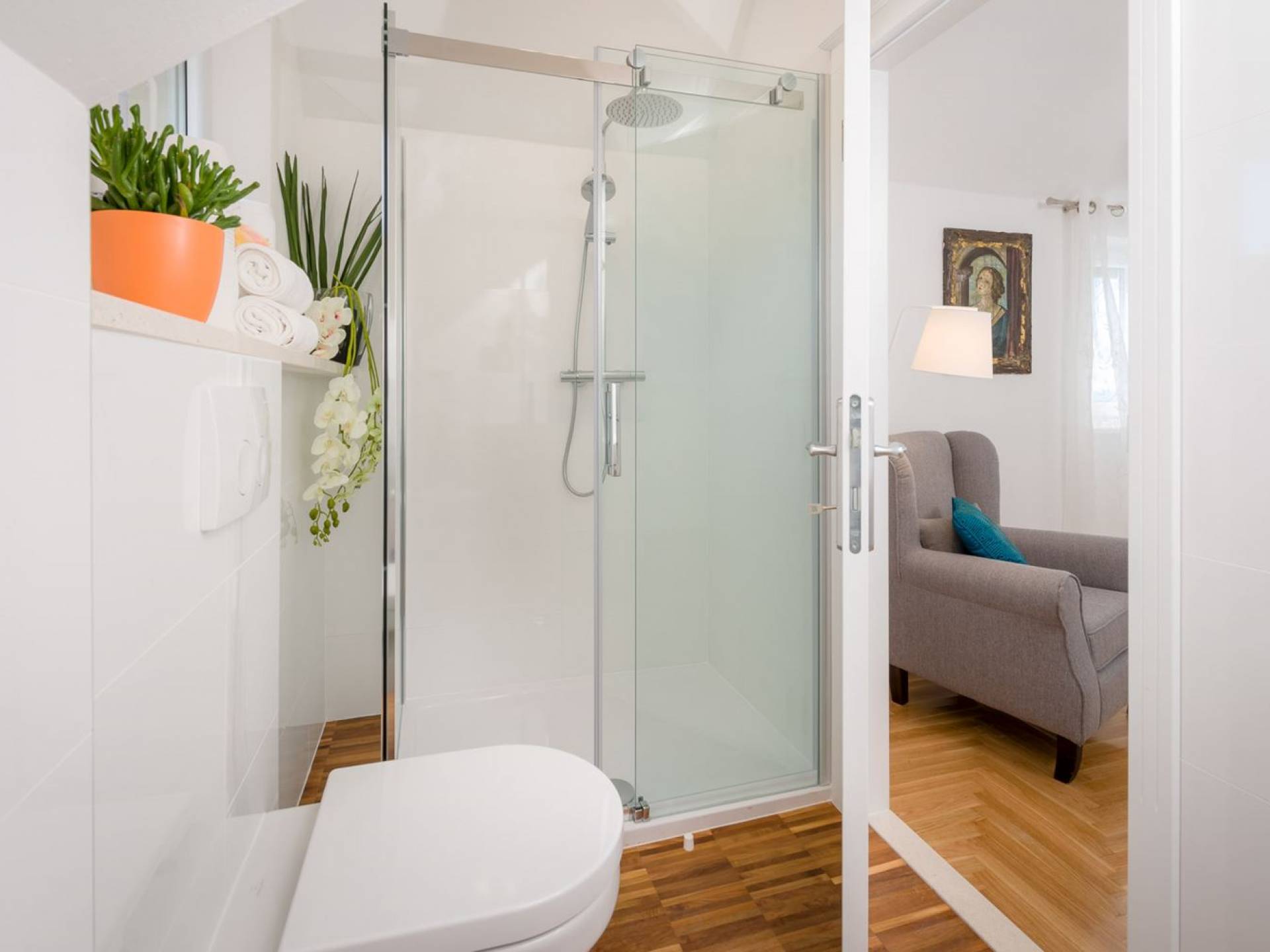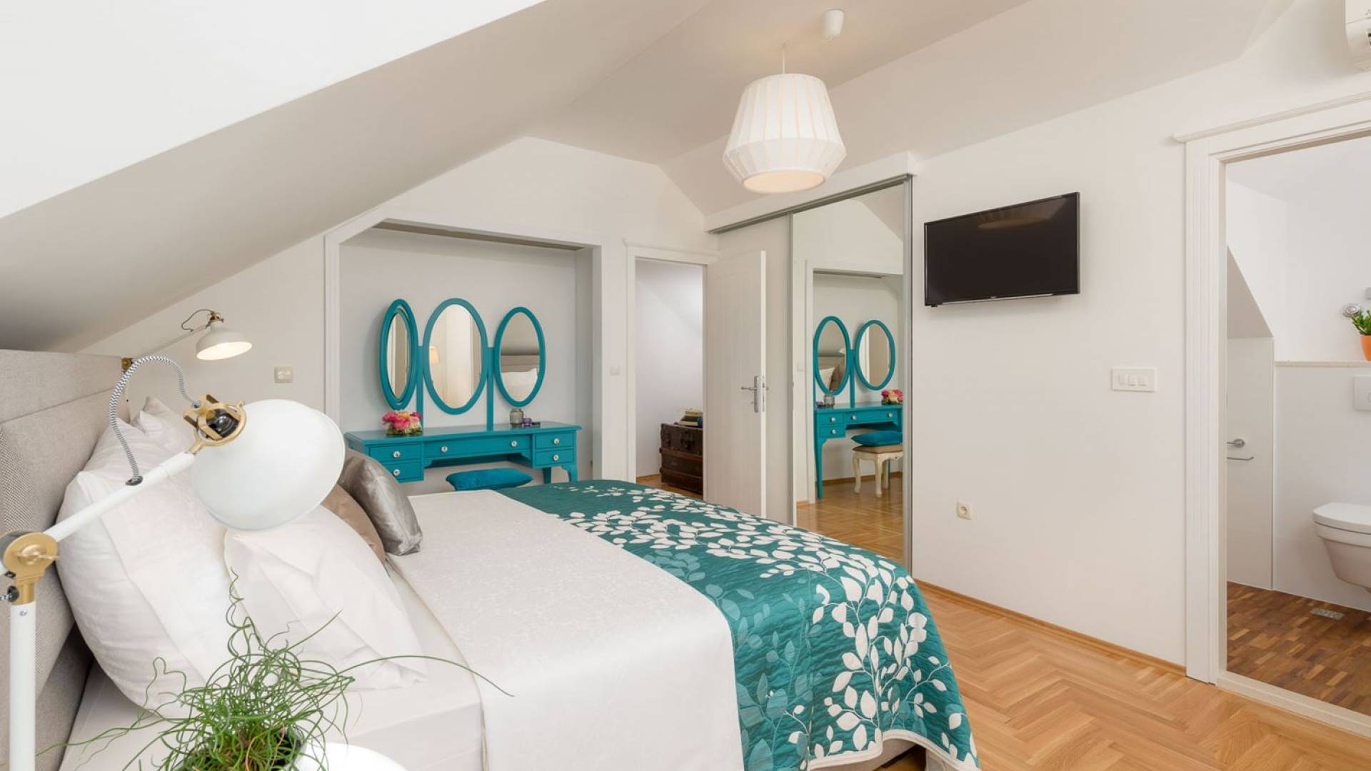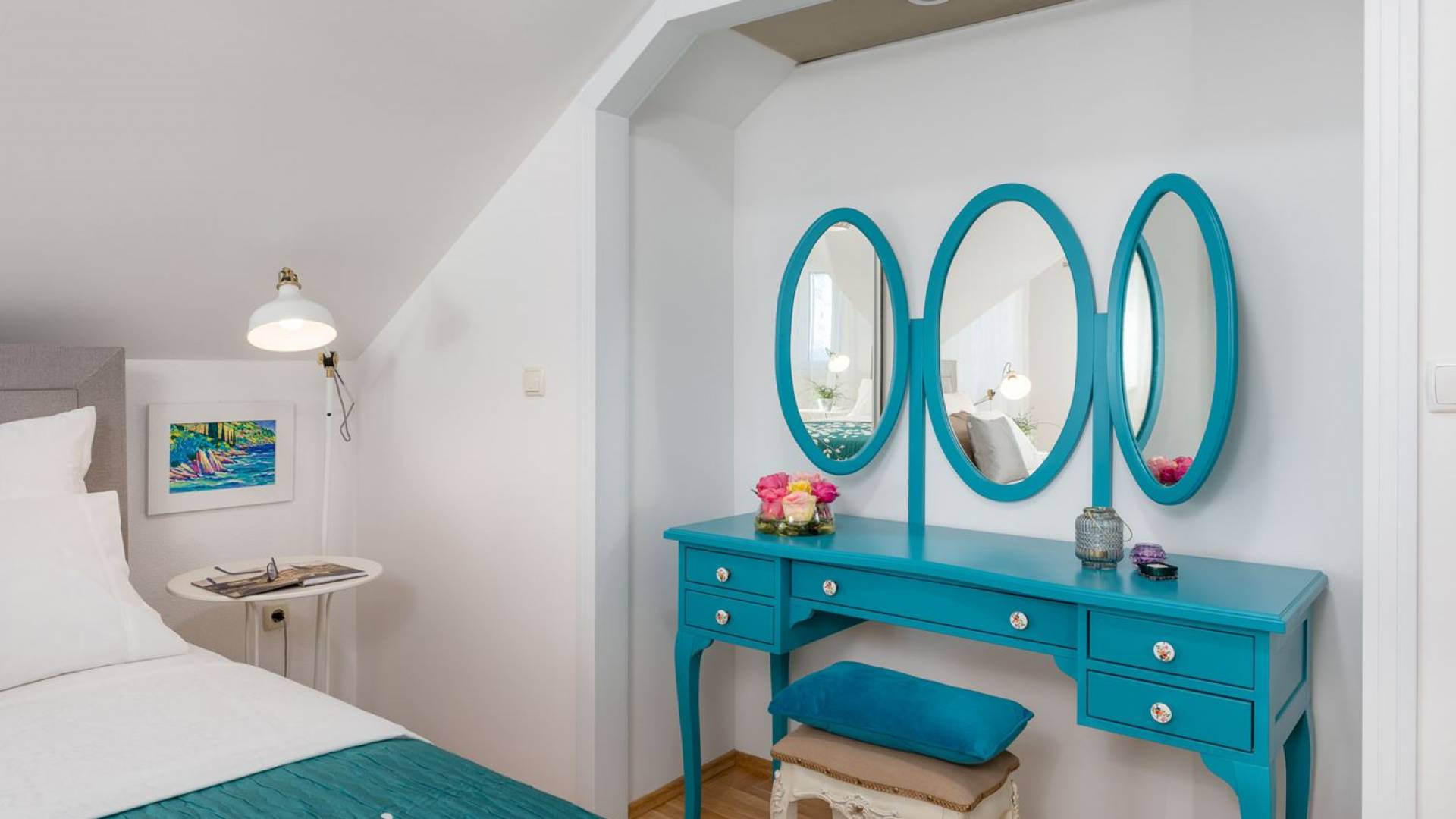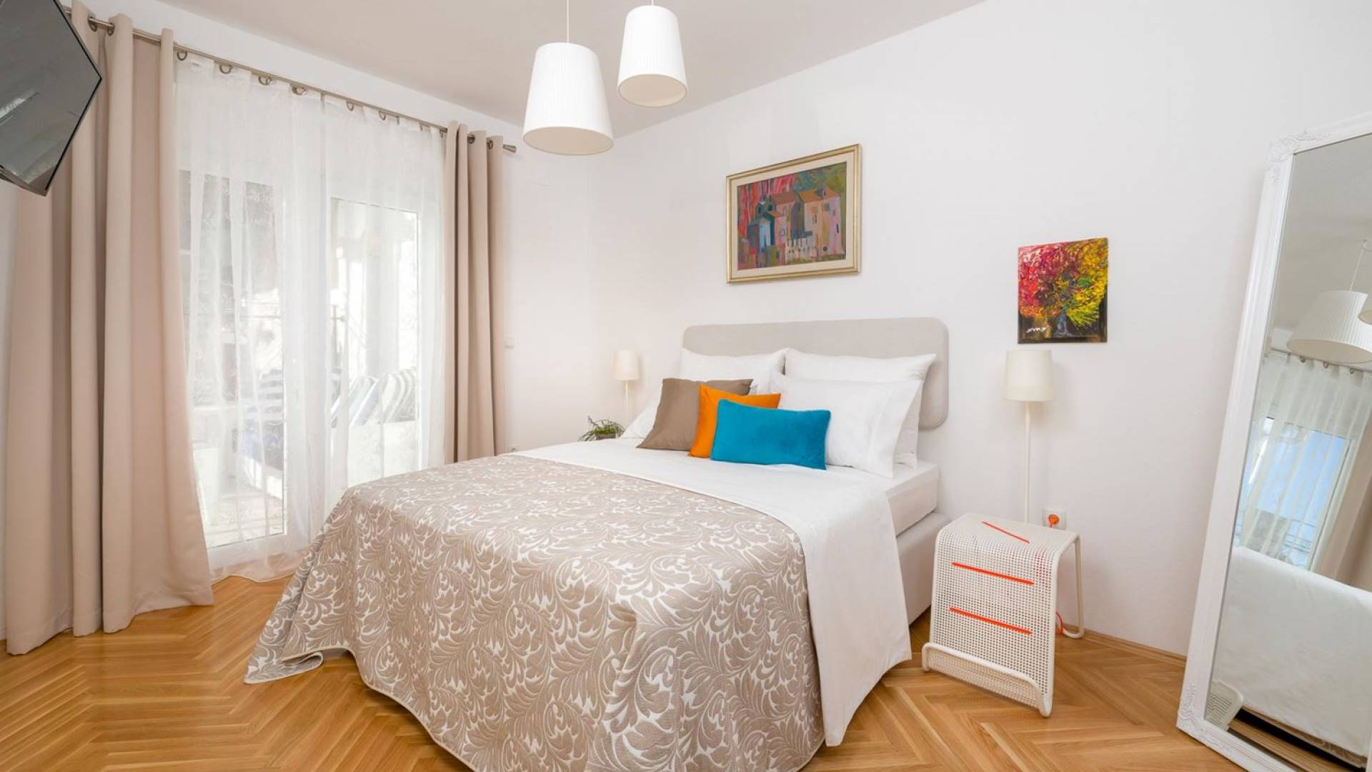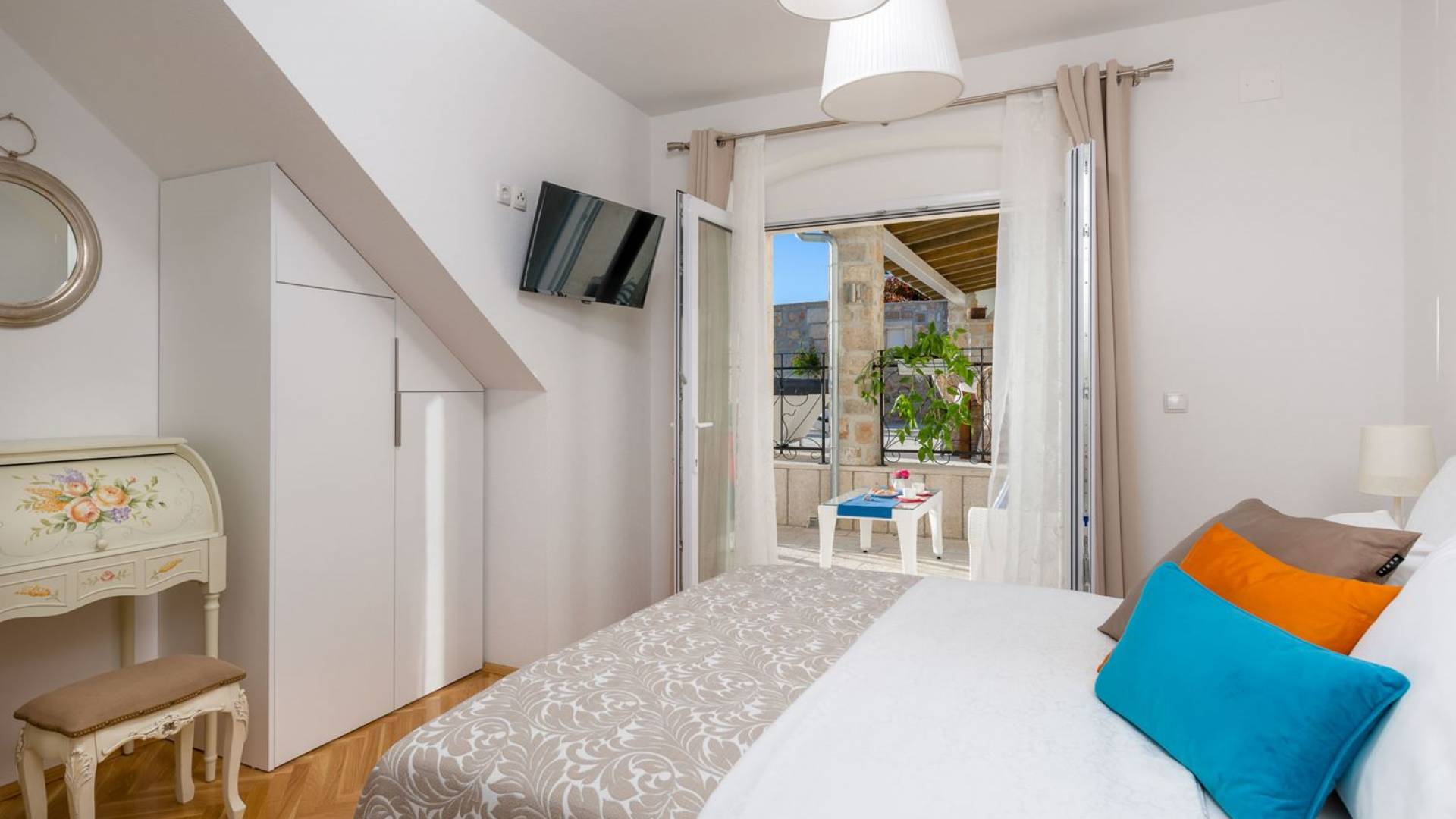 На верхнем этаже есть две спальни хорошего размера, обе с паркетным полом, одна с двуспальной кроватью, а другая с двумя односпальными кроватями. В каждом номере есть ванная комната. Спальня с двуспальной кроватью имеет вид на юг и запад, а это значит, что из нее открывается прекрасный вид на море.